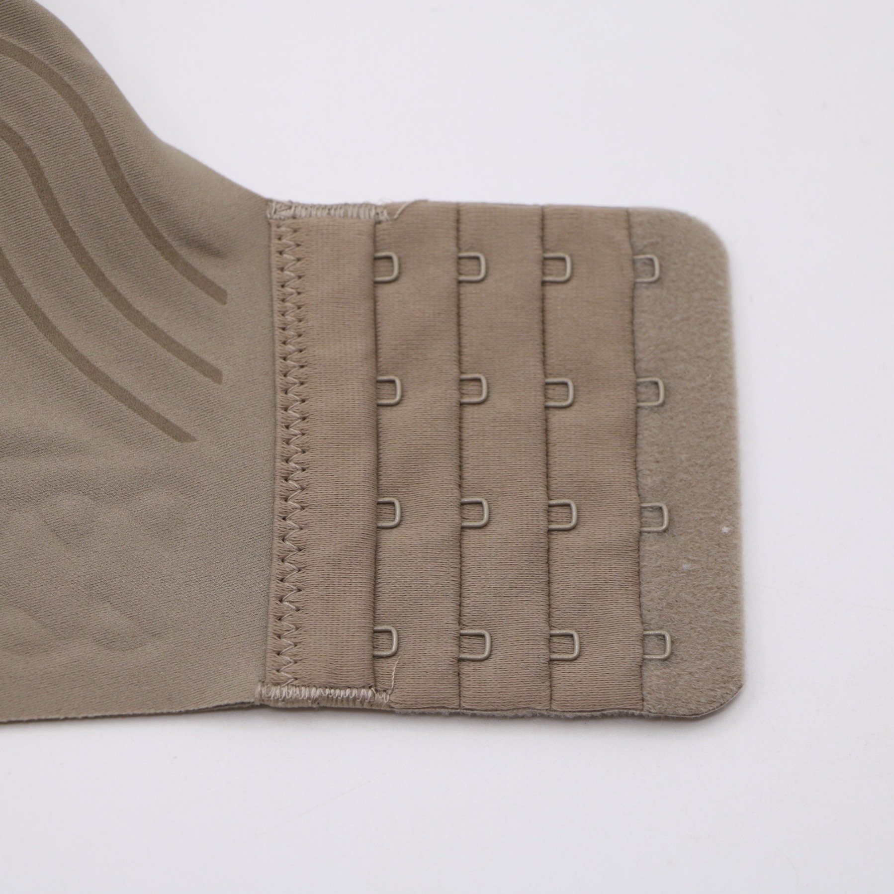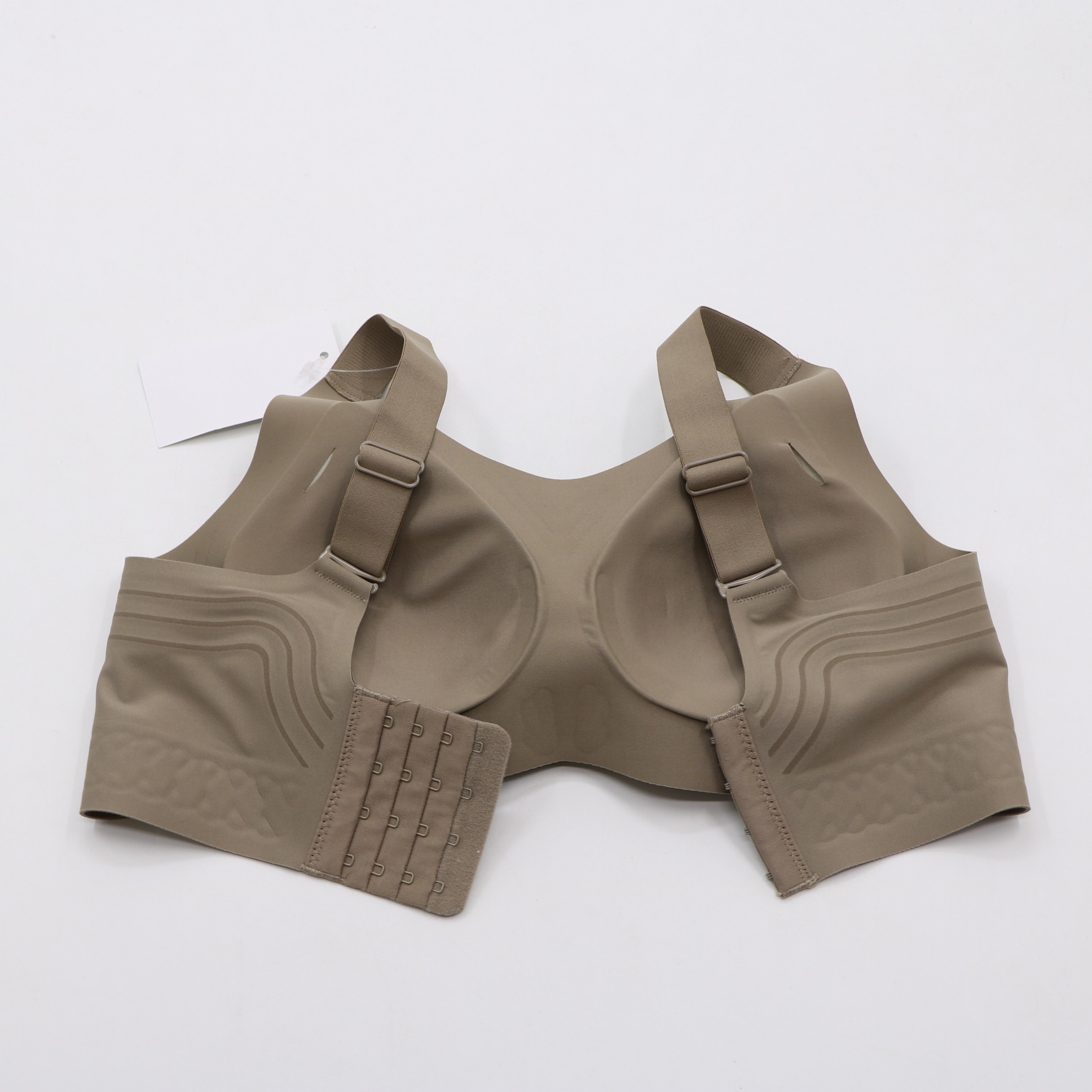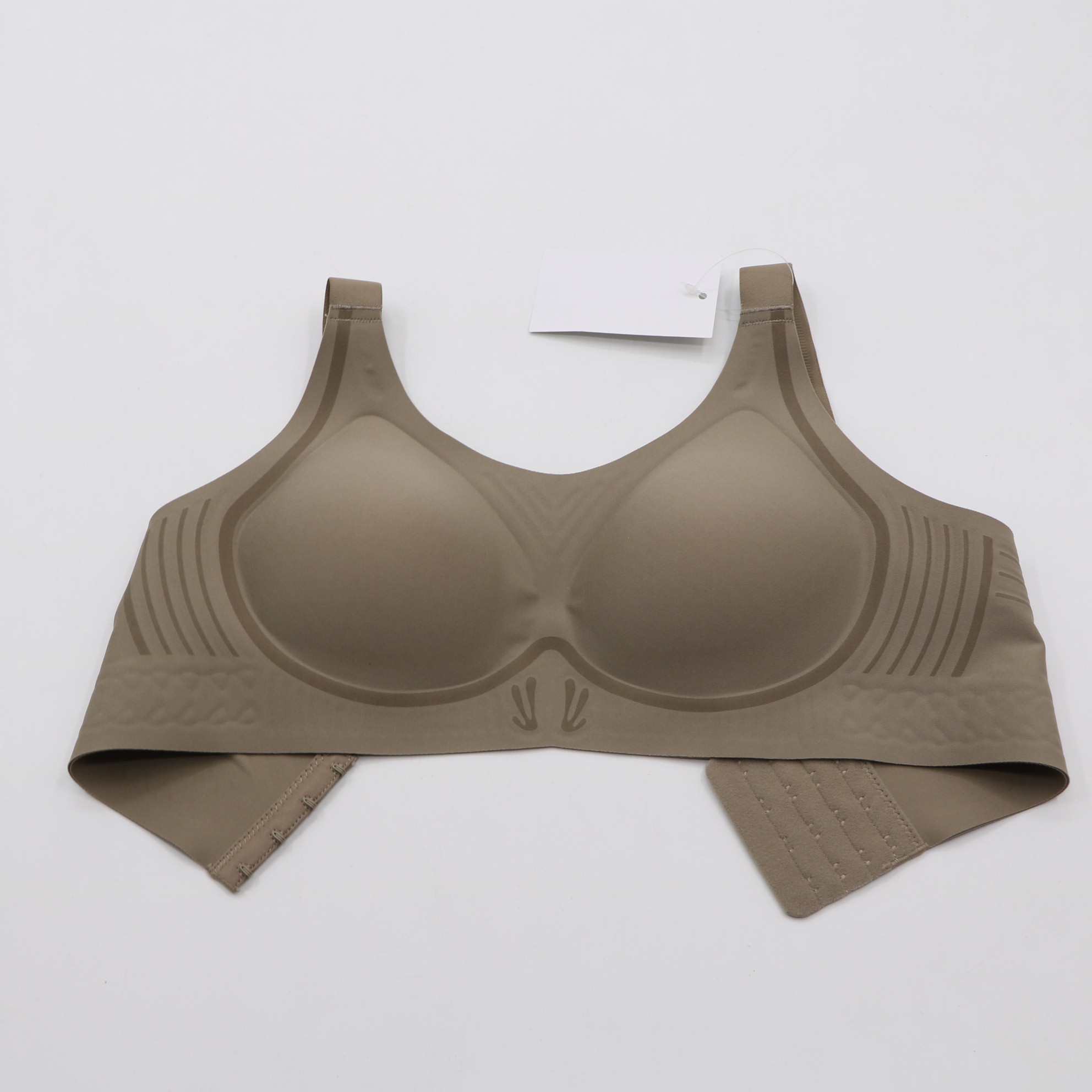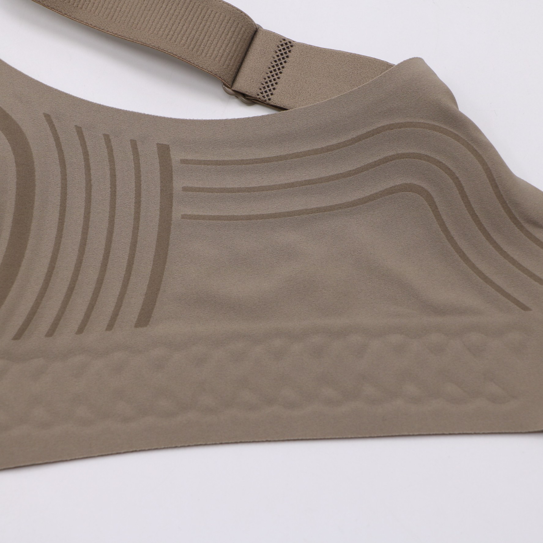 Elevate your comfort with this full-coverage wireless bra. The embossed side and underband patterns offer targeted support, while the soft taupe fabric and seamless design create a smooth, invisible look under clothing. Adjustable straps and a secure back closure complete the functional, stylish design.