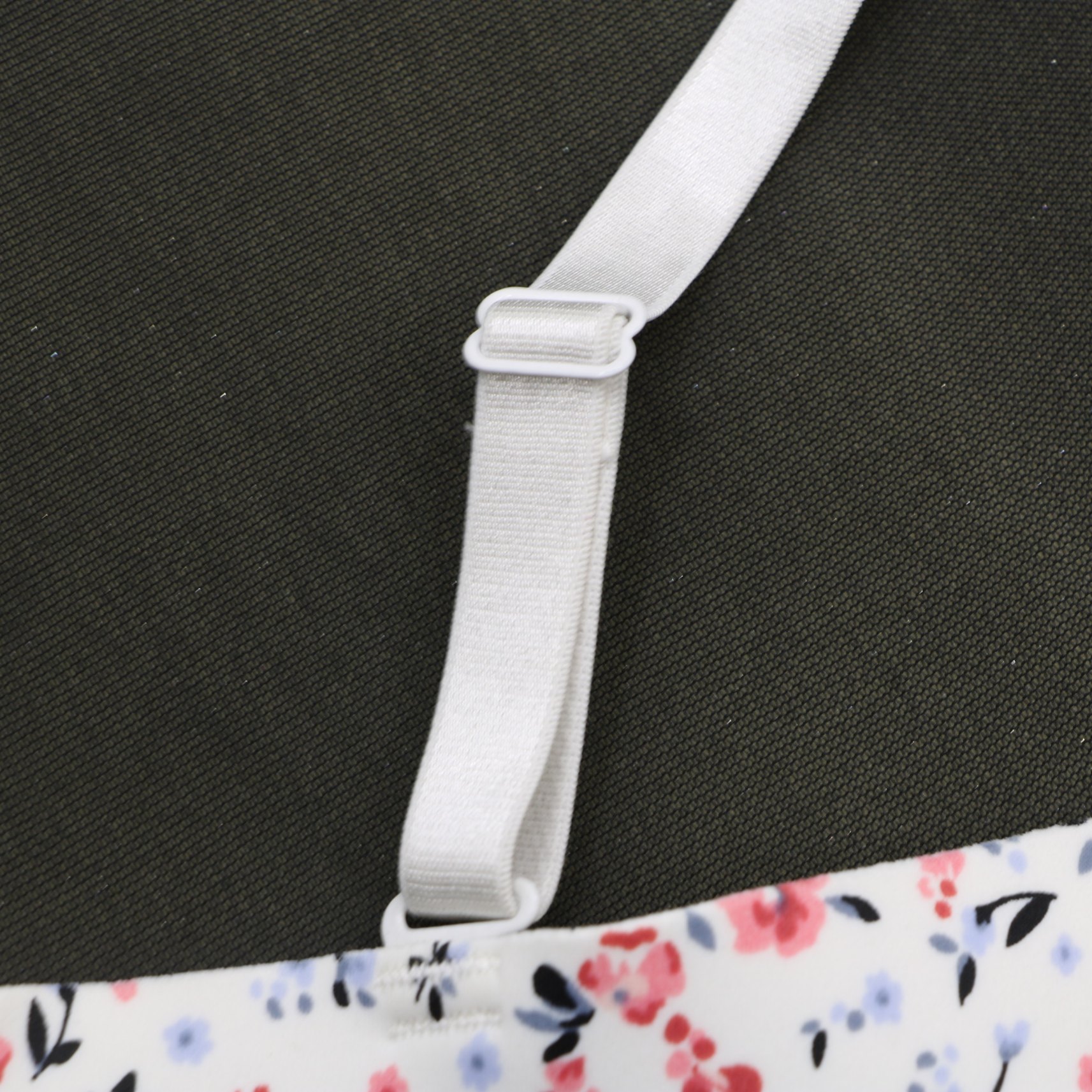 This charming white bra features a delicate floral print in shades of pink and blue, blending feminine style with everyday comfort
