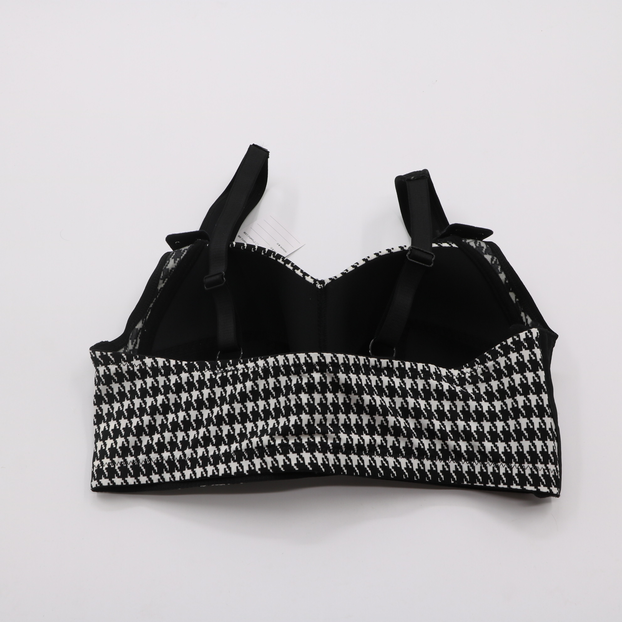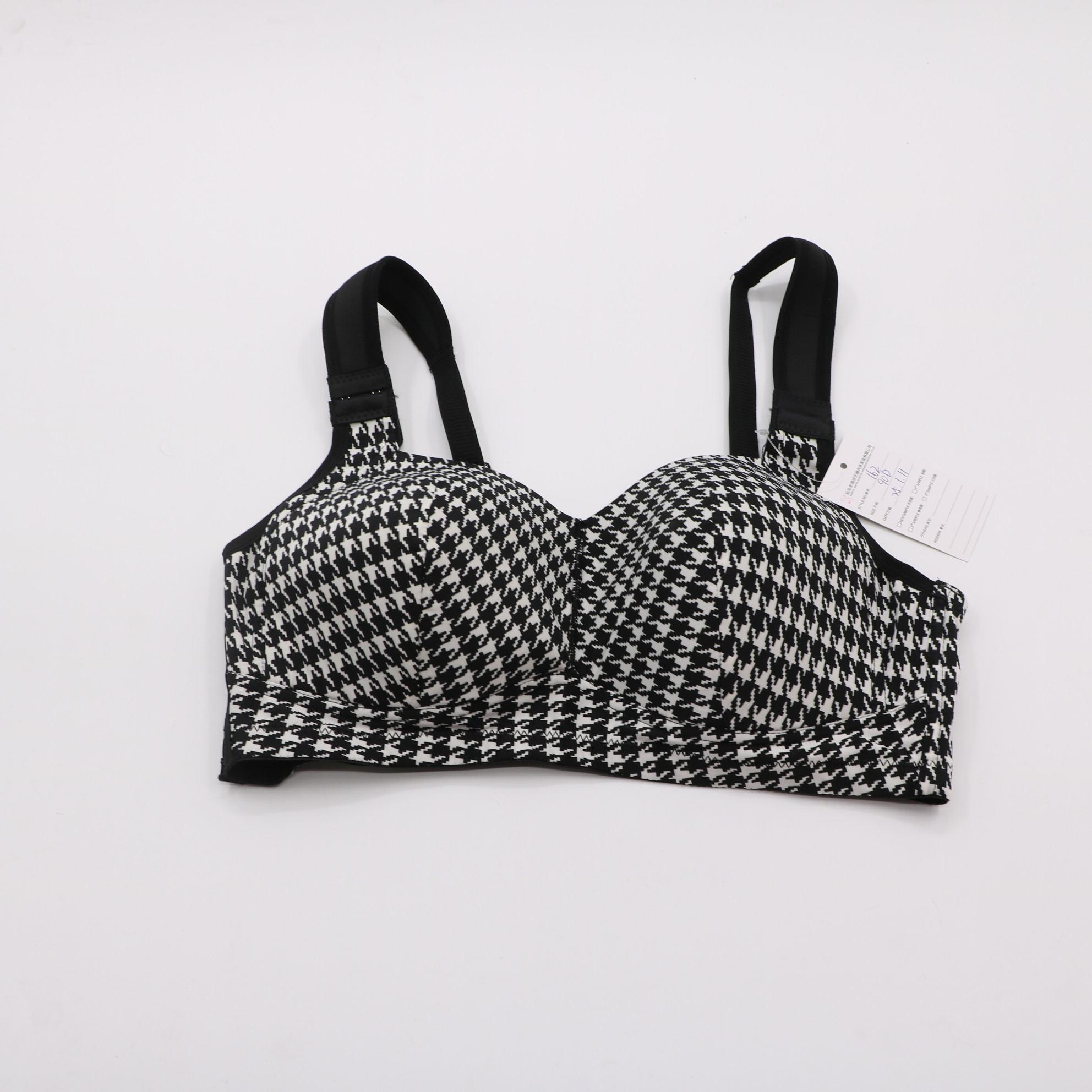 This stylish houndstooth-patterned bra features a wireless design for all-day comfort, with wide, padded straps to reduce shoulder pressure. The molded cups provide gentle shaping and support, while the bold black-and-white print adds a retro-inspired touch to your lingerie collection.