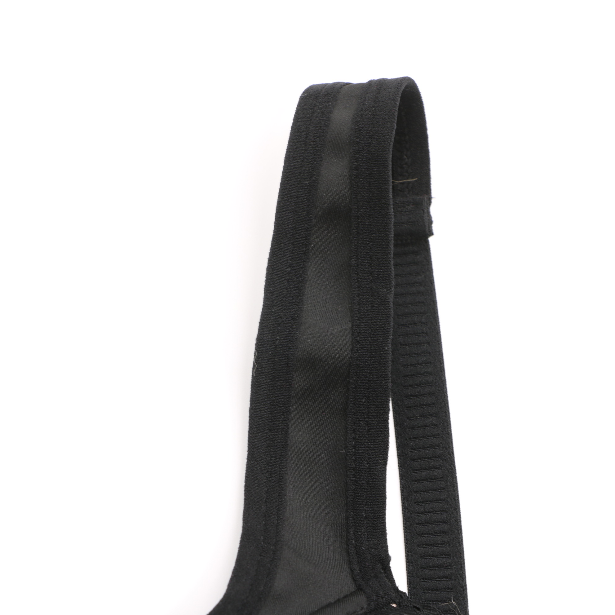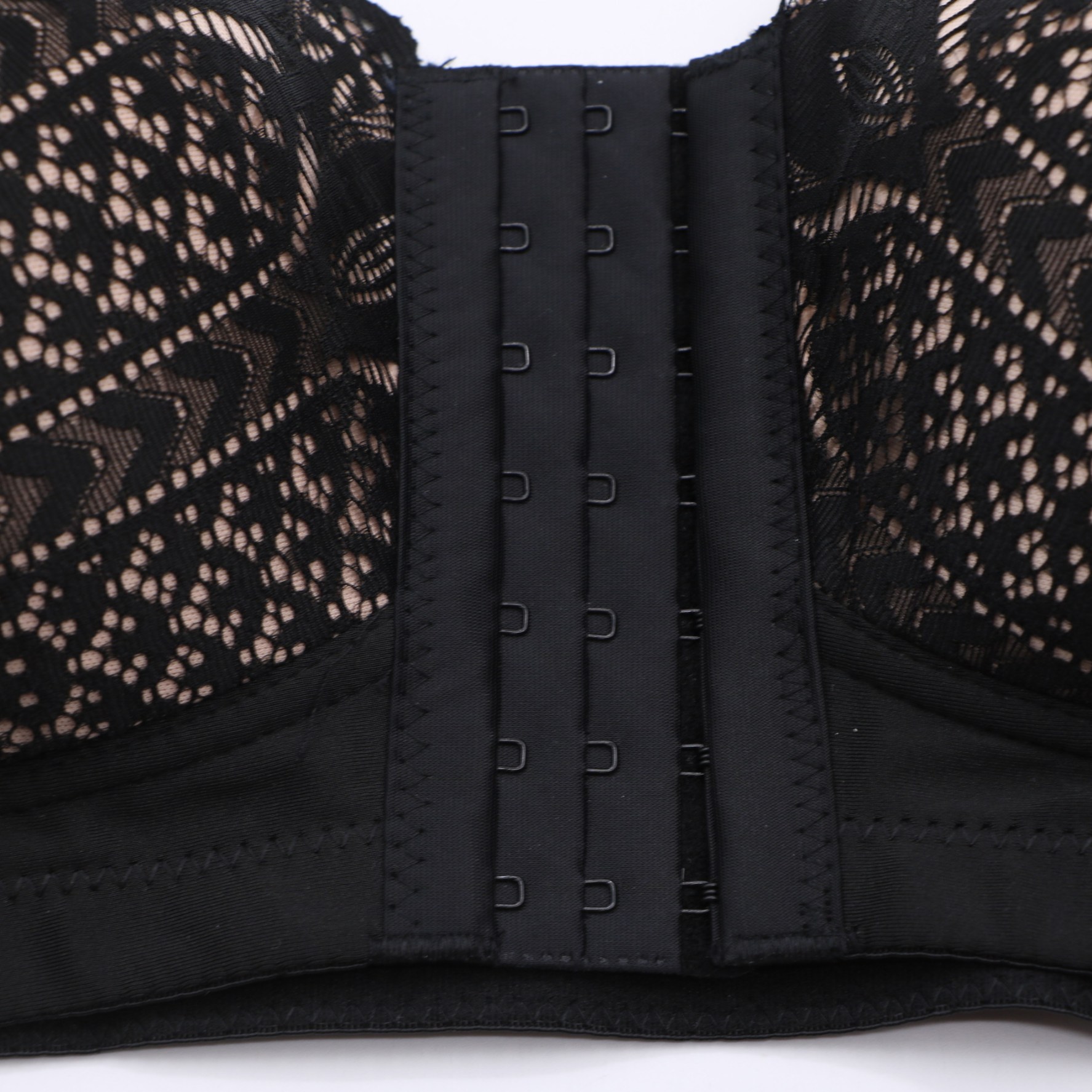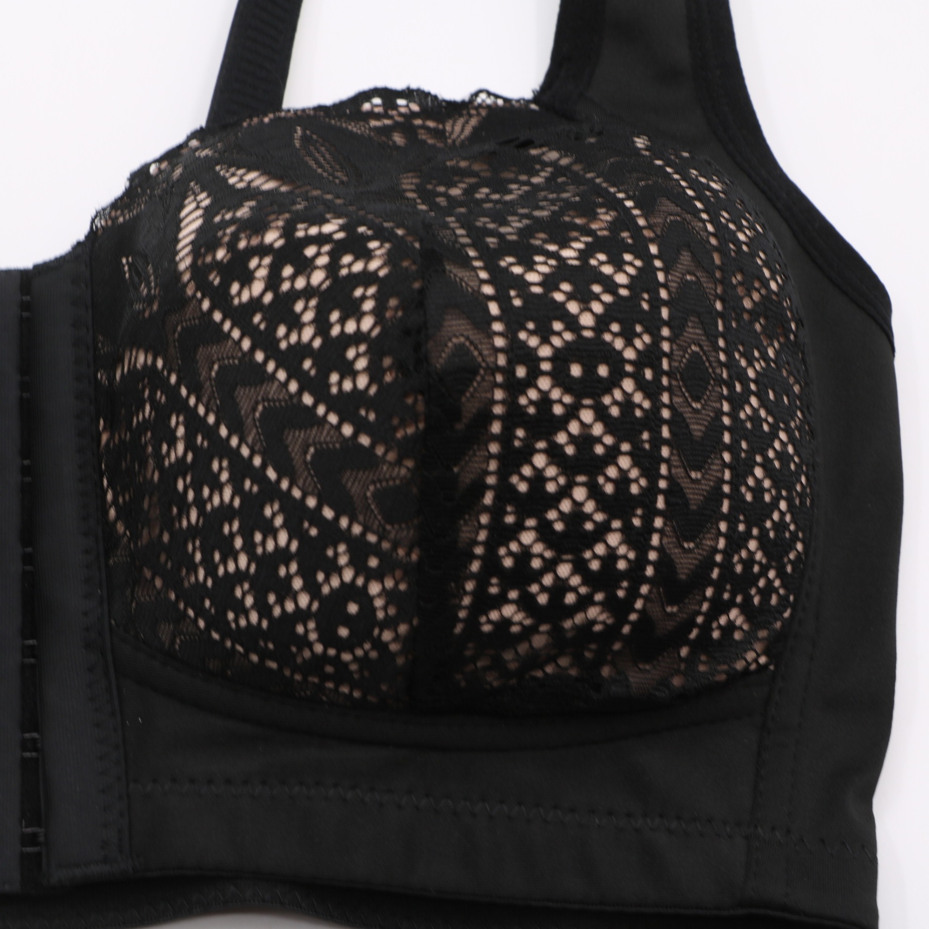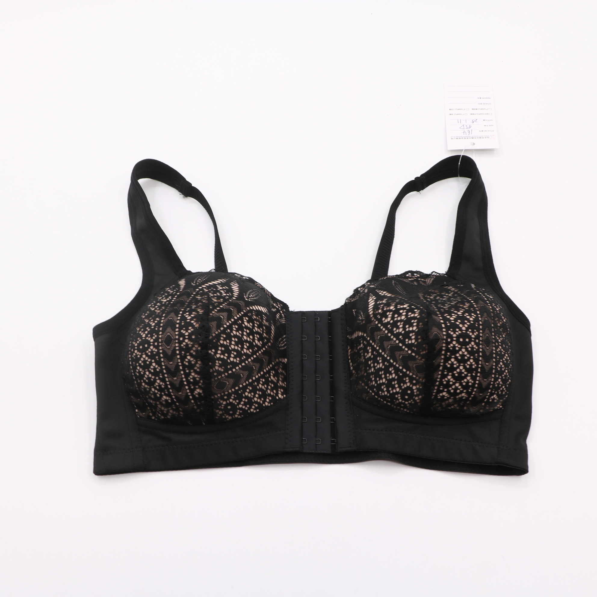 This supportive bra features intricate black geometric lace over a nude lining, with a convenient front closure for easy wear. The wide, padded straps reduce shoulder strain, while the molded cups provide gentle lift and shaping.
