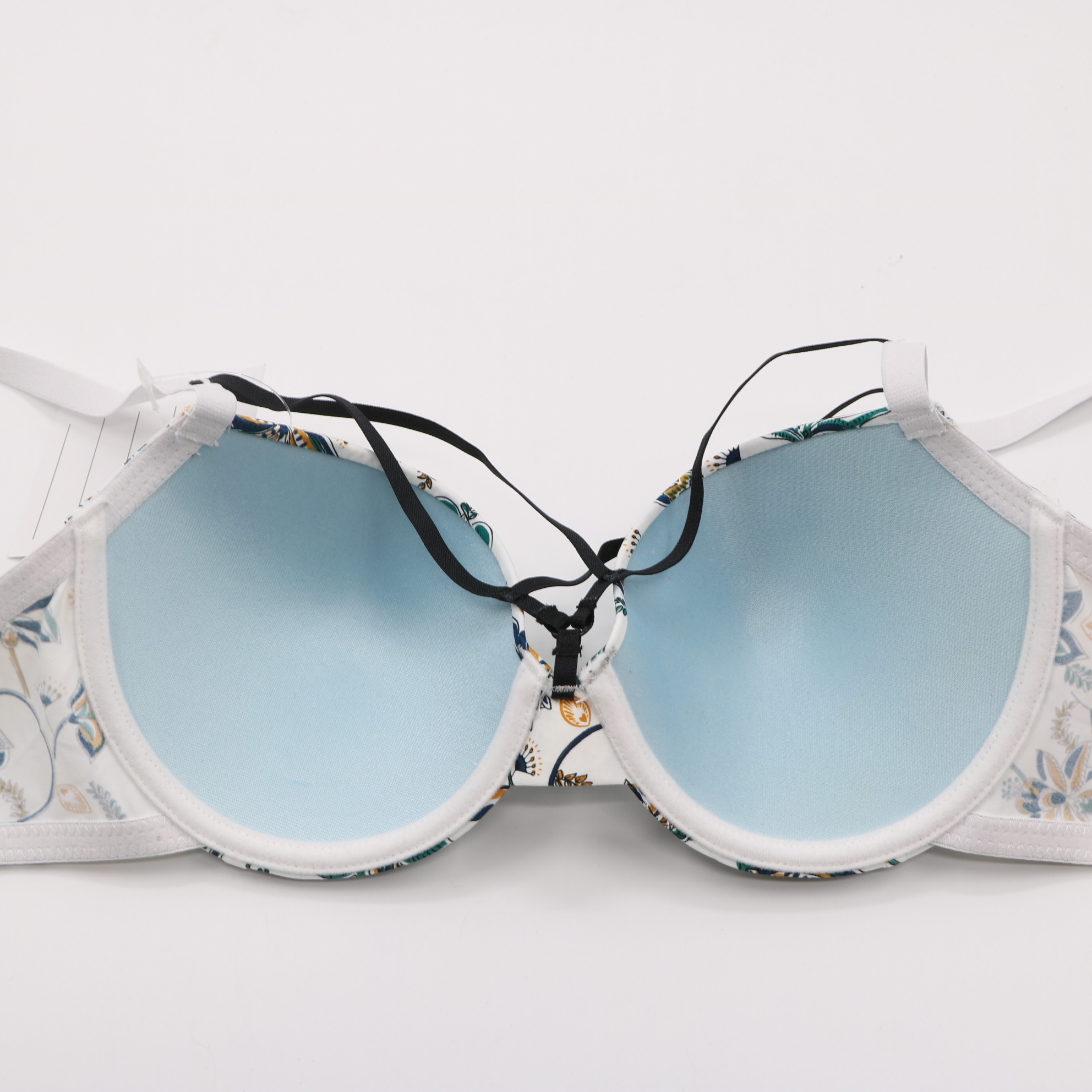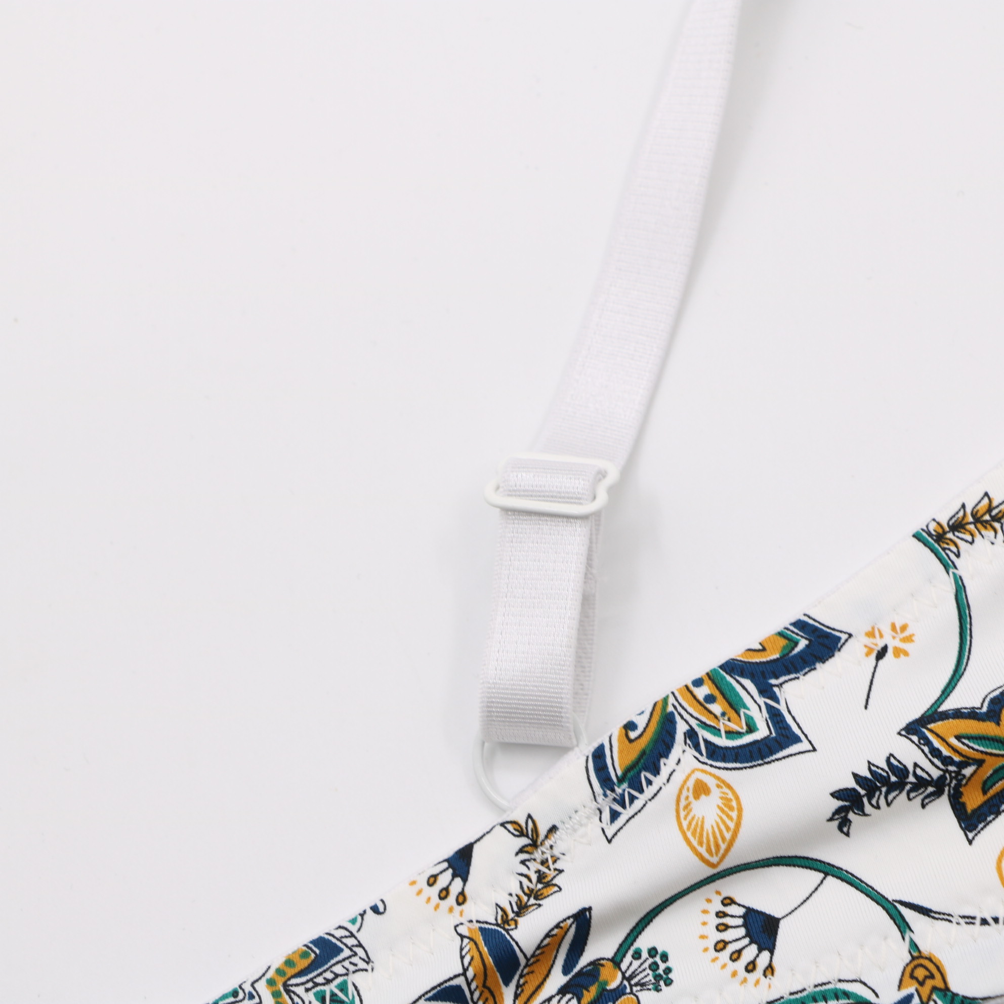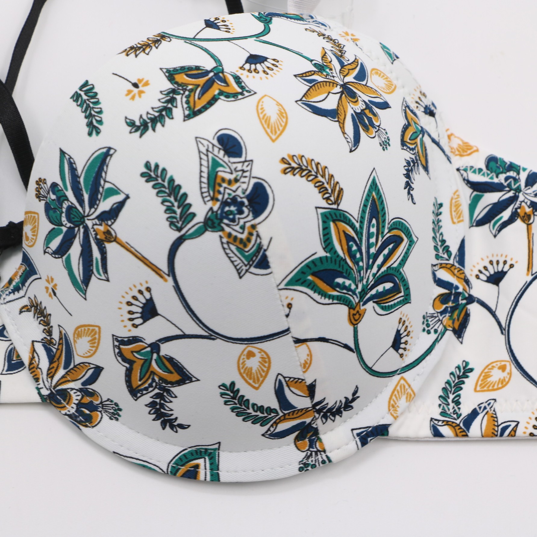 This vibrant bra features a tropical floral print on a white base, with a convertible strap design that allows for multiple wear styles, including a plunging Y-back. The molded cups provide gentle lift, while the smooth fabric ensures a seamless fit under clothing.