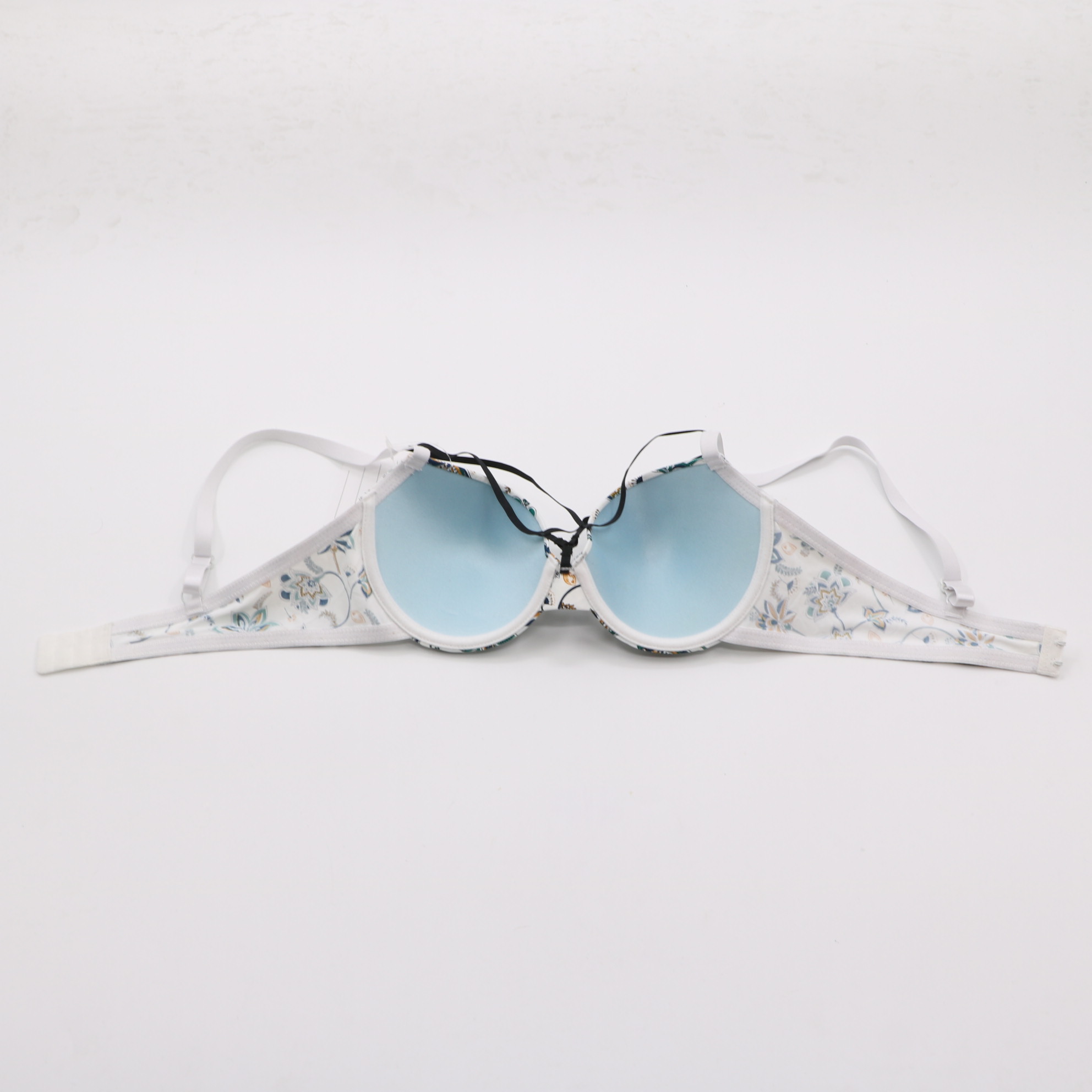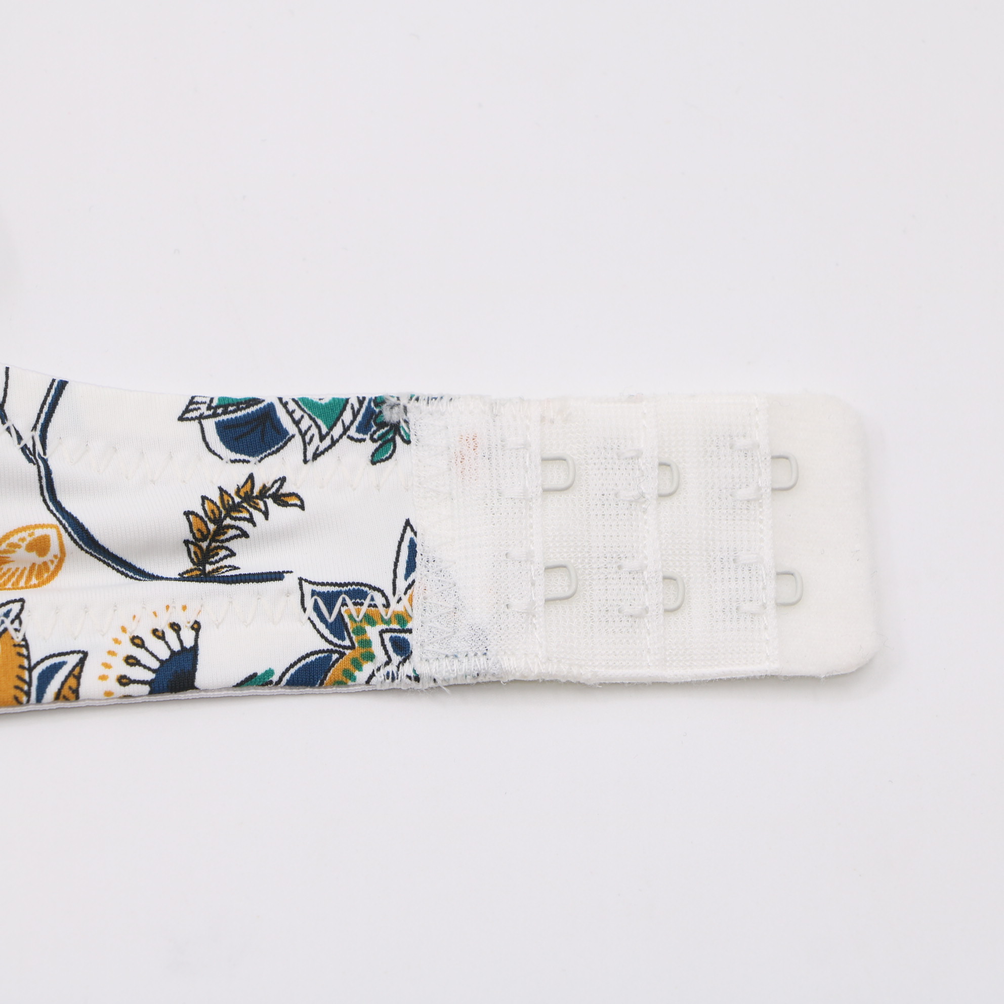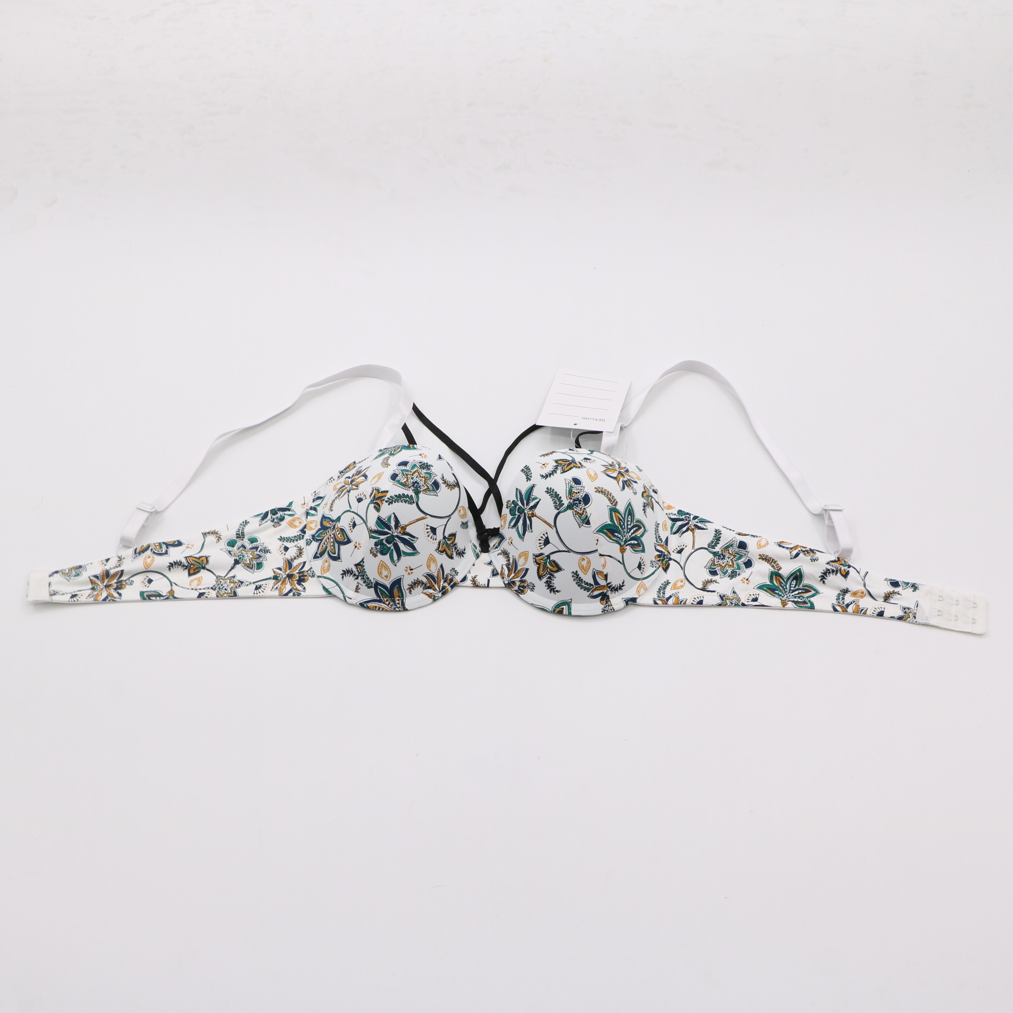 This vibrant bra features a tropical floral print on a white base, with a convertible strap design that allows for multiple wear styles, including a plunging Y-back. The molded cups provide gentle lift, while the smooth fabric ensures a seamless fit under clothing.