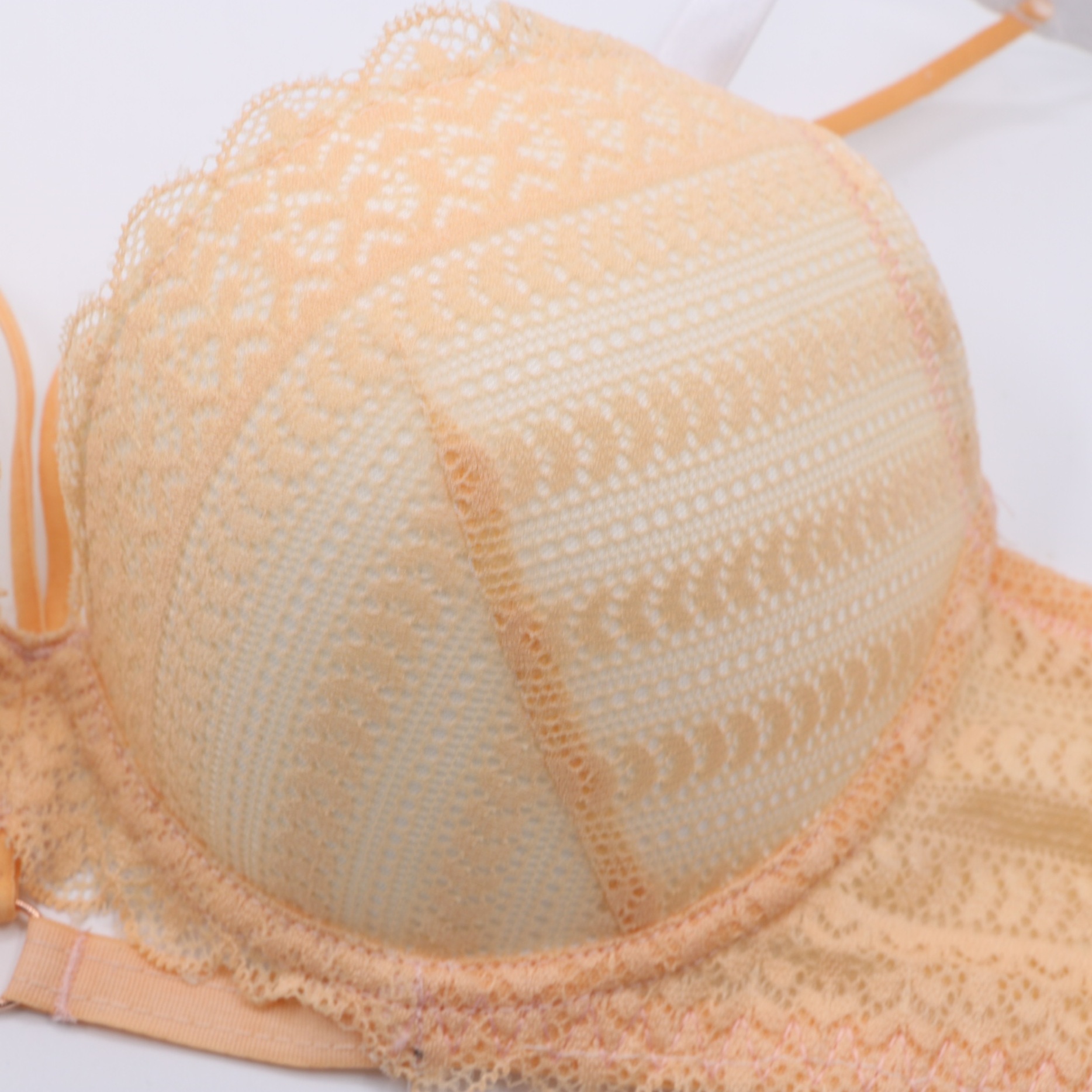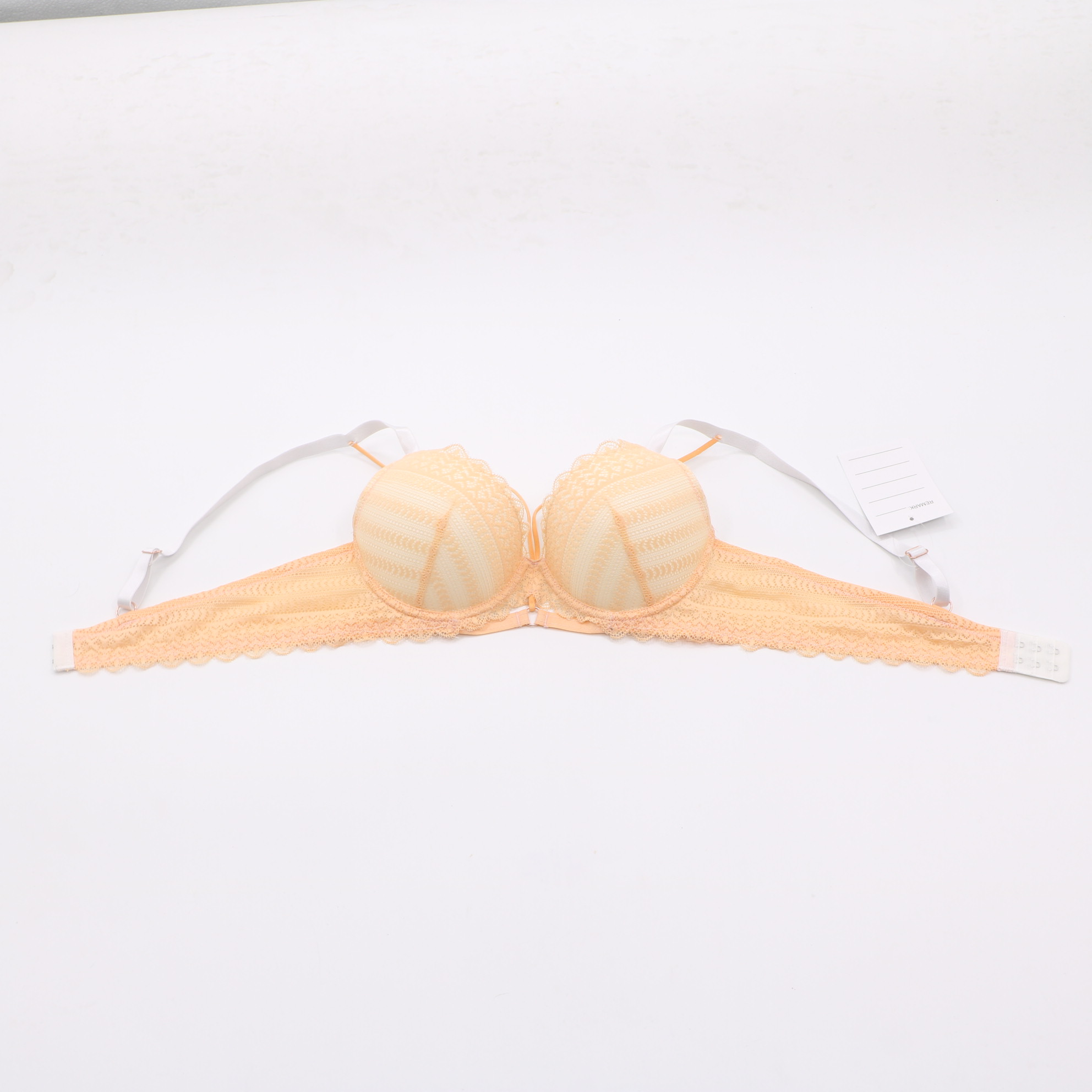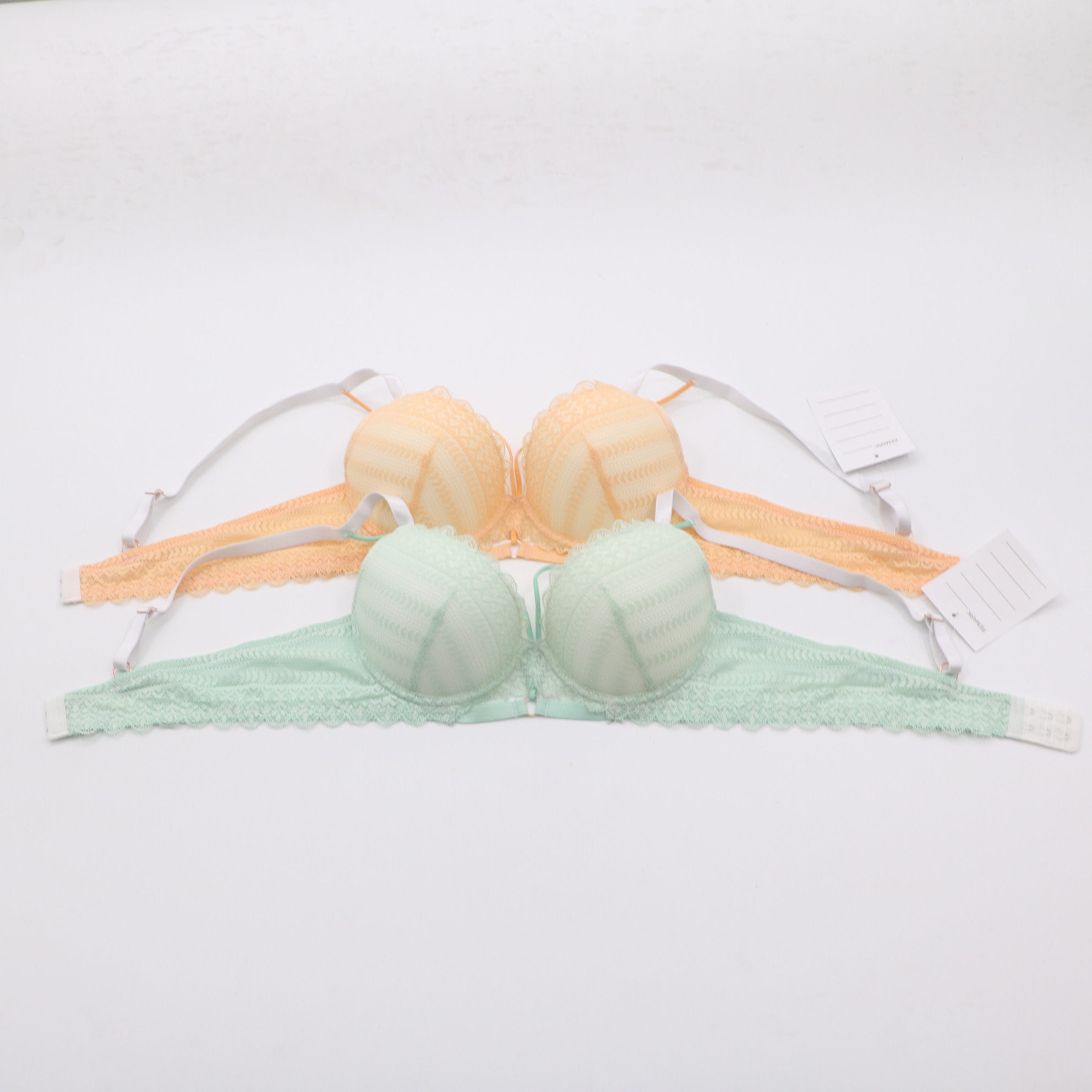 This delicate bra features intricate geometric lace in soft peach and mint hues, with a convertible strap design and front closure for versatile wear. The molded cups provide gentle lift, while the scalloped lace edges add a feminine touch.