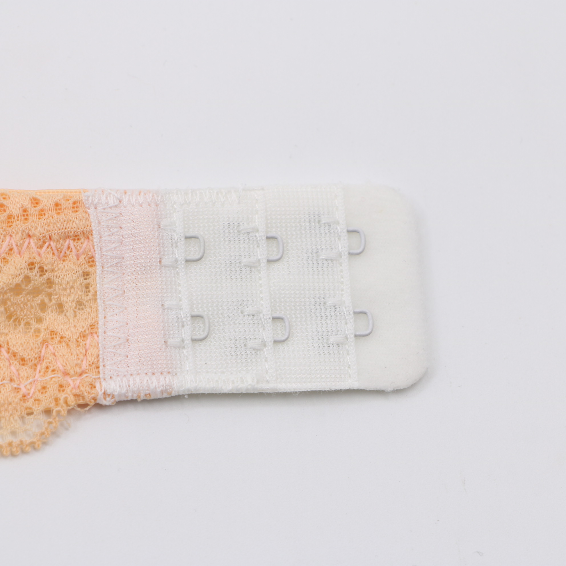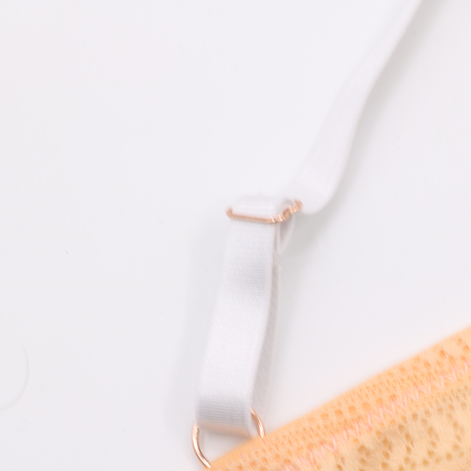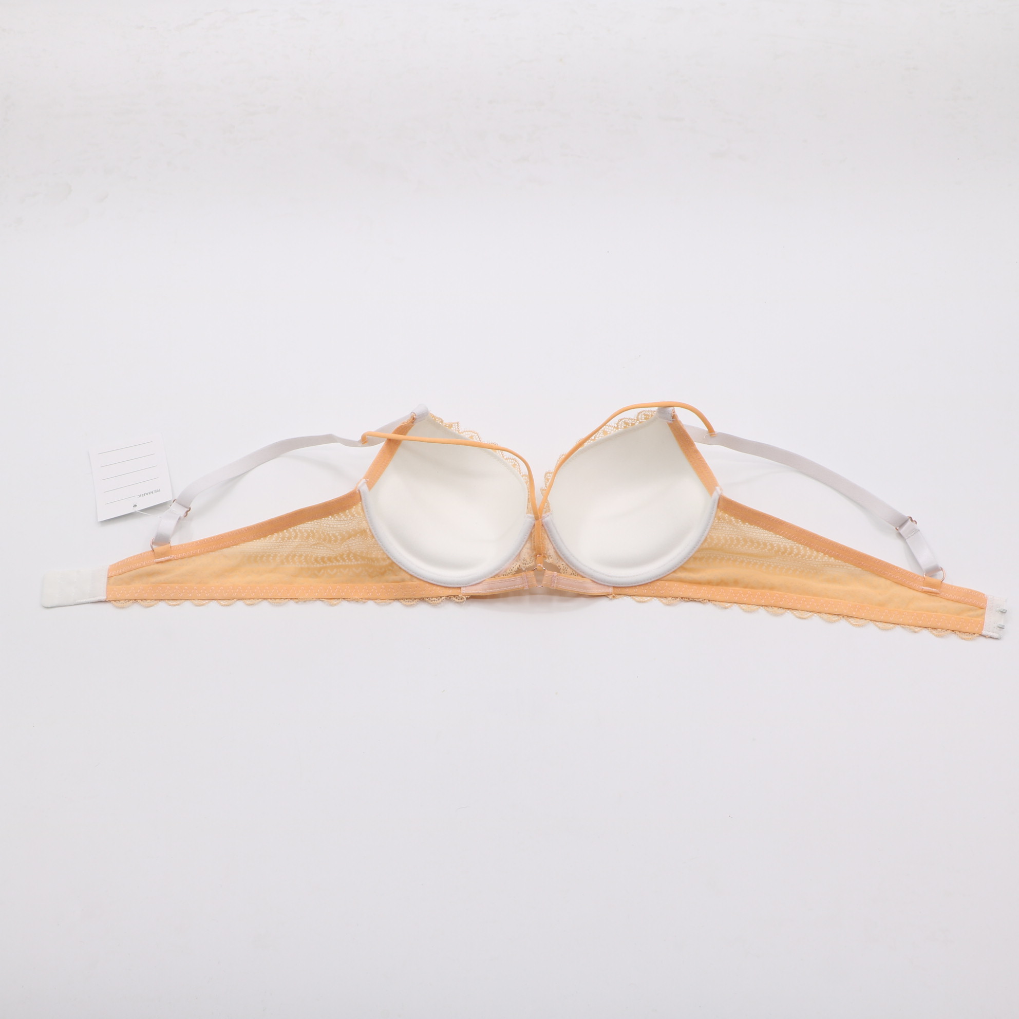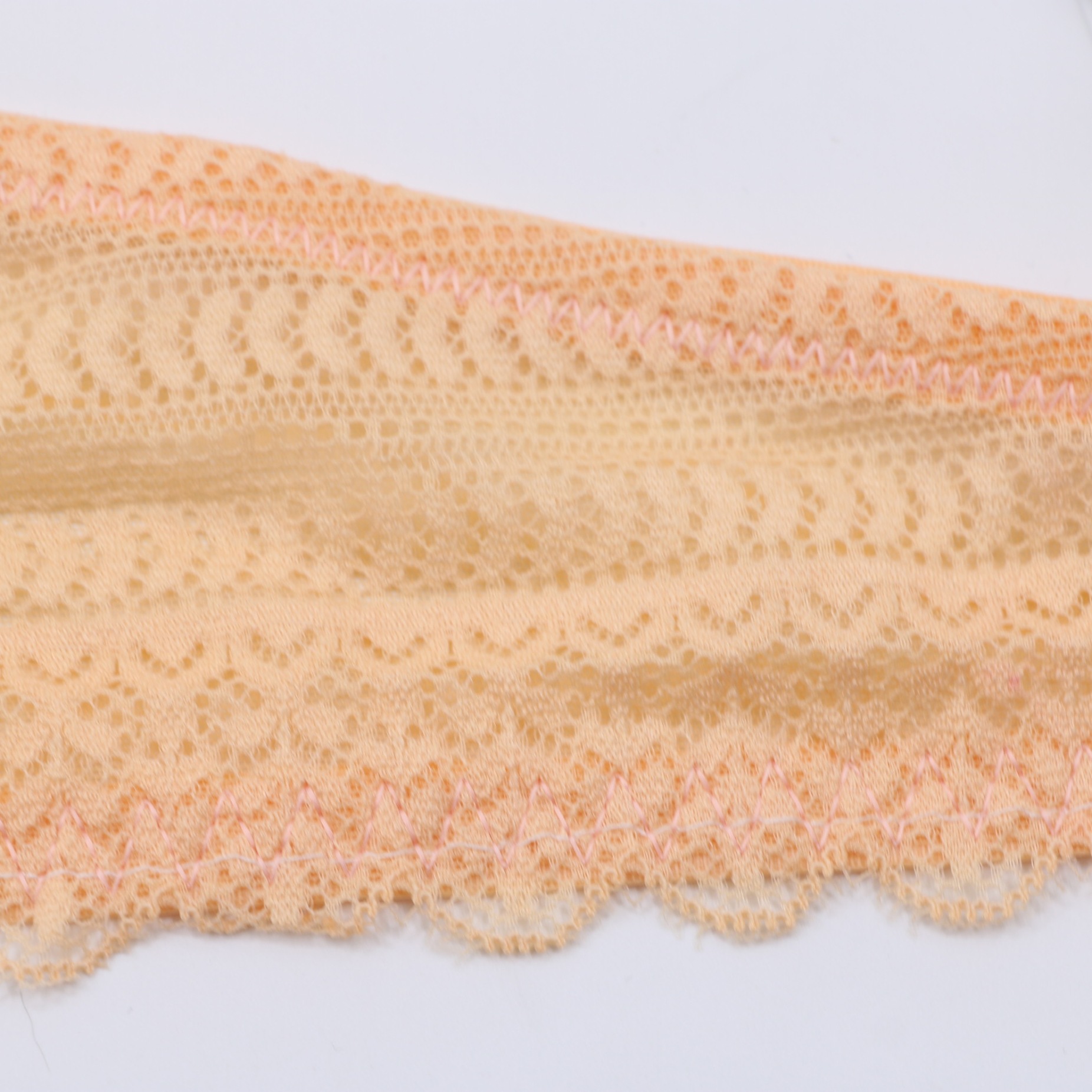 This delicate bra features intricate geometric lace in soft peach and mint hues, with a convertible strap design and front closure for versatile wear. The molded cups provide gentle lift, while the scalloped lace edges add a feminine touch.