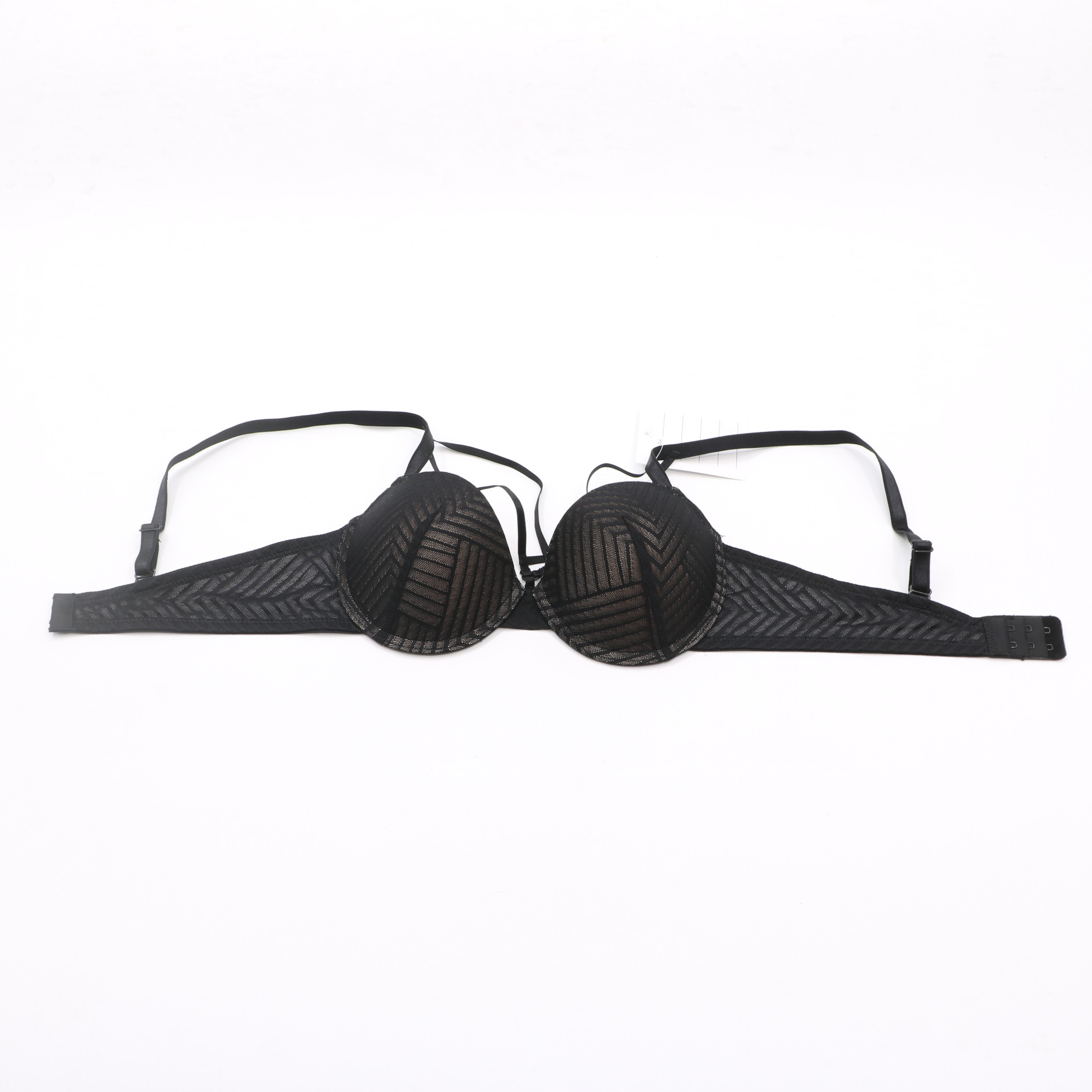 Sleek sheer lace bra with a geometric pattern, strappy front detail, and soft molded cups. Designed for a seductive look with adjustable straps and a secure hook-and-eye closure.