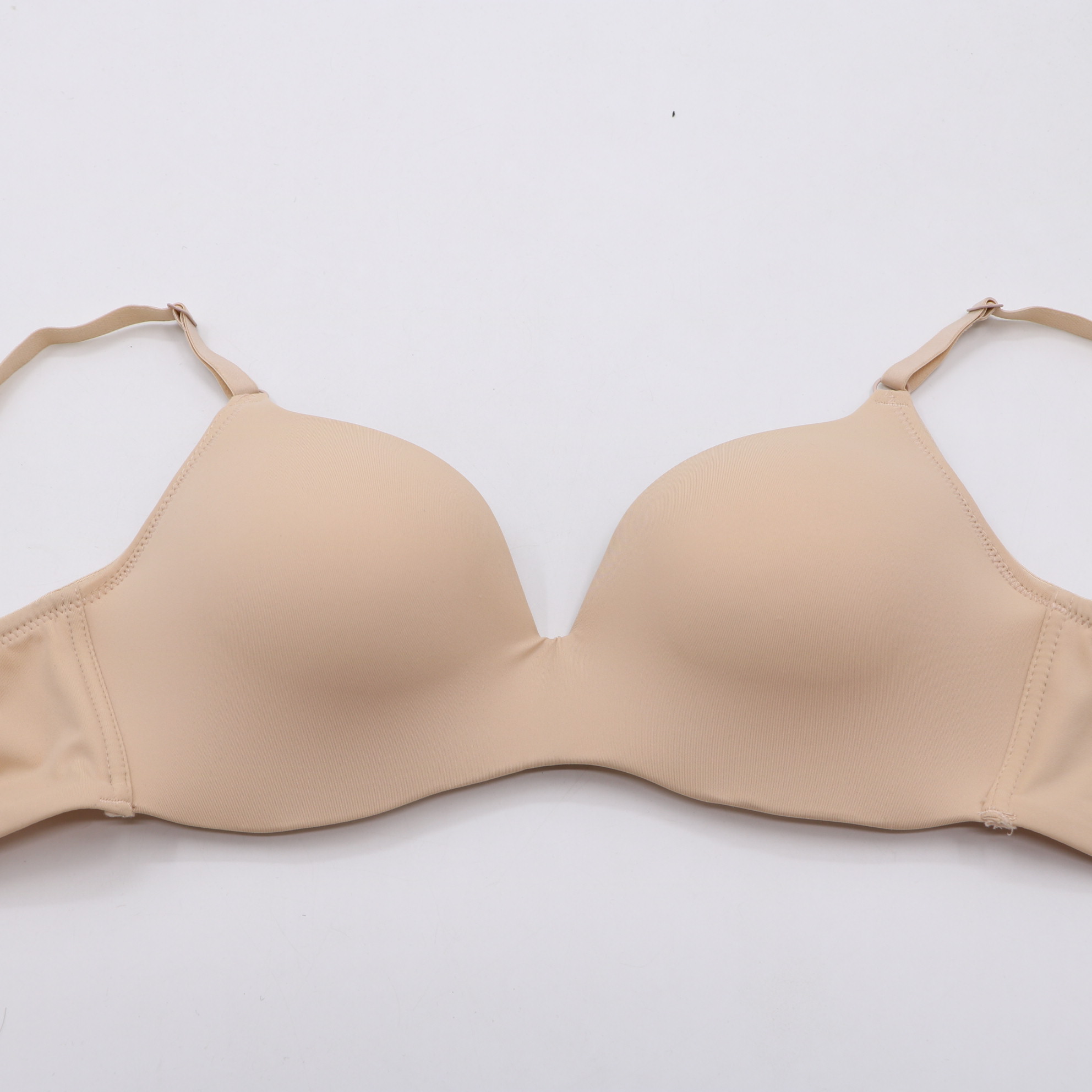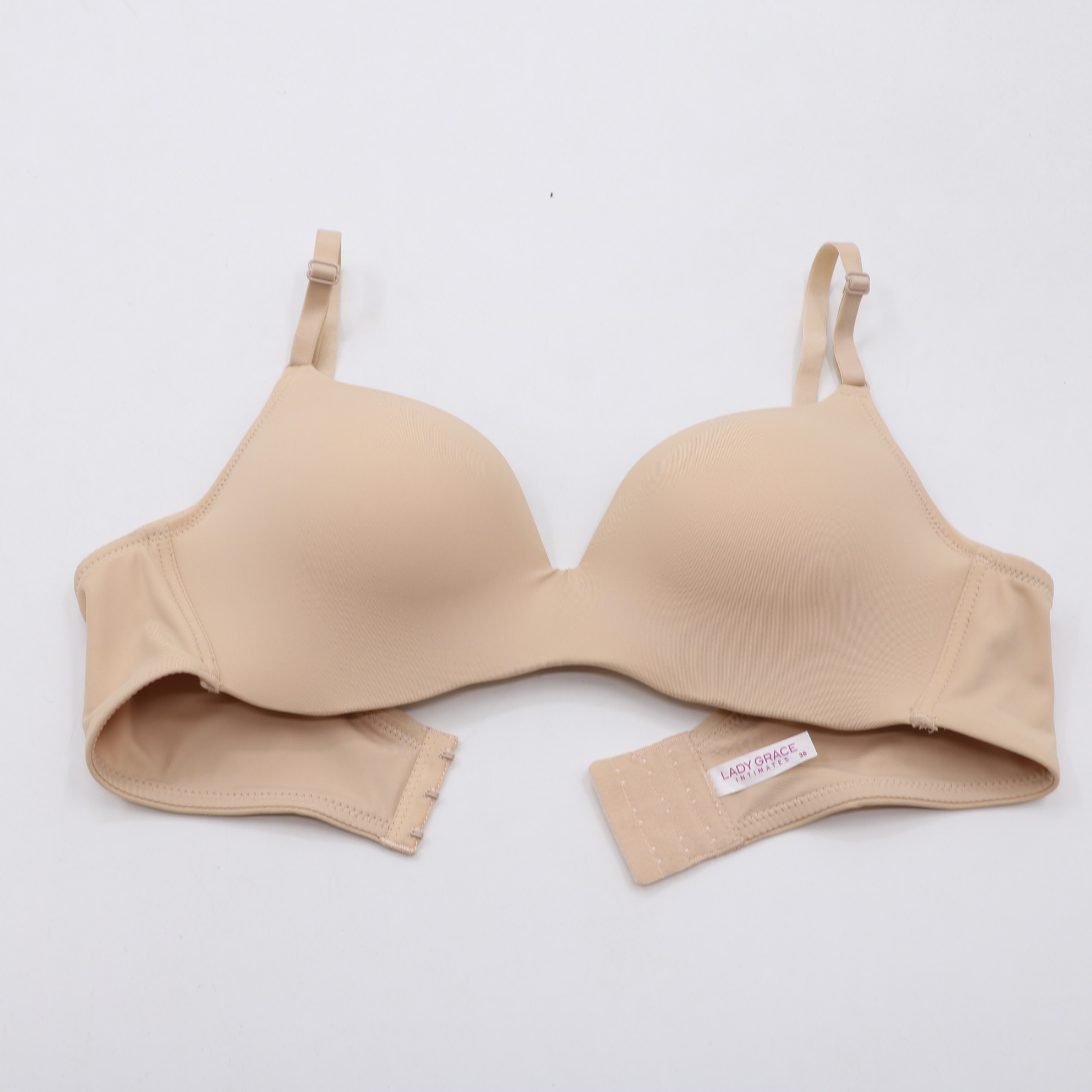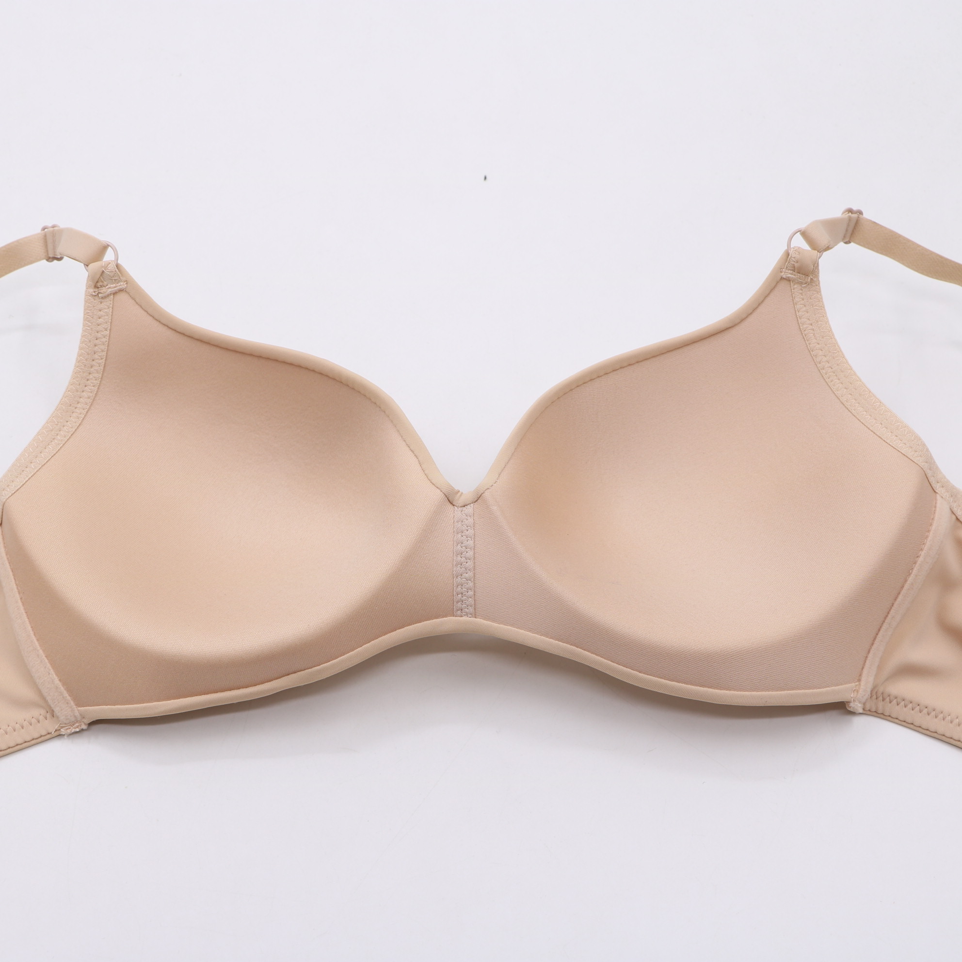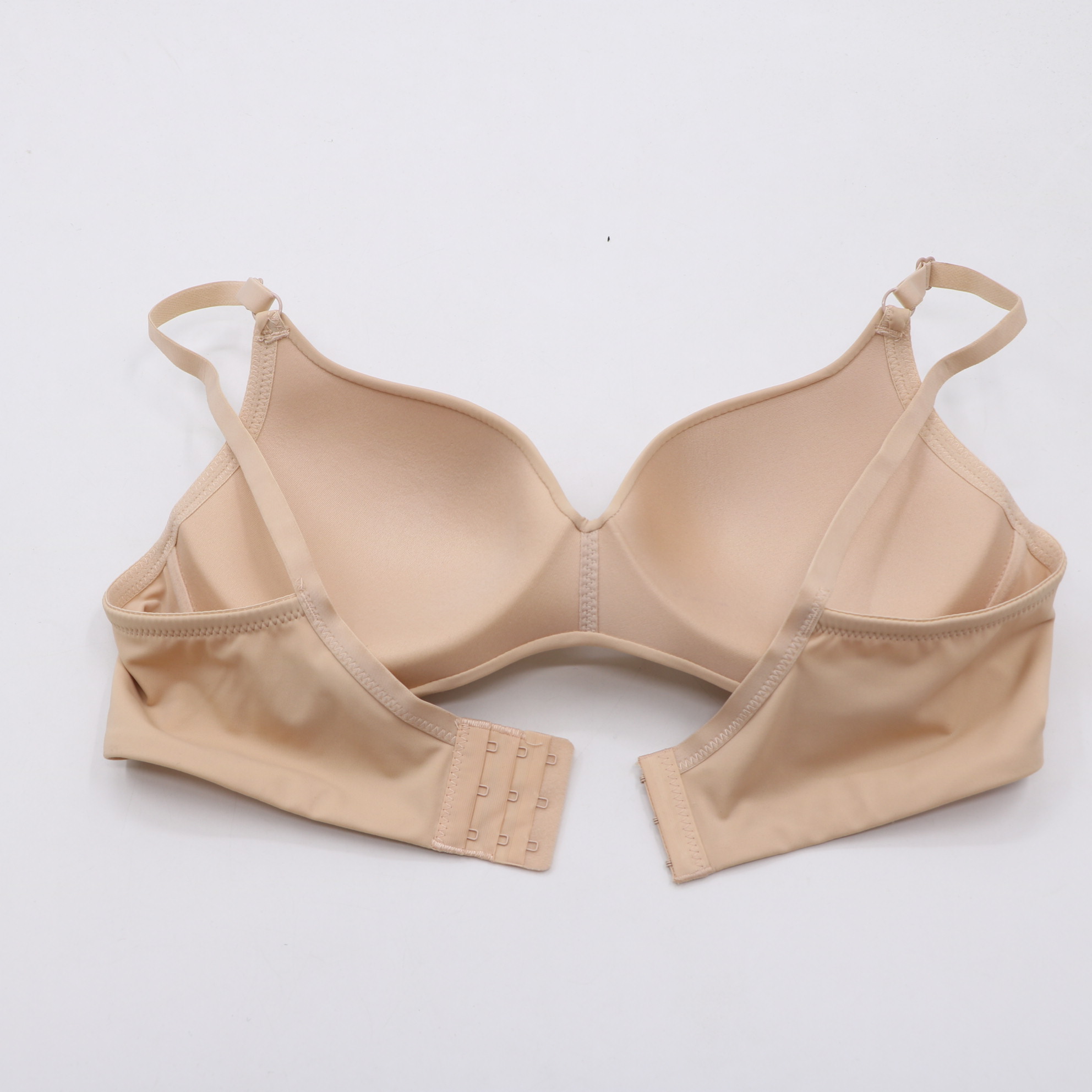 Smooth seamless molded cup bra with a minimalist design, adjustable straps, and 3-row hook-and-eye closure for an invisible, comfortable fit under t-shirts and tight outfits.