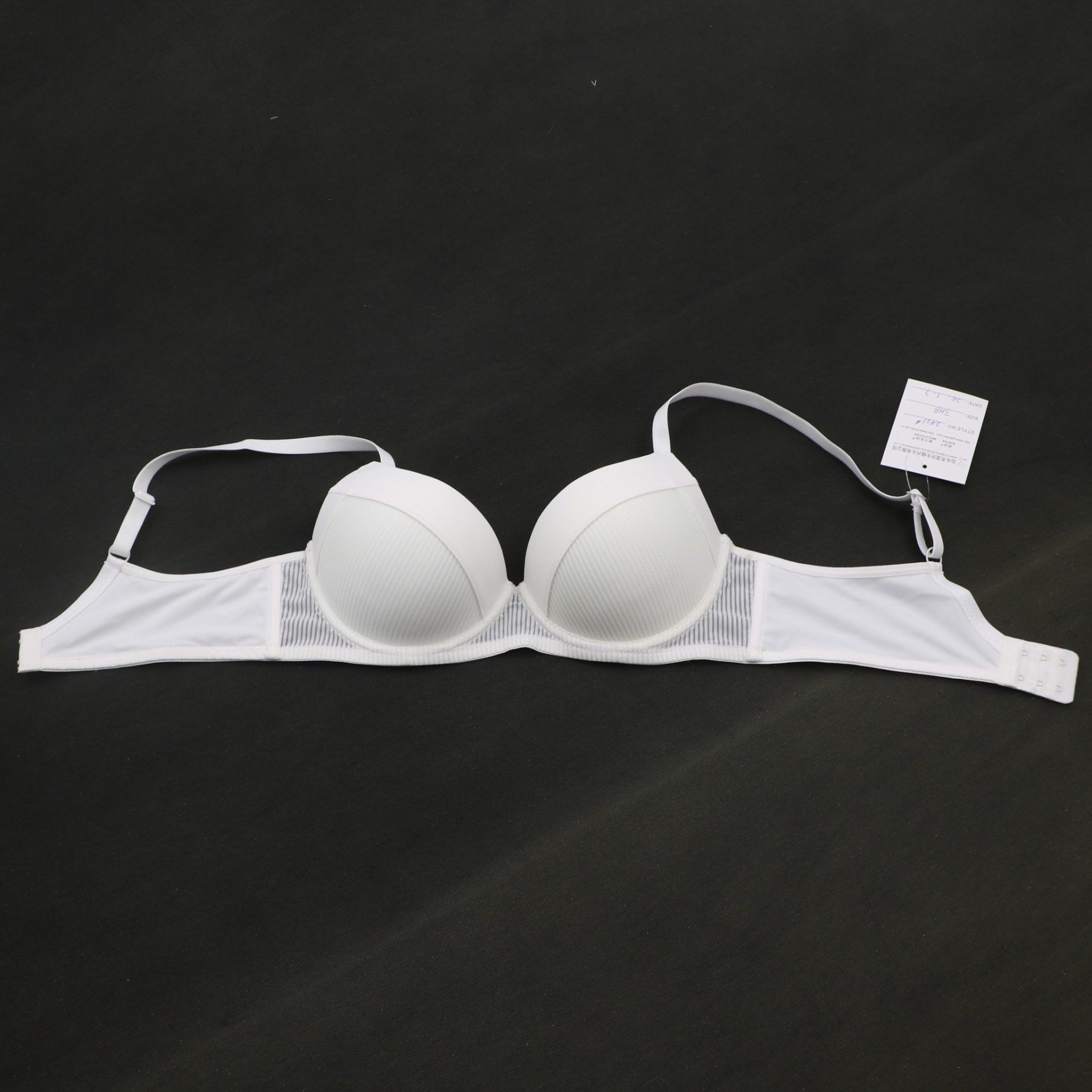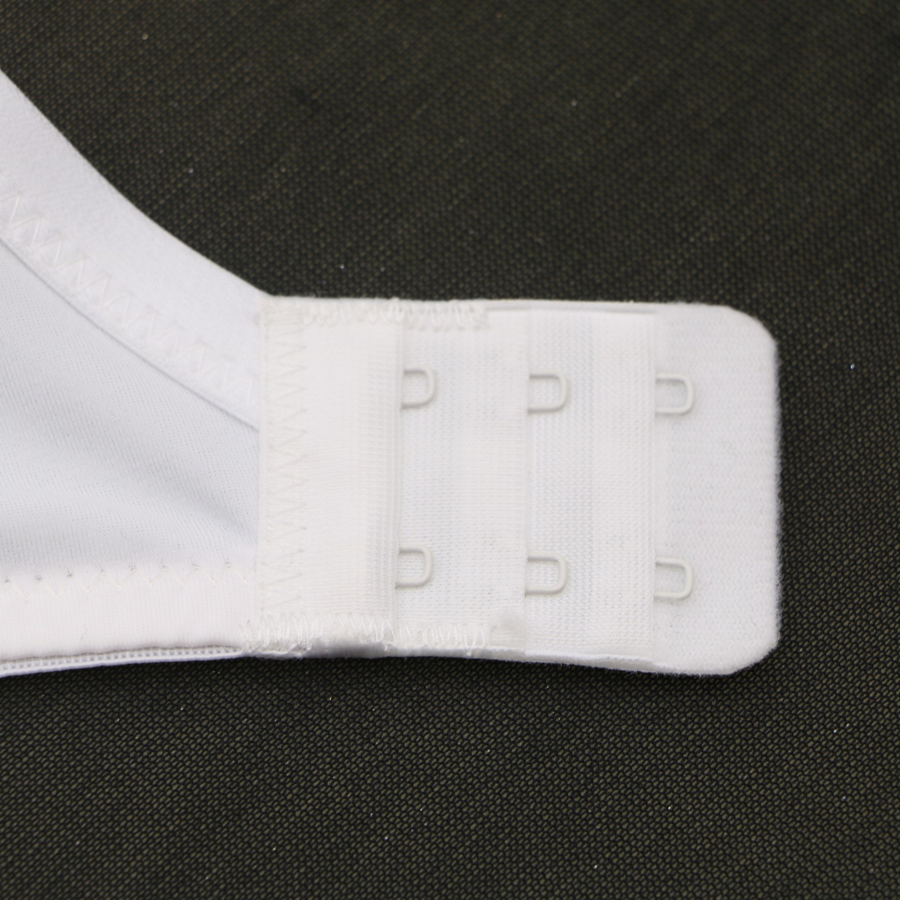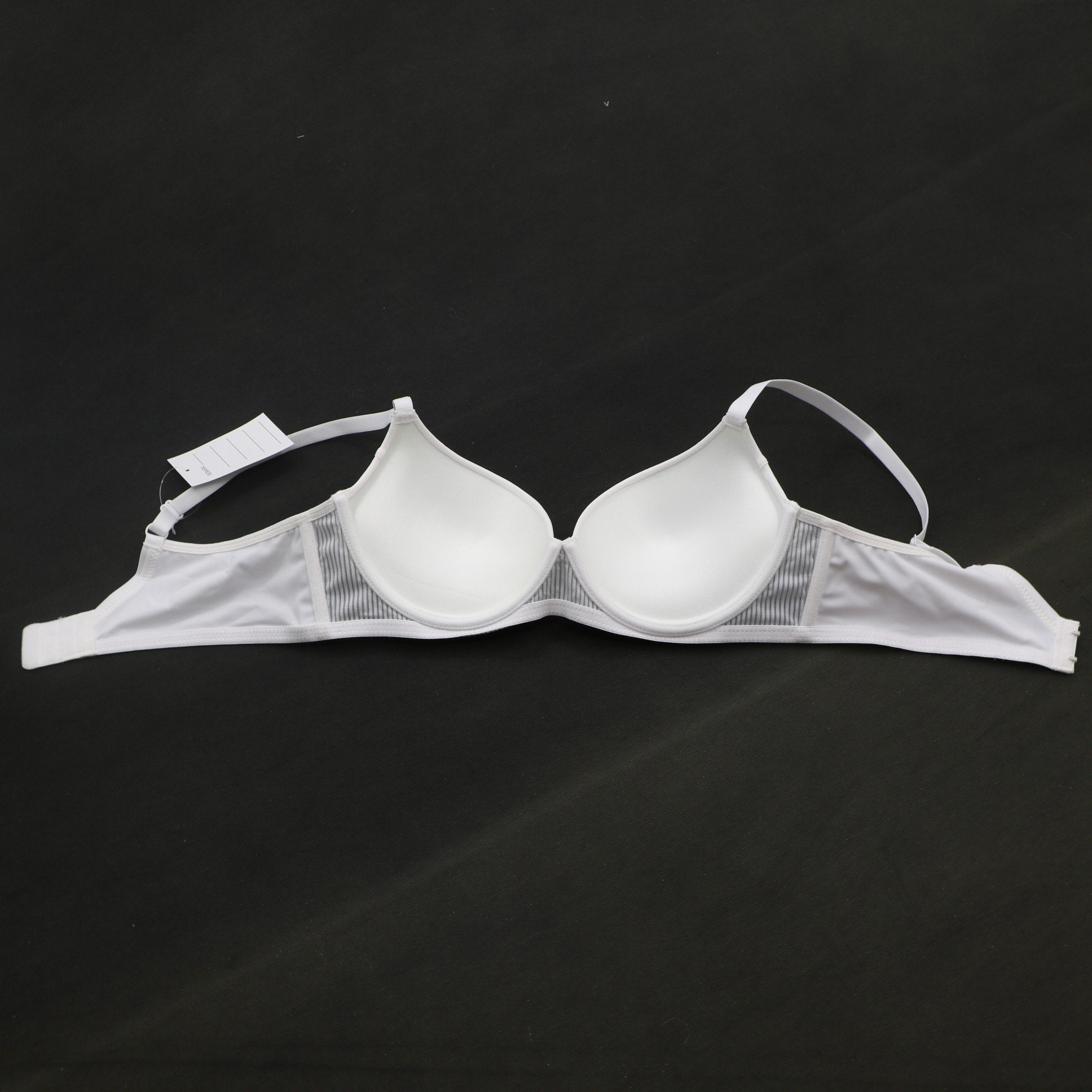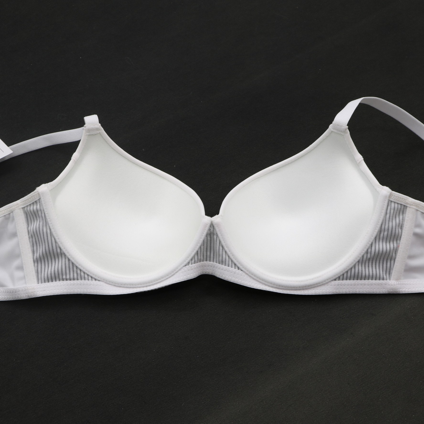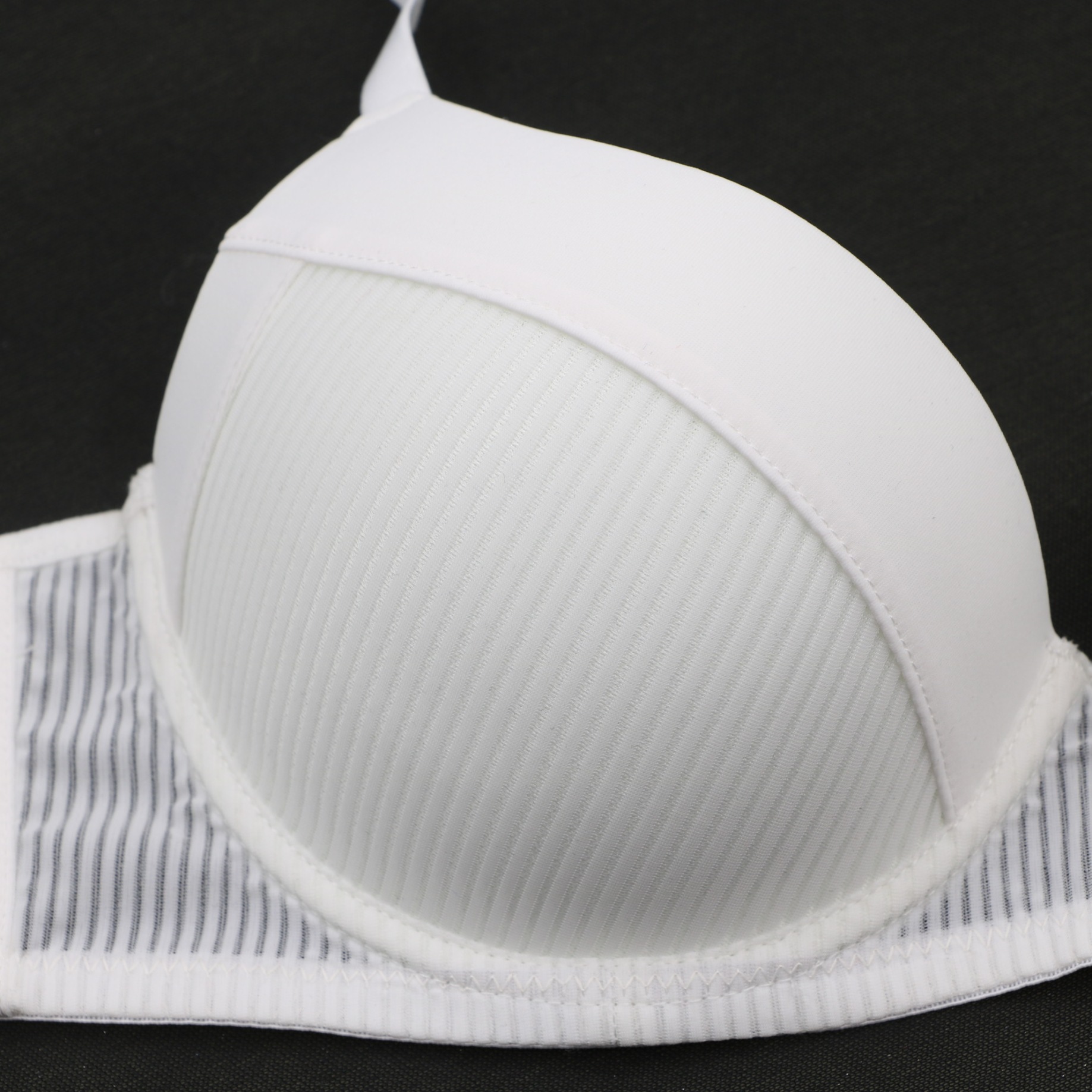 This clean white bra features ribbed molded cups and striped mesh side panels for a modern, breathable look. The adjustable straps and 2-row hook-and-eye closure ensure a secure, personalized fit, making it perfect for all-day comfort under any outfit.