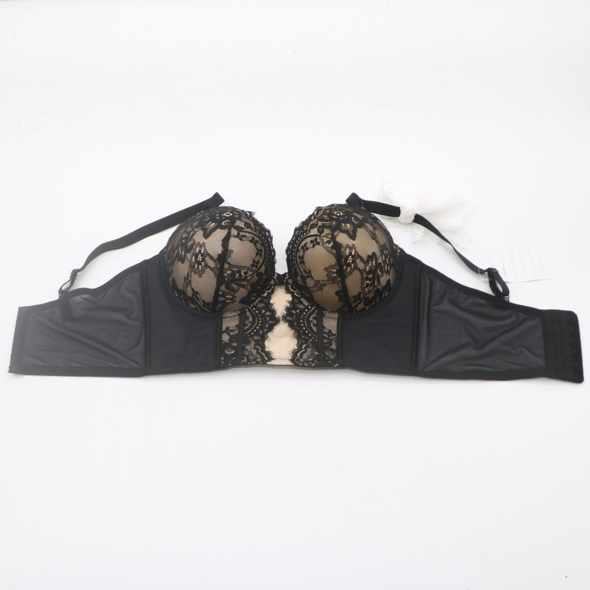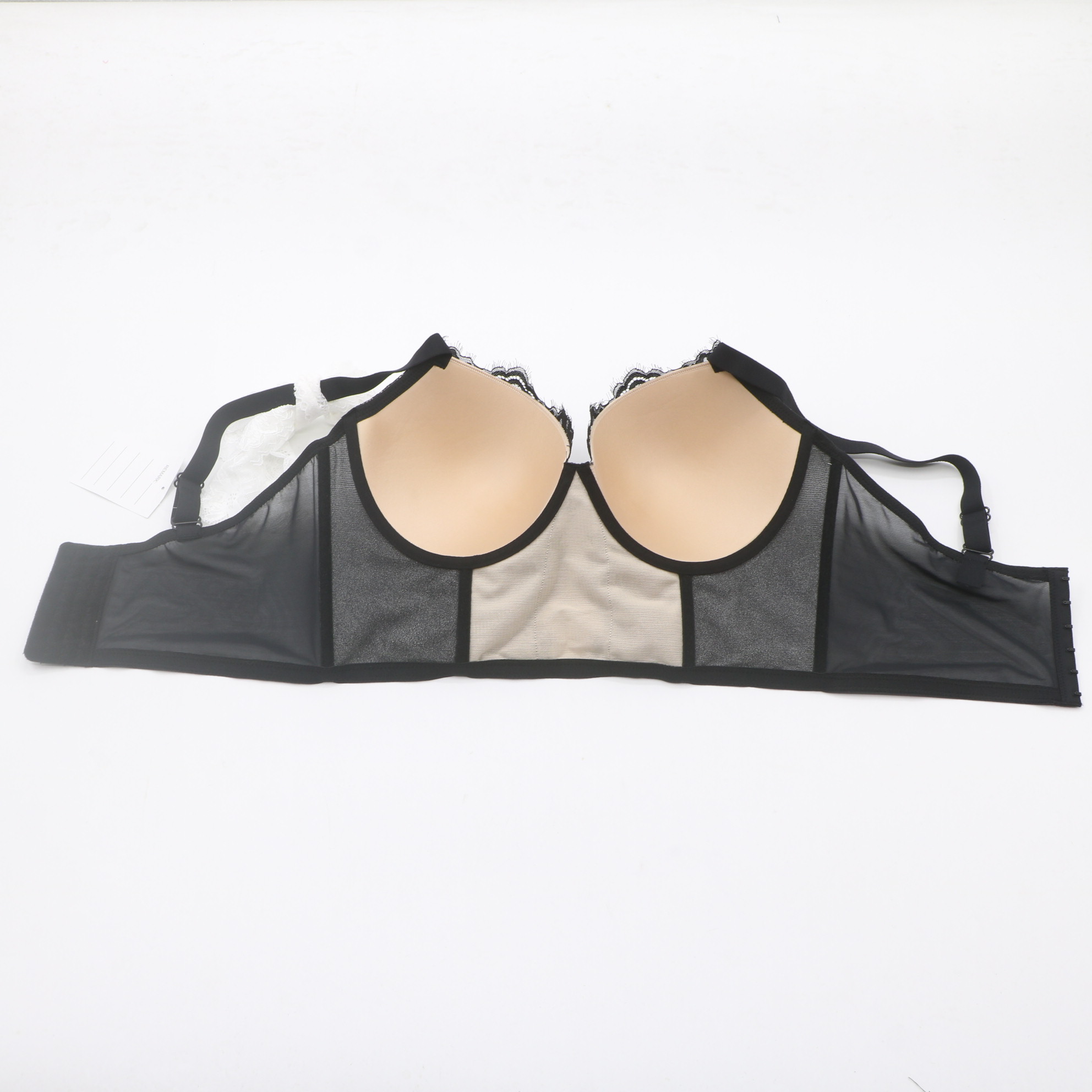 This black push-up bra features intricate floral lace overlaying nude-lined molded cups for a flattering lift and a sheer, alluring look. The side panels are crafted from breathable black mesh, while the adjustable straps and 4-row back closure ensure a secure, personalized fit. Crafted from smooth fabric, it offers all-day comfort and a seamless look under clothing, perfect for special occasions.