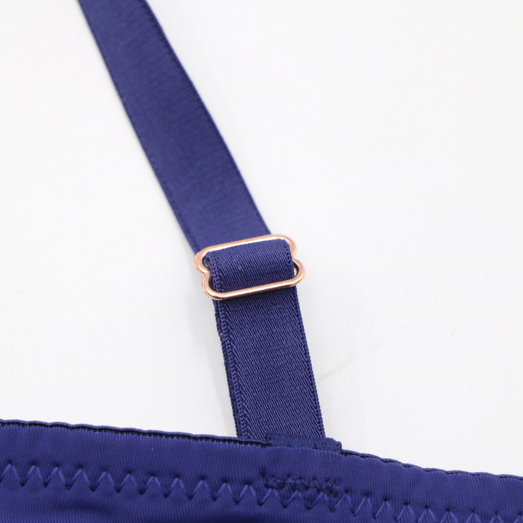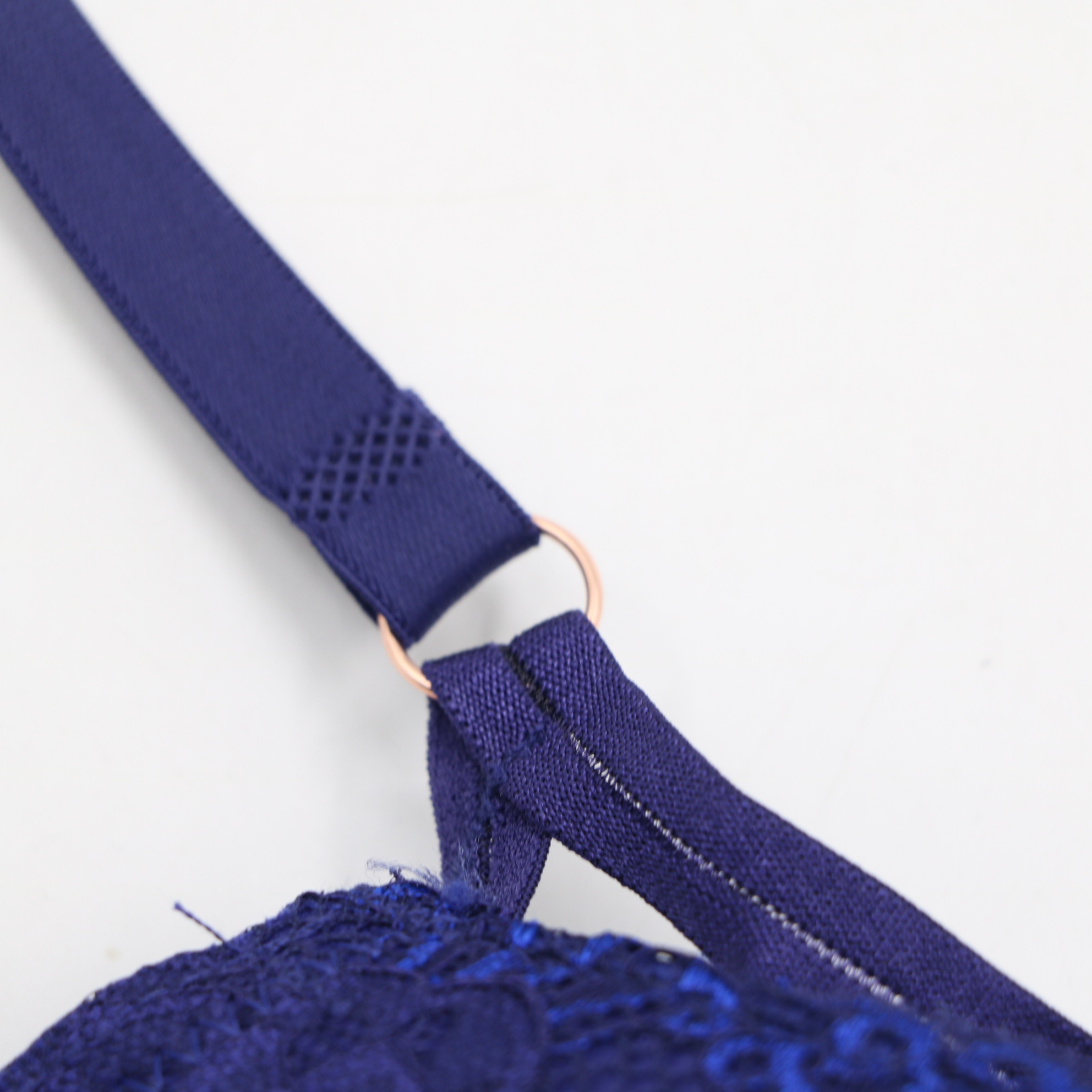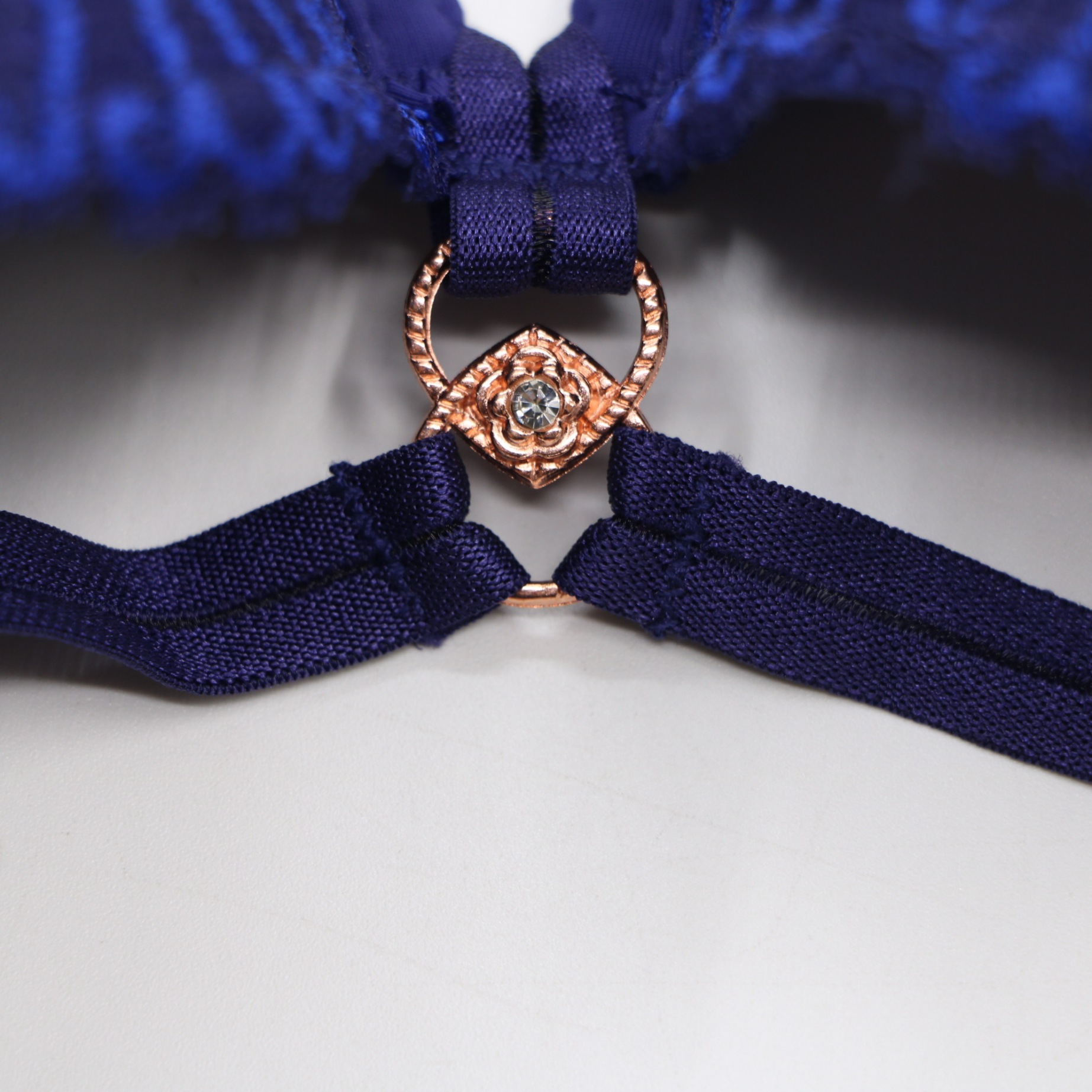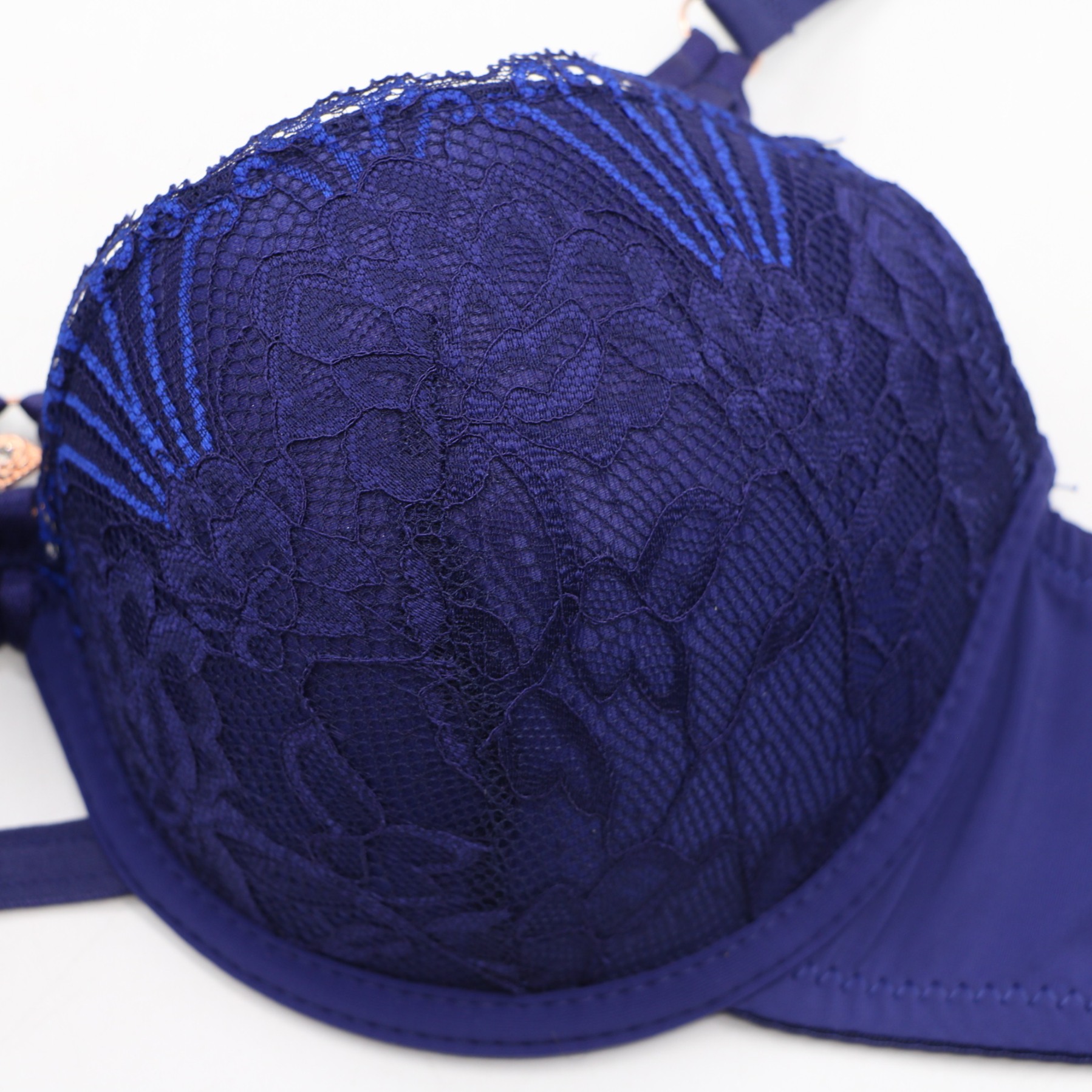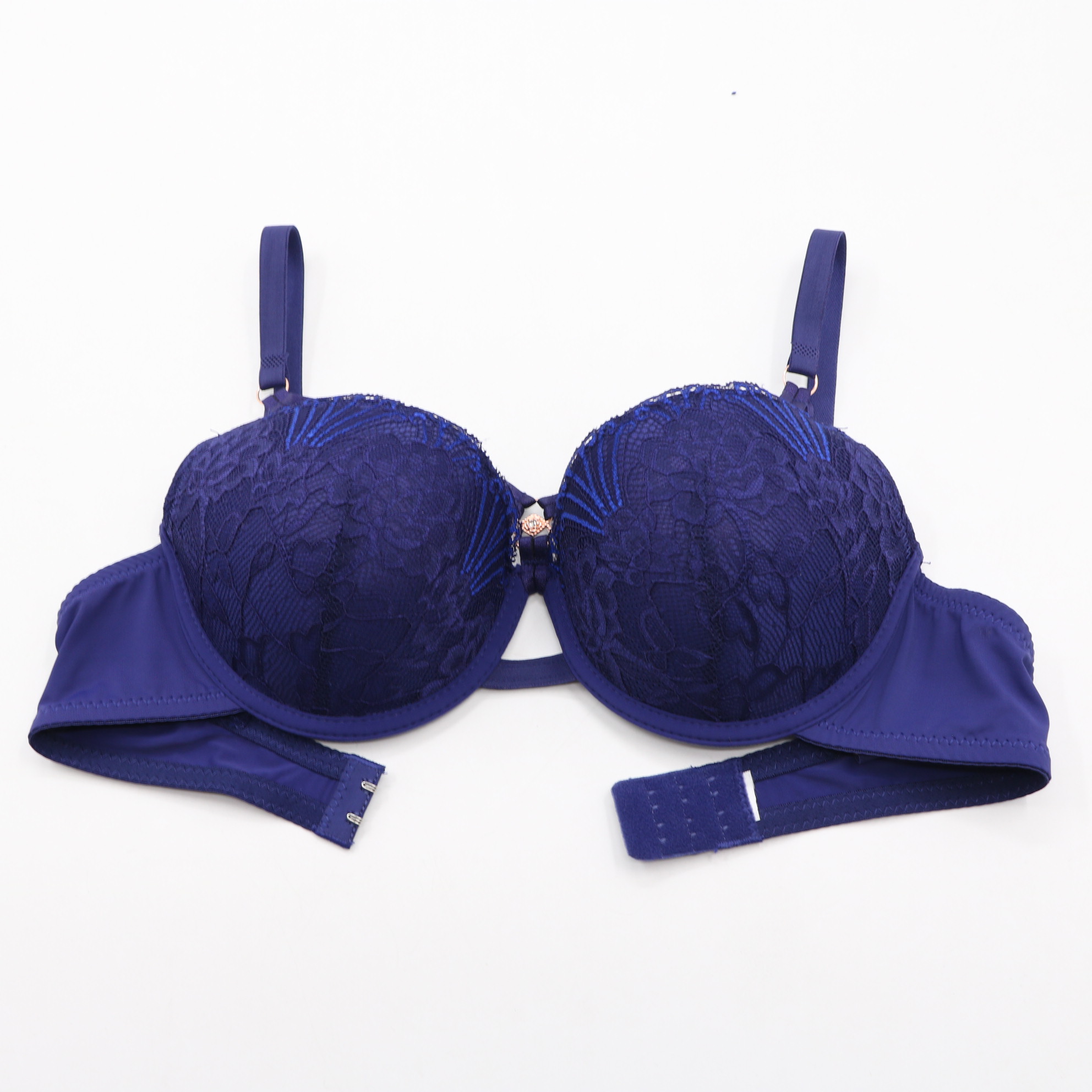This navy blue push-up bra features intricate floral lace cups with a decorative rose gold-tone crystal accent at the center, paired with a modern crisscross strap detail for an alluring look. The molded cups provide a flattering lift, while the adjustable straps with rose gold hardware and 2-row back closure ensure a secure, personalized fit. Crafted from smooth fabric, it offers all-day comfort and a seamless look under clothing, perfect for special occasions.