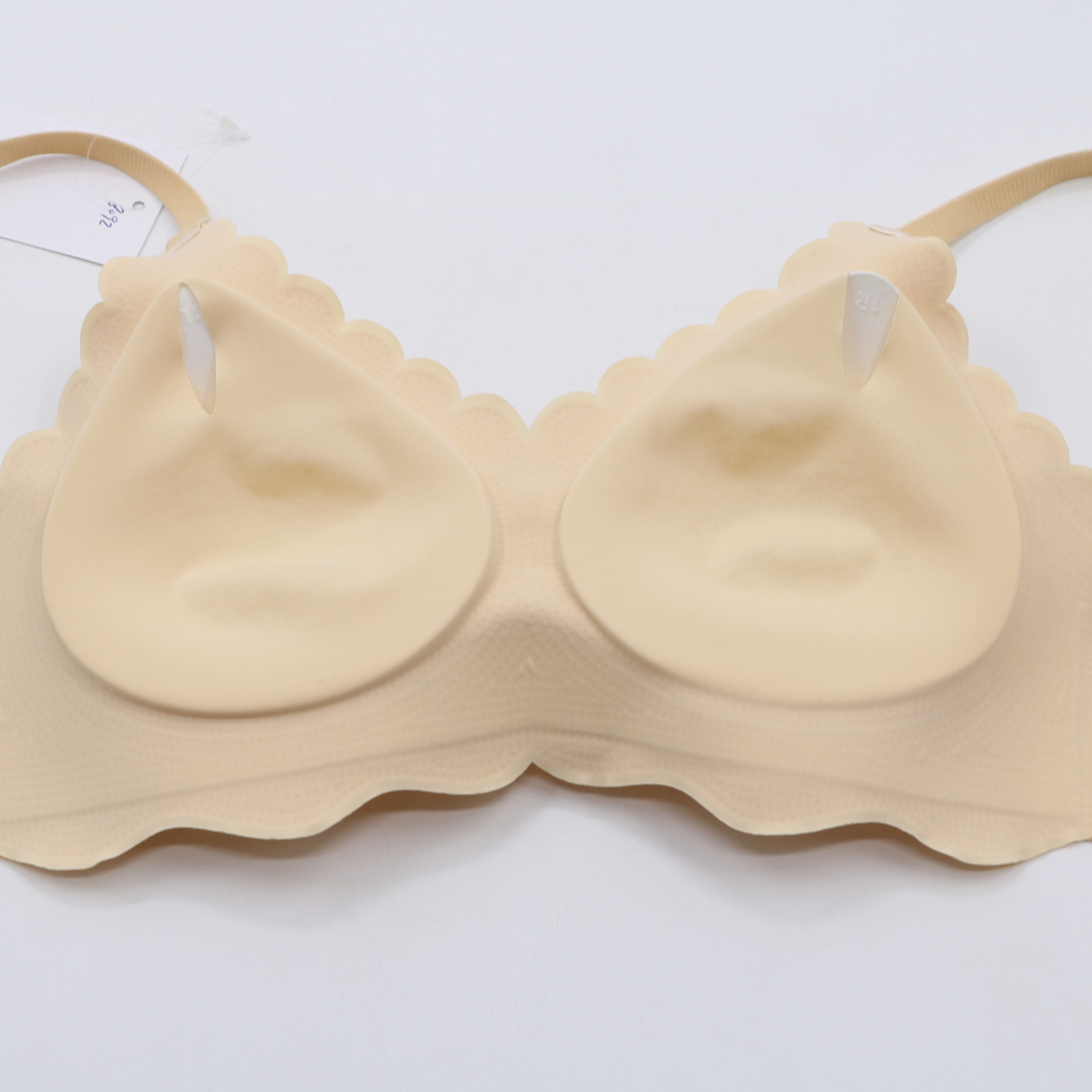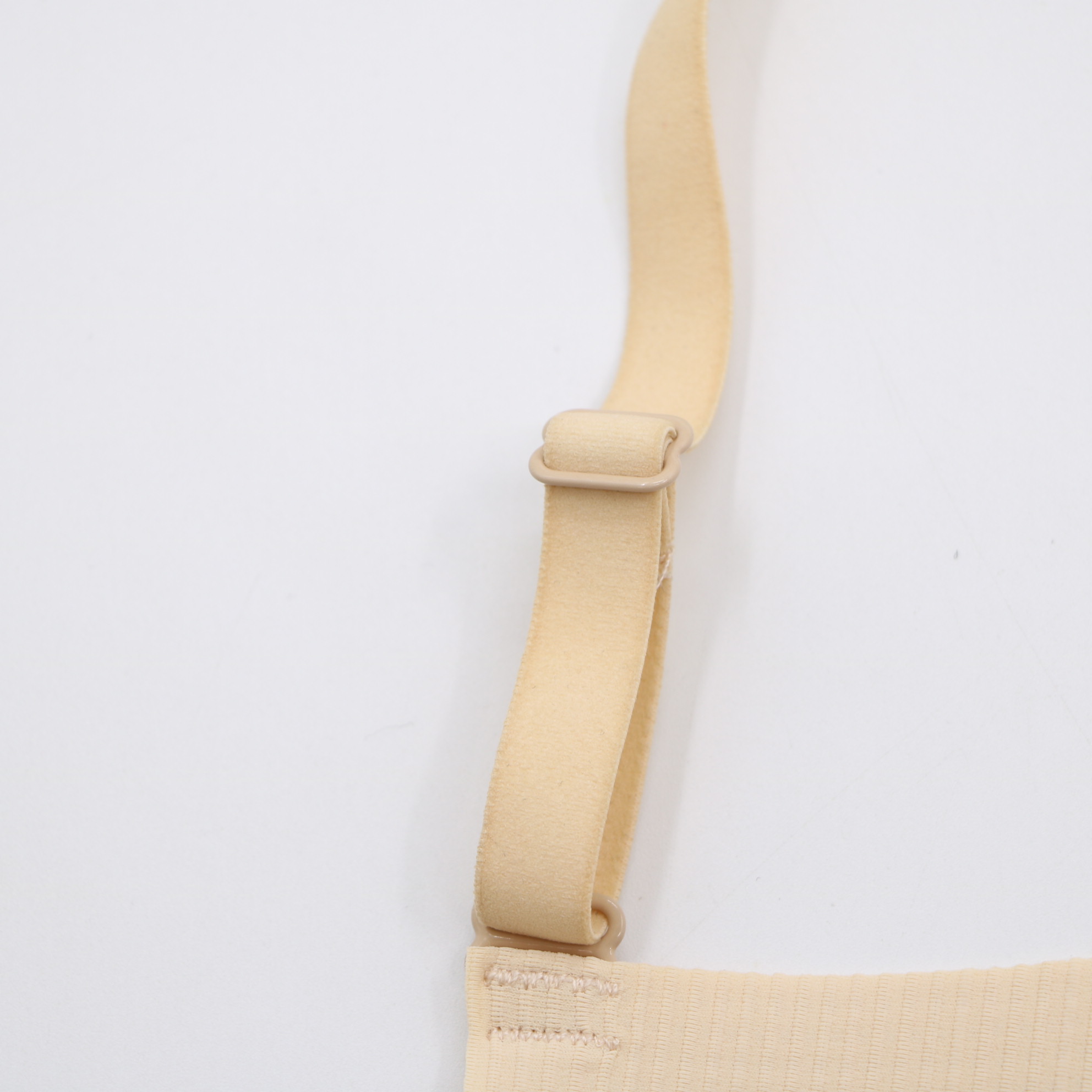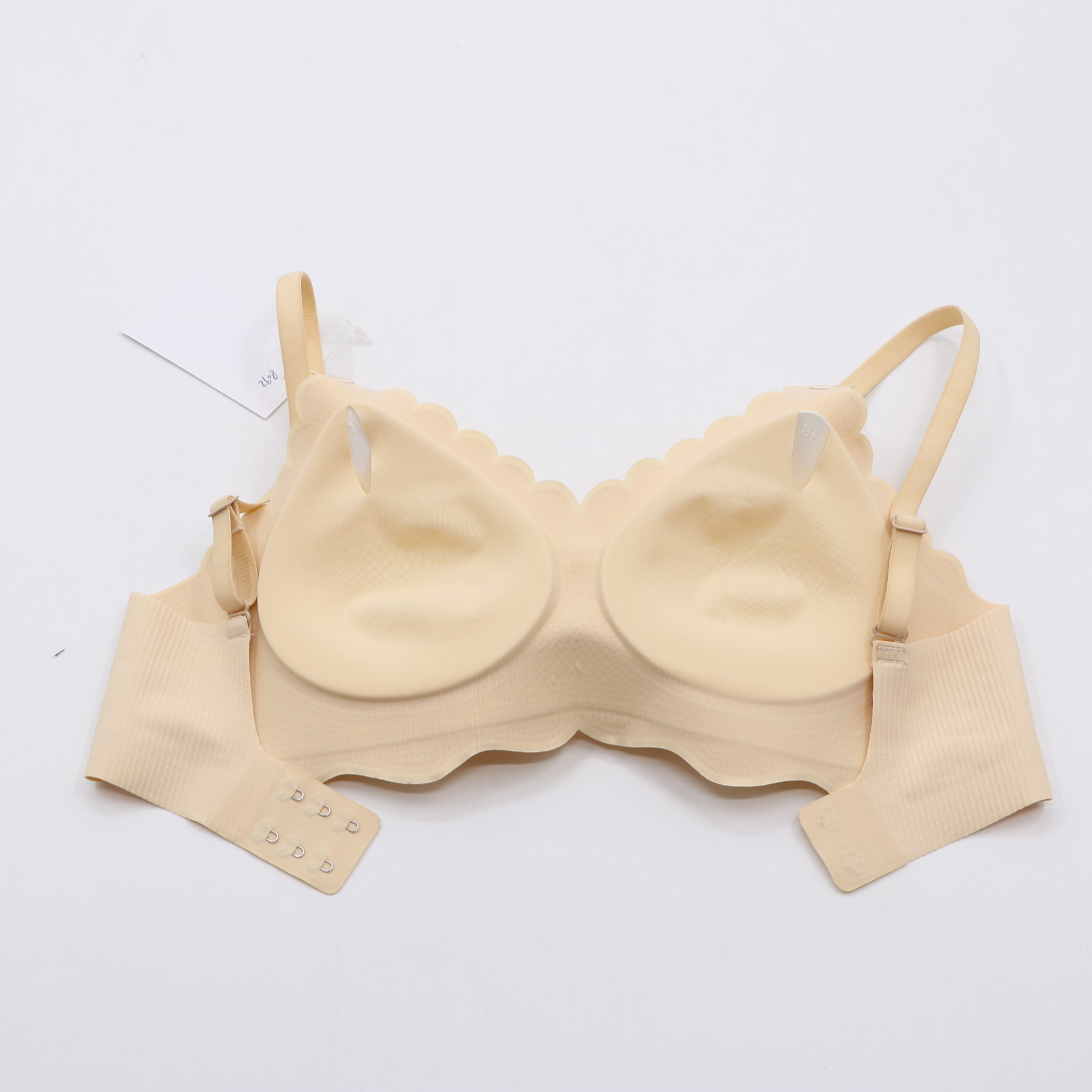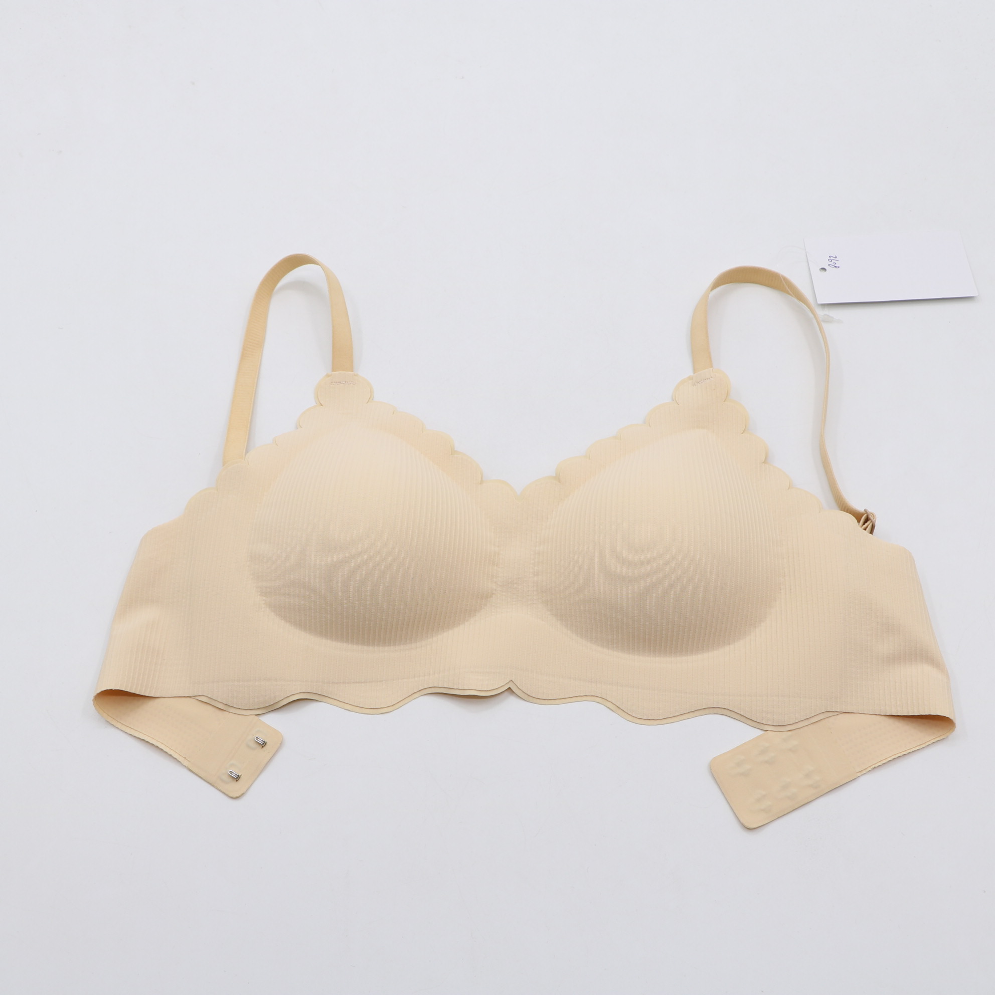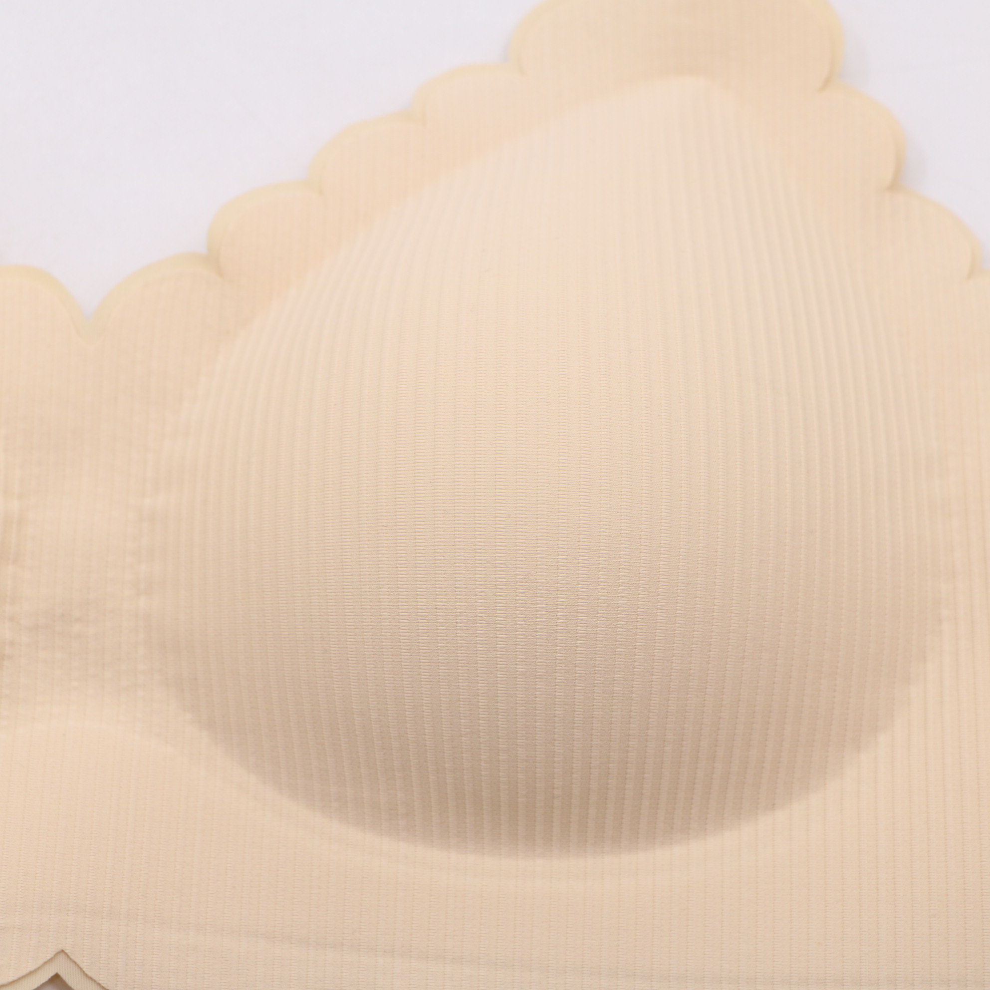 This delicate beige bra features a ribbed texture and scalloped edge design for a feminine, romantic look. The wireless molded cups offer gentle support and a natural shape, while adjustable straps and a 2-row hook-and-eye closure ensure a secure, personalized fit—perfect for all-day comfort under any outfit.