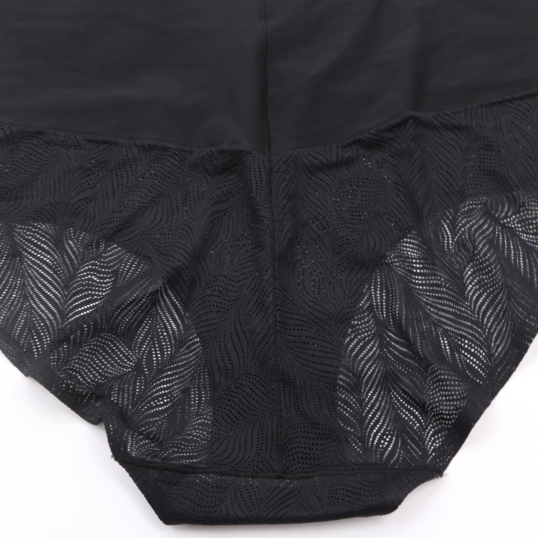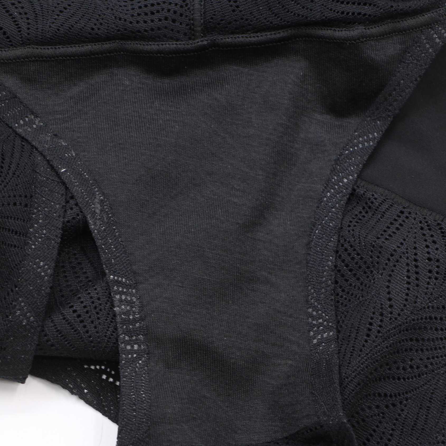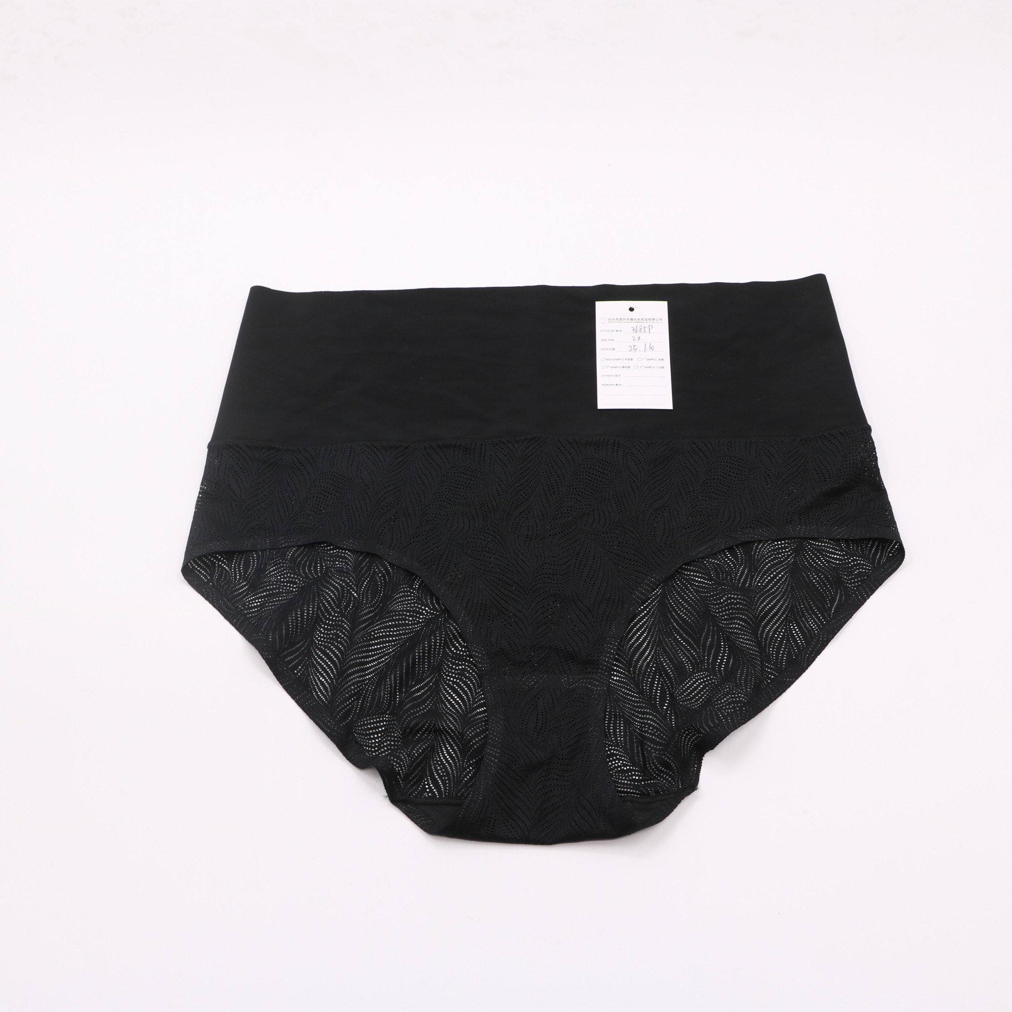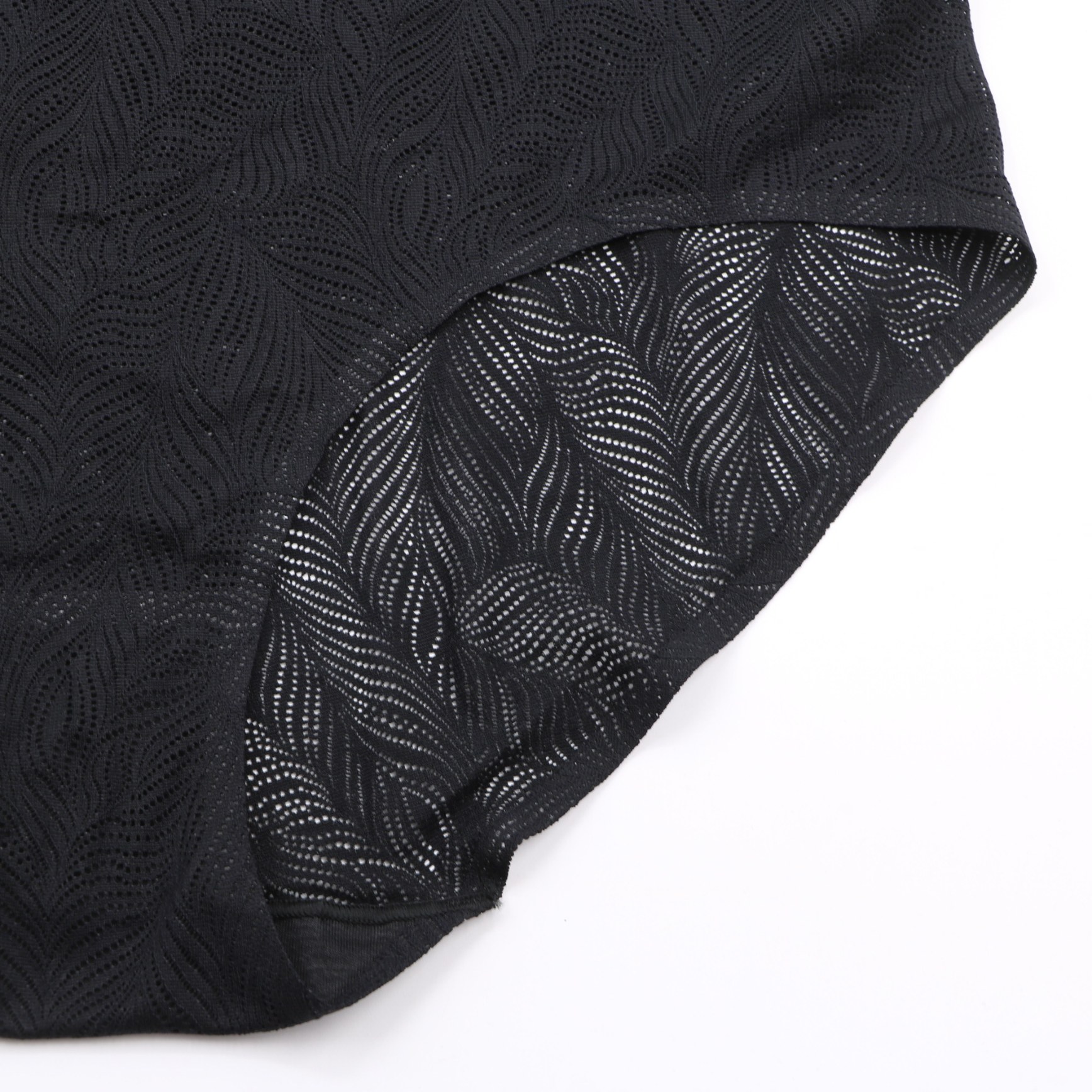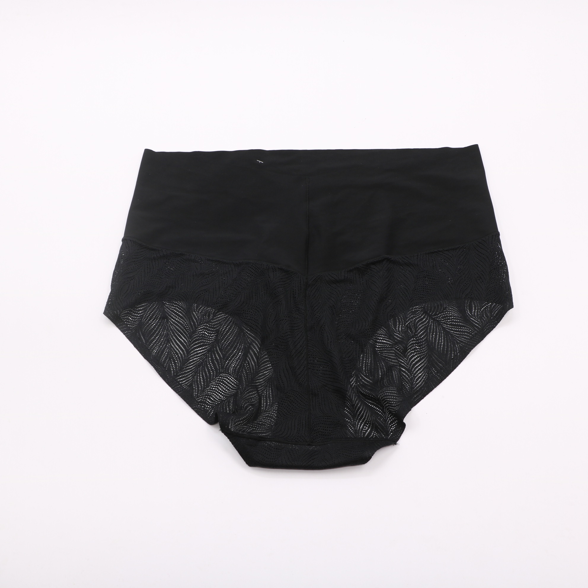 Elegant leaf-patterned lace high-waist panty with gentle tummy control, breathable mesh, and cotton crotch lining for all-day comfort.