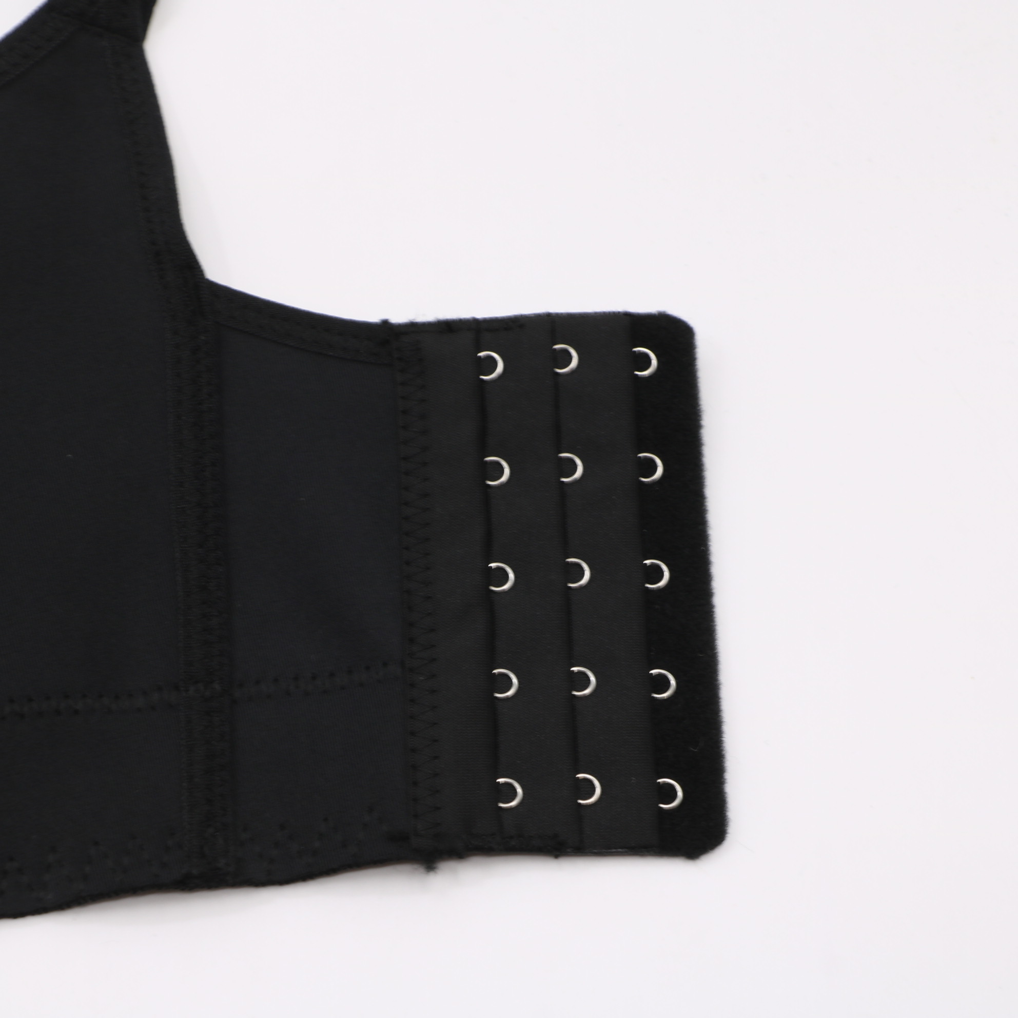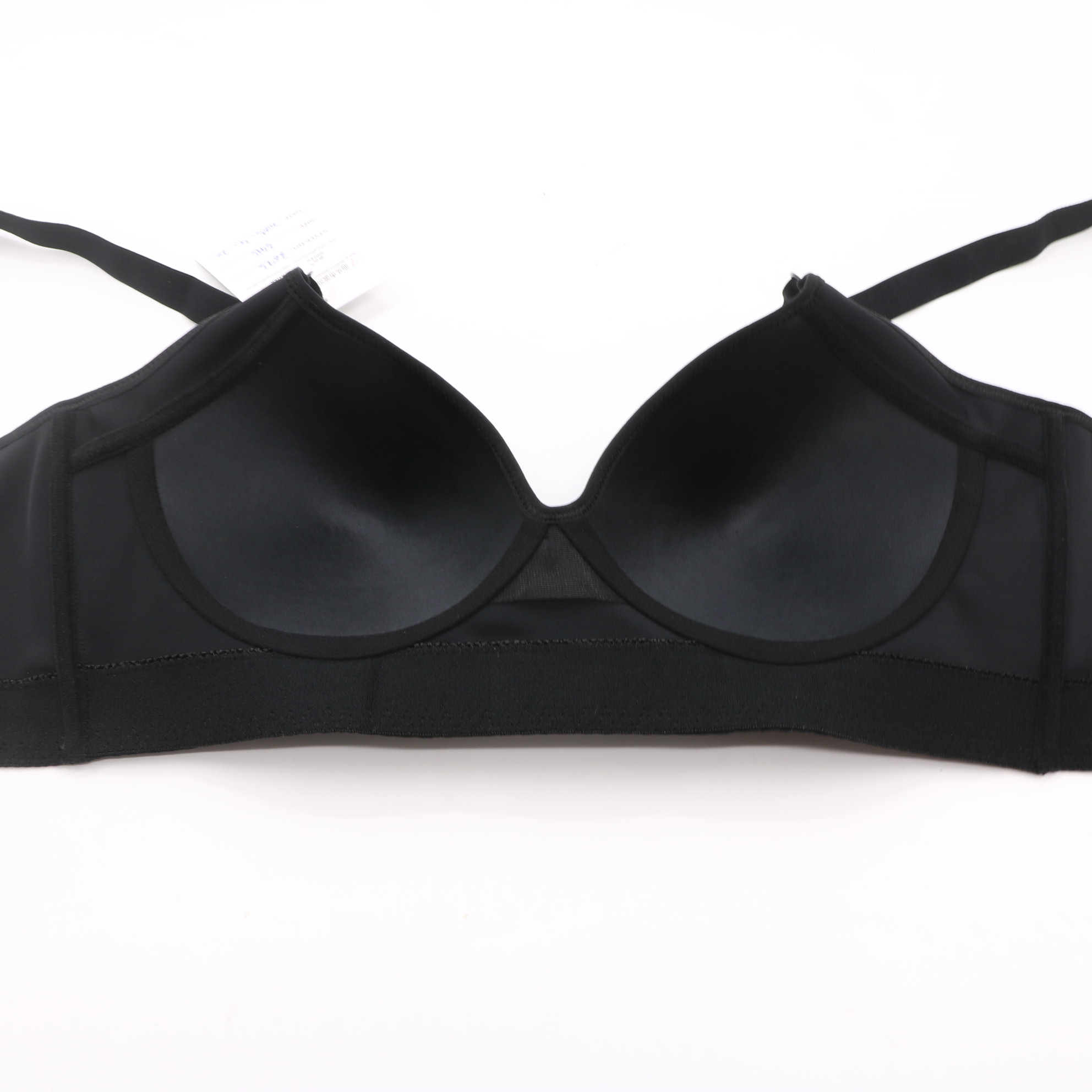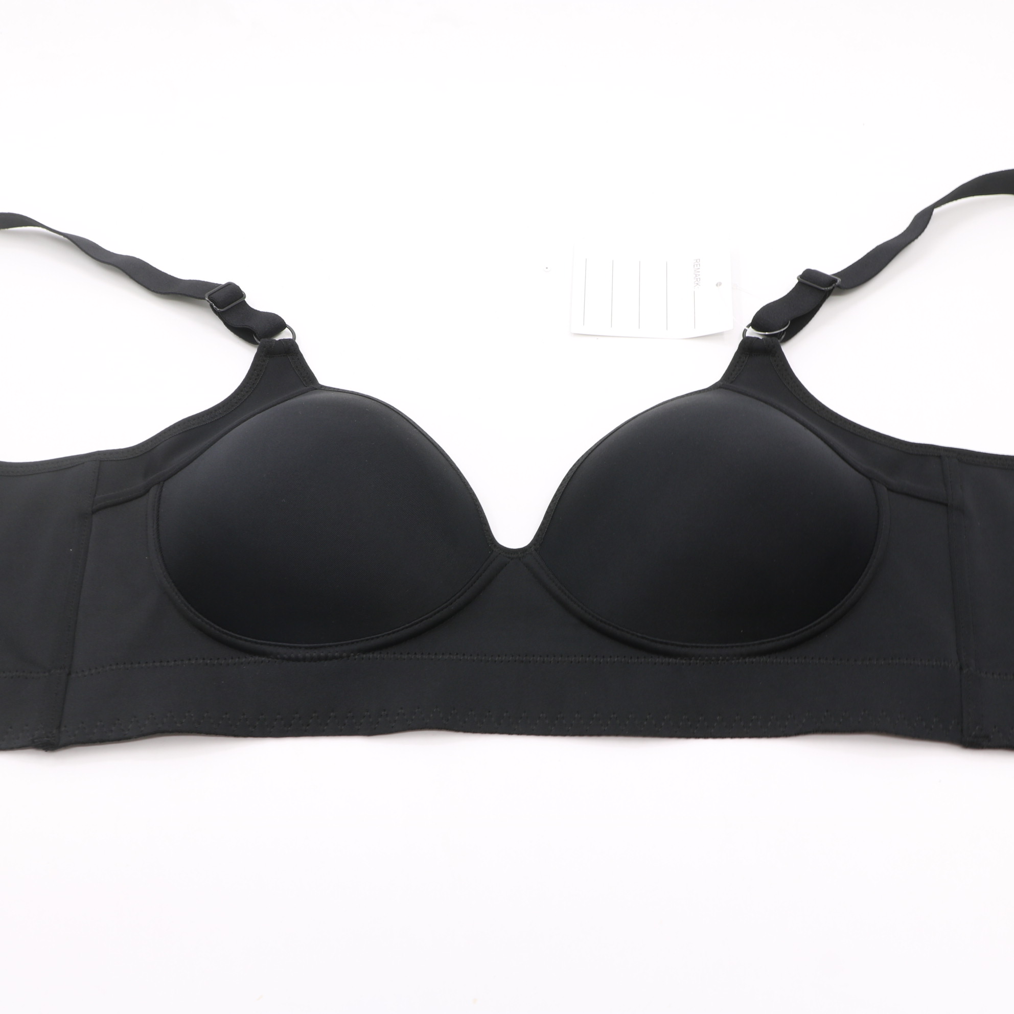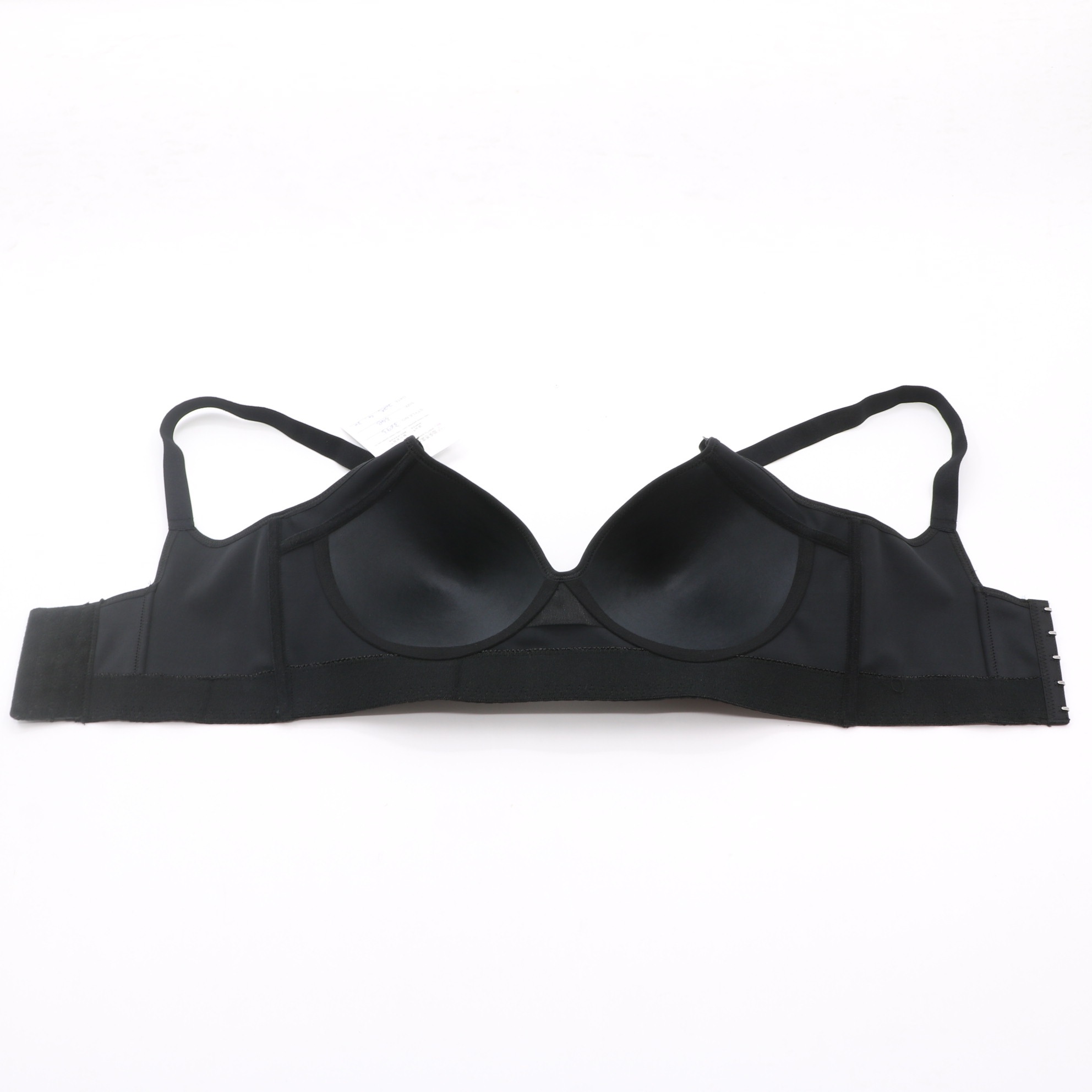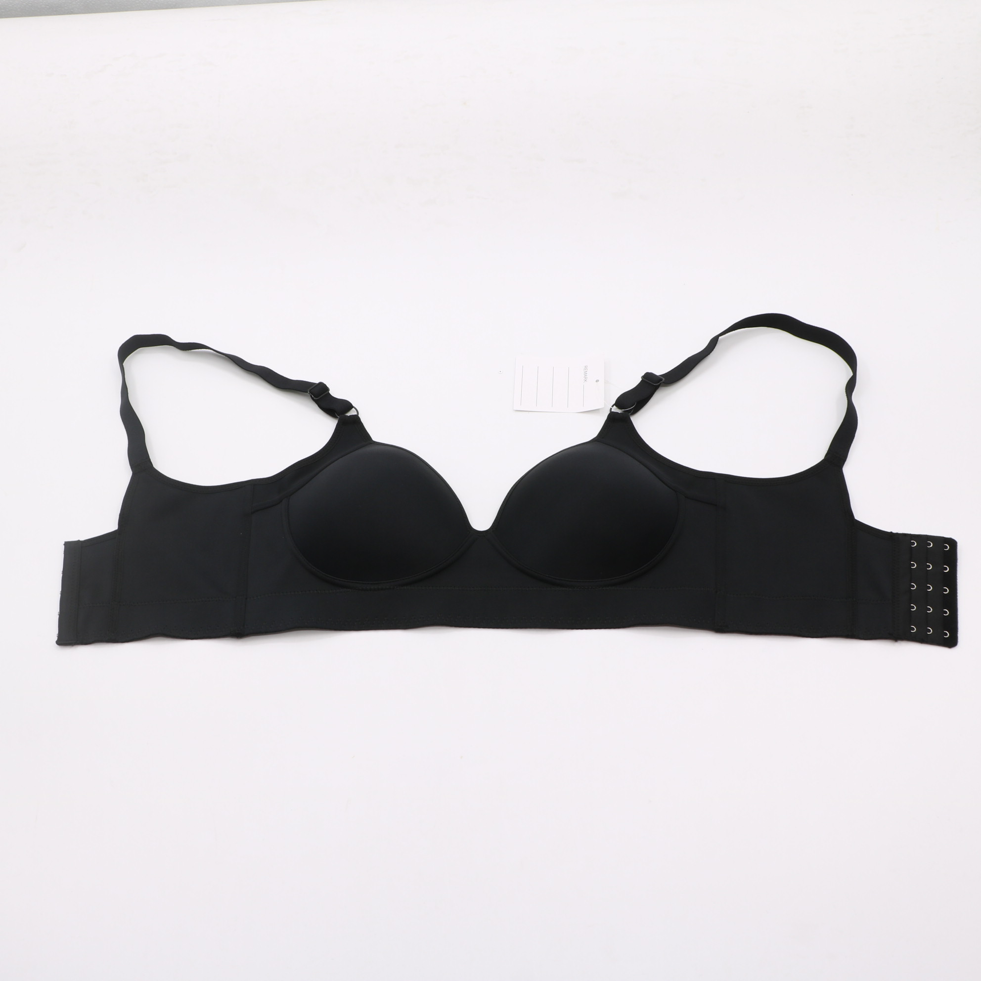 This black seamless bra features molded cups for a smooth shape, adjustable straps, and a multi-row hook-and-eye closure for a secure fit. The wide side band provides extra support, making it ideal for everyday comfort.