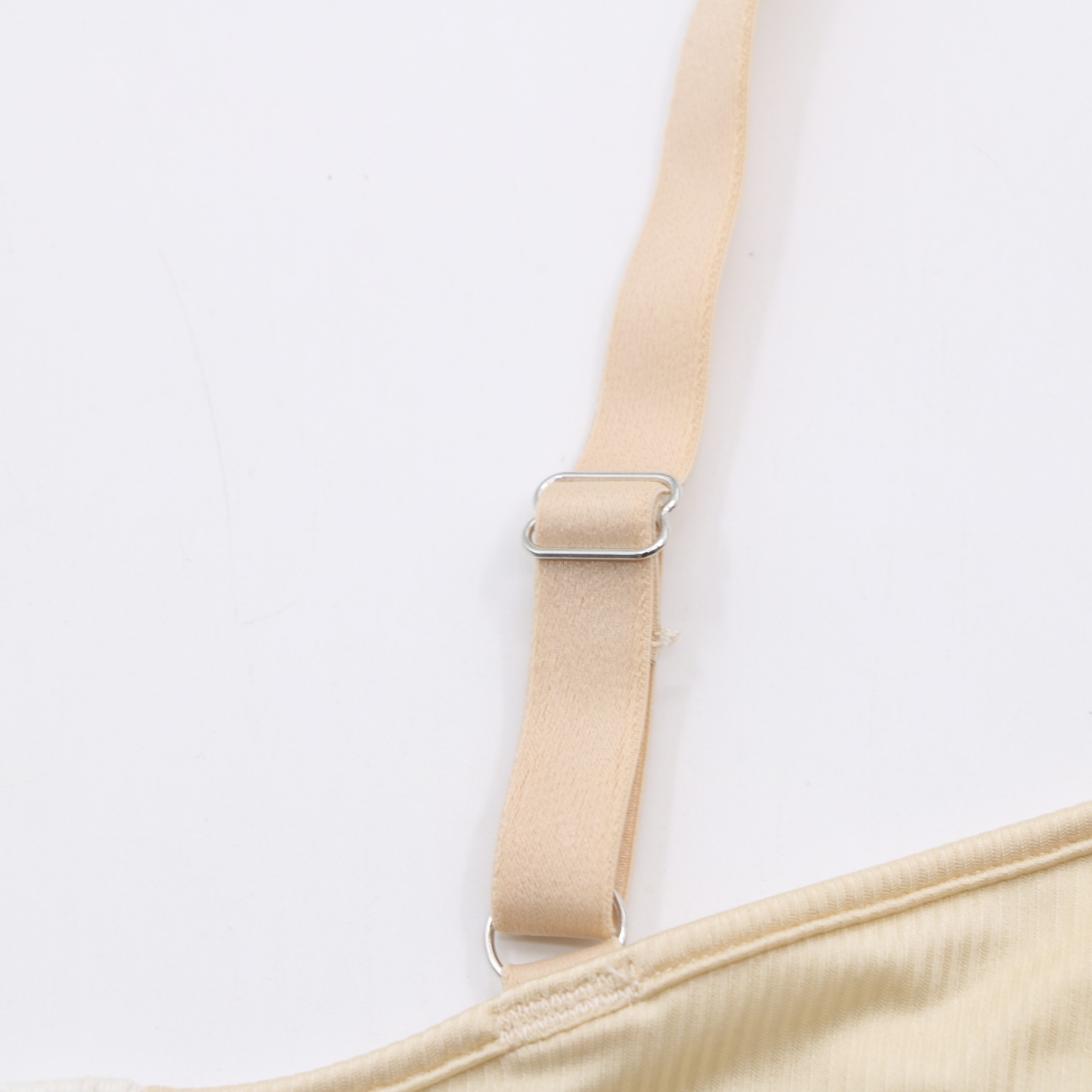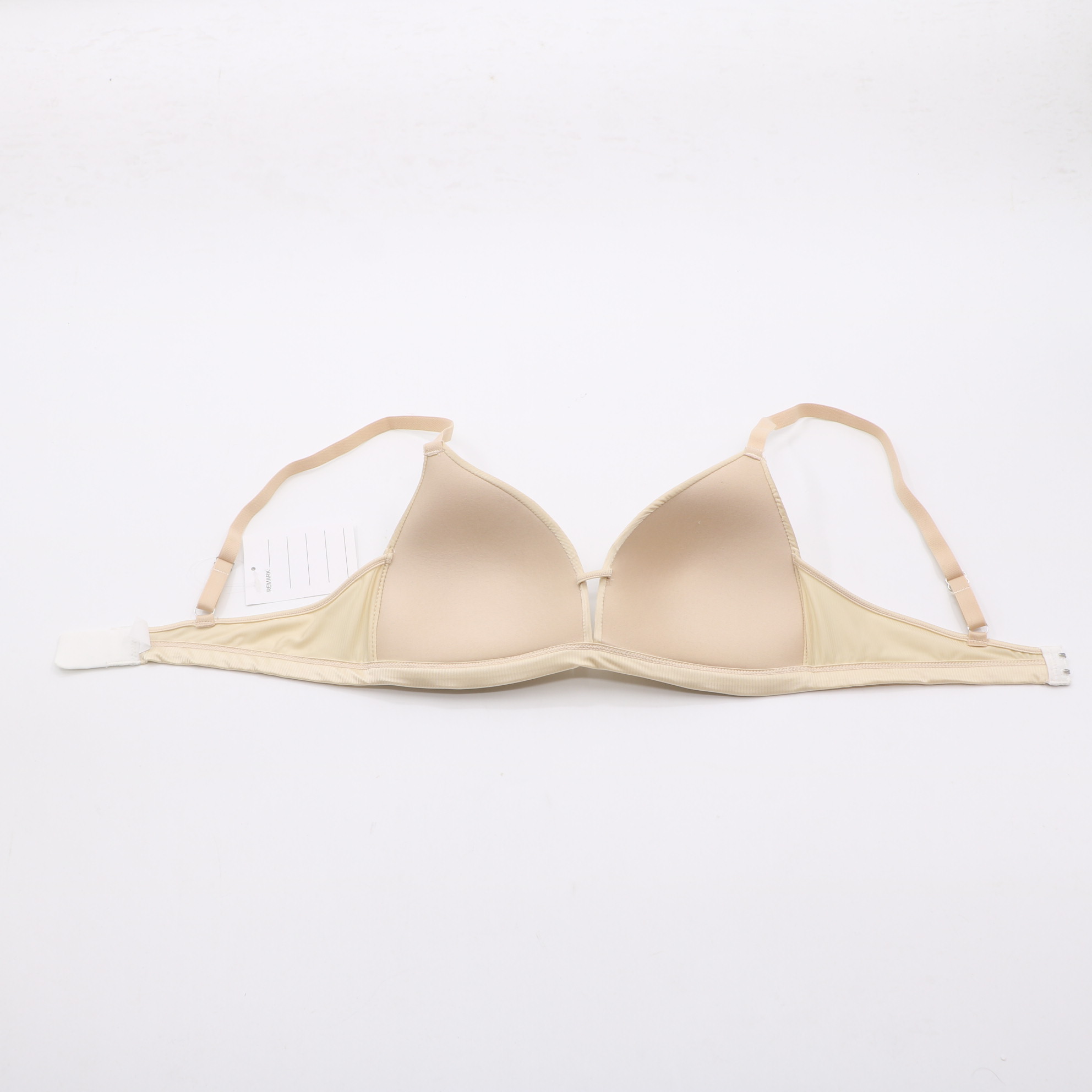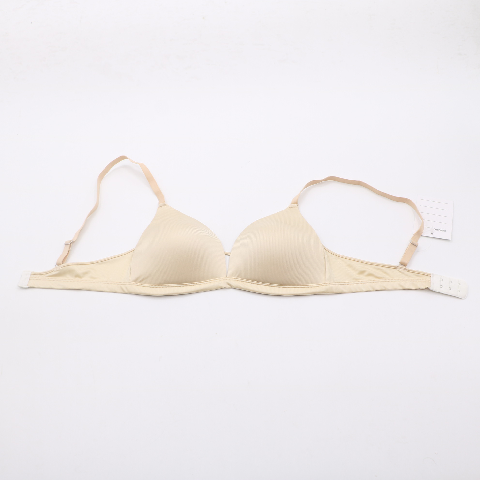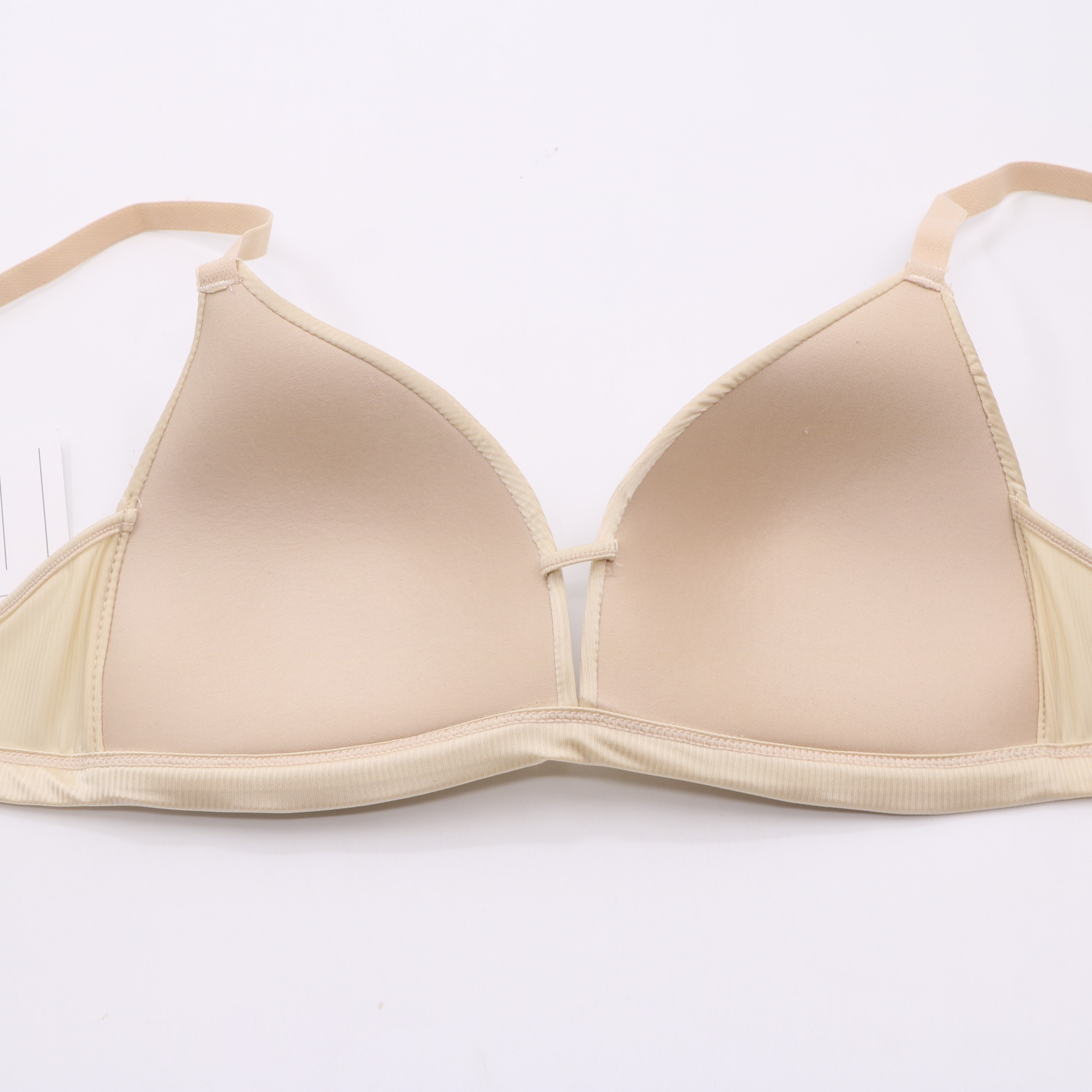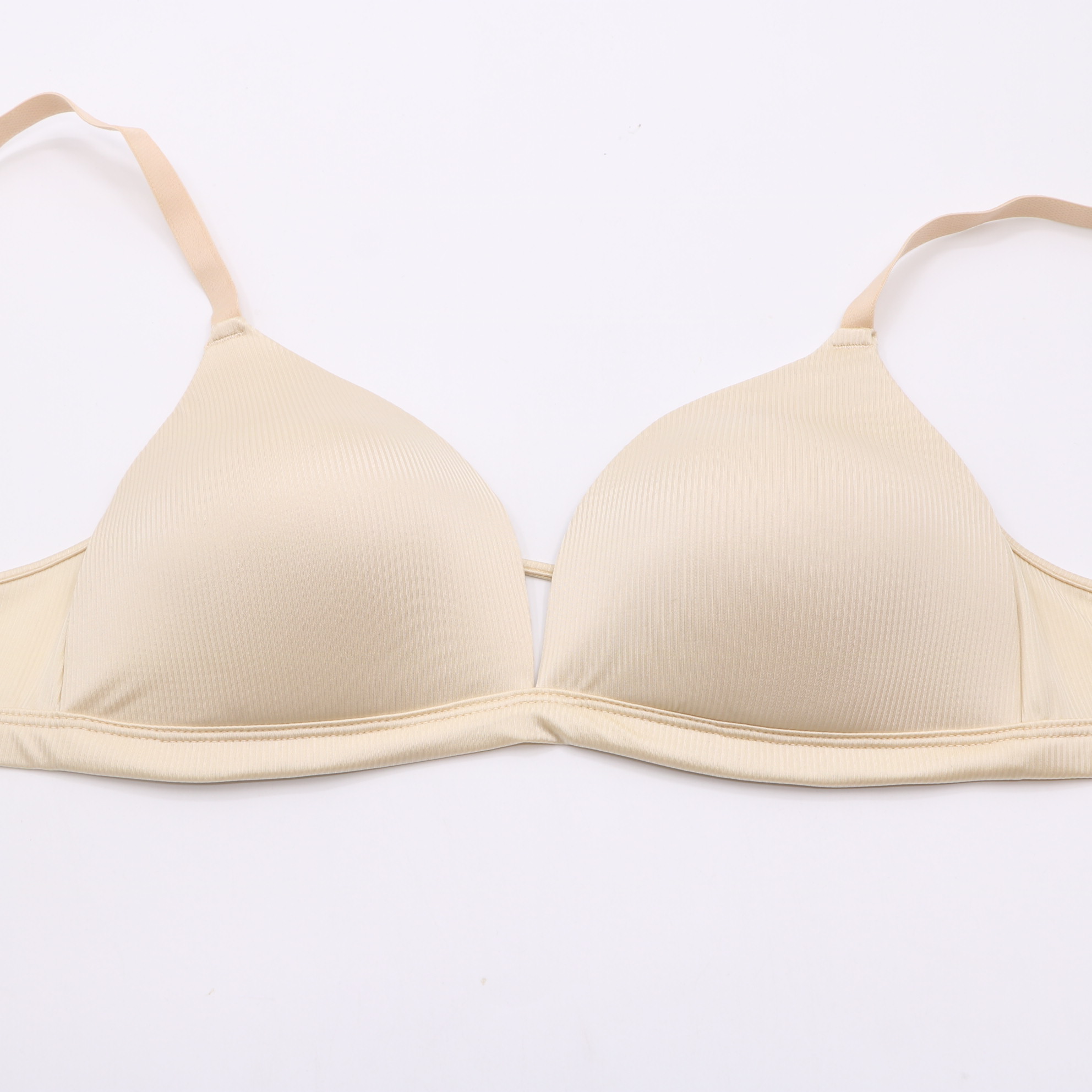 This seamless beige triangle bra features molded cups for gentle support and a smooth, invisible fit under clothing. The adjustable straps and 2-row hook-and-eye closure ensure a personalized, all-day comfortable wear.