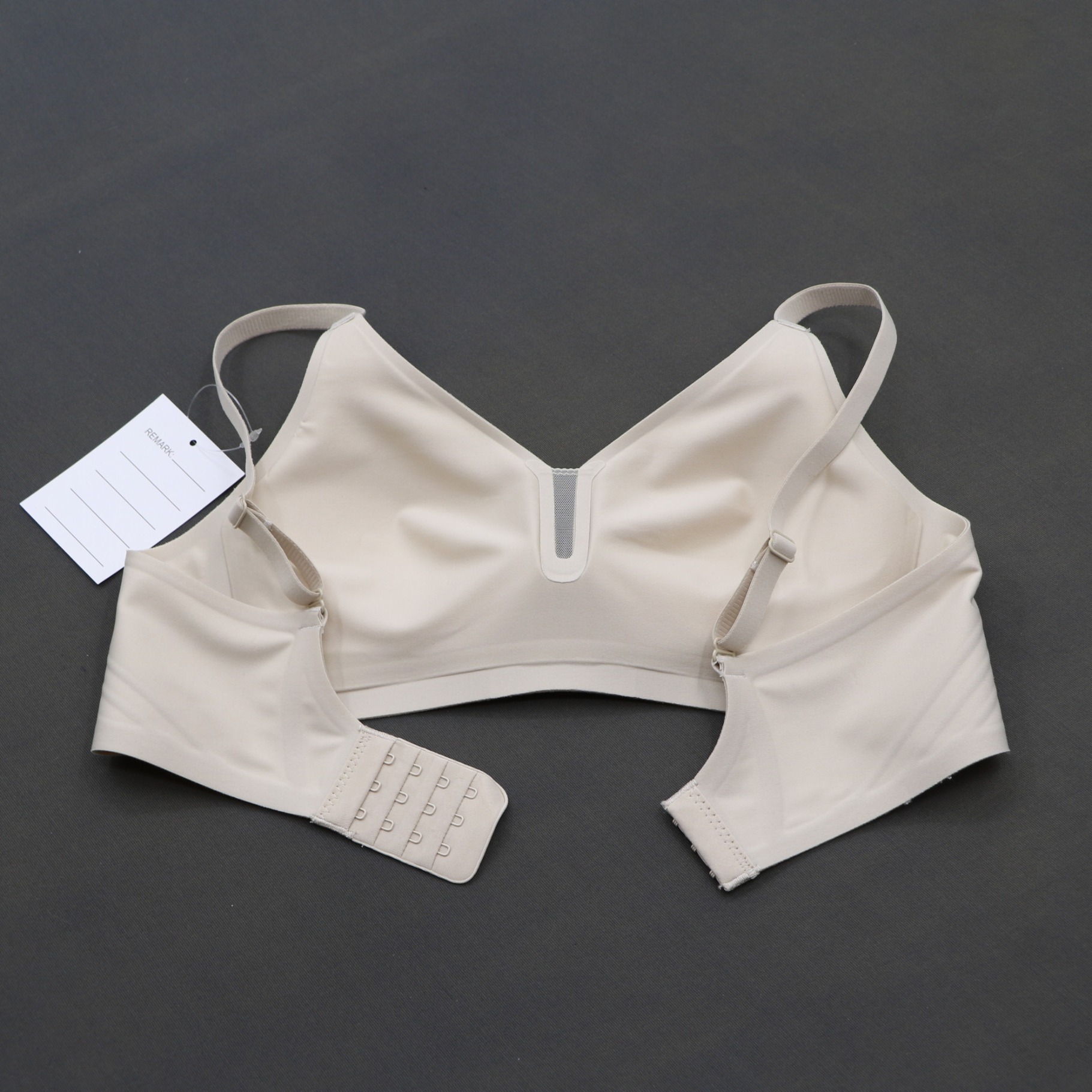 This seamless beige bra features molded cups for gentle support and a smooth, invisible fit under clothing. The V-shaped mesh detail at the center adds breathability, while adjustable straps and a 3-row hook-and-eye closure ensure a personalized, all-day comfortable wear.
