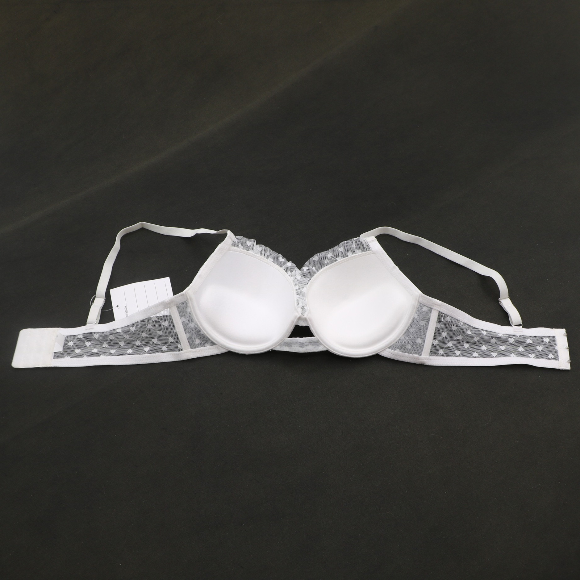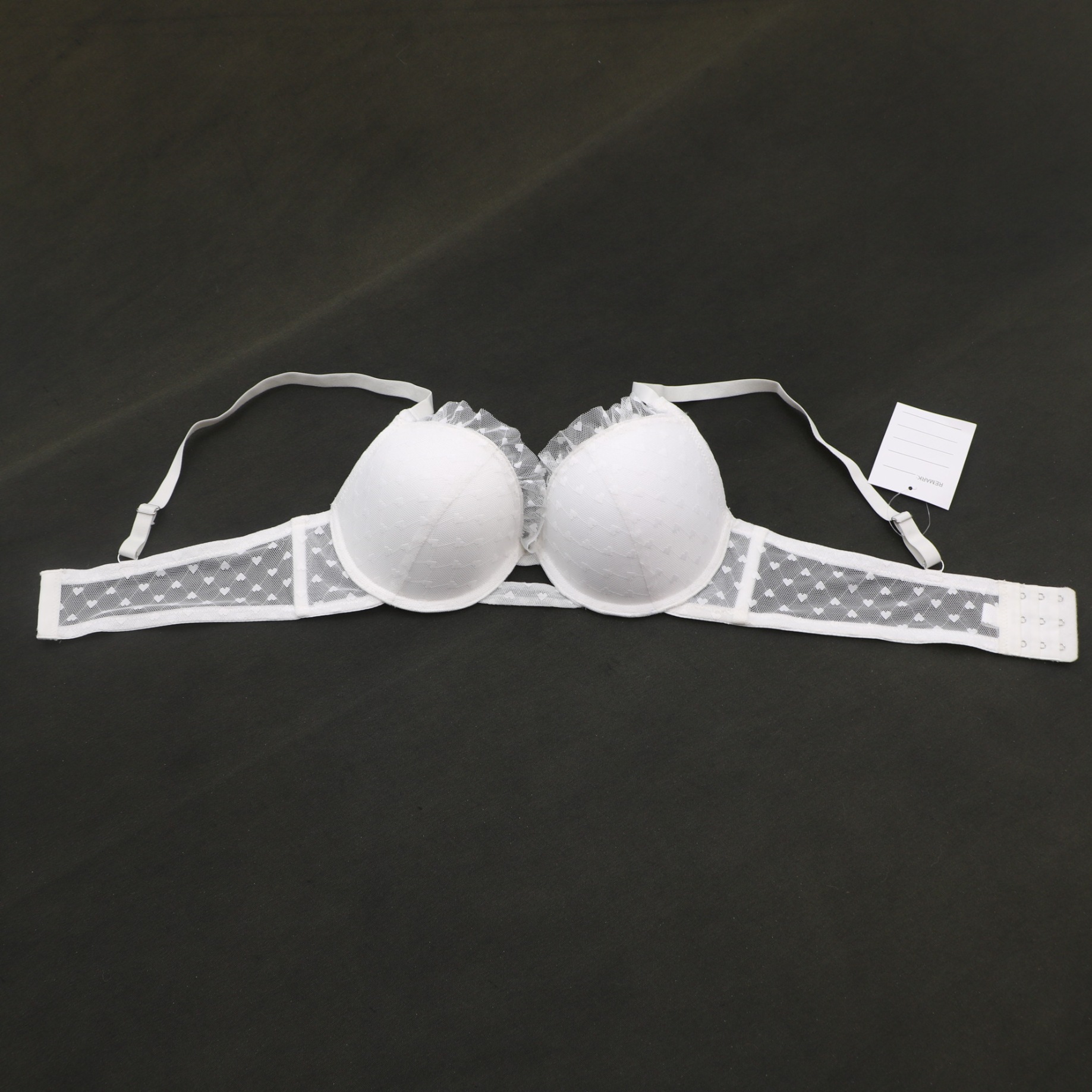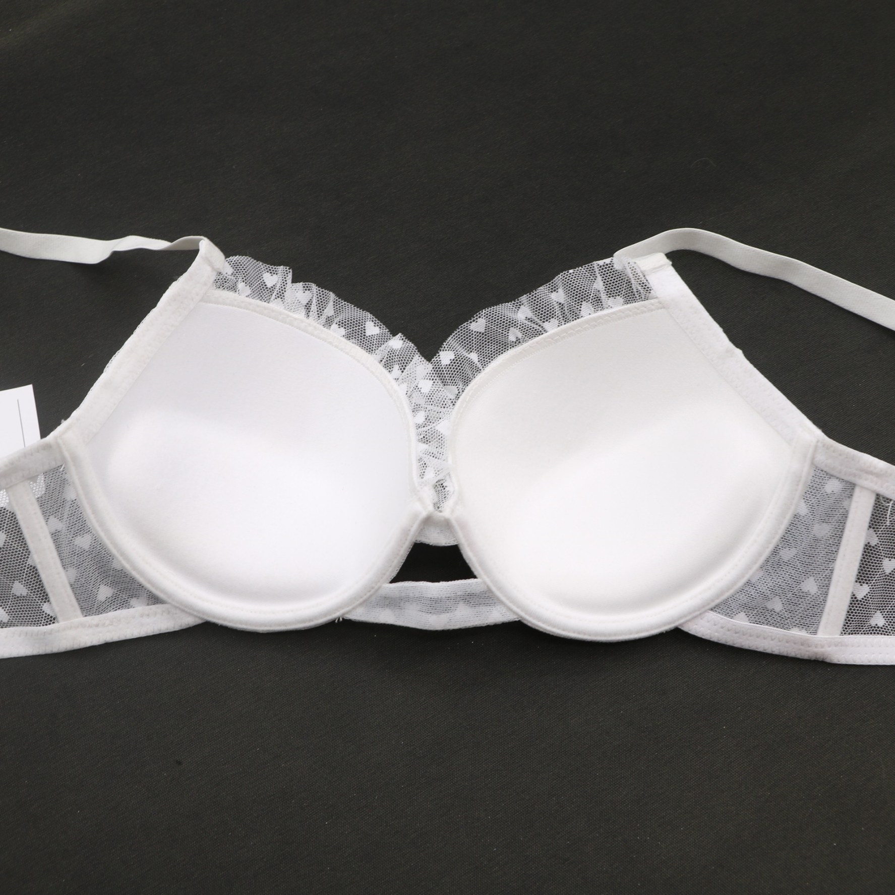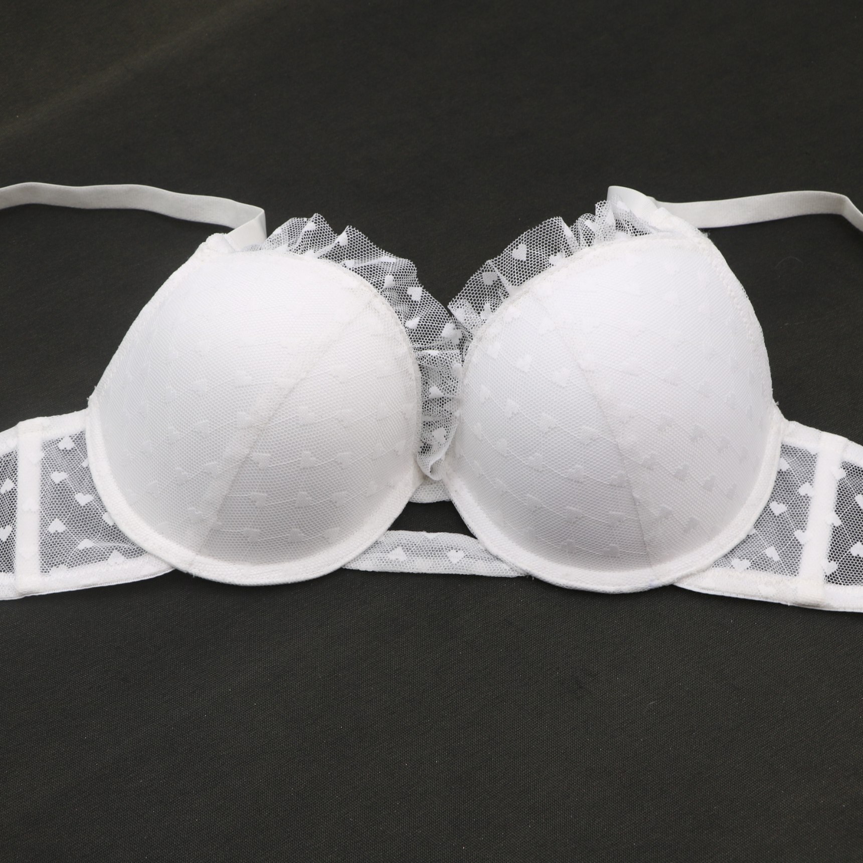 Sheer heart mesh panels, ruffled lace edges, and underwire support for a sweet, flattering silhouette