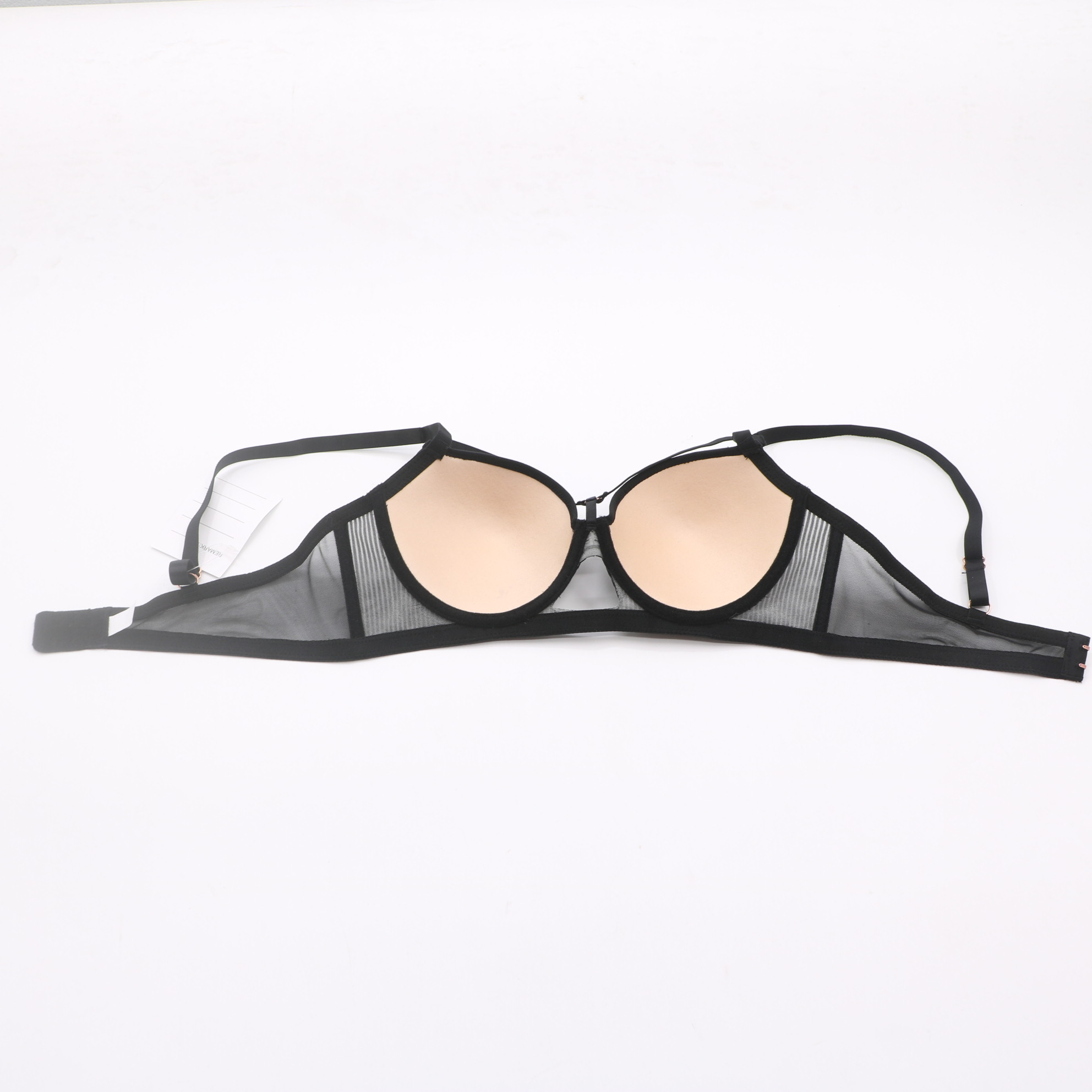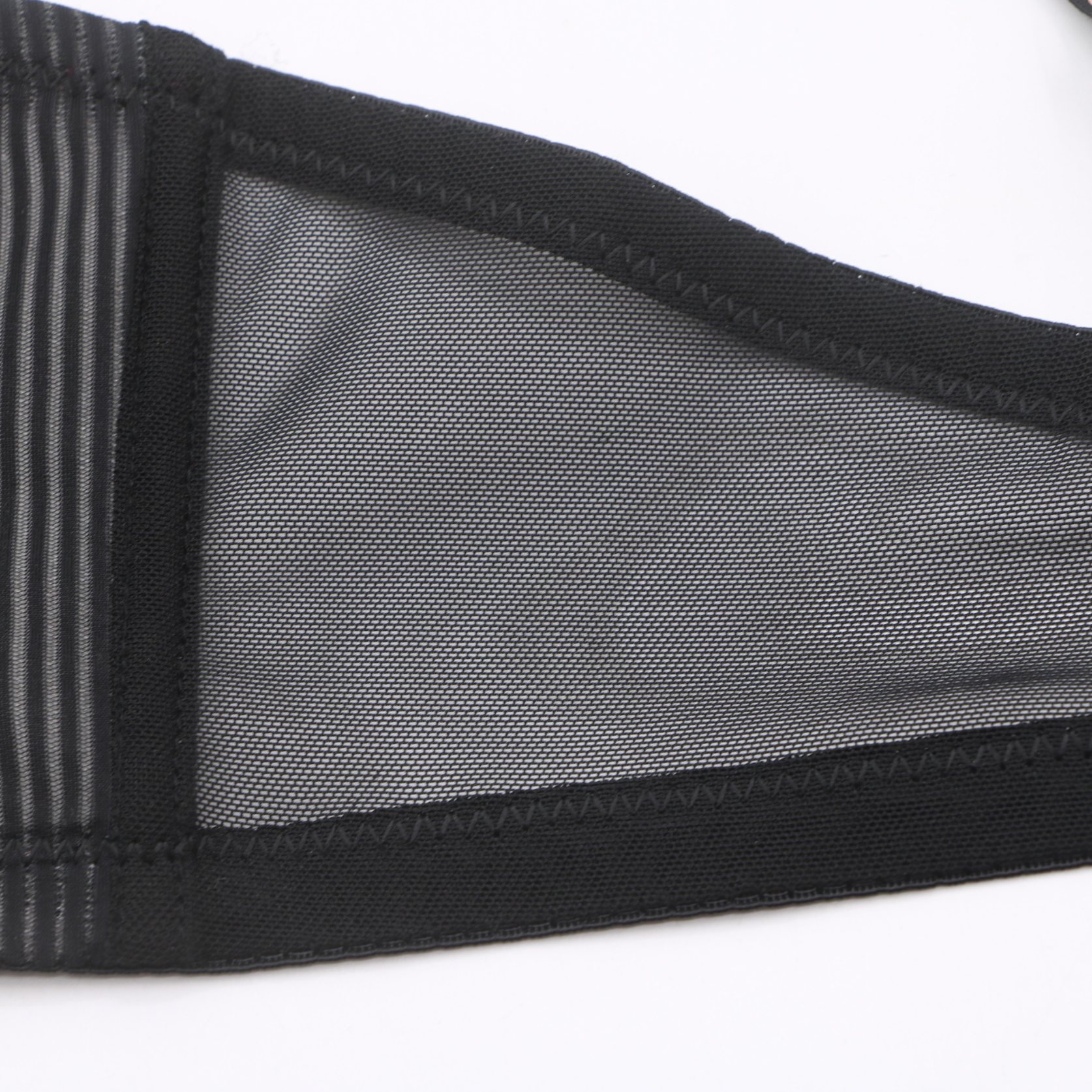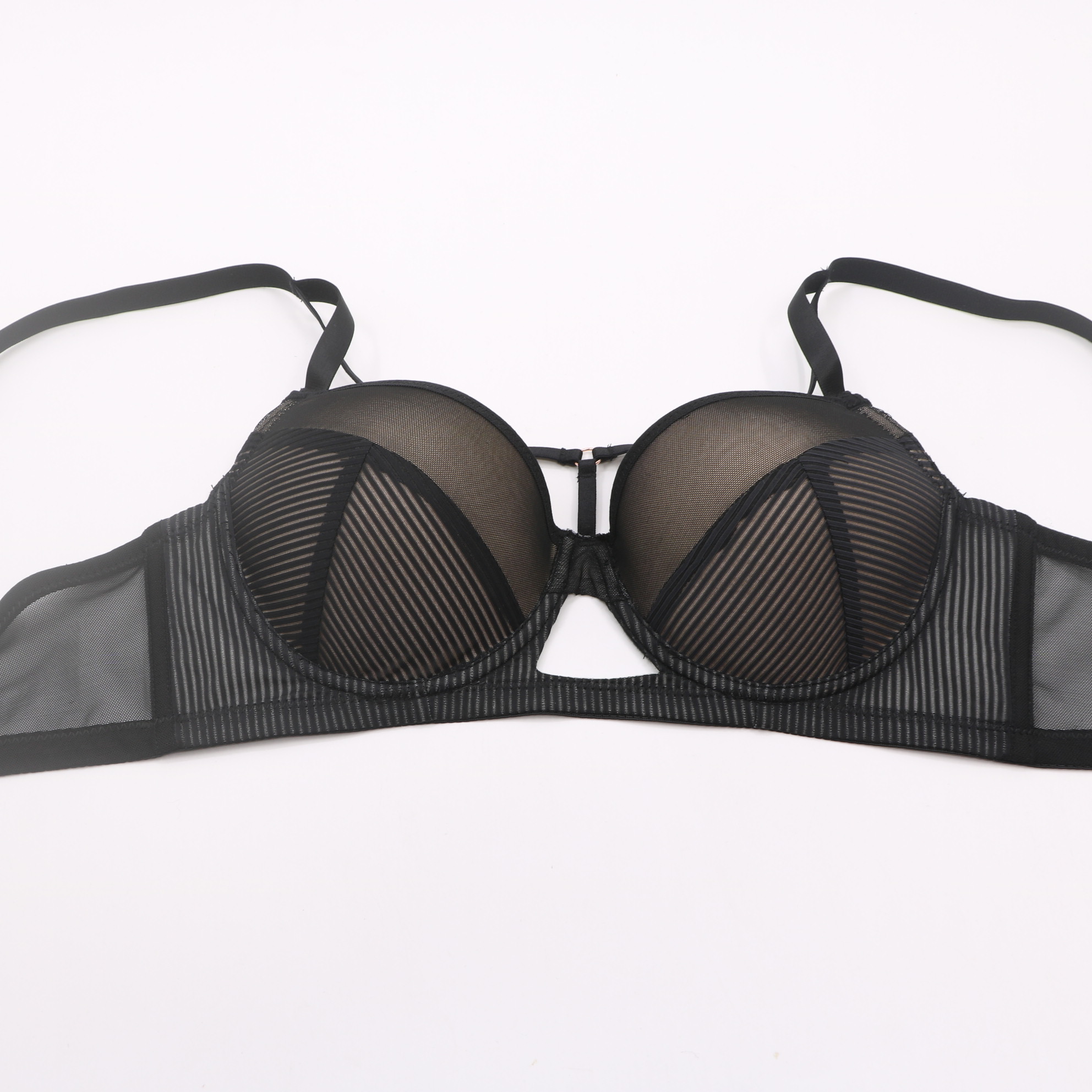 This striking black bra combines sheer mesh with bold striped detailing, accented by rose gold hardware for a modern, edgy look. The molded cups provide gentle lift and support, while the adjustable straps and multi-position back closure ensure a secure, personalized fit.