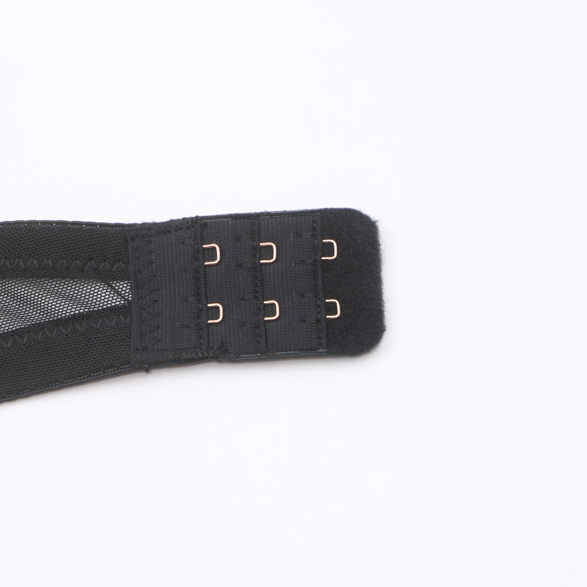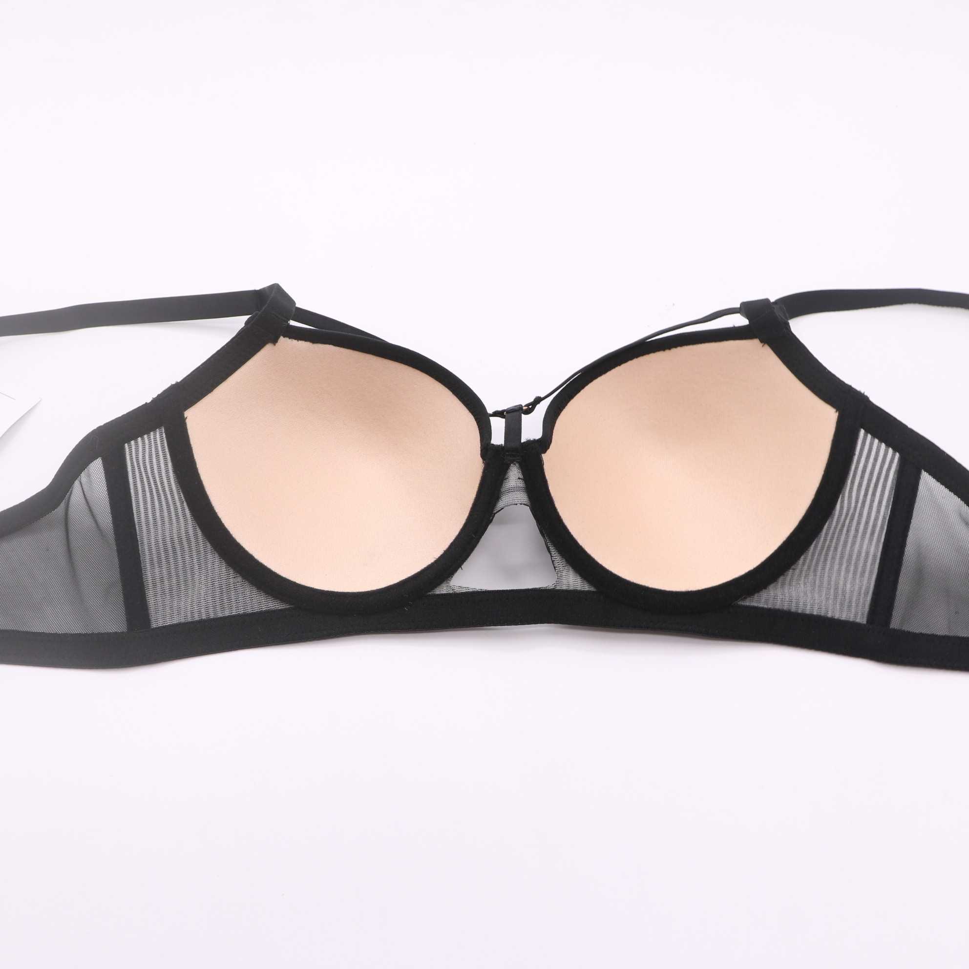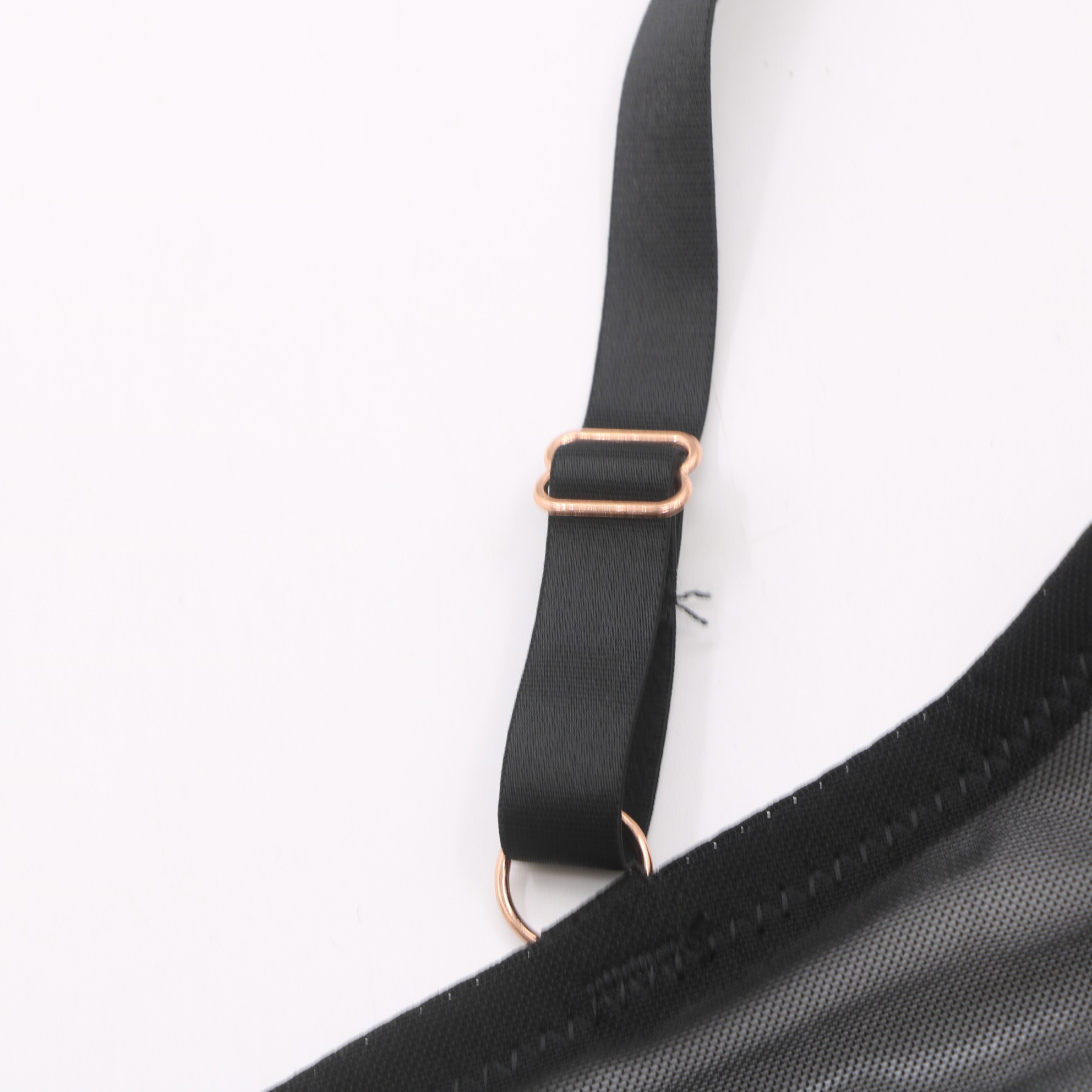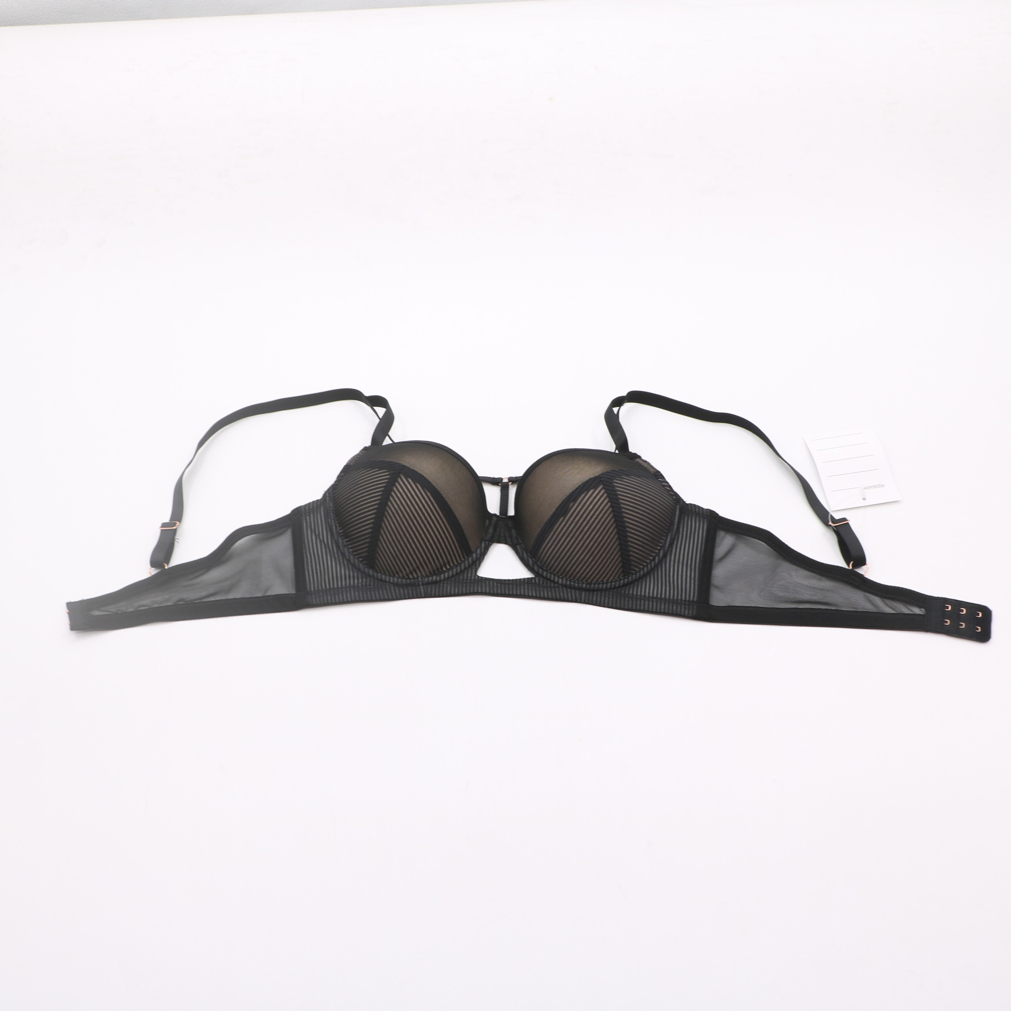 This striking black bra combines sheer mesh with bold striped detailing, accented by rose gold hardware for a modern, edgy look. The molded cups provide gentle lift and support, while the adjustable straps and multi-position back closure ensure a secure, personalized fit.