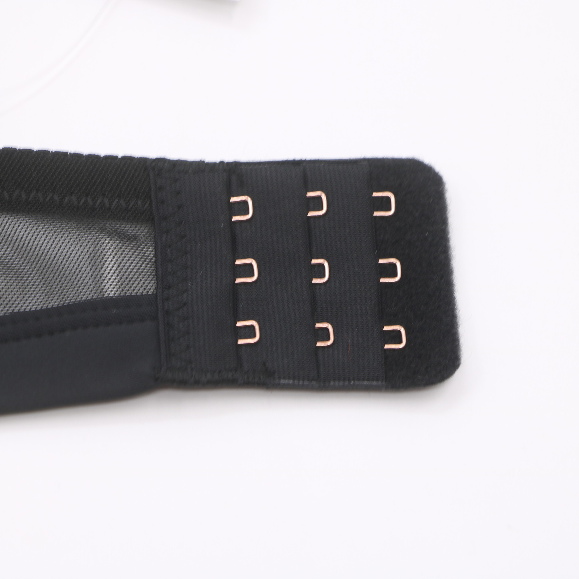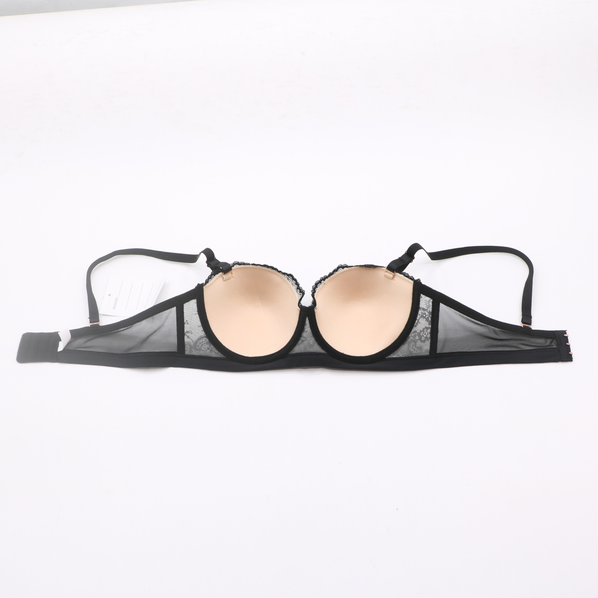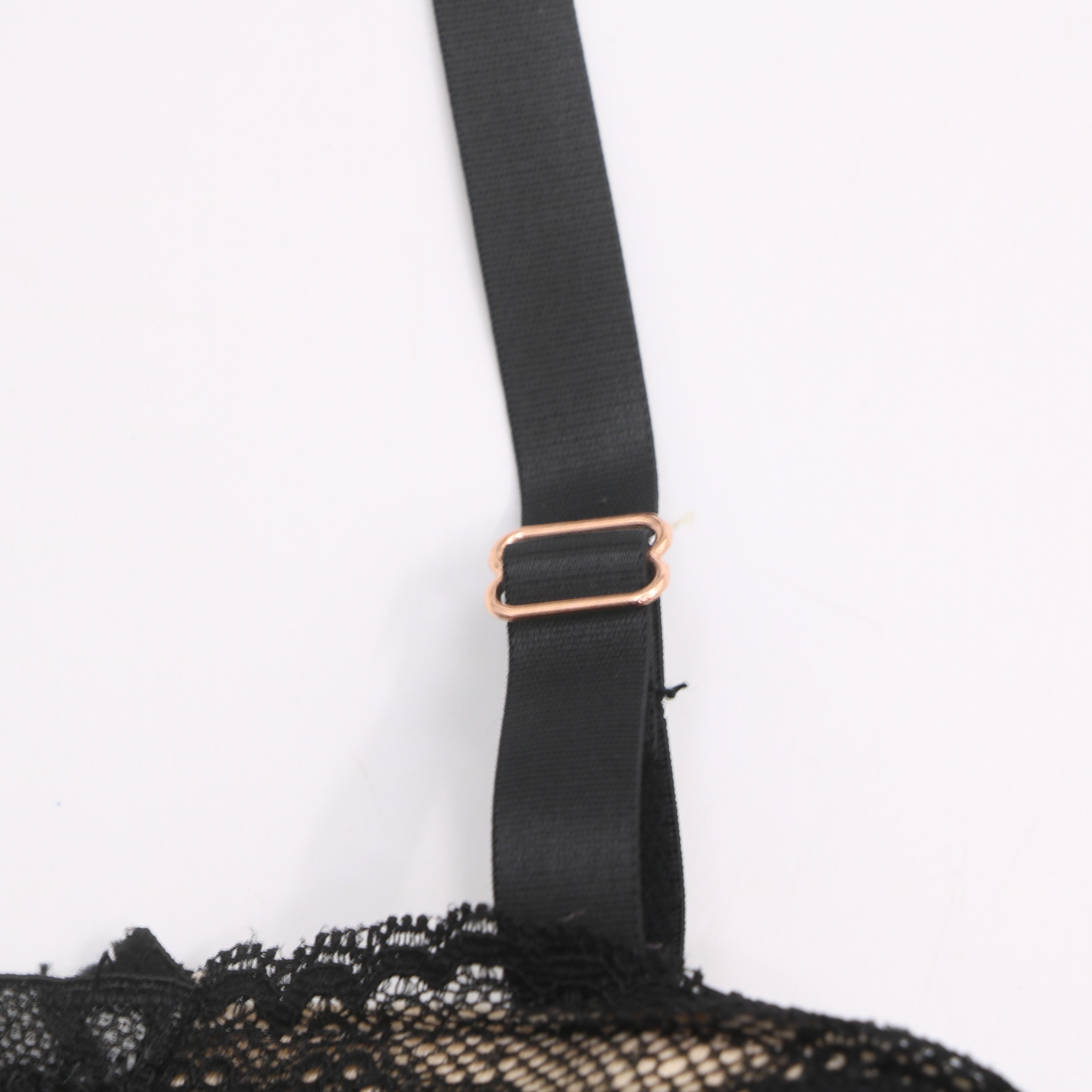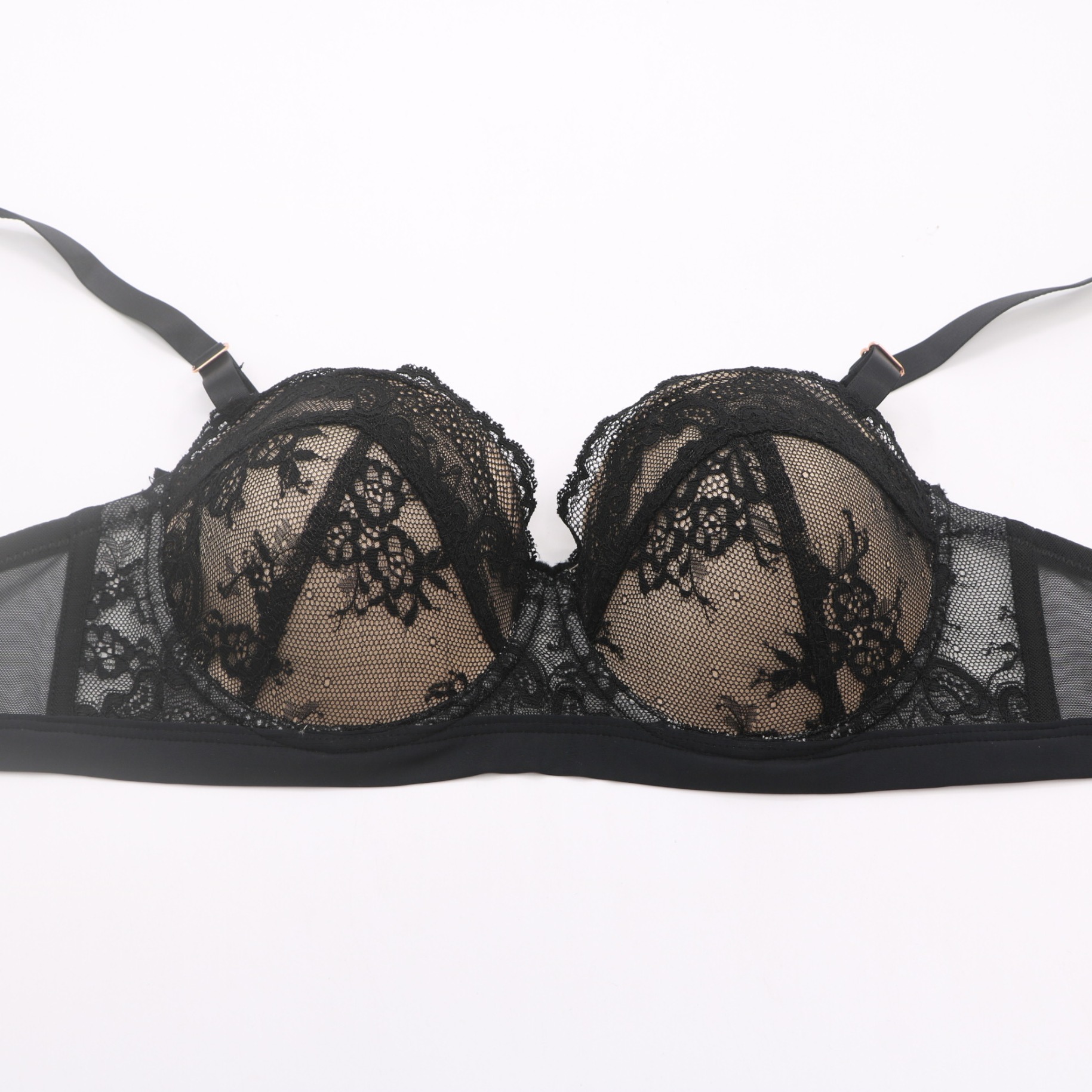 This elegant black bra features delicate floral lace over sheer mesh, accented by rose gold hardware for a luxurious touch. The molded cups provide gentle lift and support, while the adjustable straps and multi-position back closure ensure a secure, personalized fit.