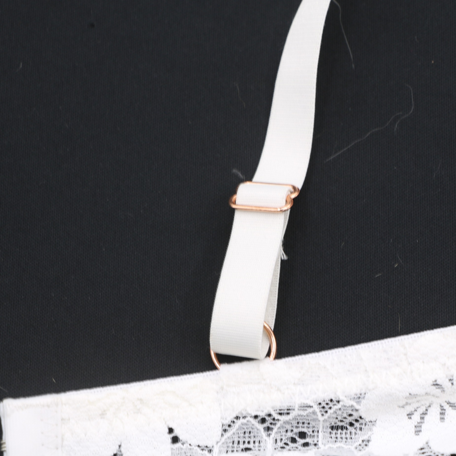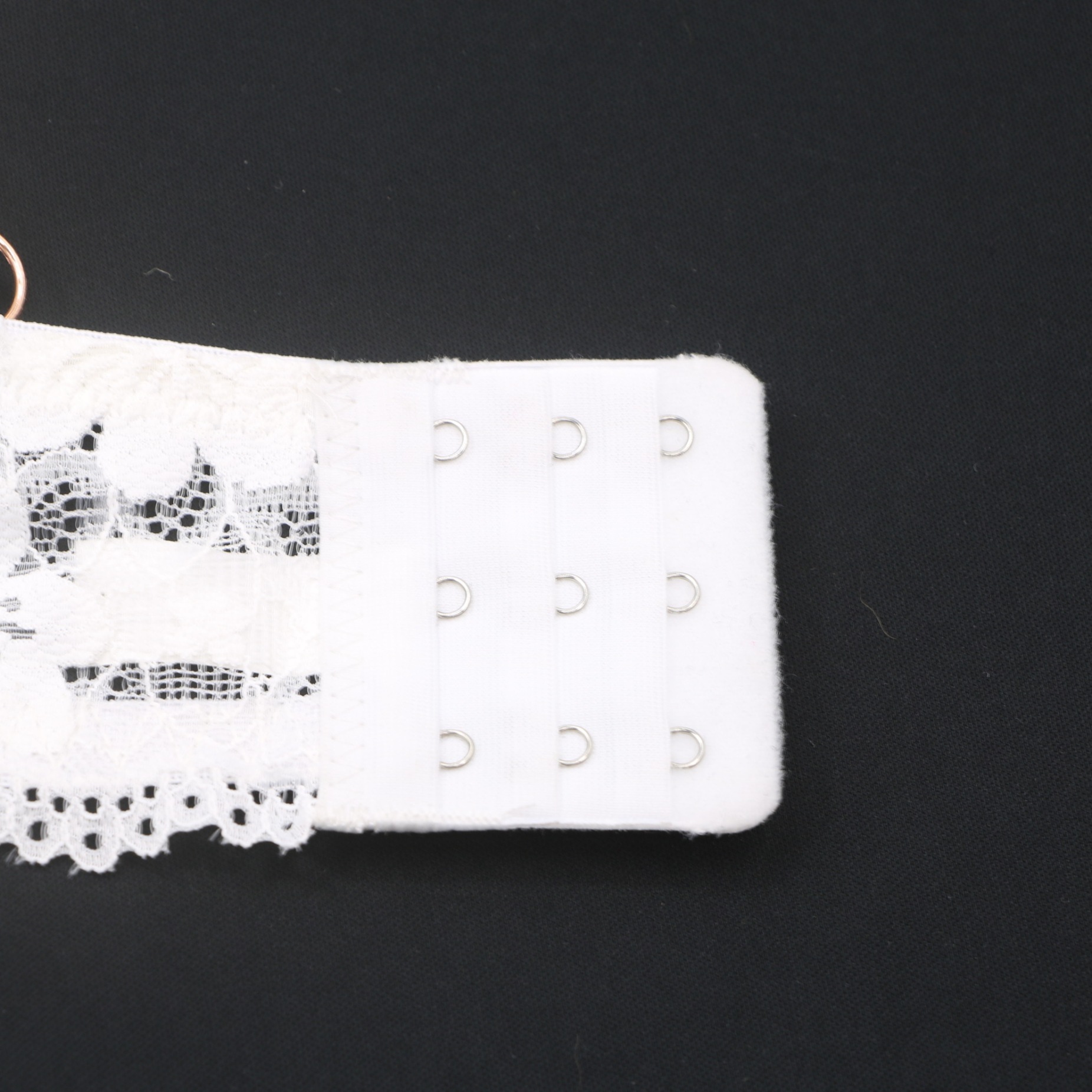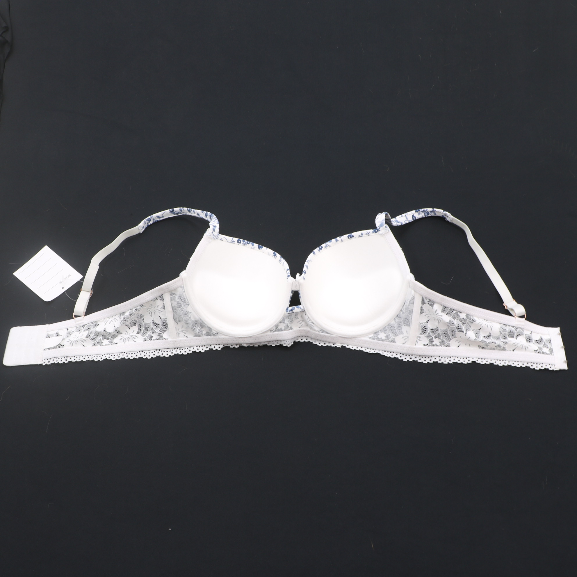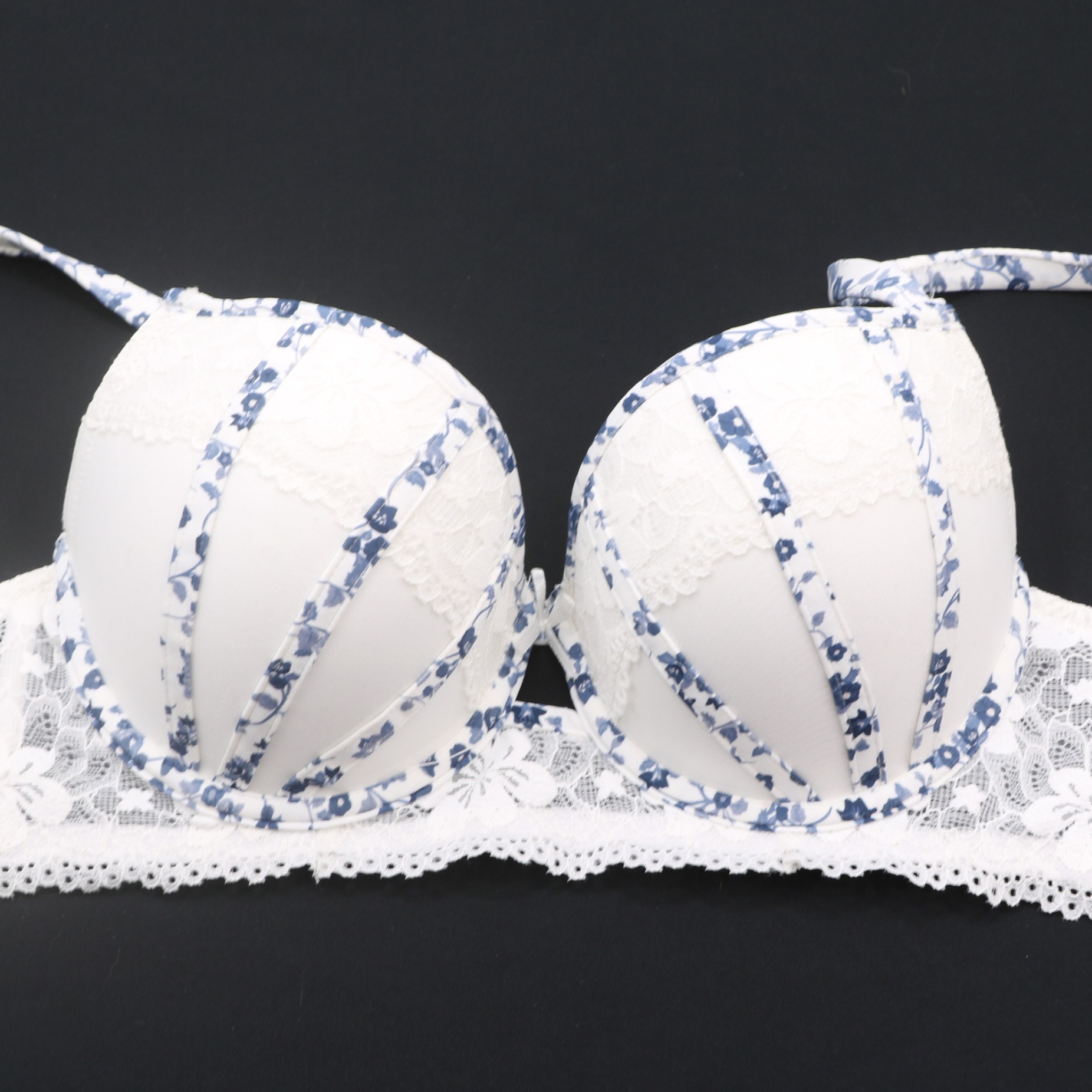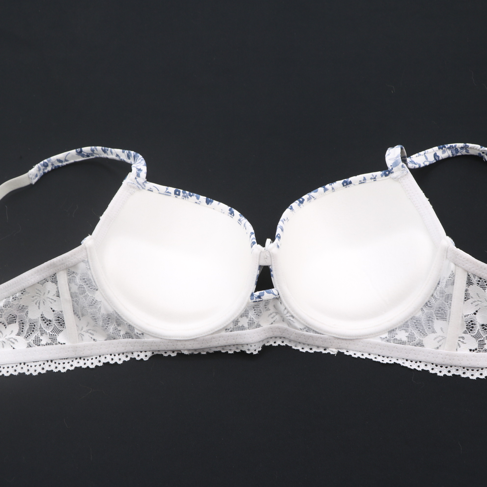 Soft white bra with eye-catching blue floral print and delicate lace trim. Molded cups offer natural lift, and rose gold adjustable straps ensure a perfect fit. The multi-row back closure provides extra security, ideal for daily wear.