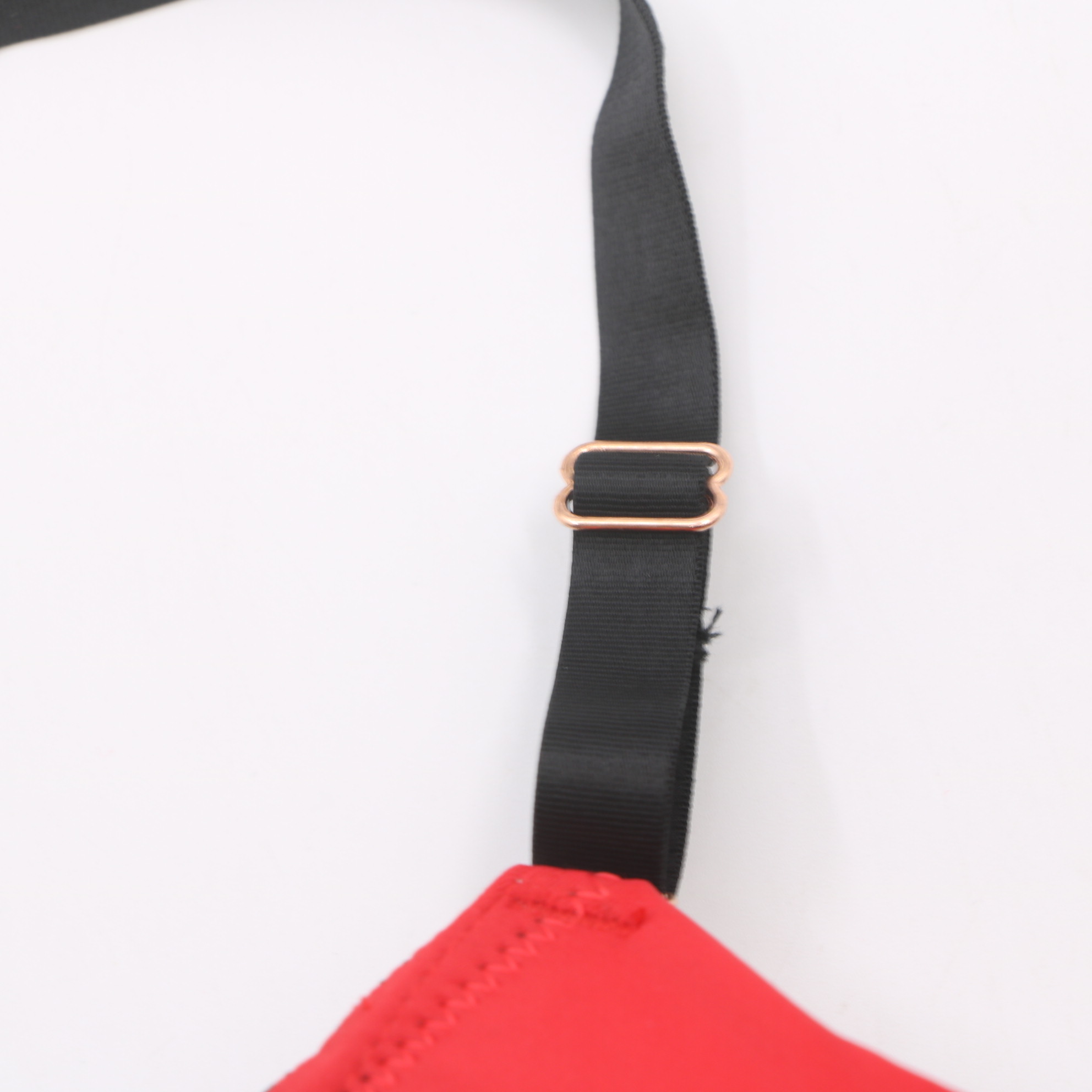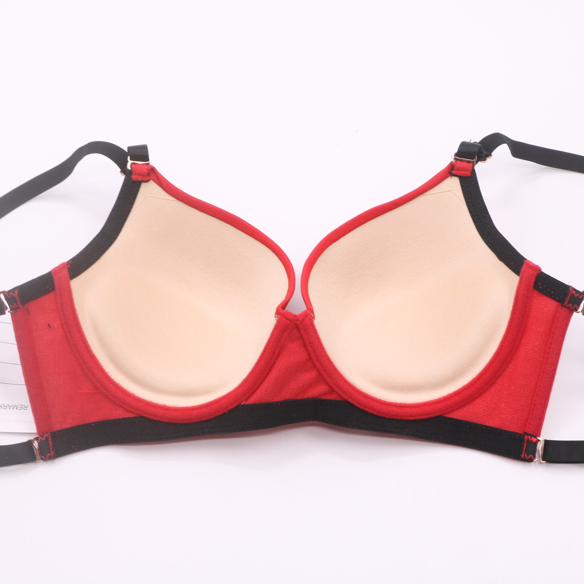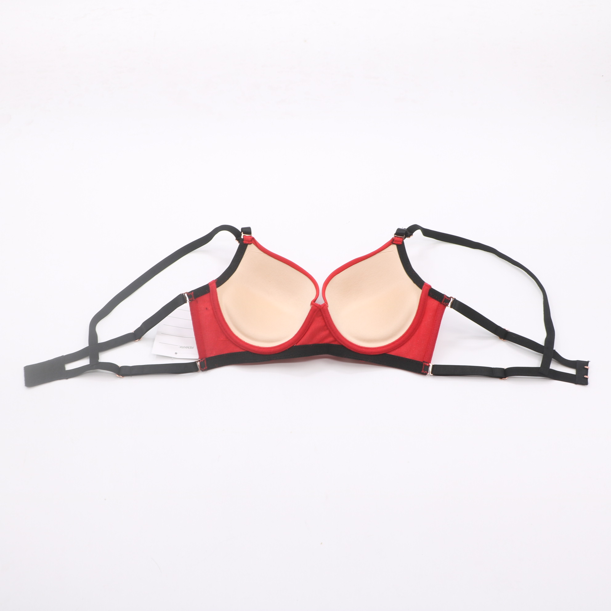 Red push-up bra with black lace contrast panels and rose gold hardware. Strappy design adds style, adjustable straps ensure a custom fit. Molded cups provide lift and support for a flattering silhouette.