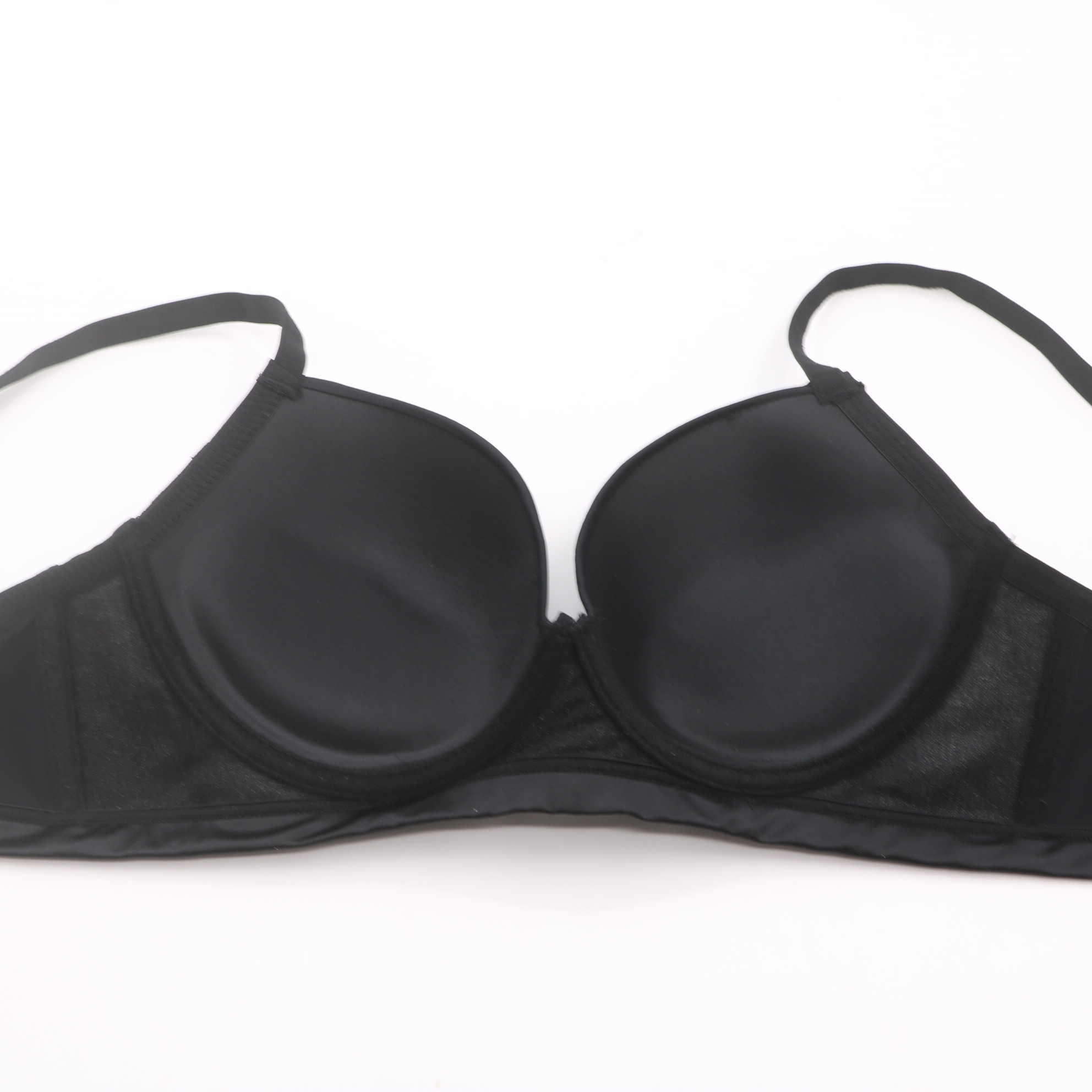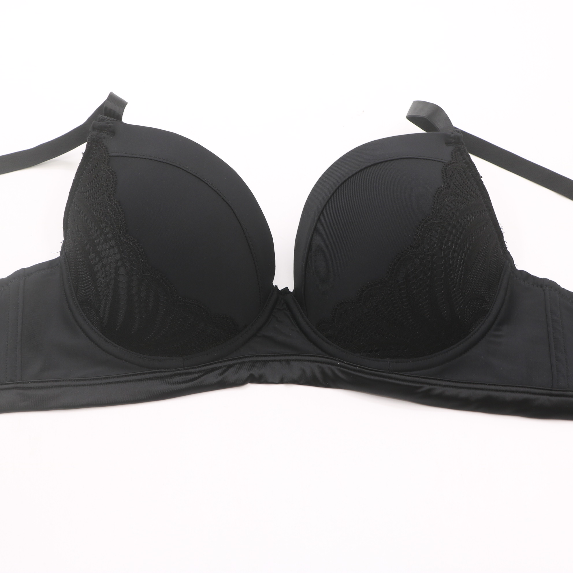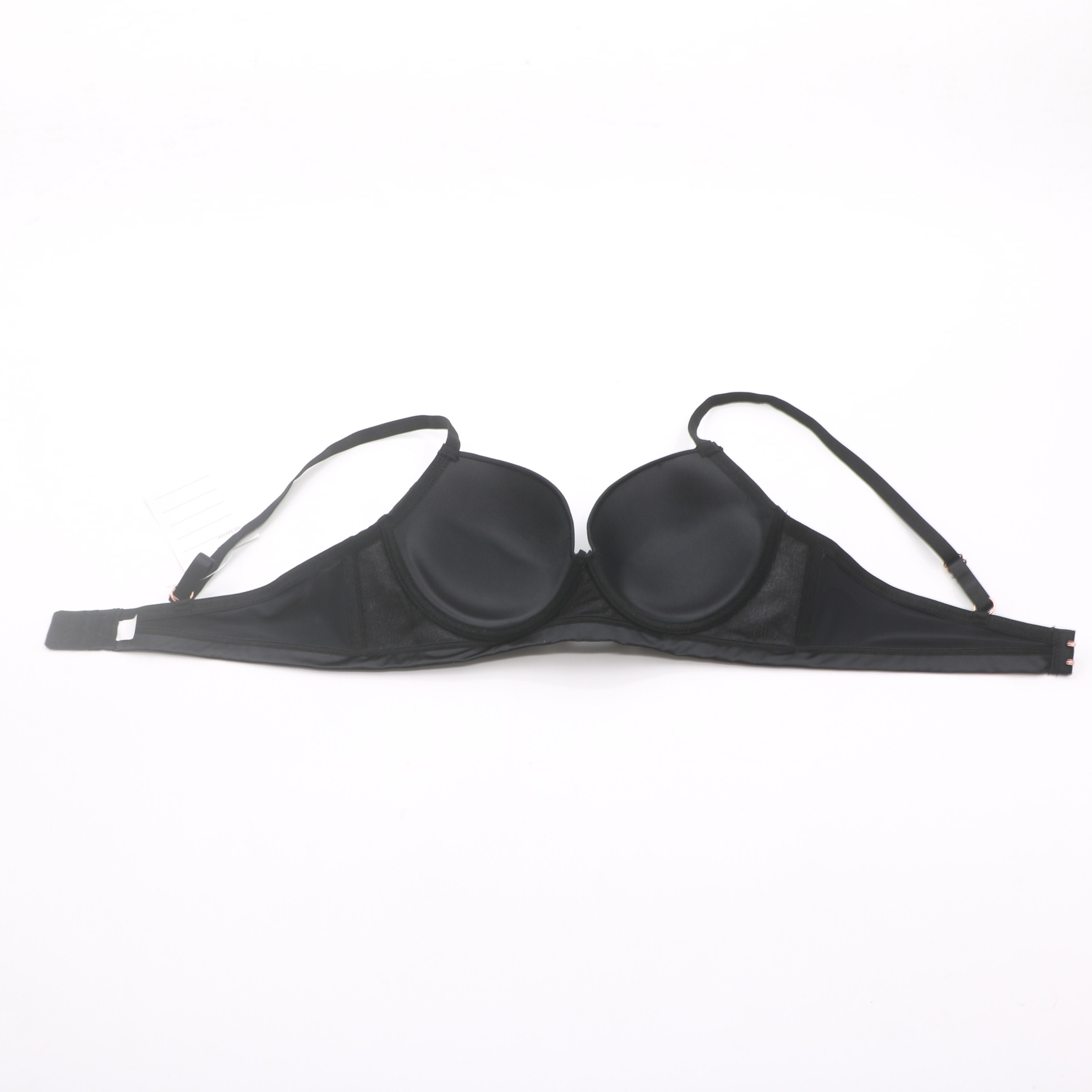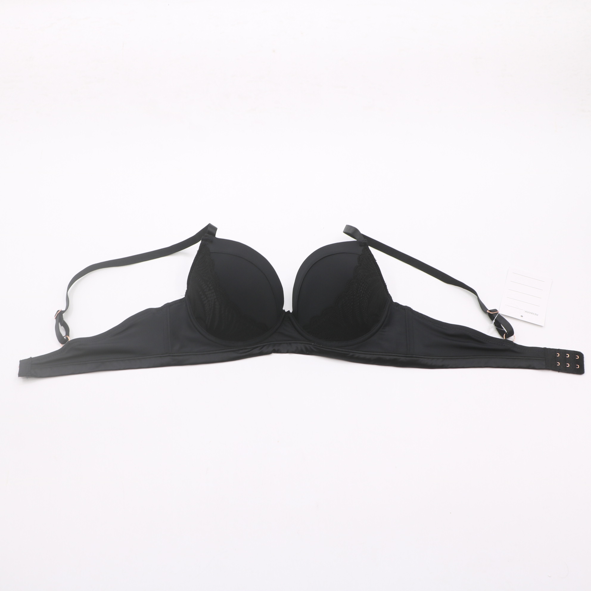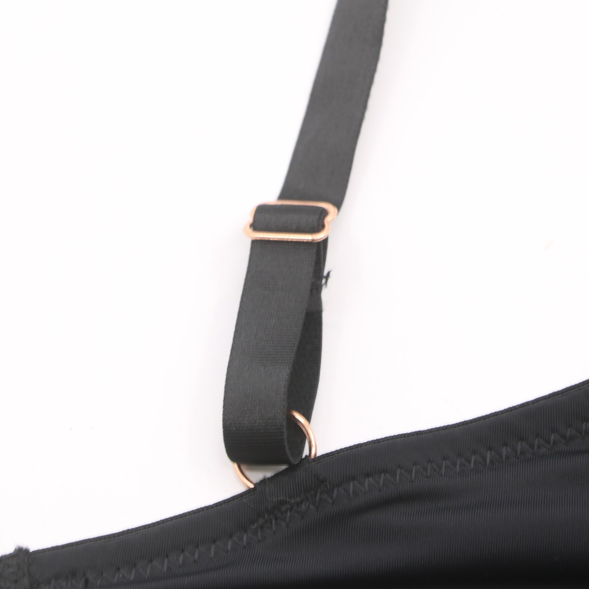 Smooth molded cups with delicate scalloped lace trim, rose gold ring hardware, and adjustable straps for a sleek, sexy fit.