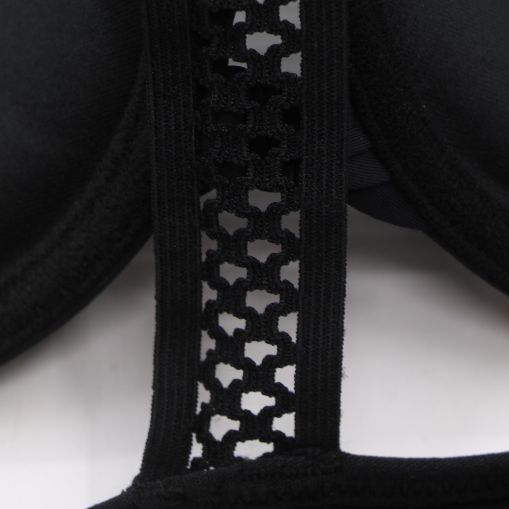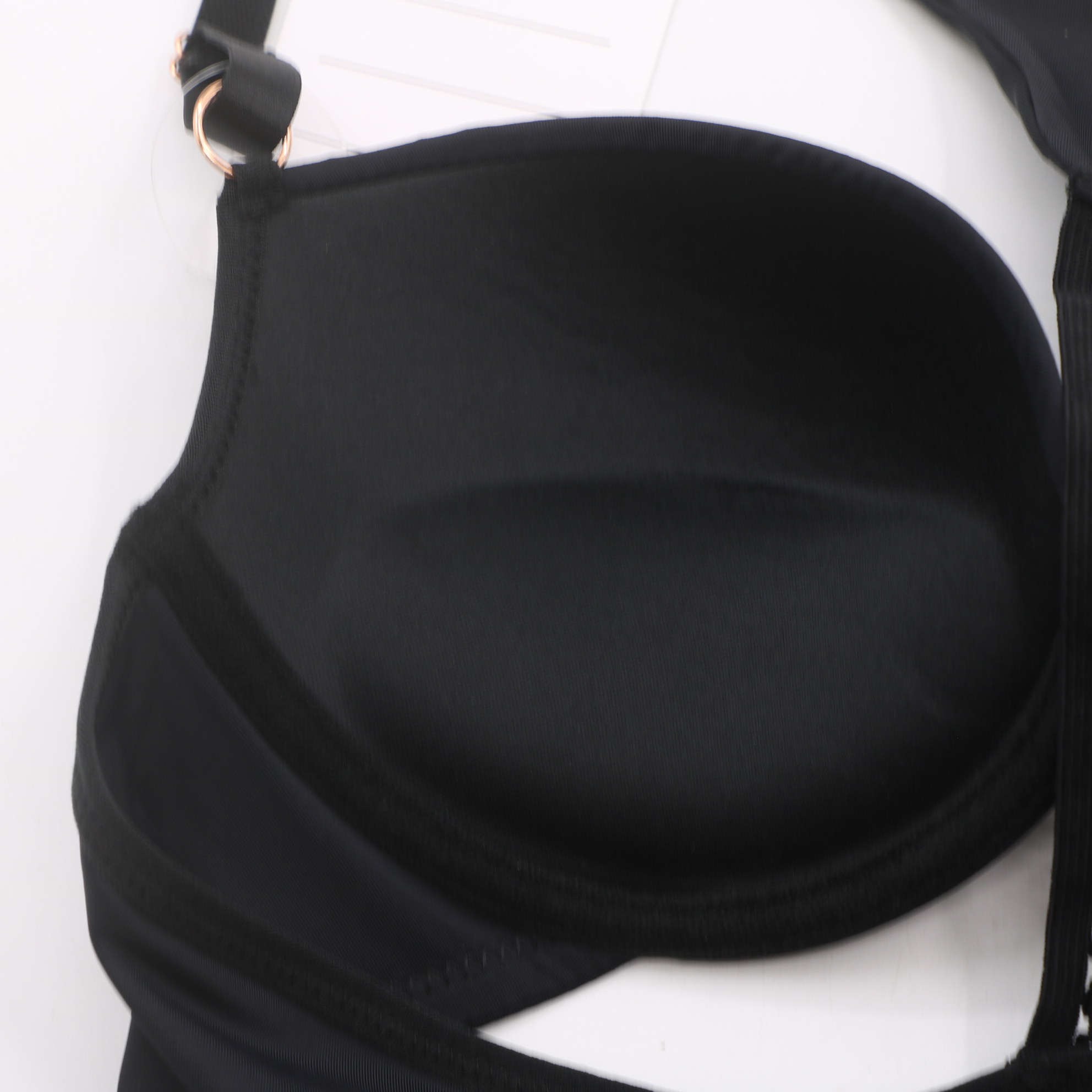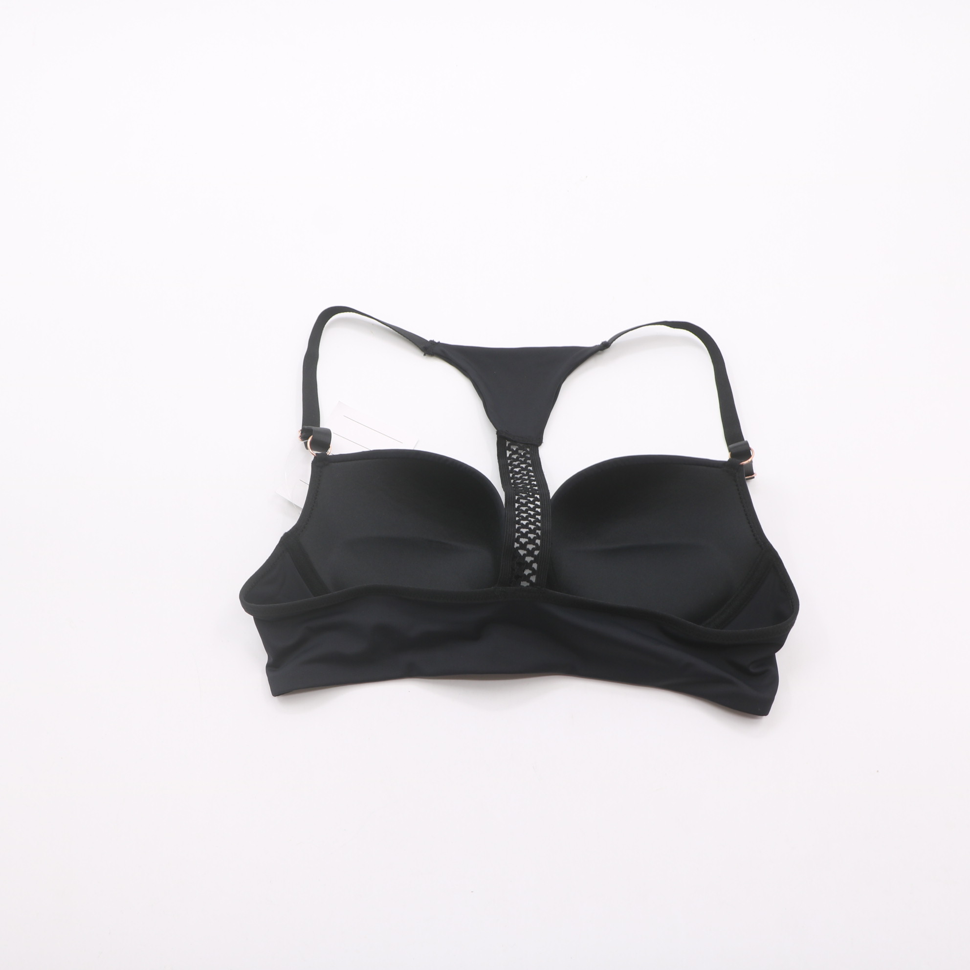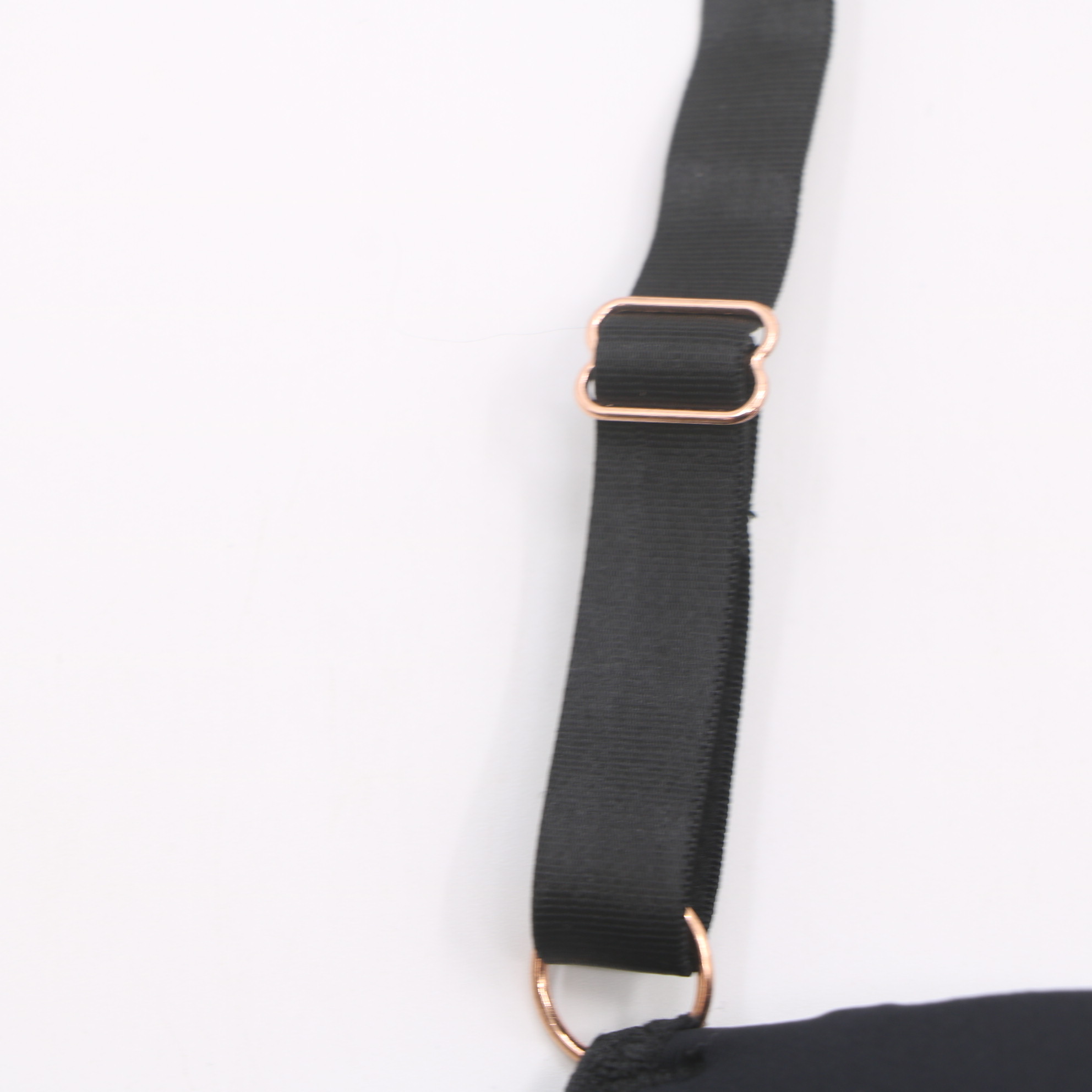 Smooth molded cups, intricate lace racerback strap, and rose gold hardware for a sleek, sexy silhouette.