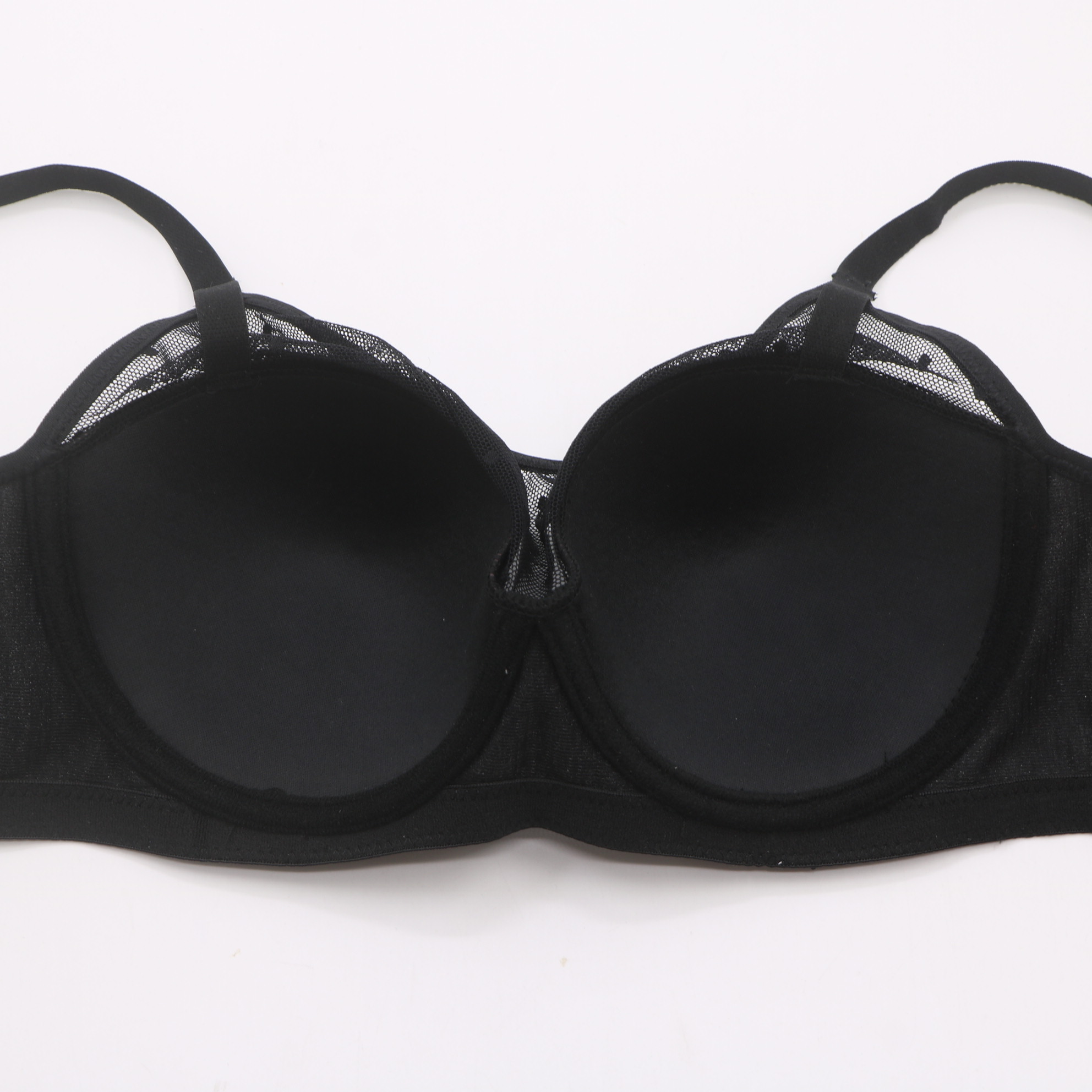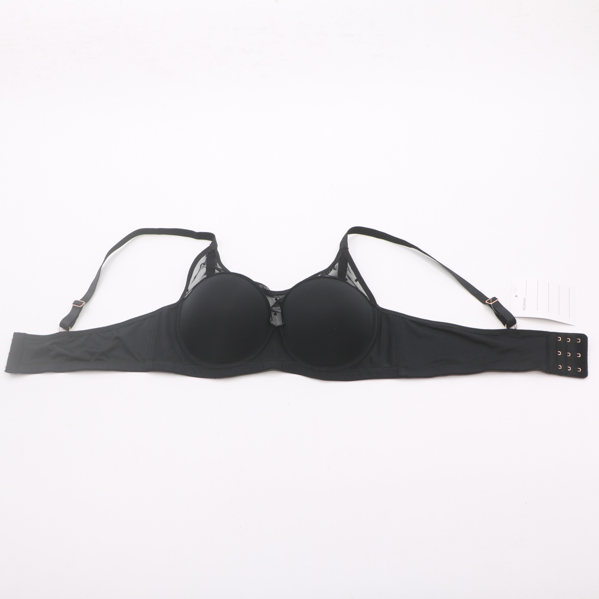 Smooth molded cups with delicate sheer mesh accents, rose gold hardware, and a supportive fit for invisible everyday wear.