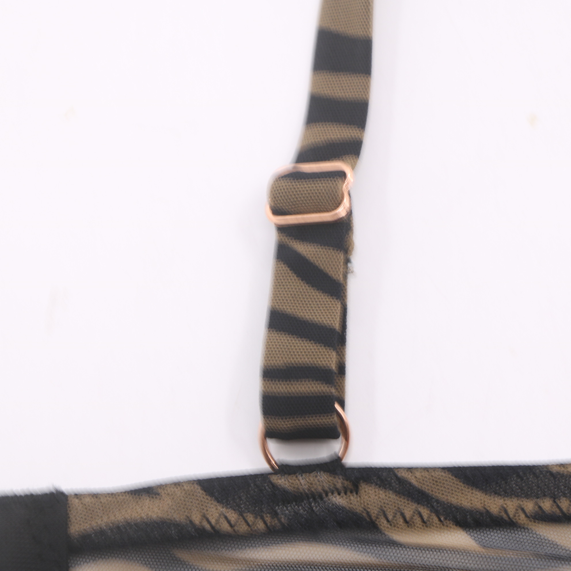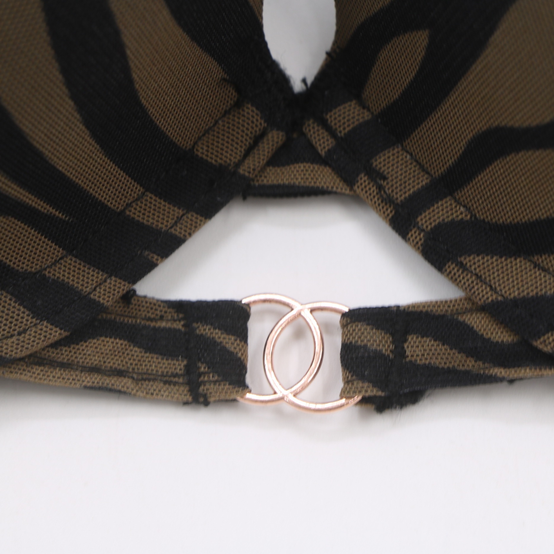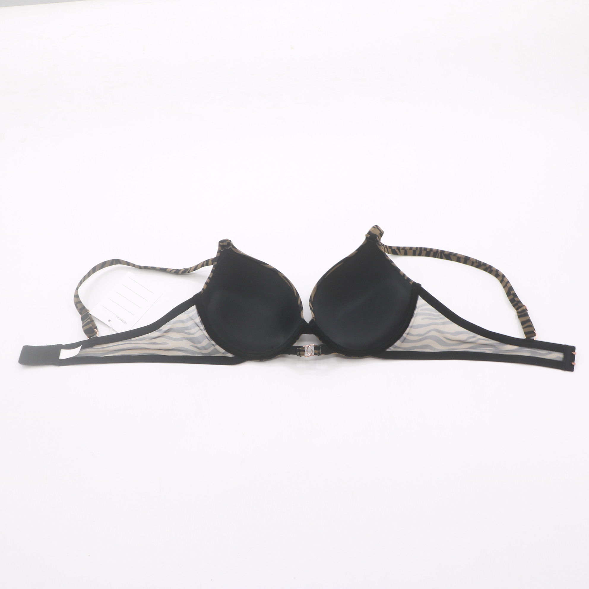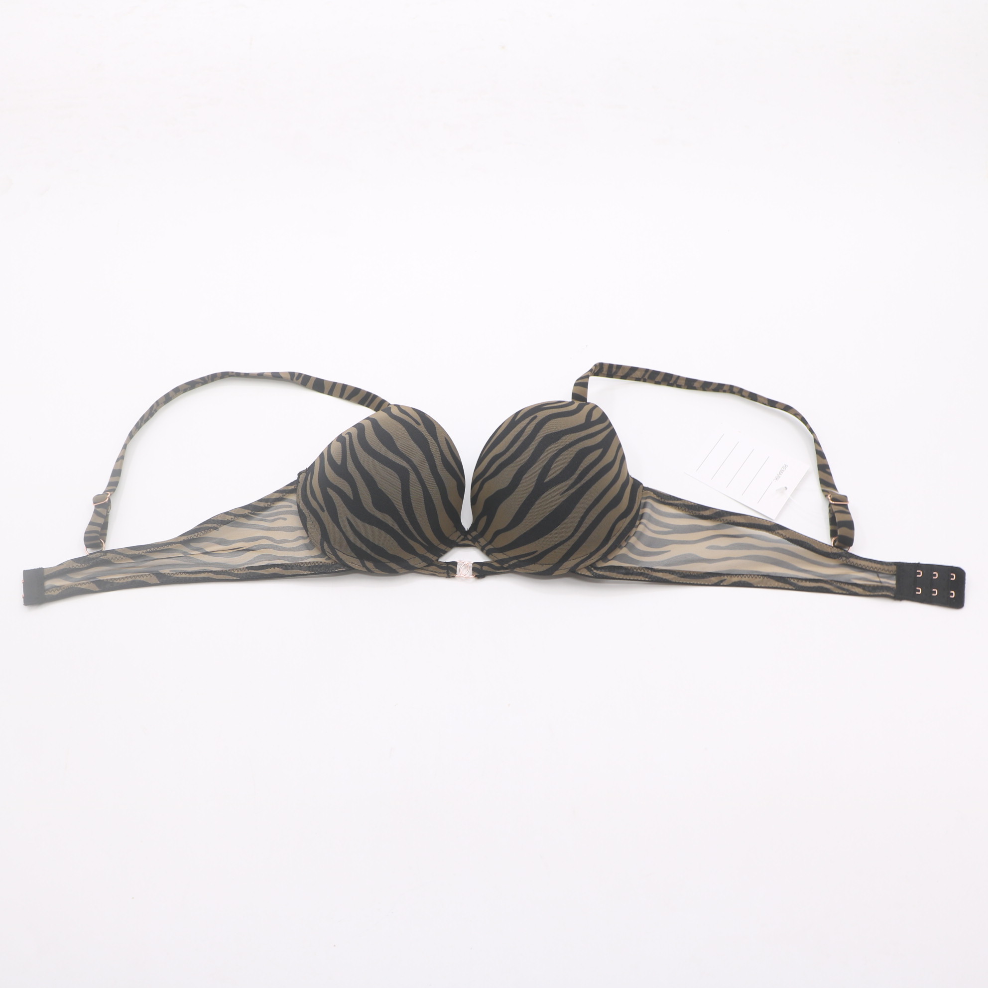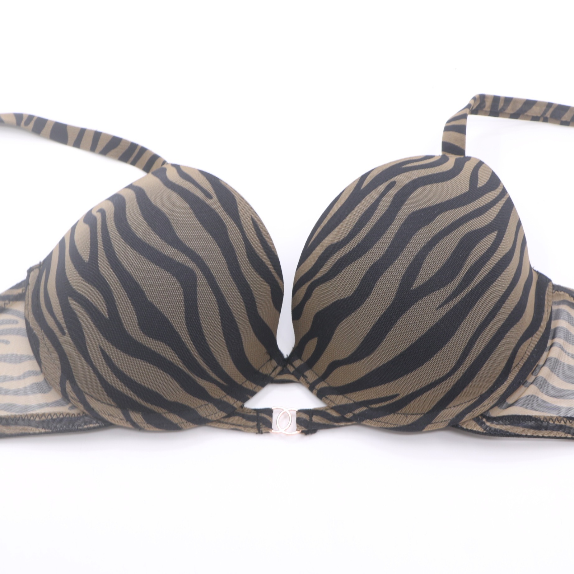Make a bold statement with this zebra print push-up bra. The molded cups provide gentle lift and a flattering shape, while the sheer mesh side panels add a touch of allure. Featuring rose gold hardware, including a decorative front clasp and adjustable straps, this bra combines edgy style with a secure, personalized fit. Elevate your linge