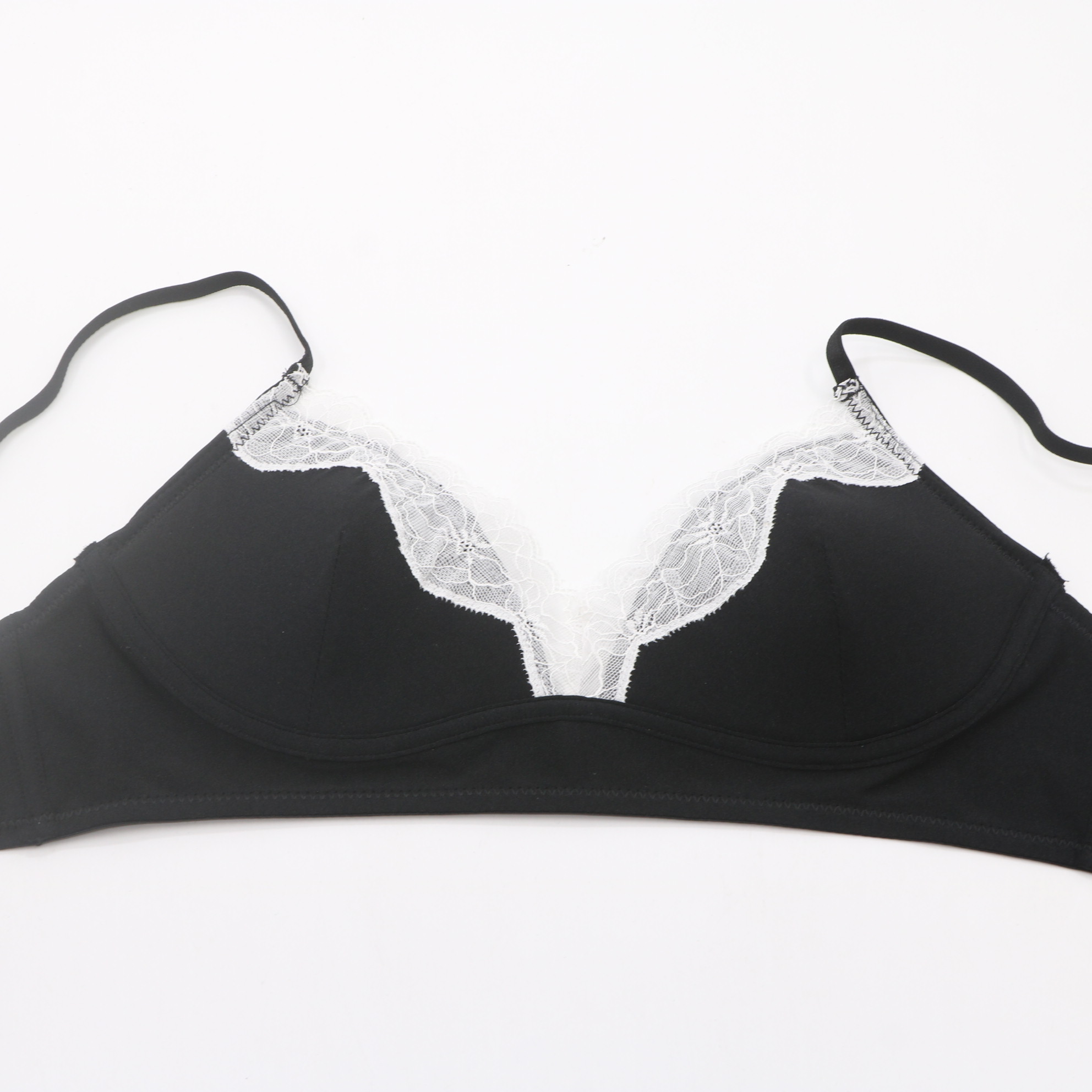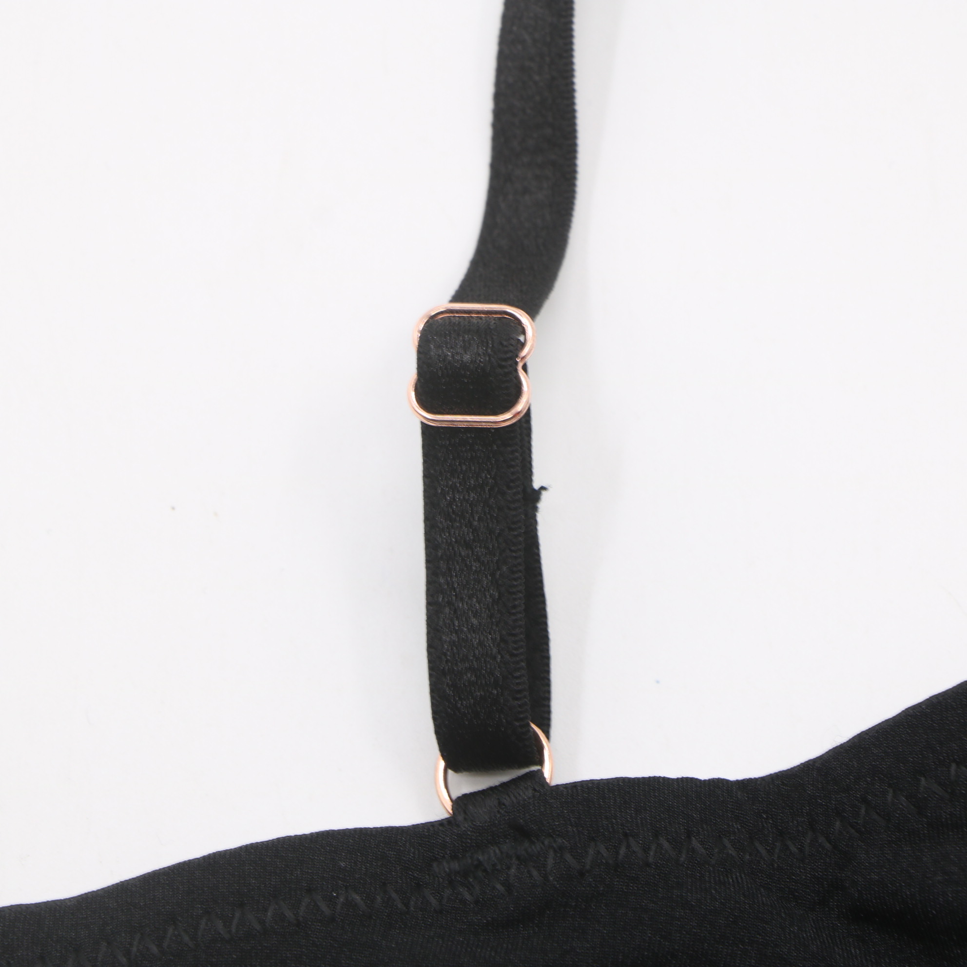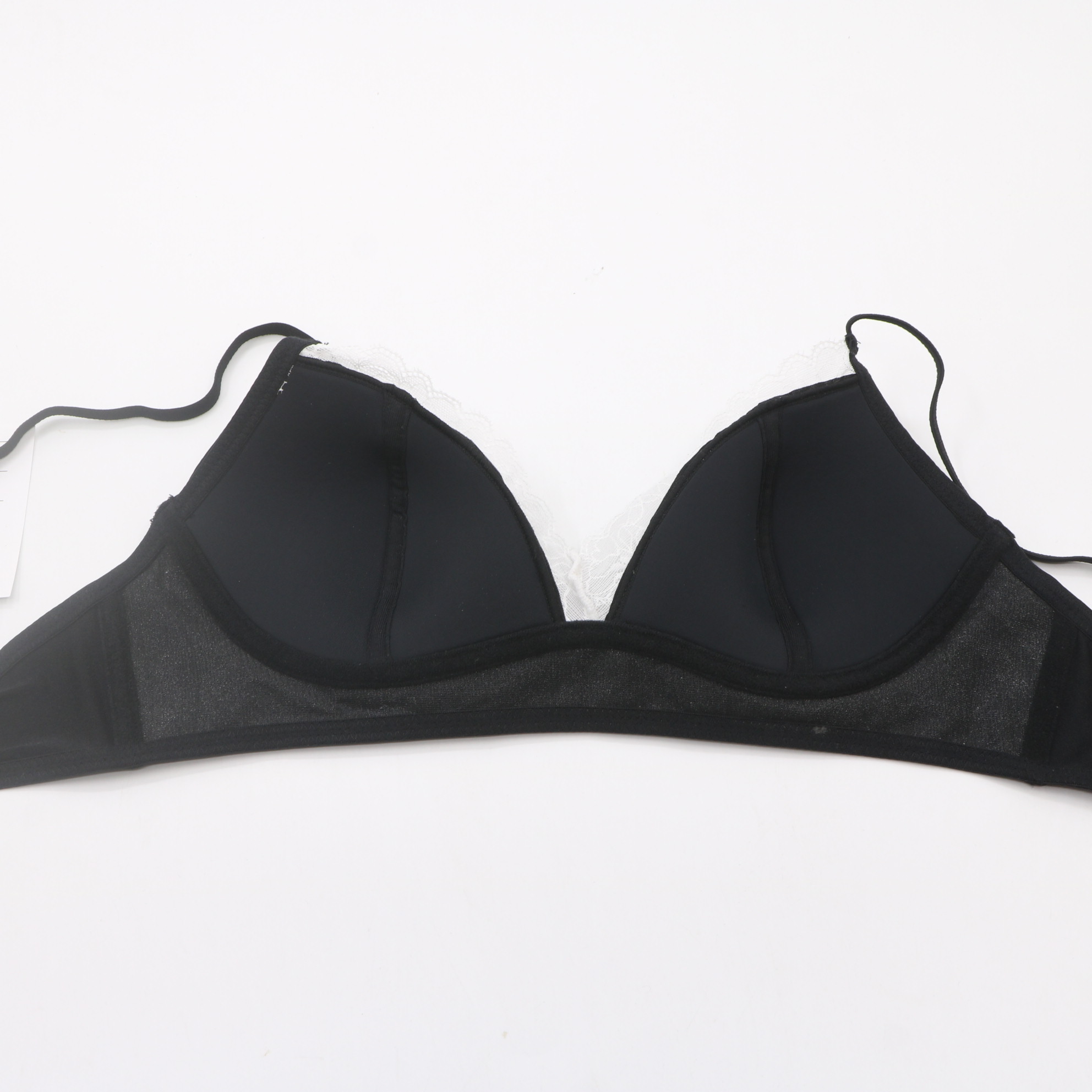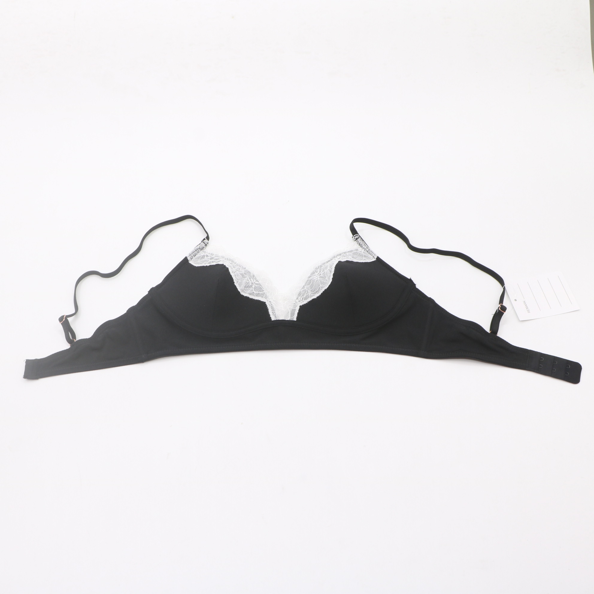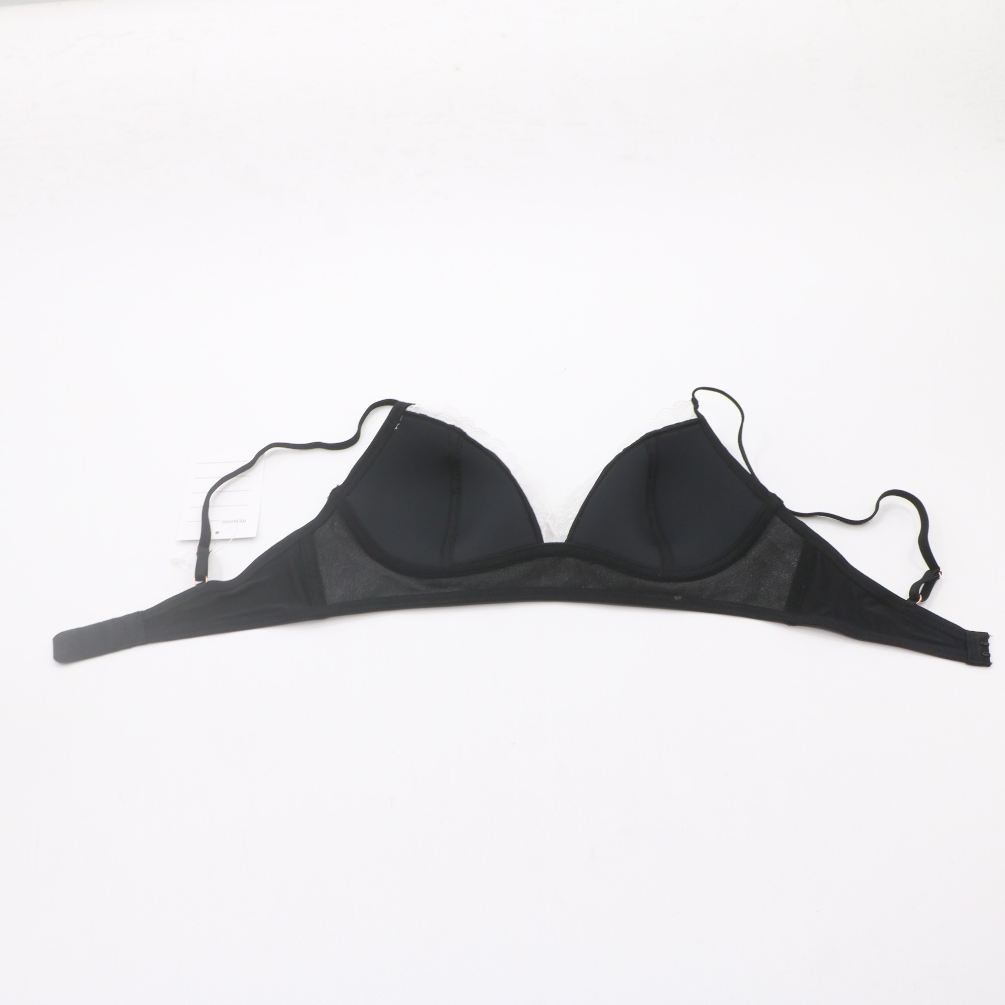 This black plunge bra features delicate white floral lace trim along the neckline for a romantic touch. The back is crafted from breathable mesh fabric, while the adjustable straps are finished with rose gold hardware for a subtle luxury. The molded cups offer a natural shape, and the 2-row back closure ensures a secure, personalized fit.