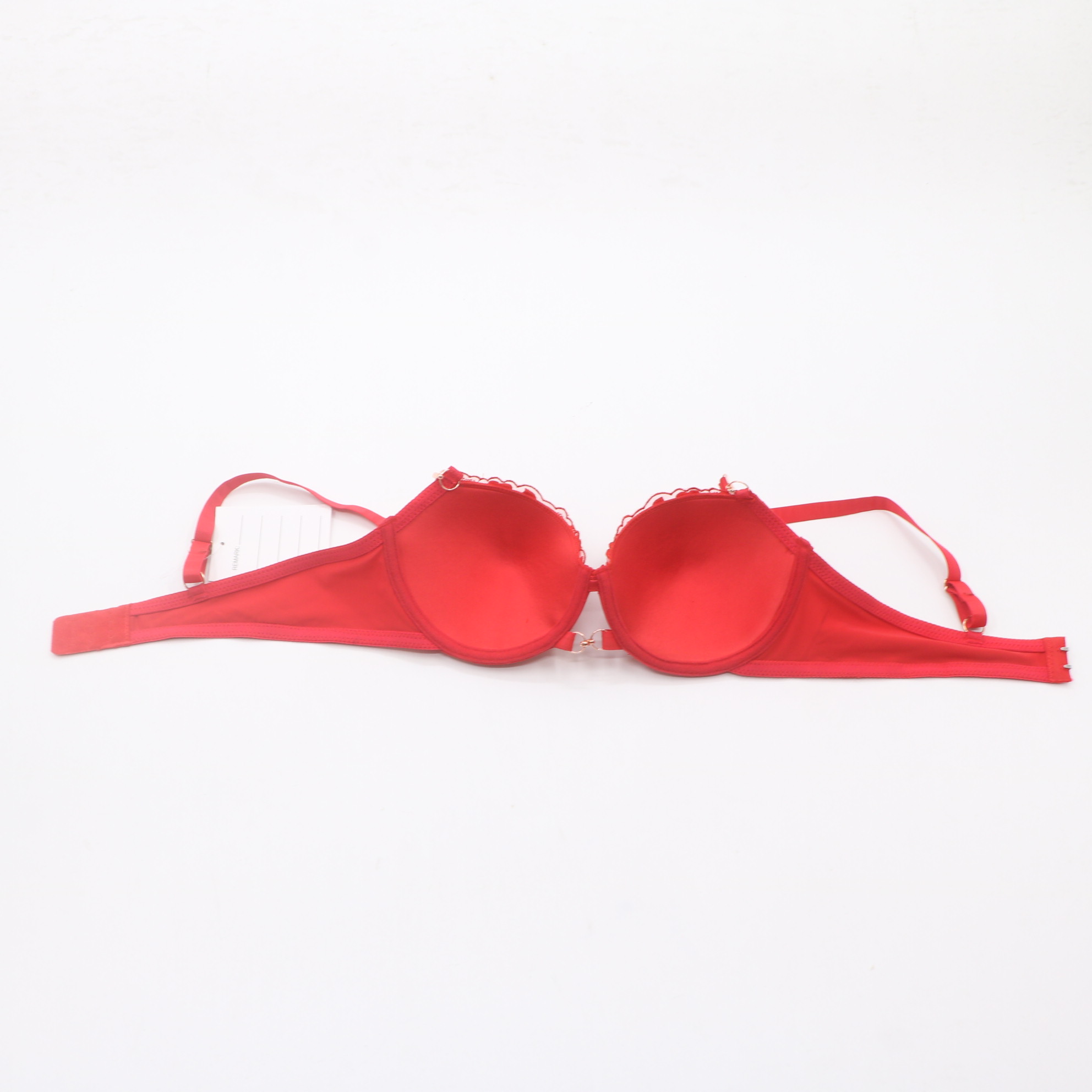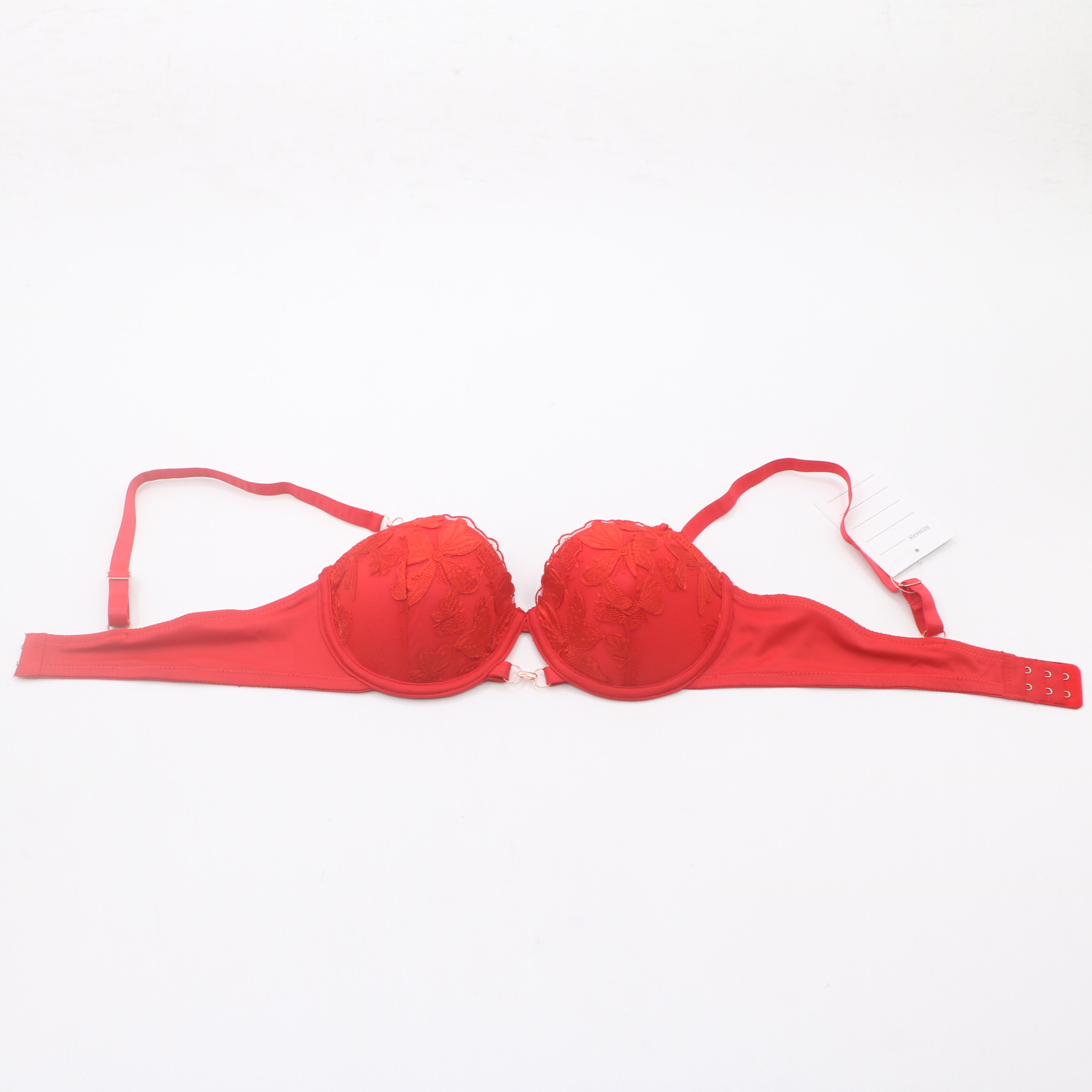 This romantic red bra features delicate floral embroidery on a smooth satin base, with rose gold hardware for a luxurious touch. The molded cups provide gentle lift and support, while the scalloped lace edges add a feminine, delicate finish.