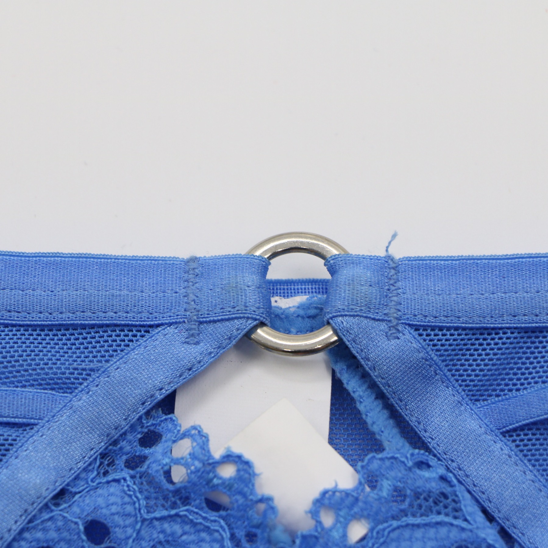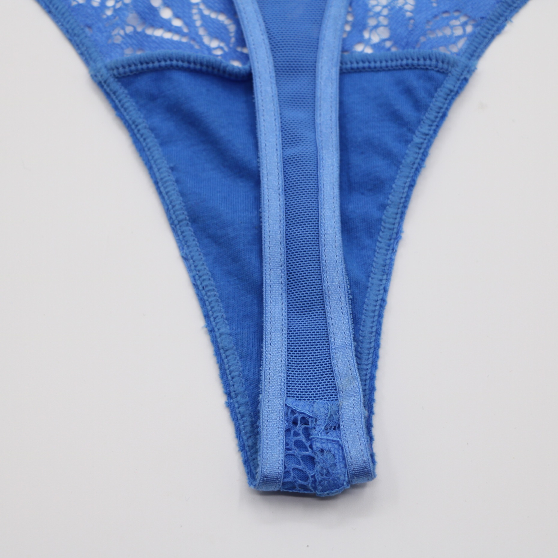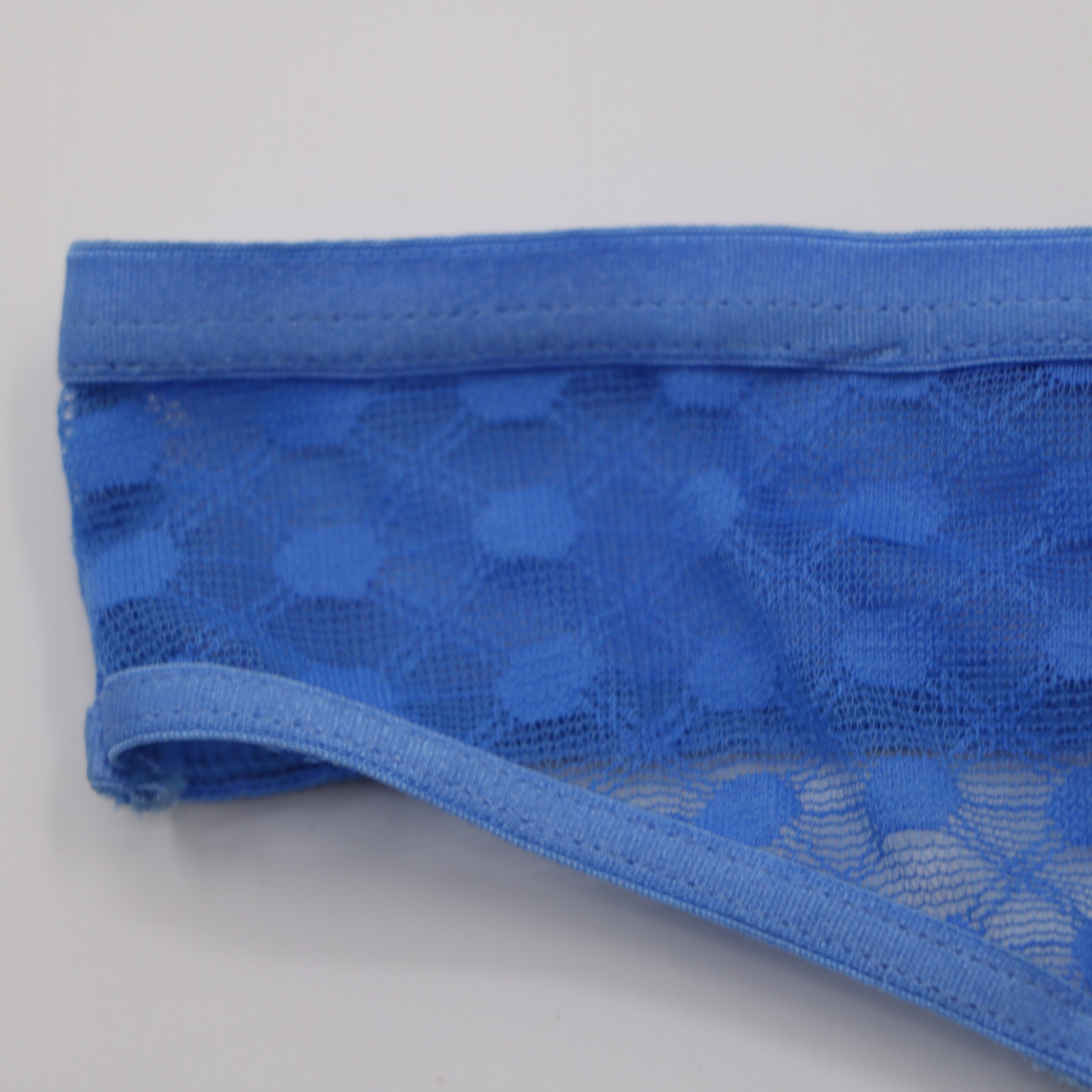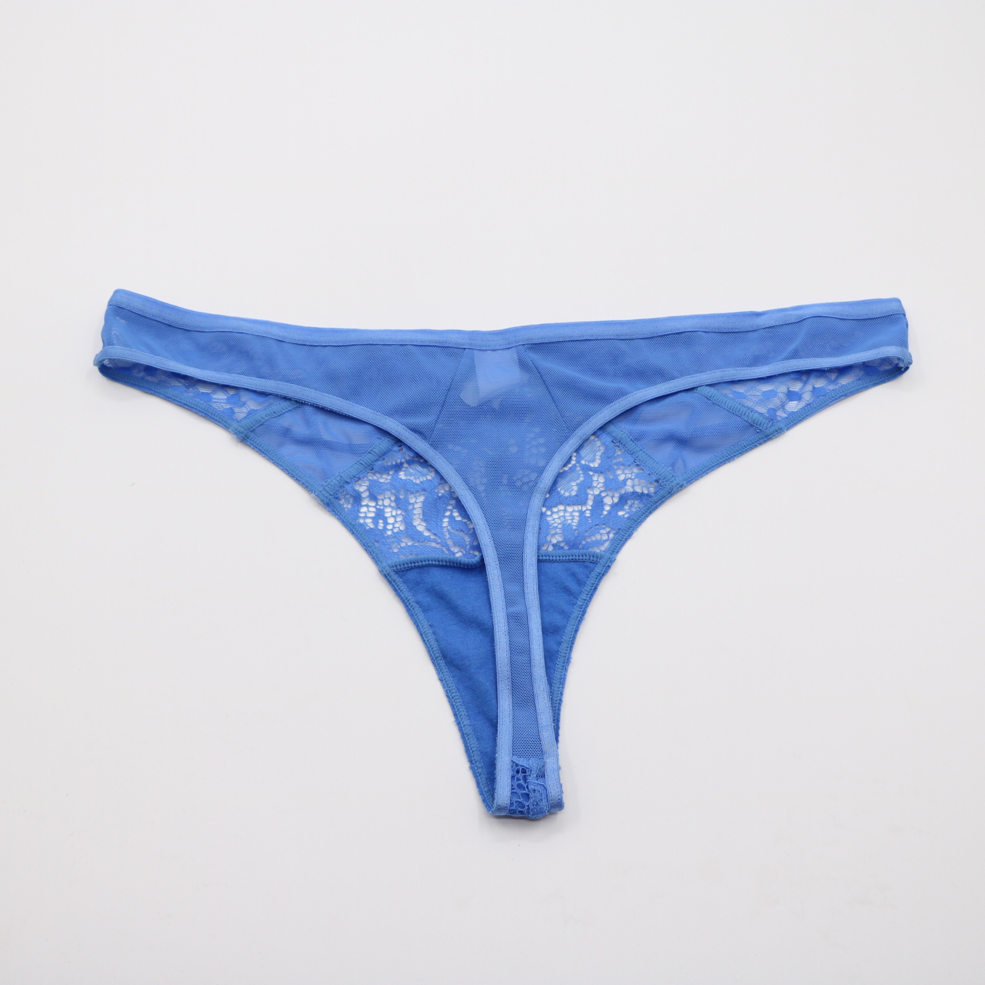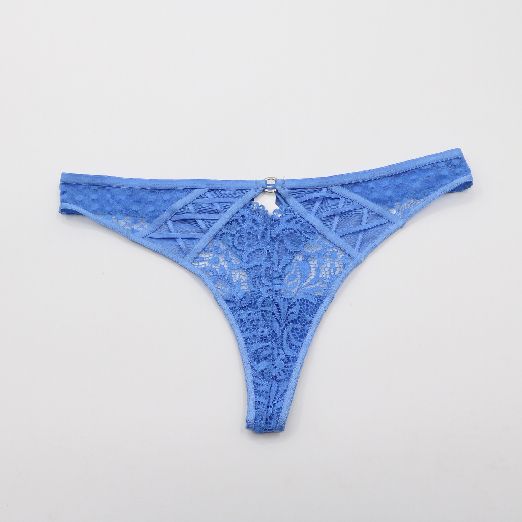 This striking blue thong features intricate floral lace and a sheer dot-mesh waistband, accented by a silver O-ring and crisscross strap detail for an edgy, feminine look. The soft cotton lining ensures all-day comfort, while the minimal coverage creates a seamless silhouette under clothing.
