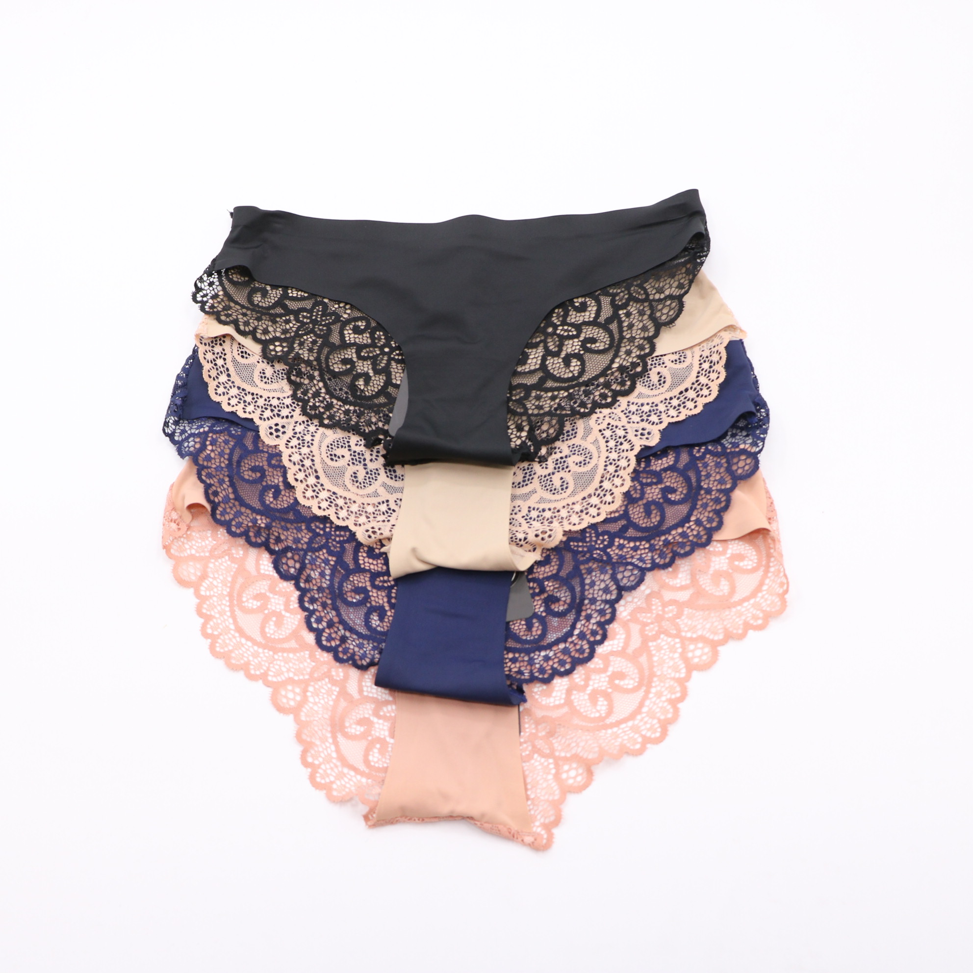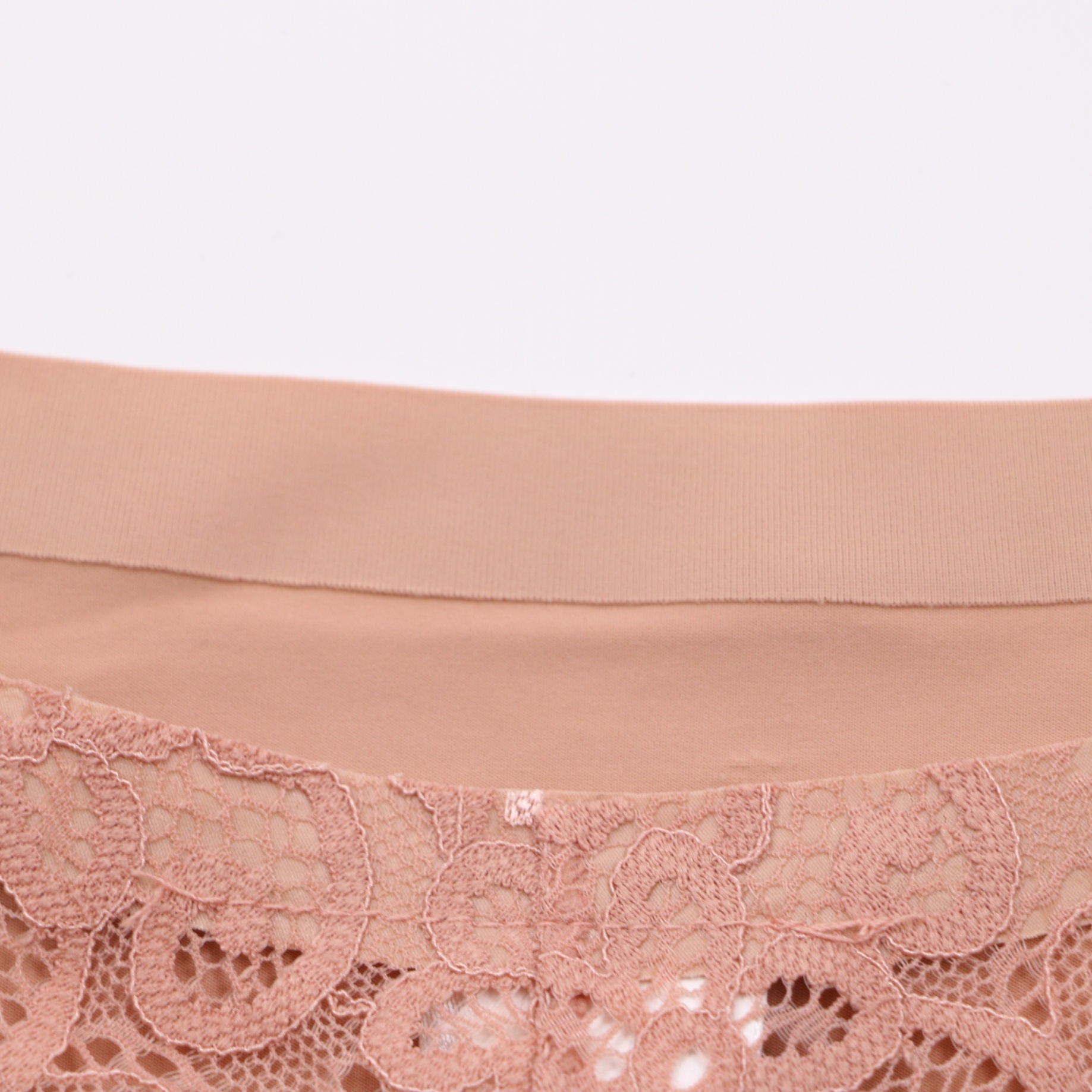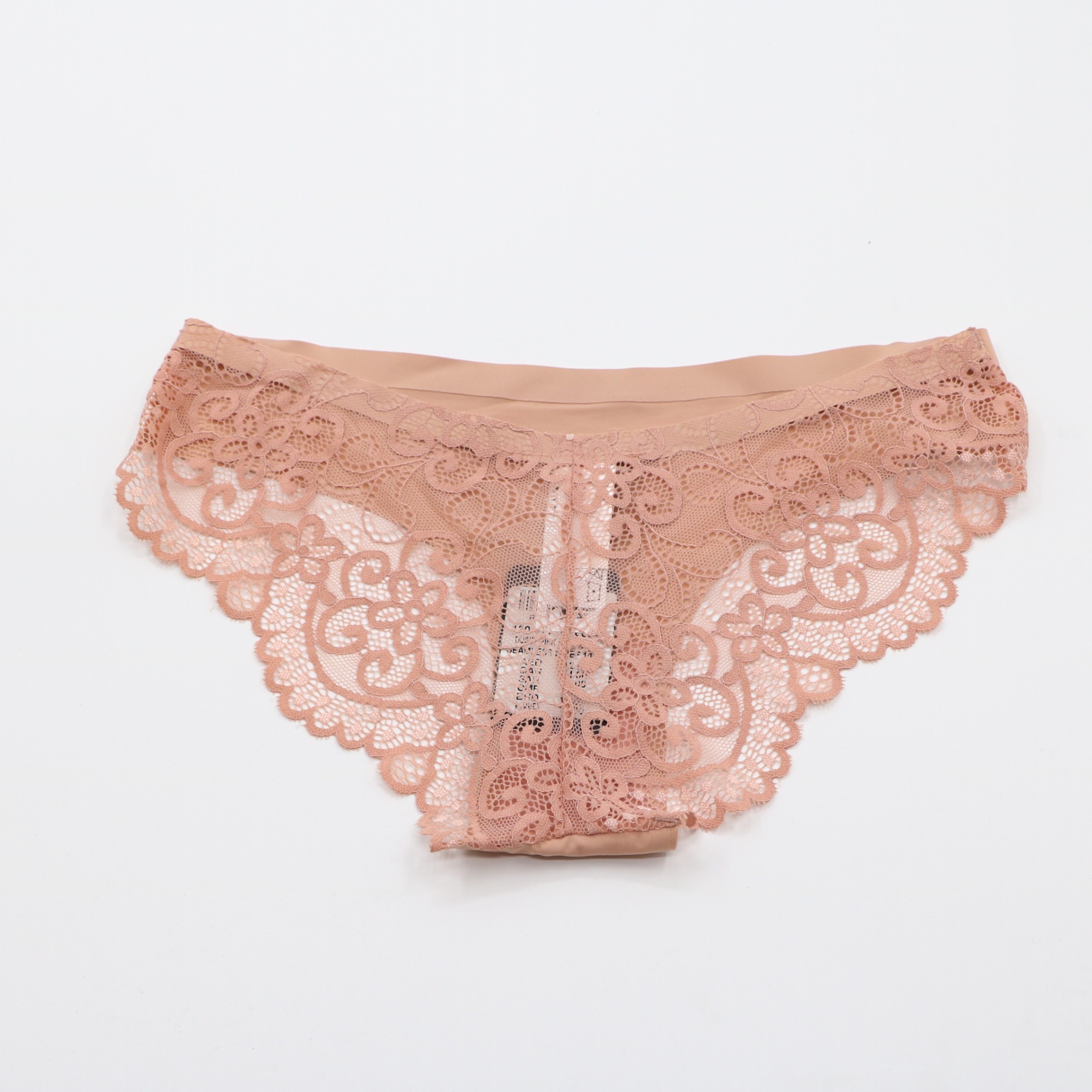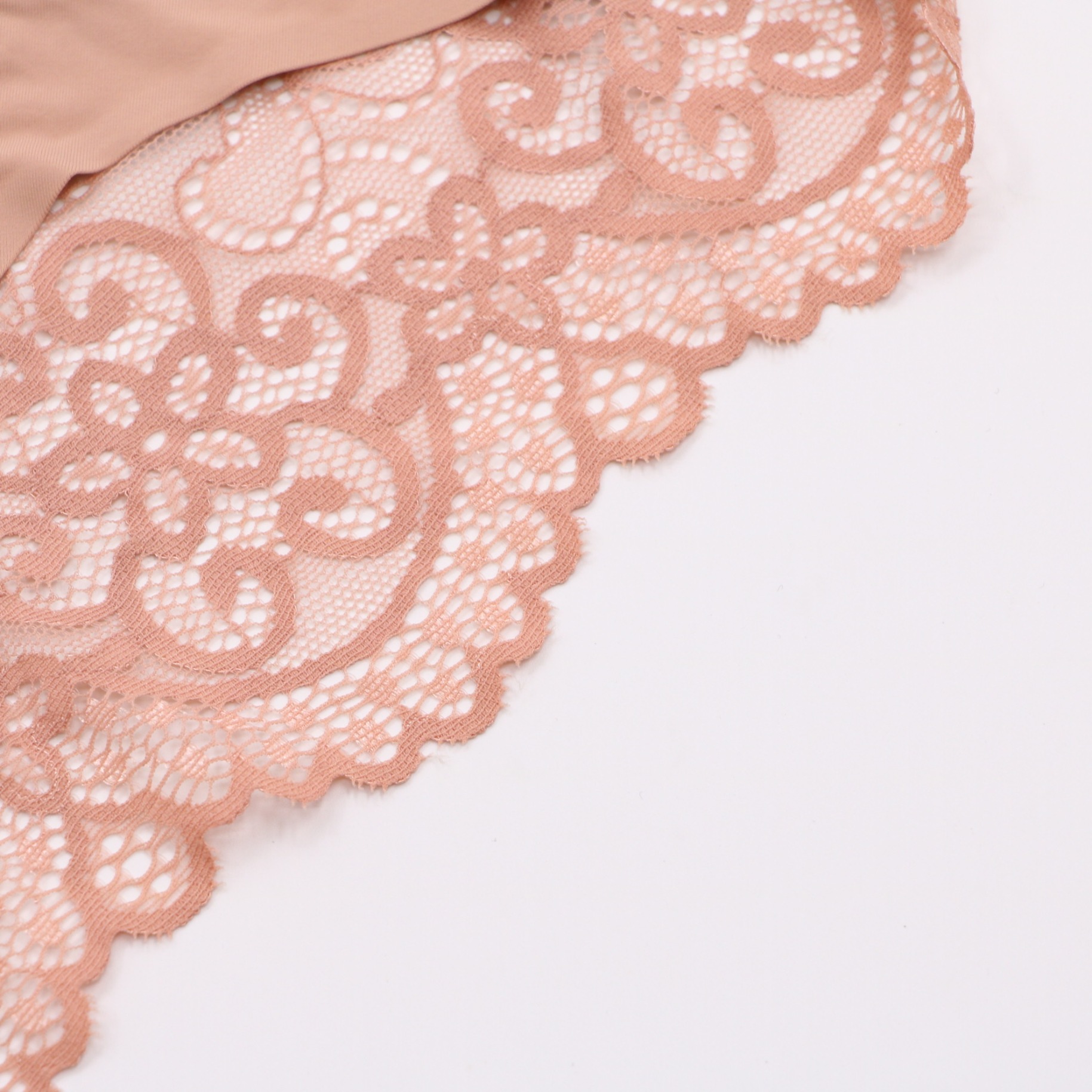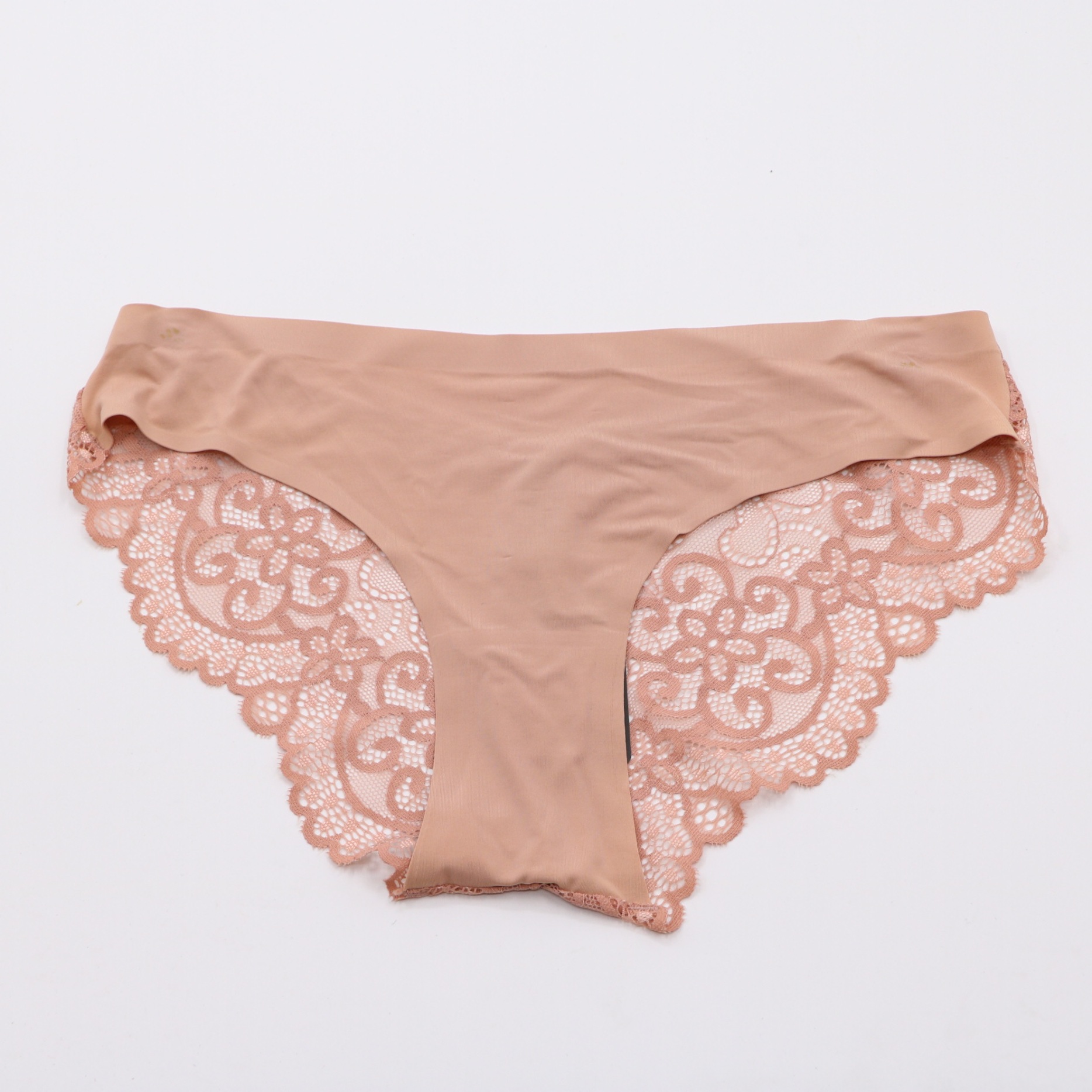 This nude seamless panty features a smooth, no-show front panel for an invisible look under clothing, with intricate blush floral lace on the sides and back for a romantic touch. The seamless elastic waistband ensures a comfortable, secure fit, while the cheeky cut and scalloped lace trim add a feminine, elegant detail. Crafted from soft, stretchy fabric, it offers all-day comfort and a seamless silhouette, perfect for everyday wear.