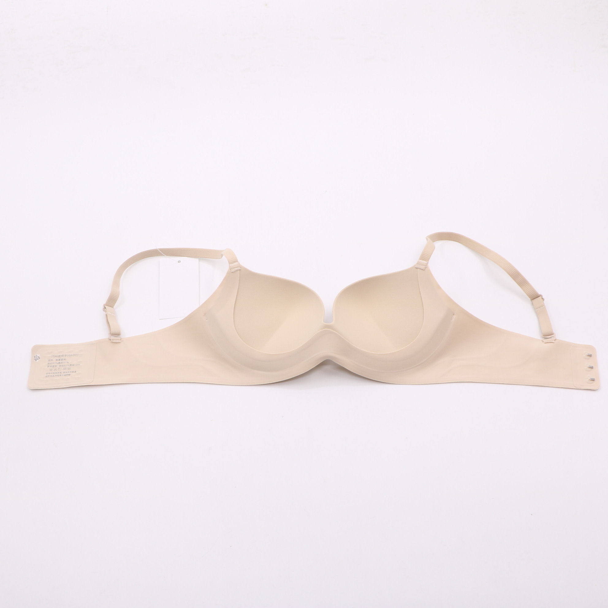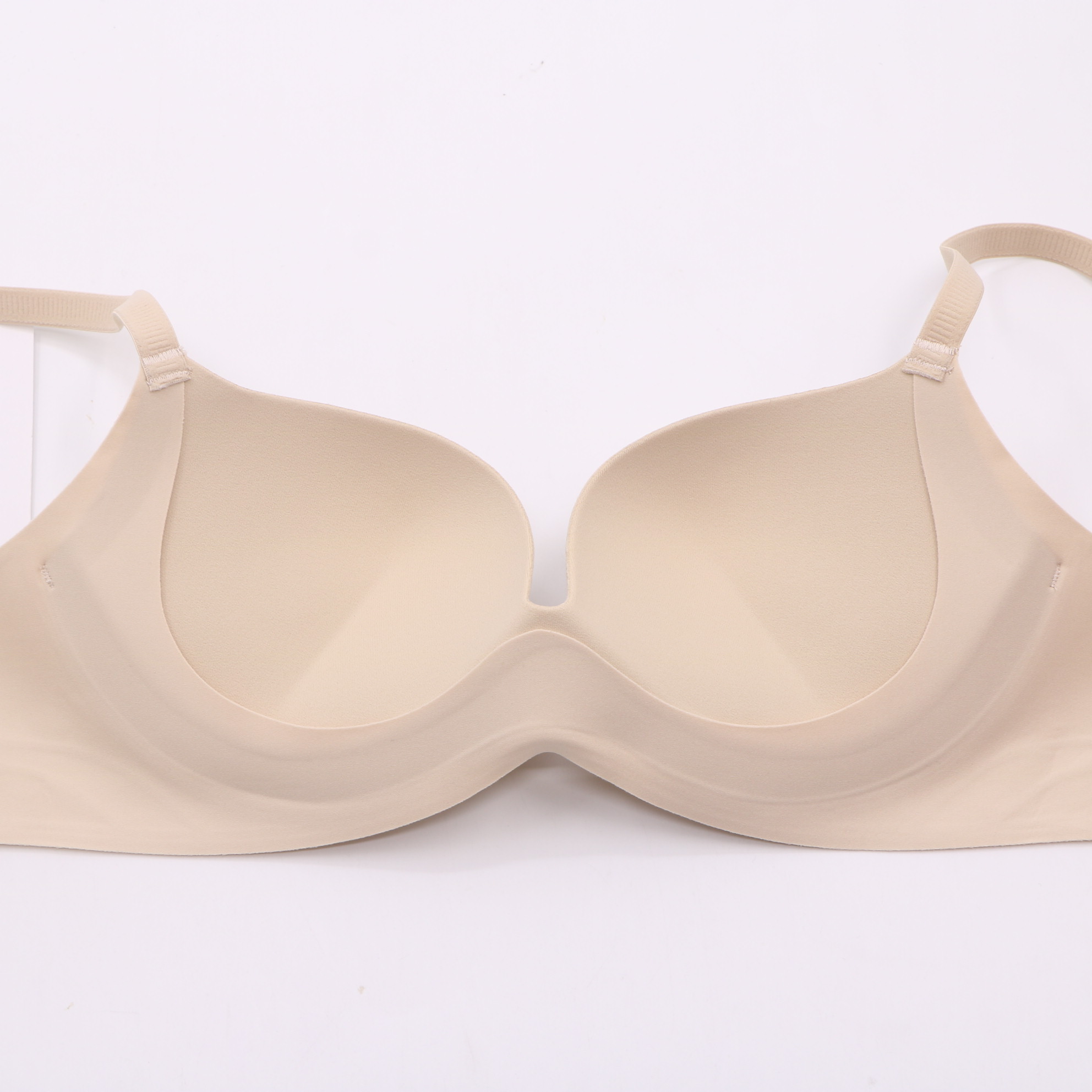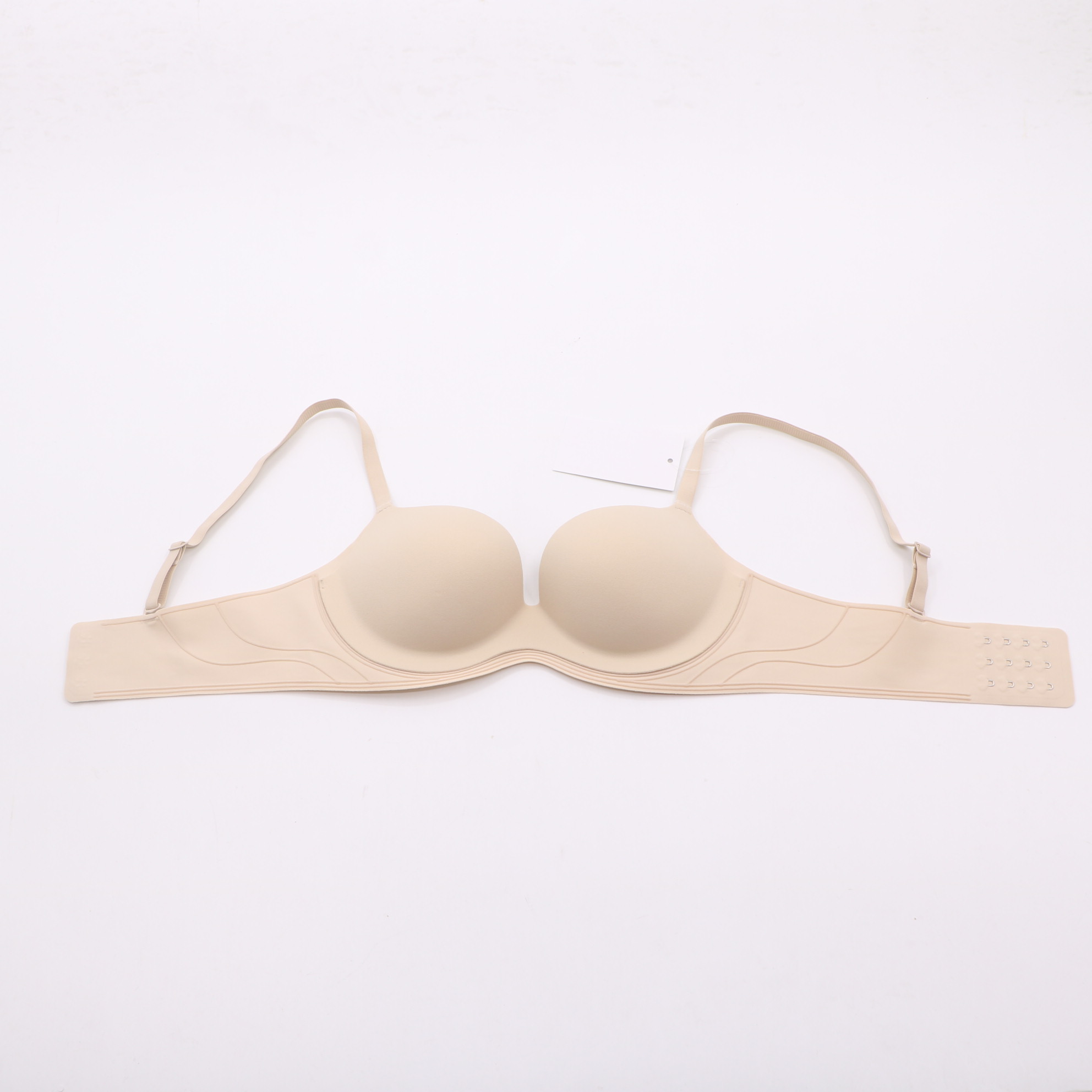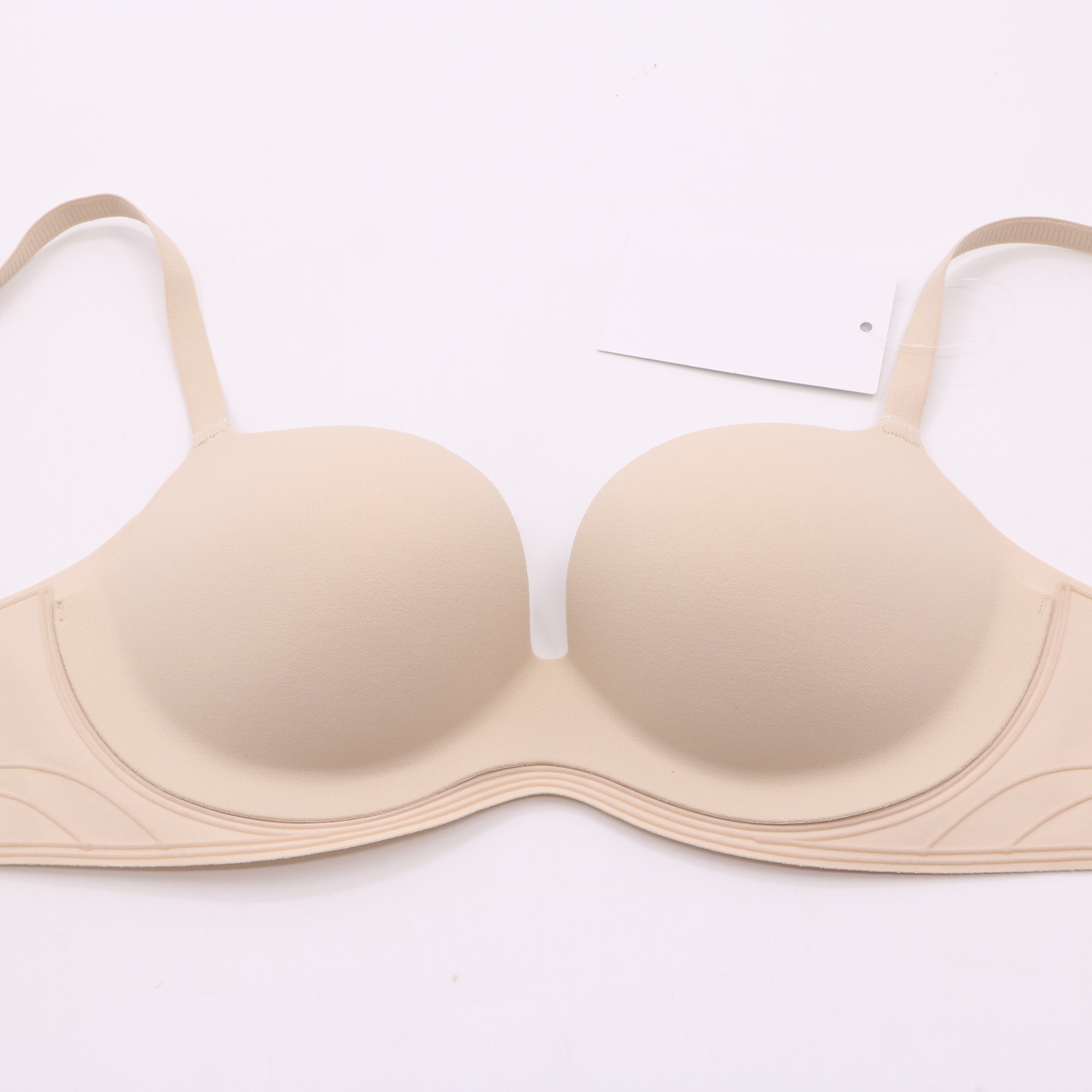 Plush push-up cups, seamless nude fabric with wave side accents, and matching nude hardware for a flattering, supportive silhouette.