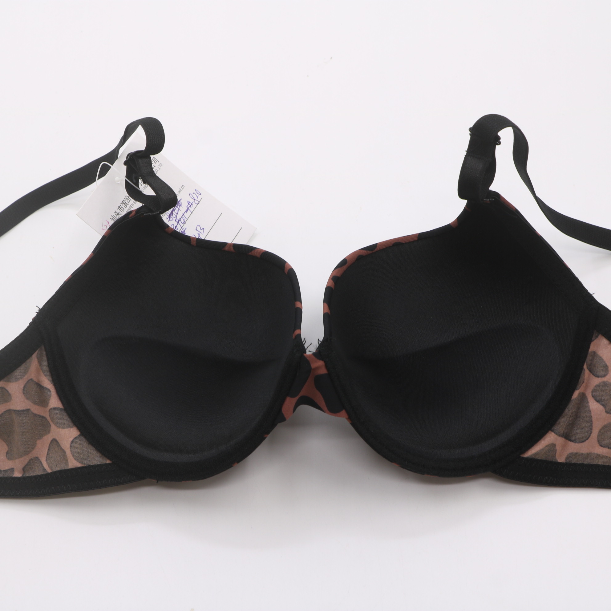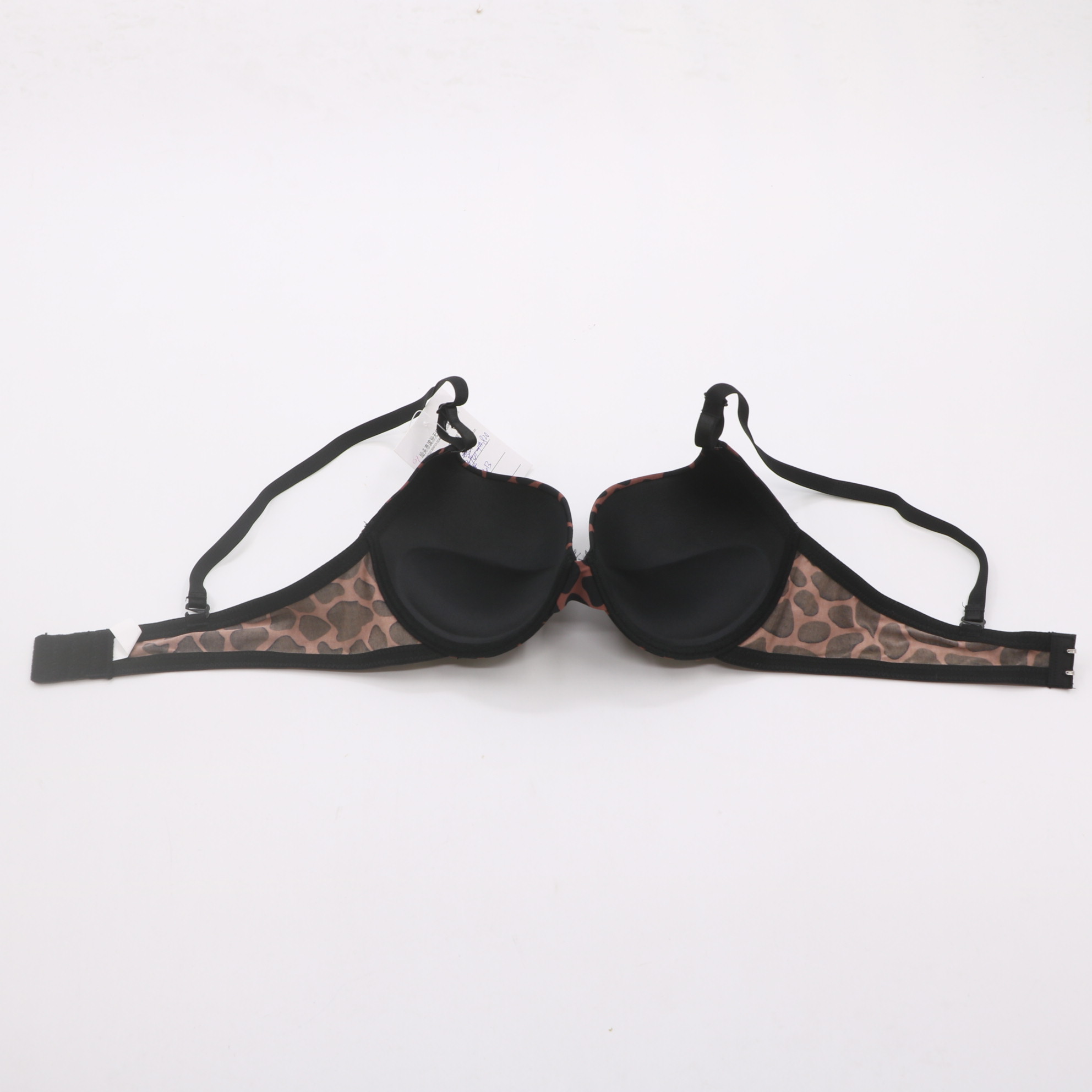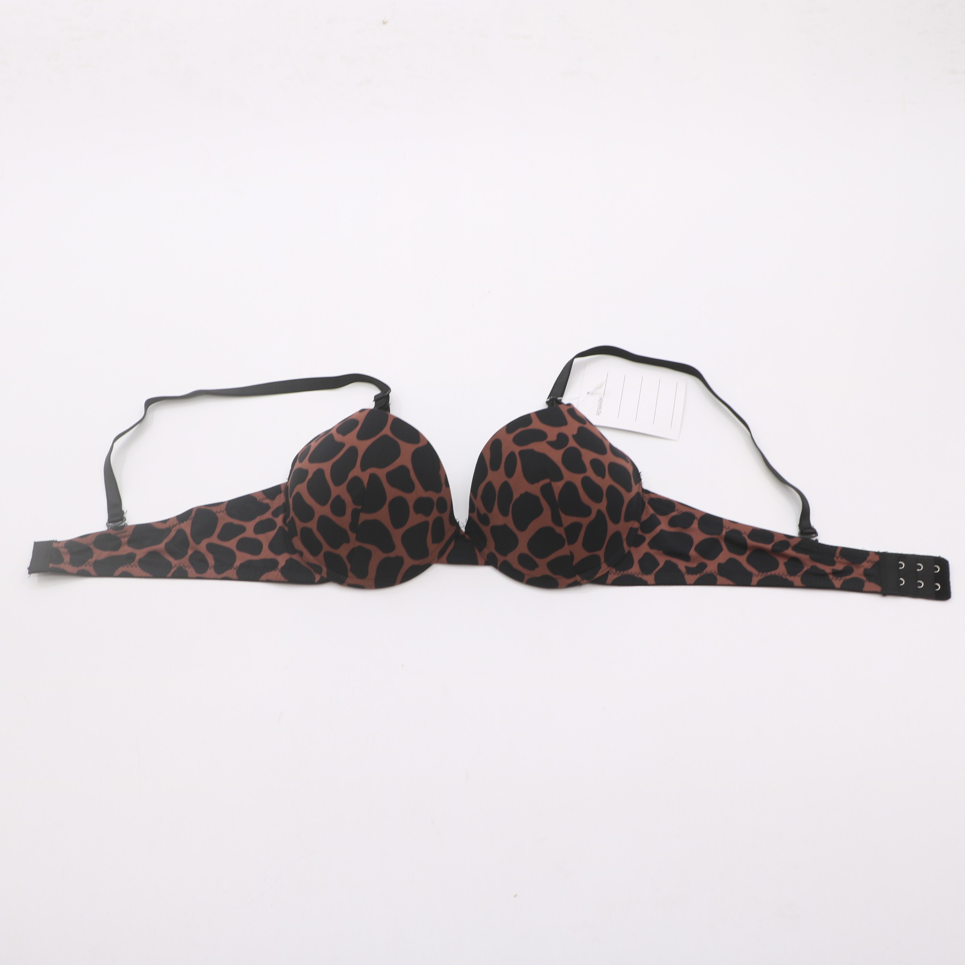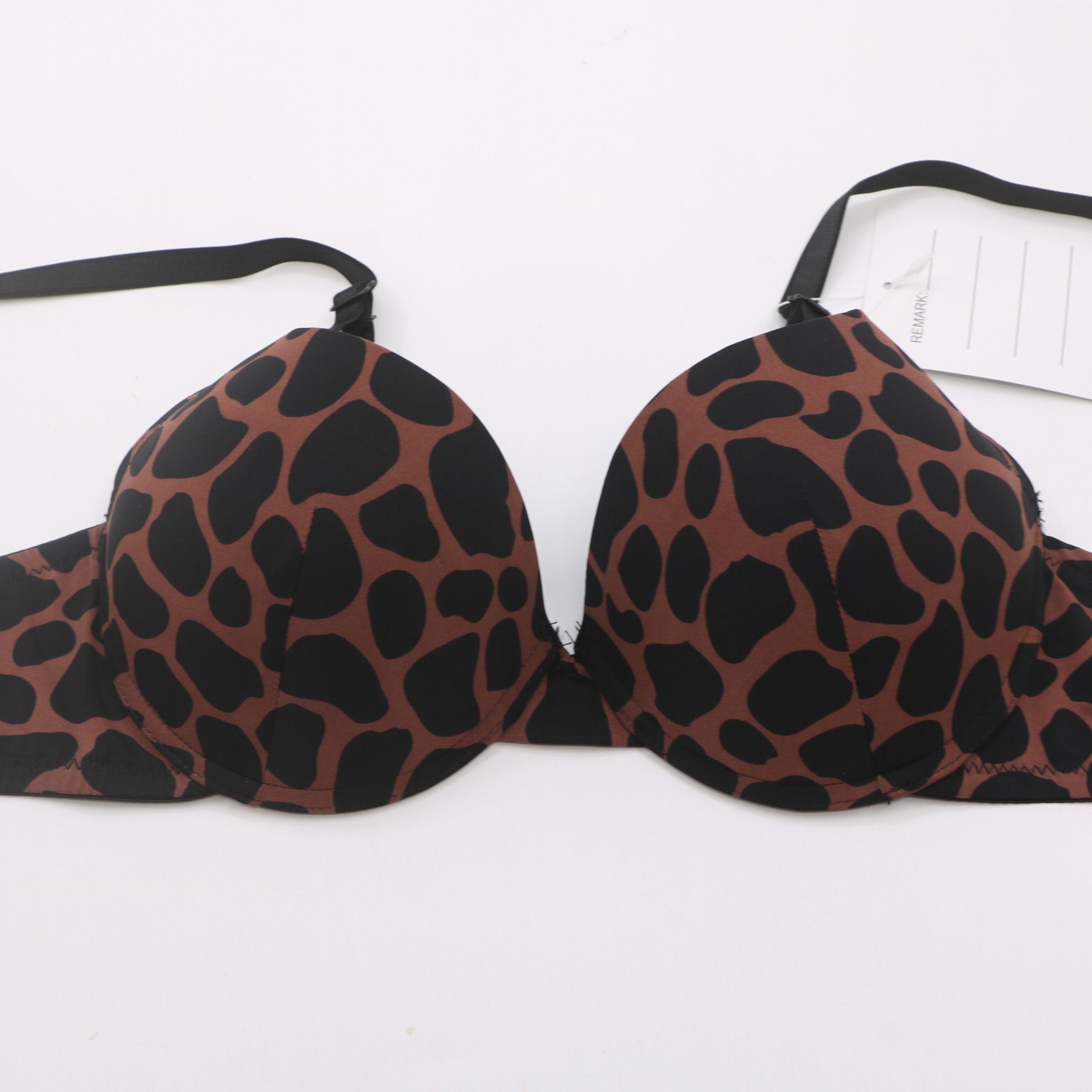 This eye-catching leopard print push-up bra features molded cups for a flattering, natural lift, with a bold brown and black animal print pattern that adds a fierce, stylish touch. The adjustable black straps and 2-row back closure ensure a secure, personalized fit, while the smooth, stretchy fabric offers all-day comfort. Perfect for adding a wild twist to your lingerie collection, it combines support with a striking, modern design.