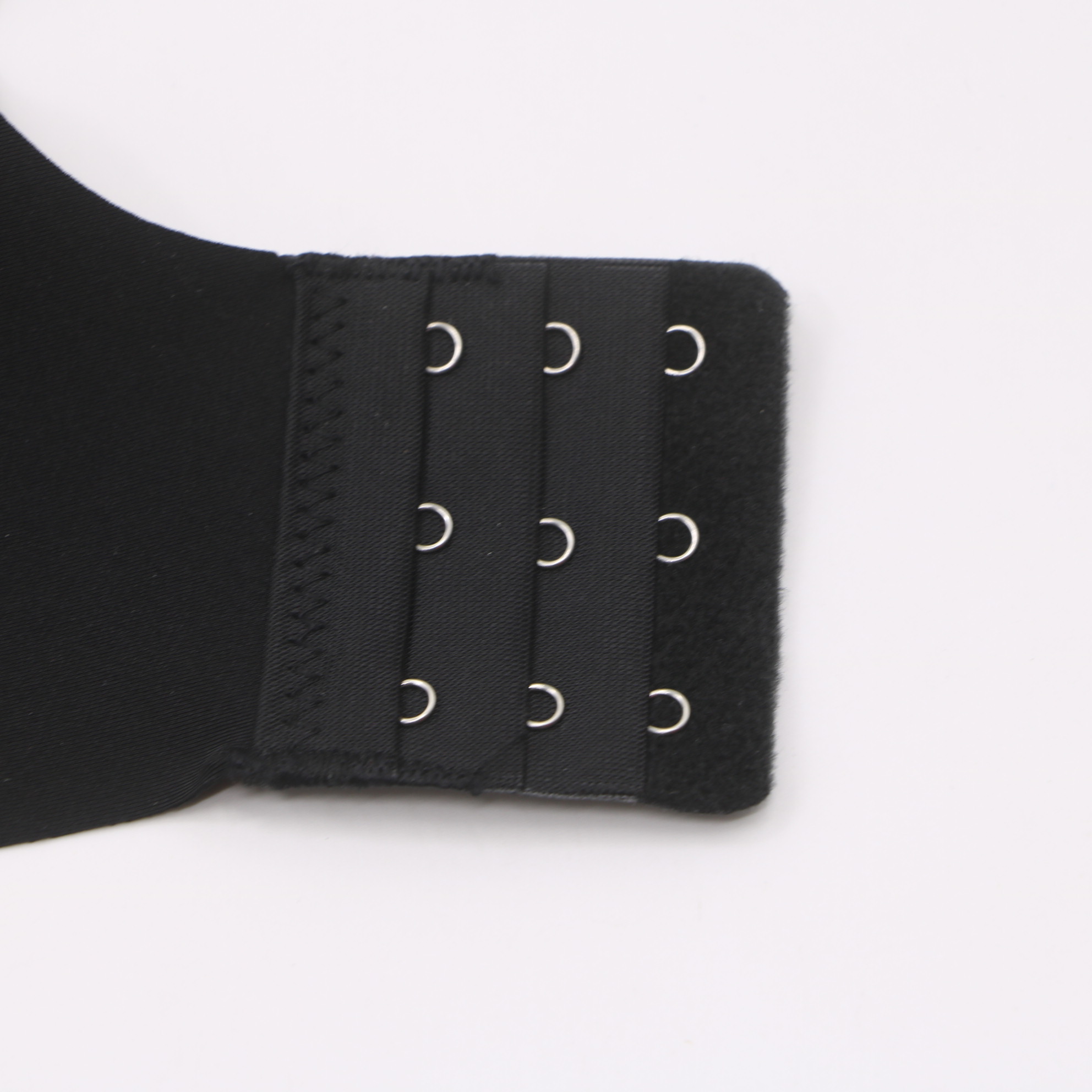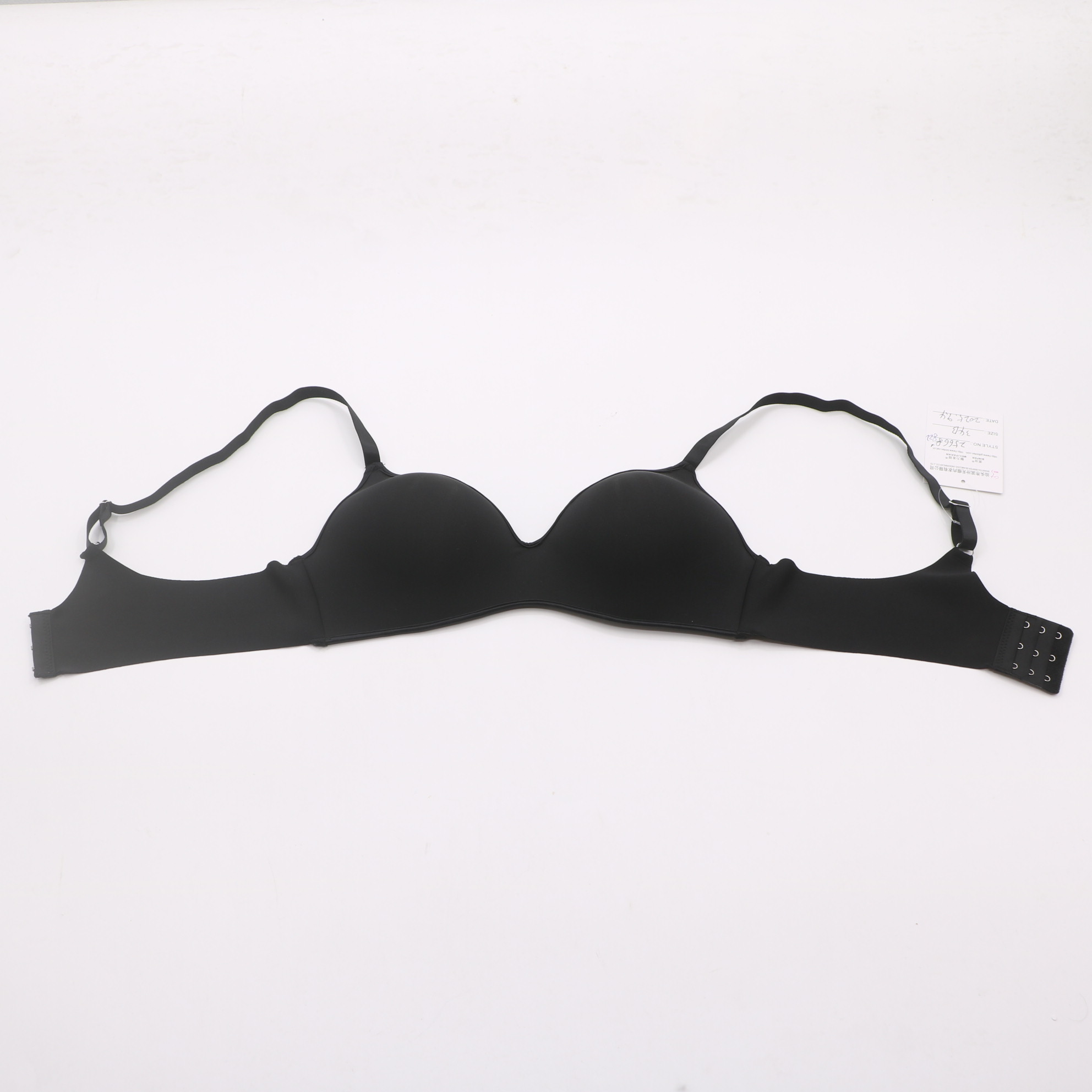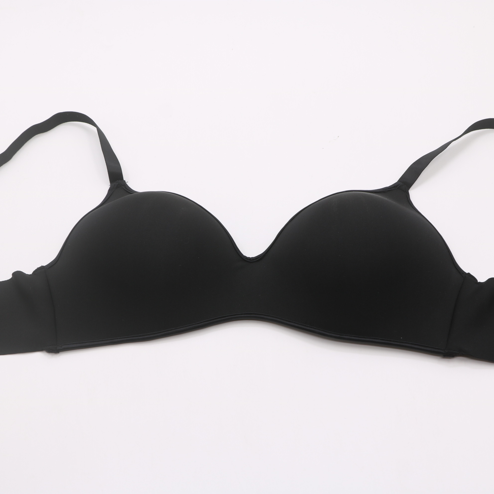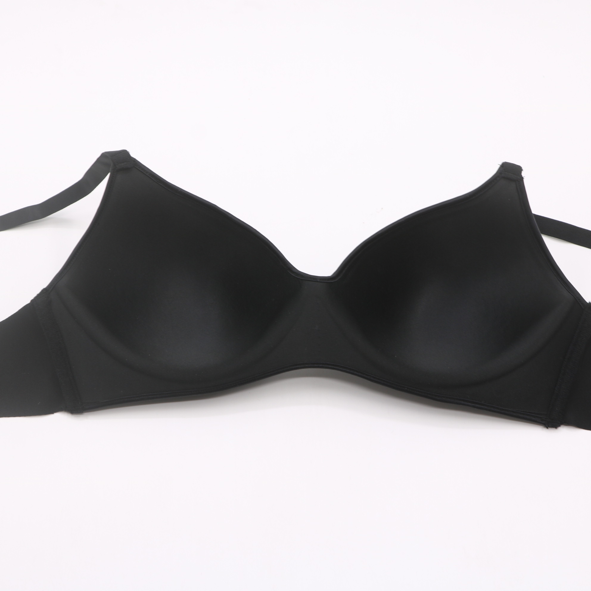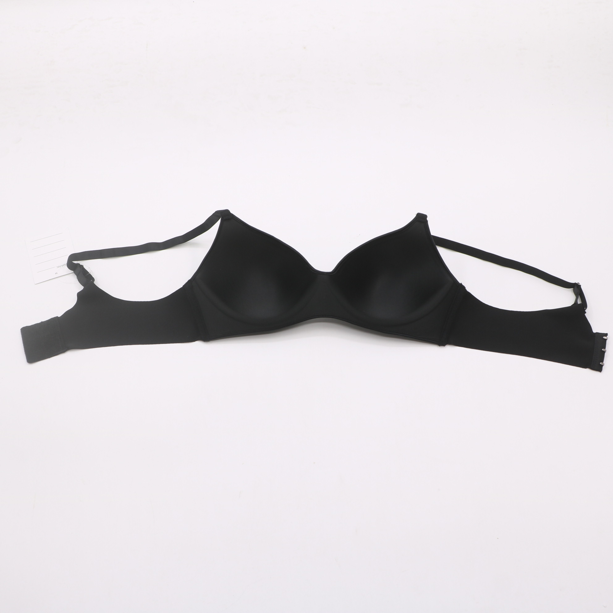 This seamless black t-shirt bra features molded cups for a smooth, invisible fit under clothing. The wireless design and soft stretch fabric ensure all-day comfort, while adjustable straps and a 3-row hook-and-eye closure provide a secure, personalized fit.