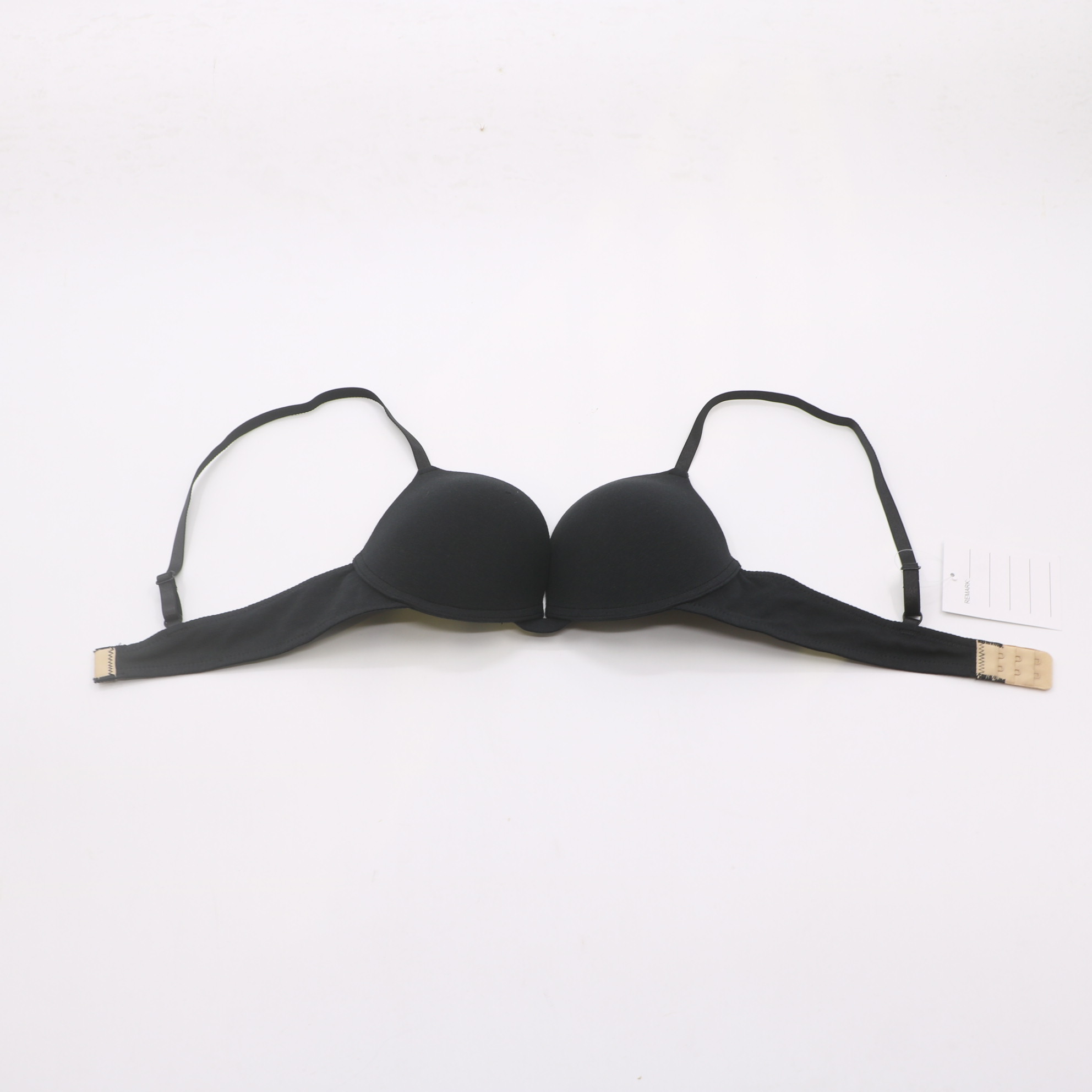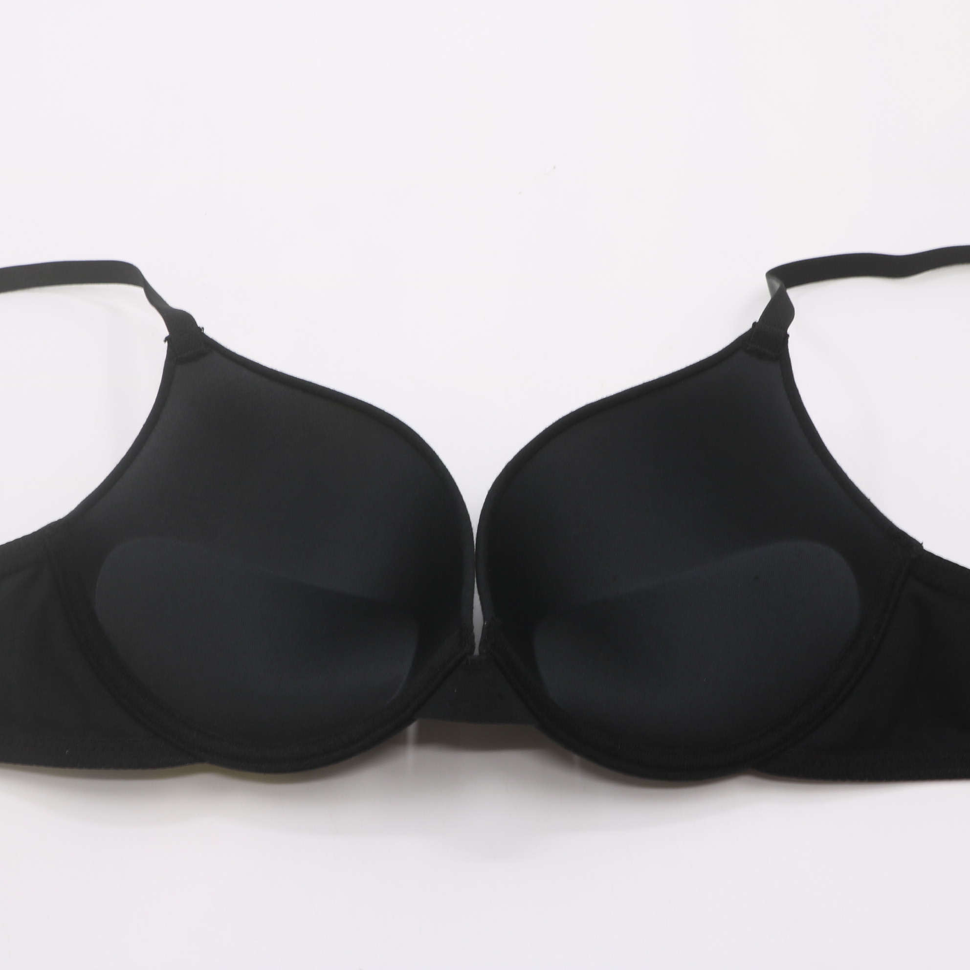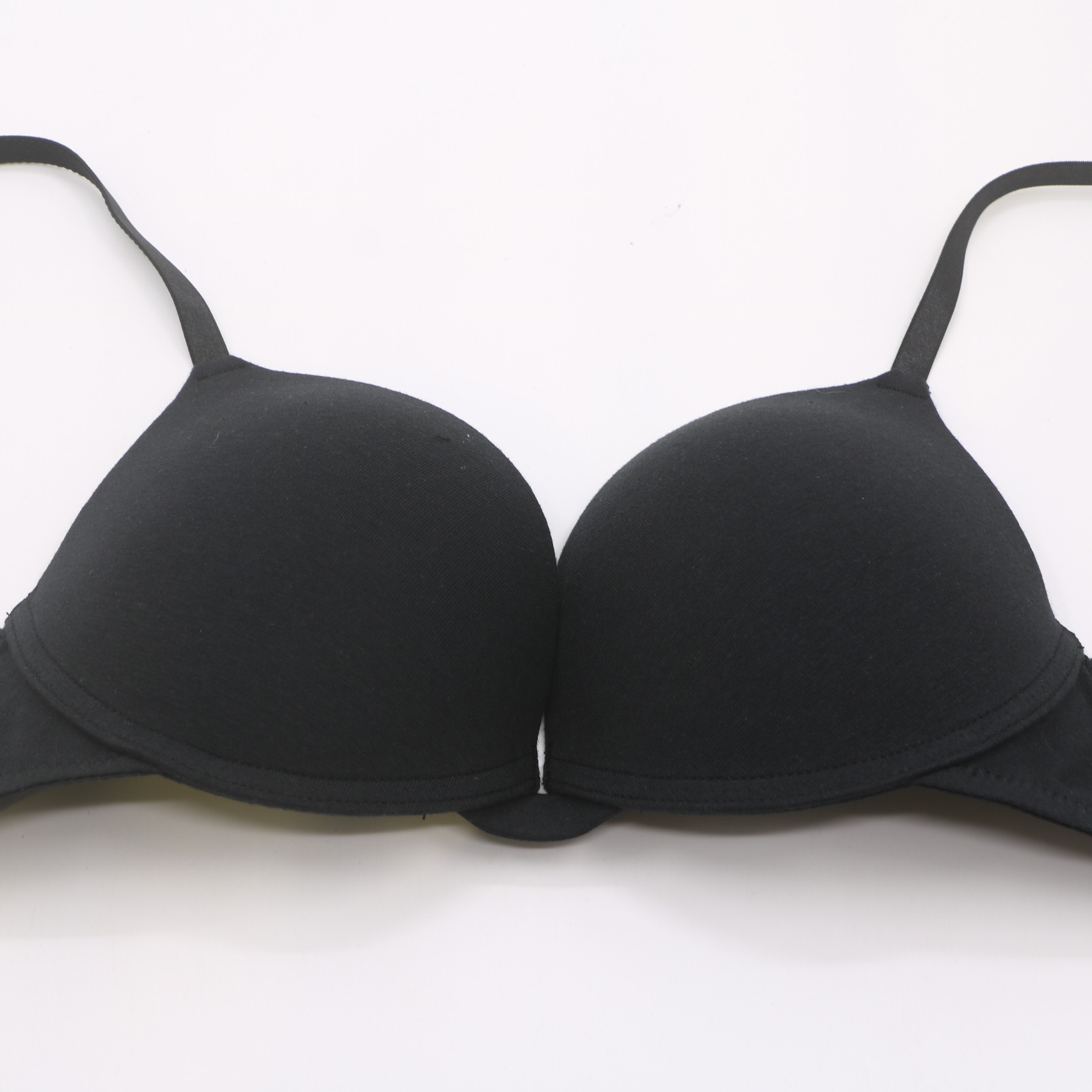 This sleek black push-up bra features molded cups for a smooth, flattering silhouette. The adjustable straps and 2-row beige hook-and-eye closure ensure a secure, personalized fit, while the soft fabric offers all-day comfort under any outfit.