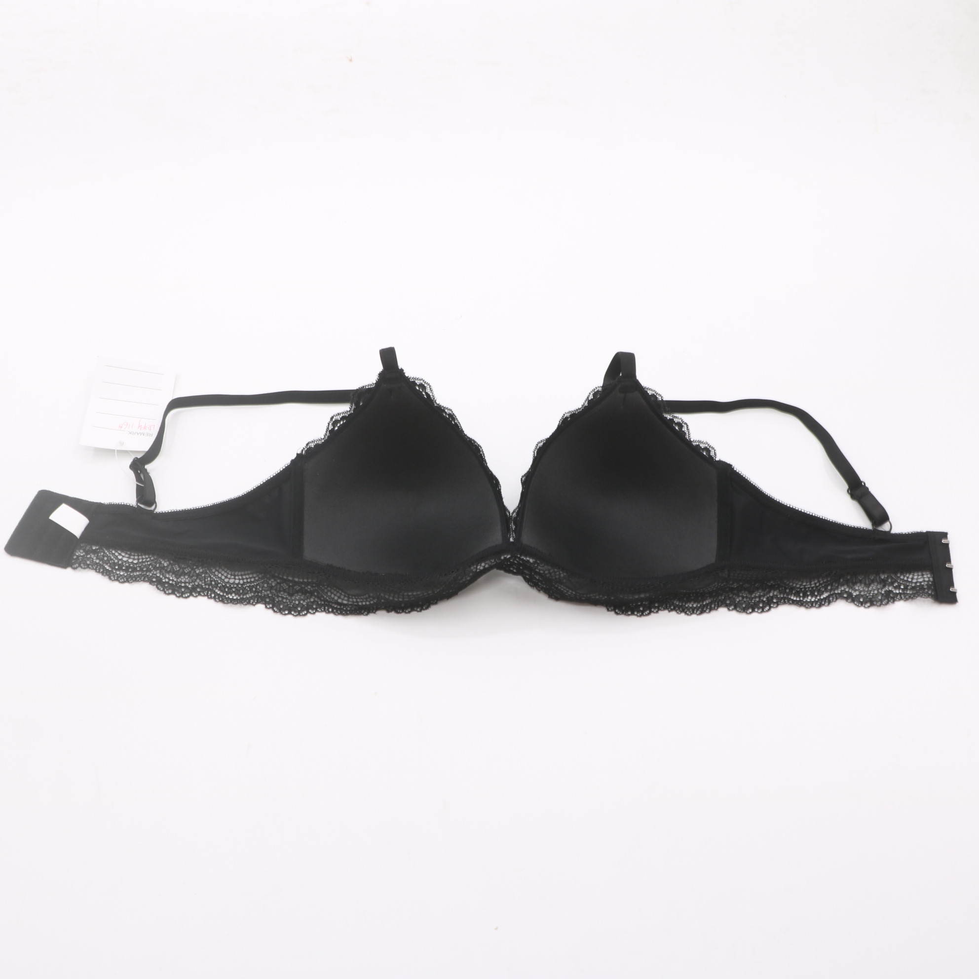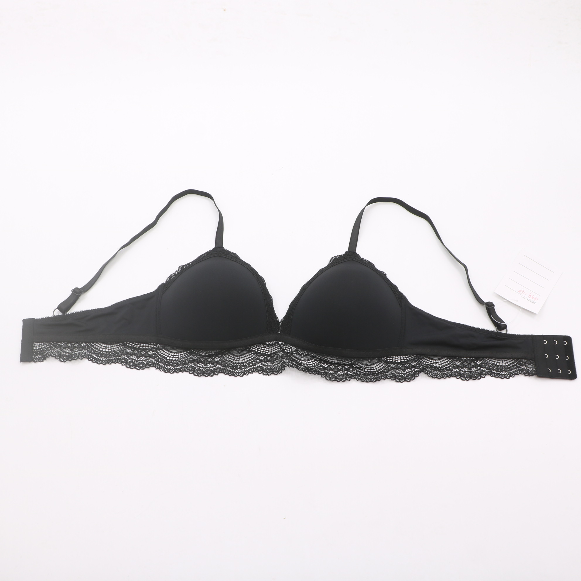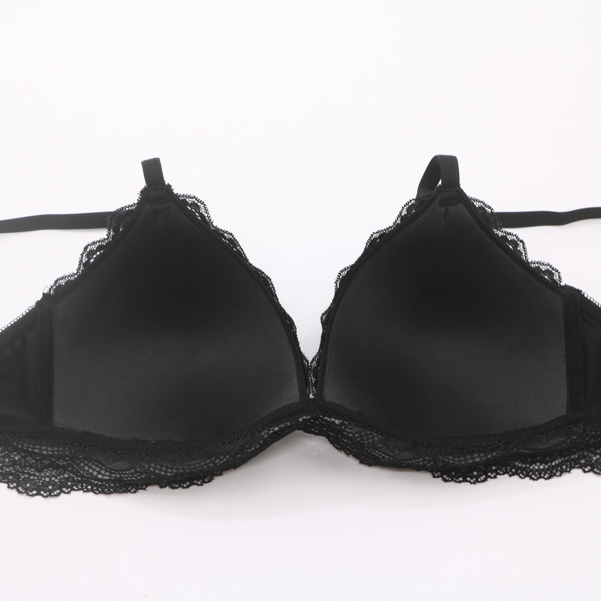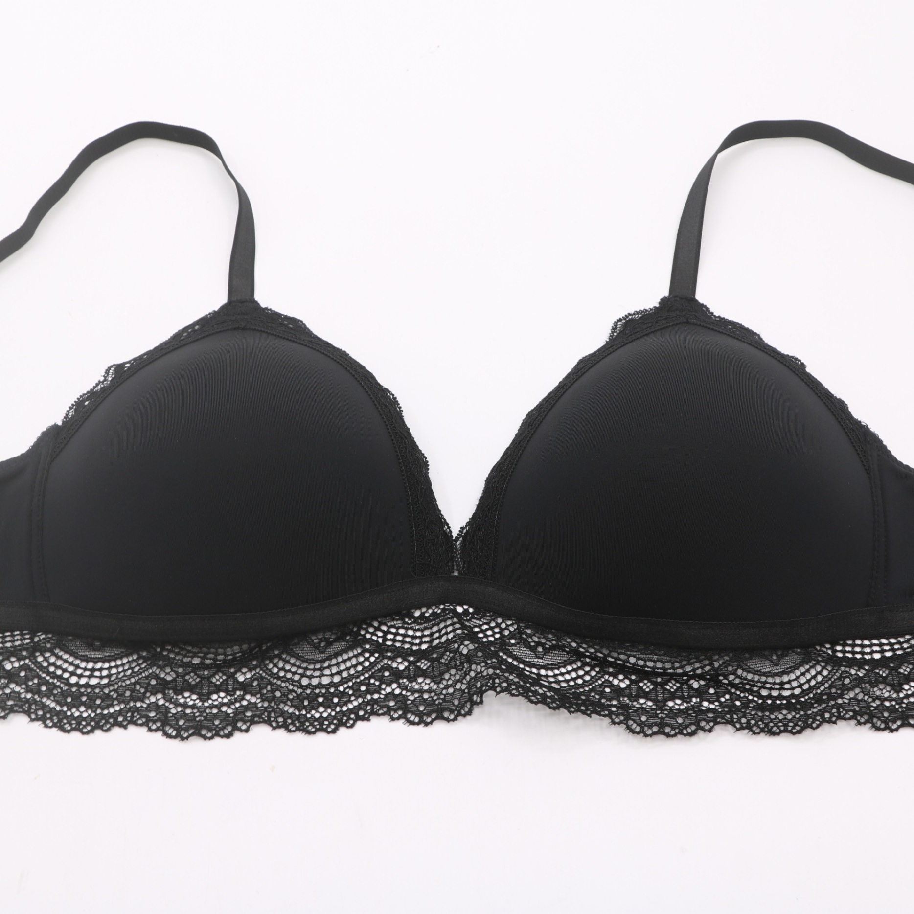 Soft wireless plunge bra with intricate lace detailing, molded cups for natural shape, and adjustable straps. Designed for all-day comfort and a seamless silhouette under any outfit.