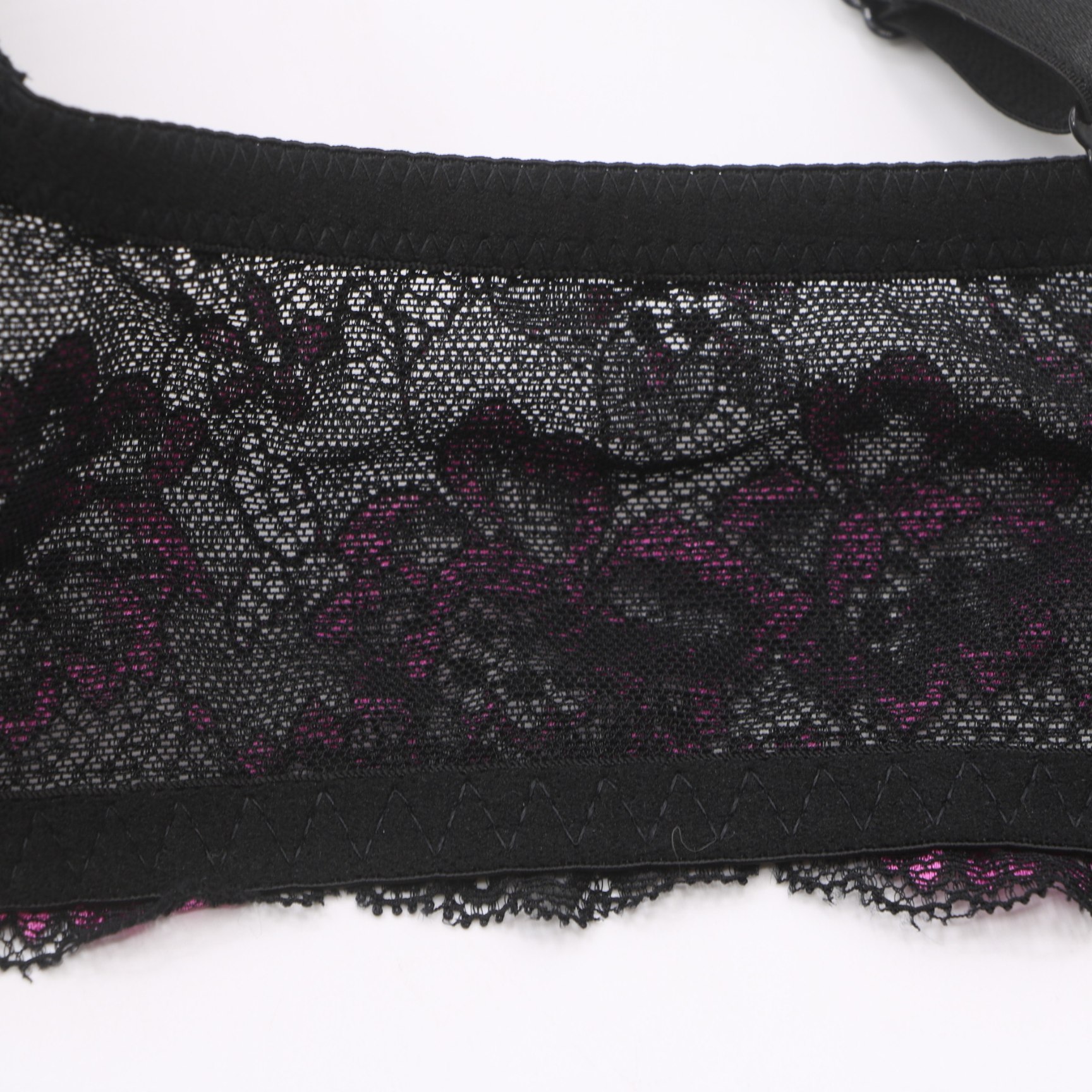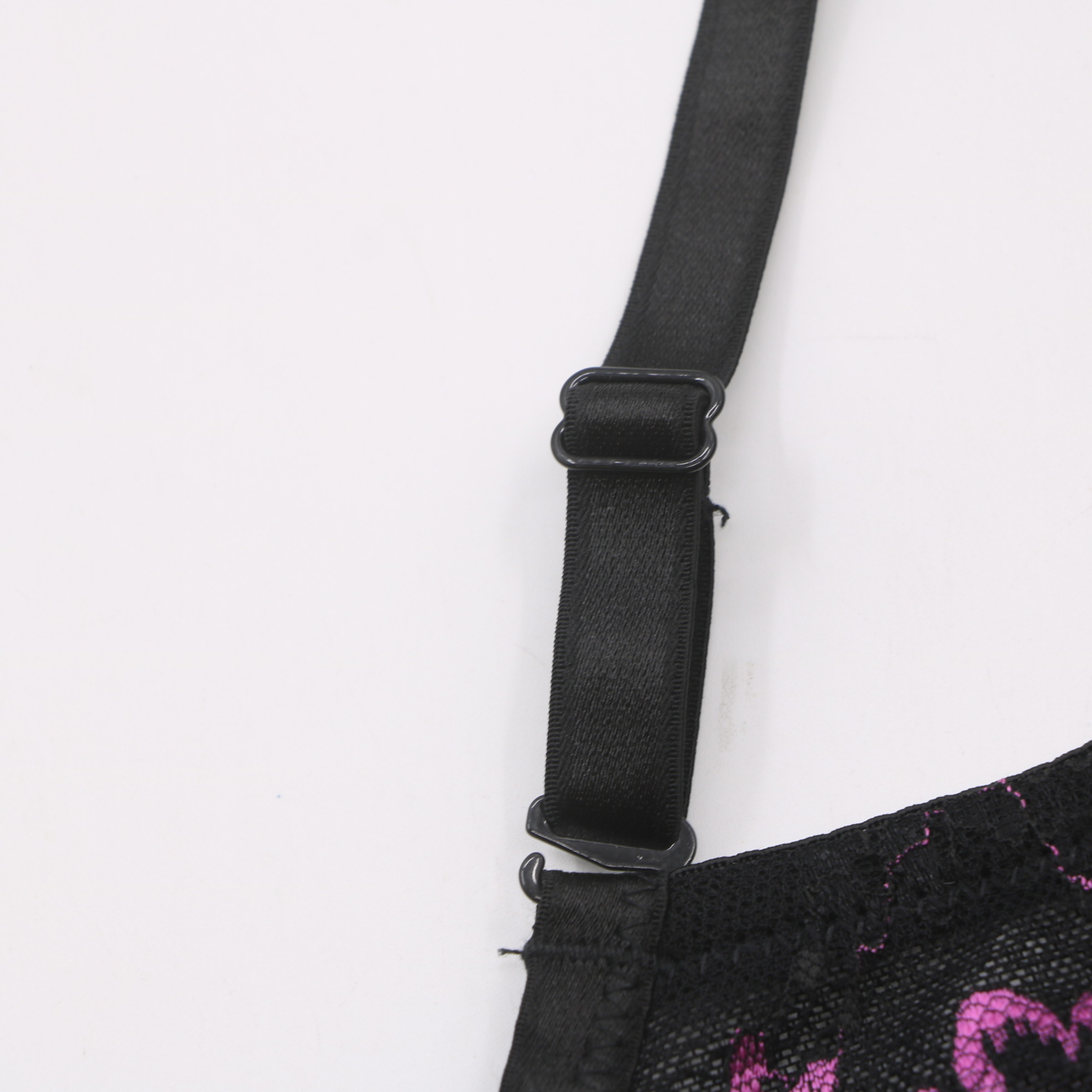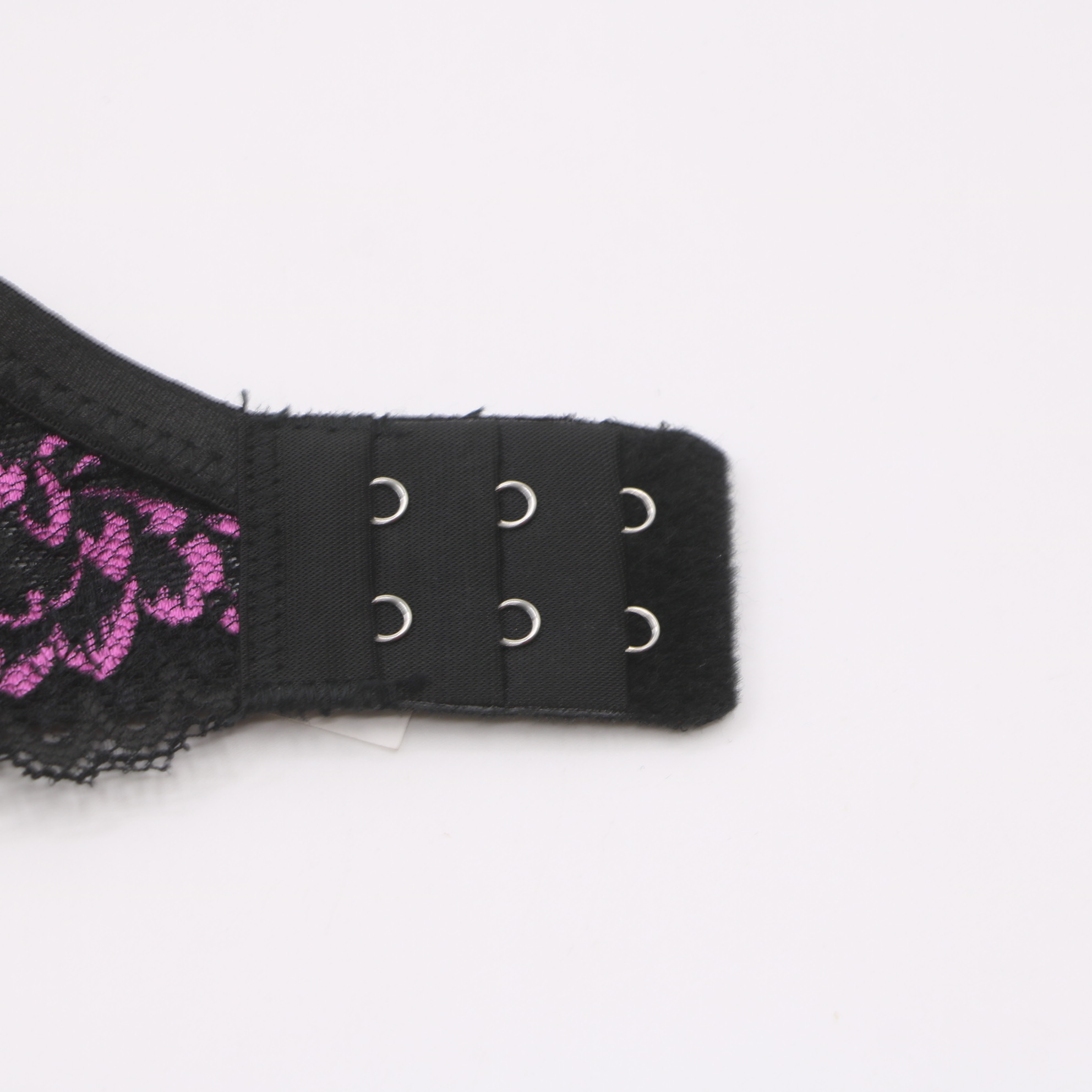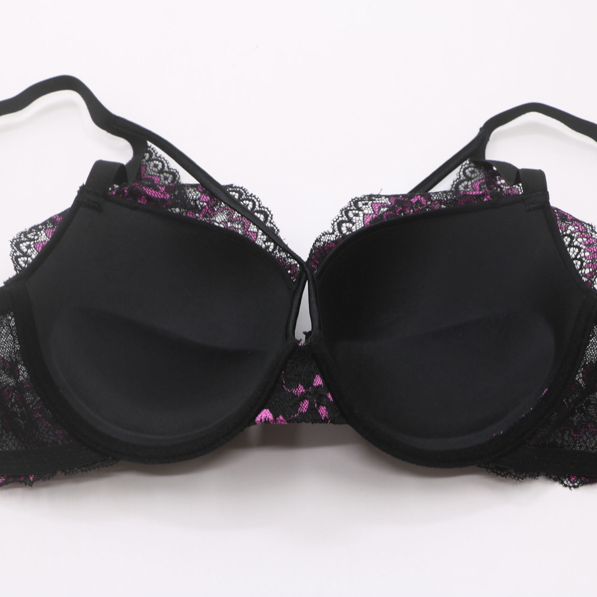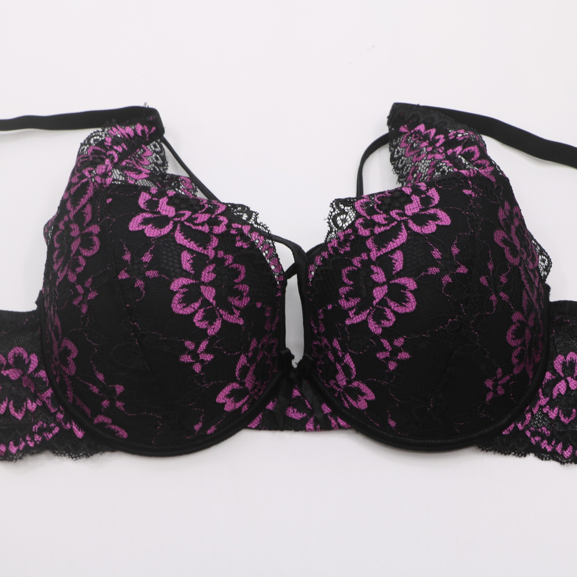 Bold push-up bra with a striking black base and vibrant pink floral lace overlay, adjustable straps, and a 3-row hook-and-eye closure for a secure, flattering fit.