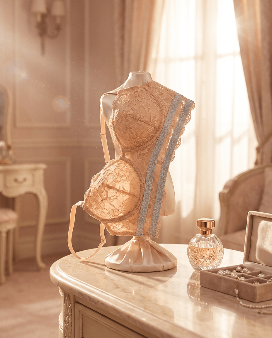 Add a touch of stardust to your lingerie drawer. The GlimmerLuxe™ 912 series reimagines the classic longline bra with an edgy, glamorous twist. Featuring dual silver glitter bands and delicate apricot lace, this bra is designed for the woman who loves to shine without sacrificing a secure, sculpted fit.