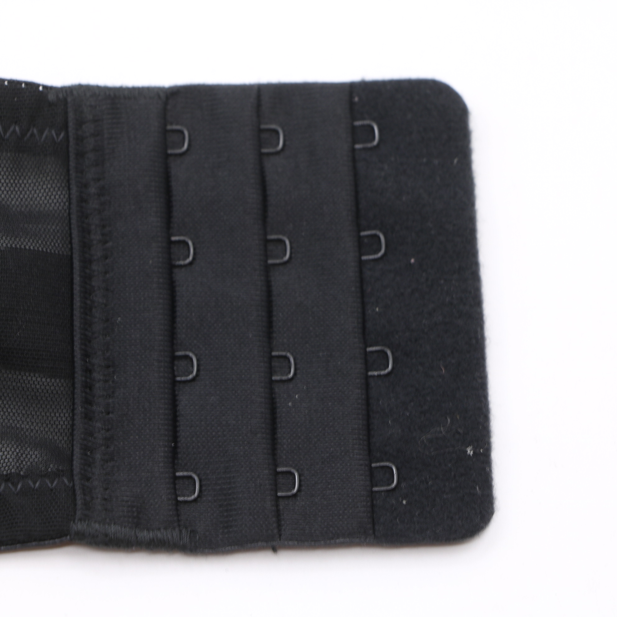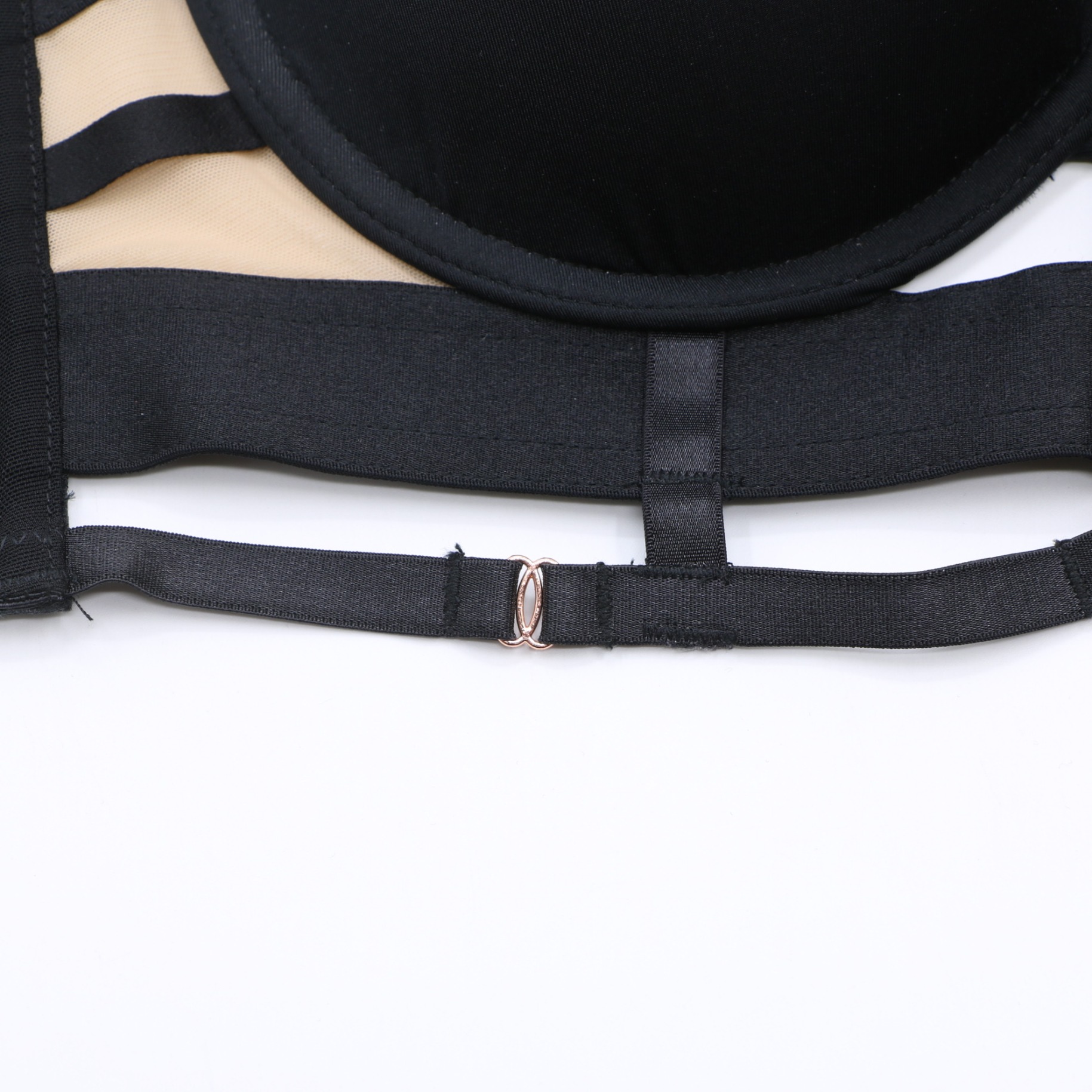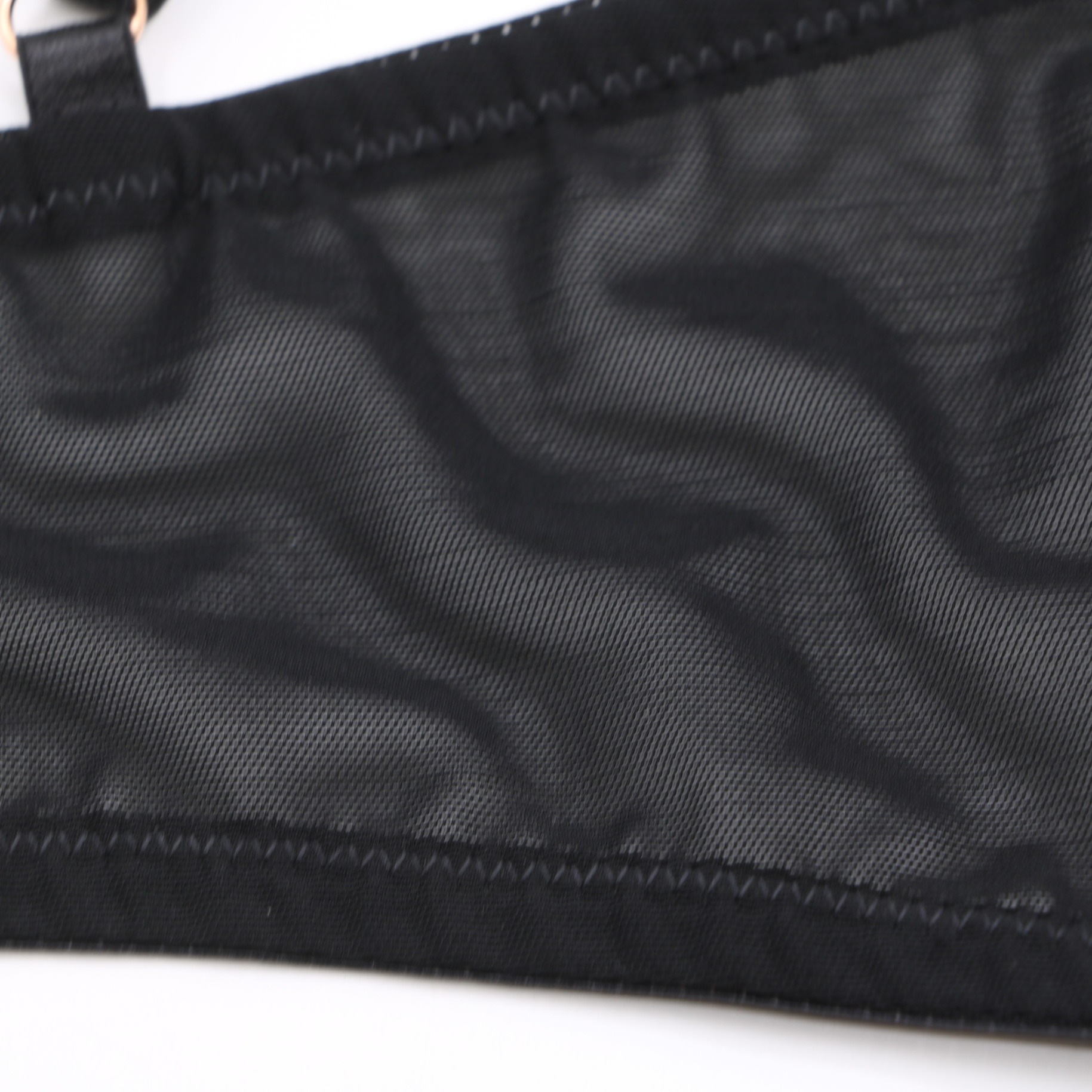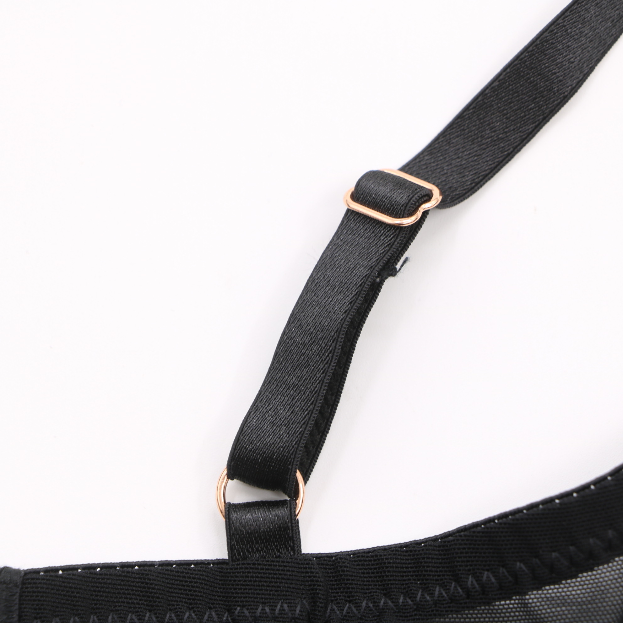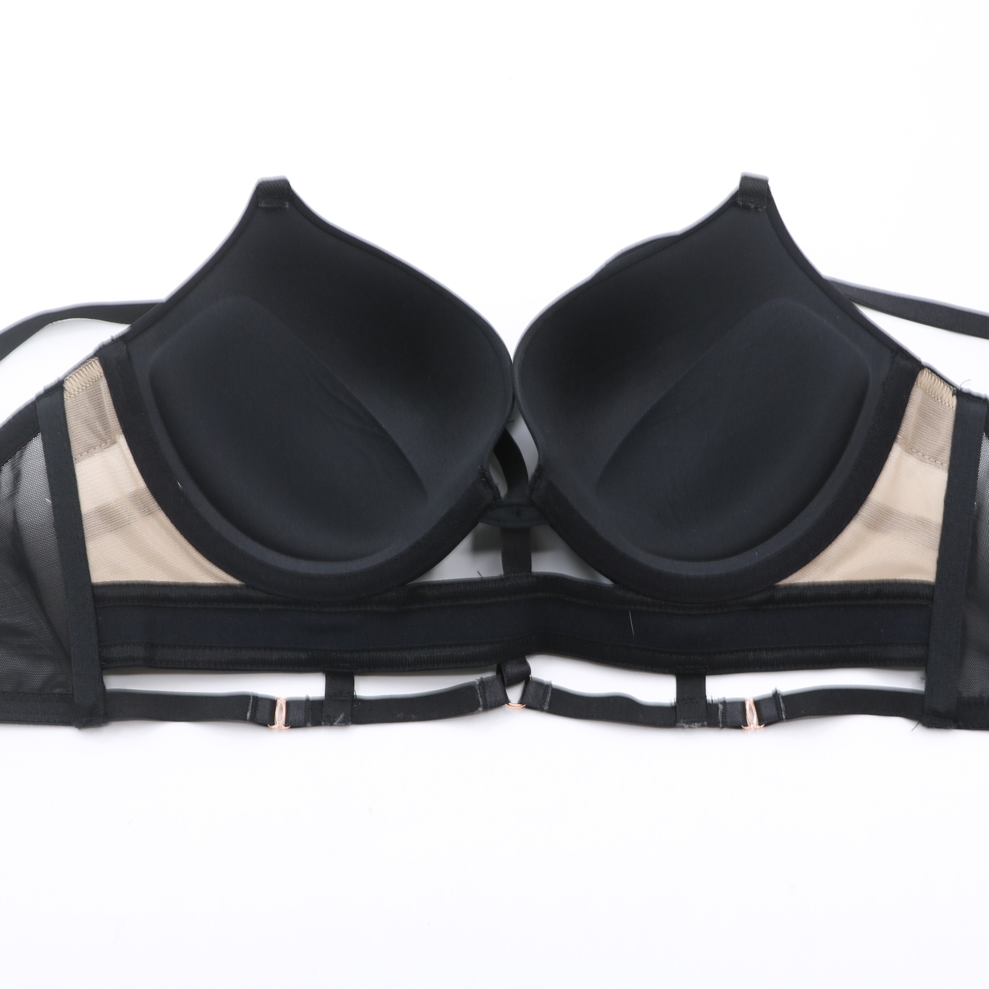 This black plunge bra features sheer mesh panels, strappy front details, and rose gold hardware accents. It has molded cups, adjustable straps, and a multi-row hook-and-eye closure for a secure fit, perfect for a bold, stylish look.
