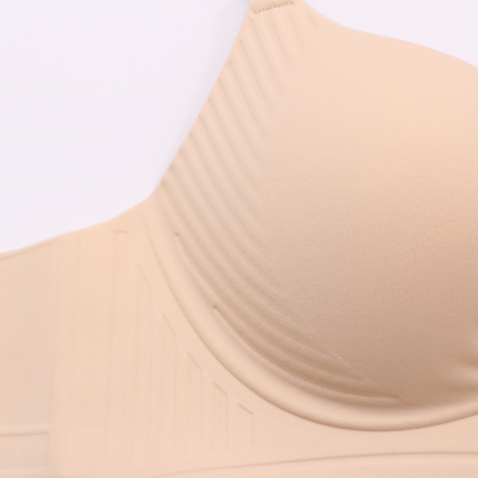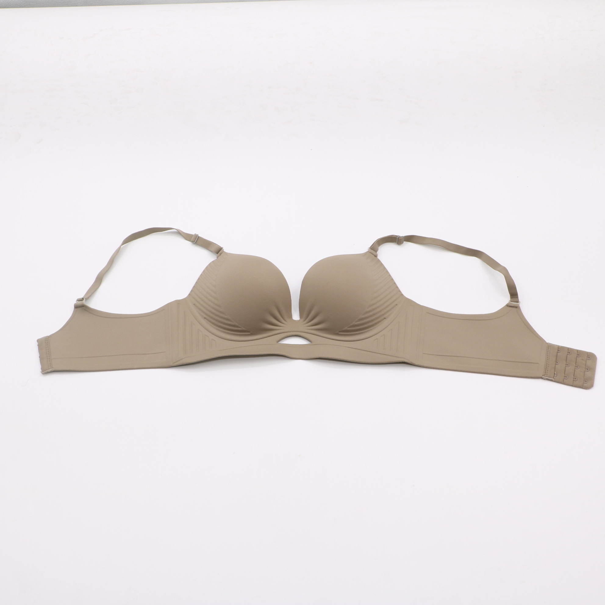 Smooth seamless molded cup bra with a front cutout design, subtle striped texture on cups, and adjustable straps for an invisible, comfortable fit under t-shirts and tight outfits.