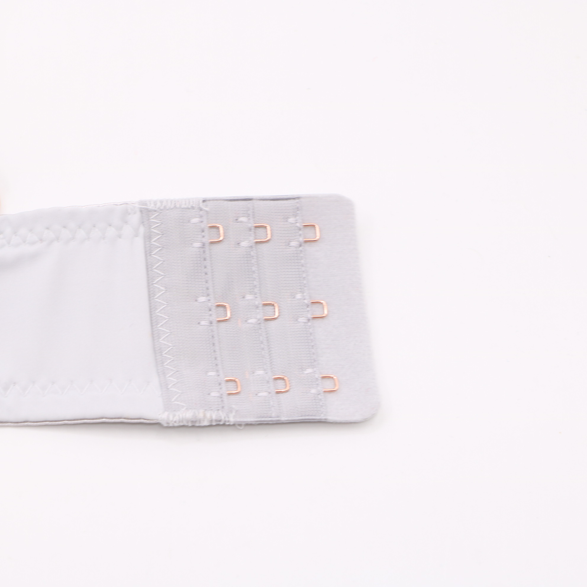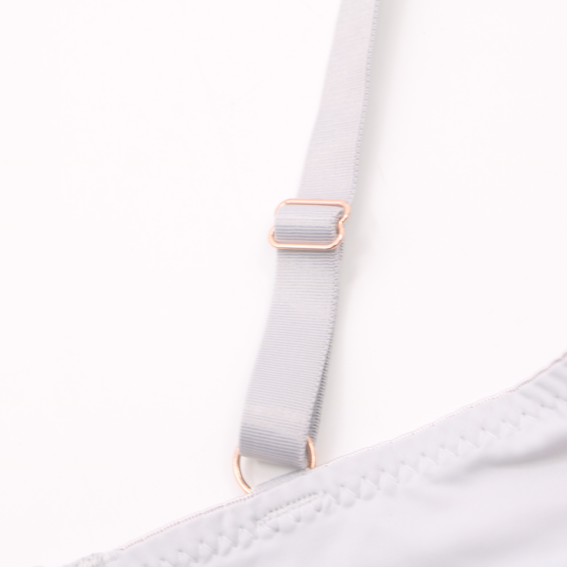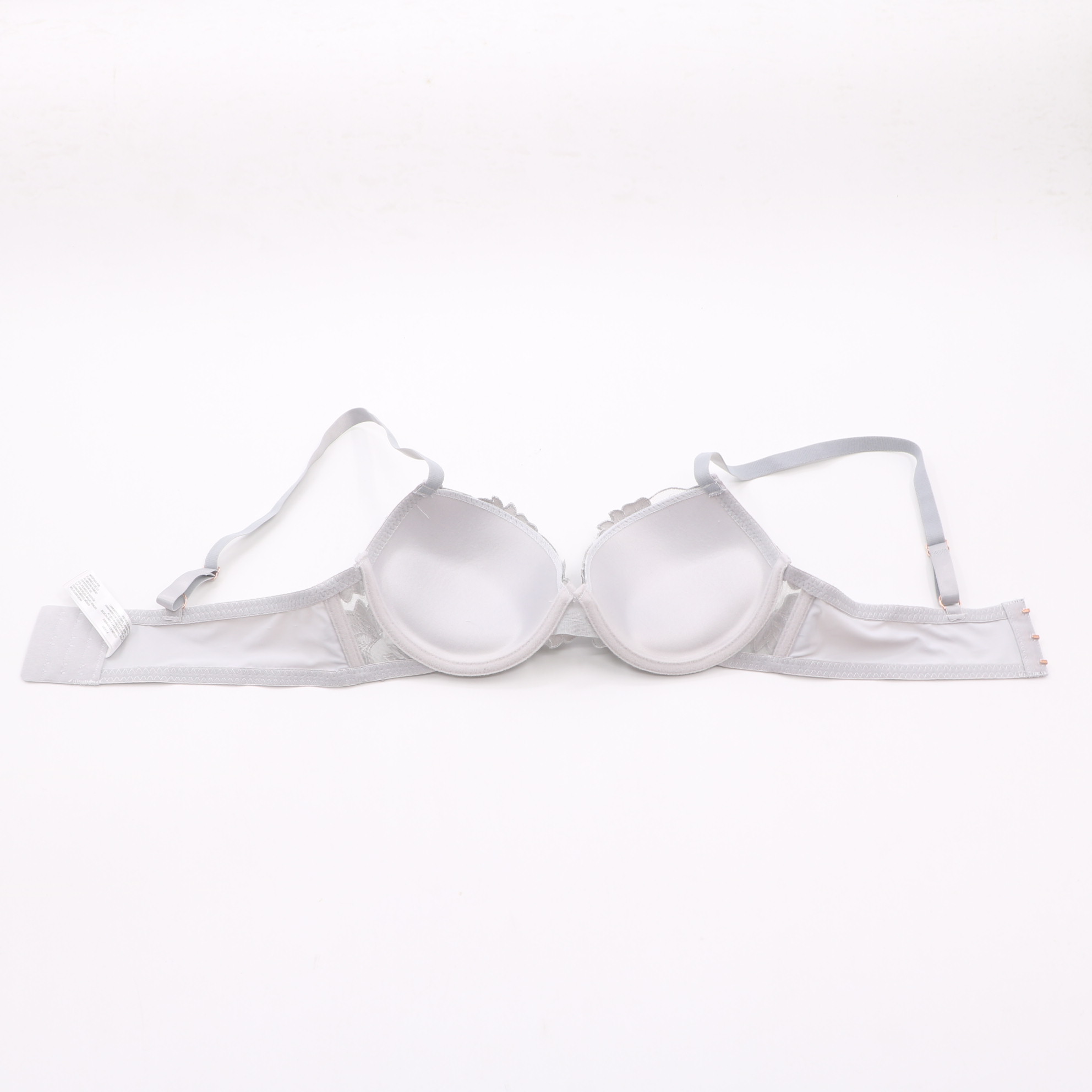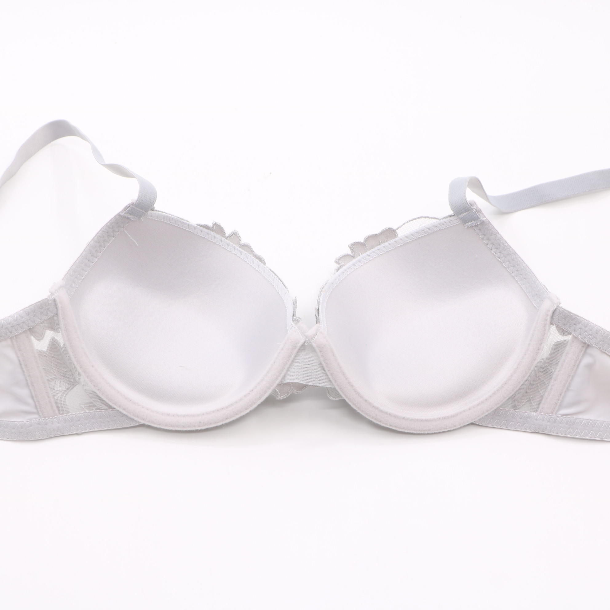 This delicate light grey bra features intricate leaf-shaped embroidery on sheer mesh cups, paired with scalloped lace trim along the sides. The molded cups offer gentle push-up support, while adjustable straps with rose gold hardware and a 3-row hook-and-eye closure ensure a secure, personalized fit.