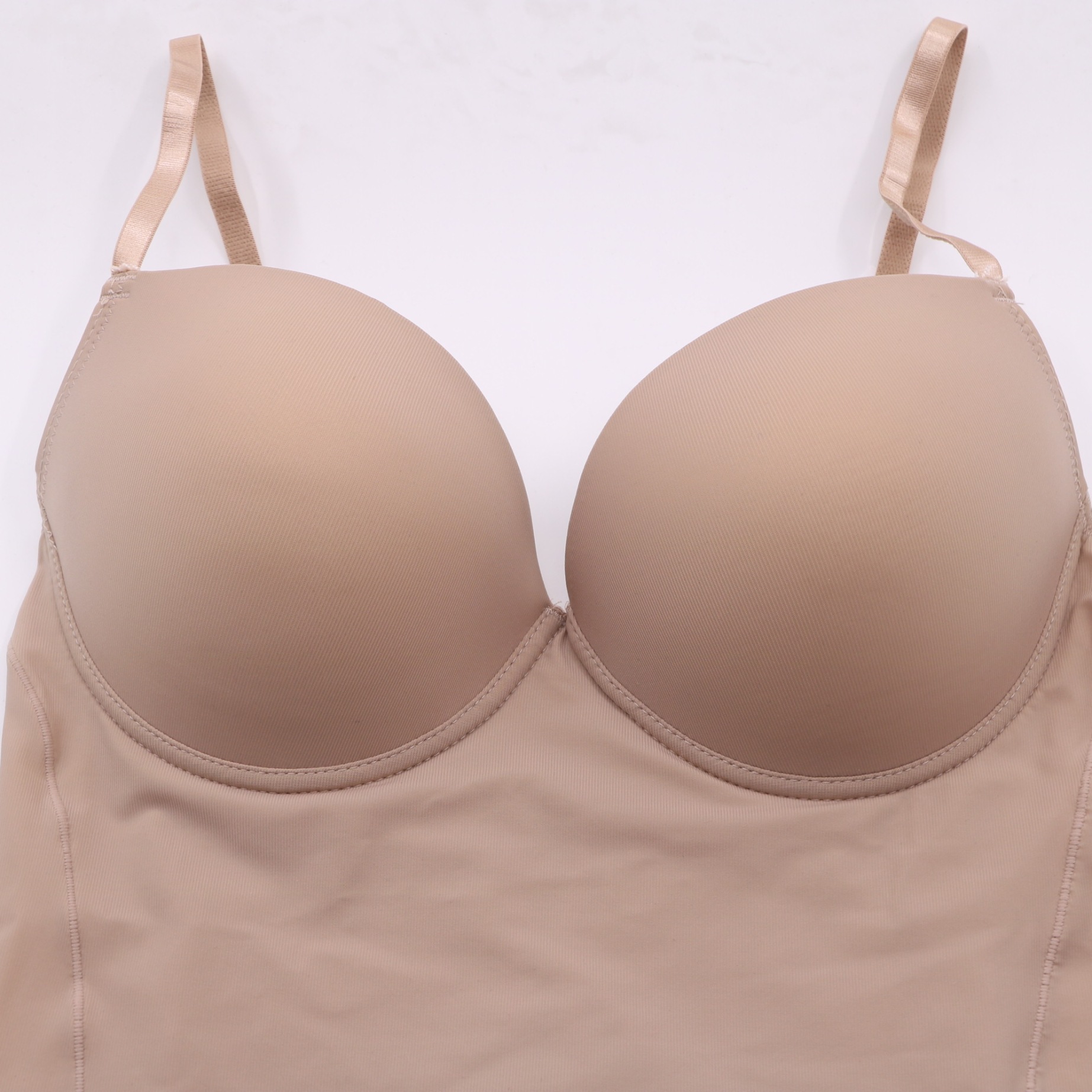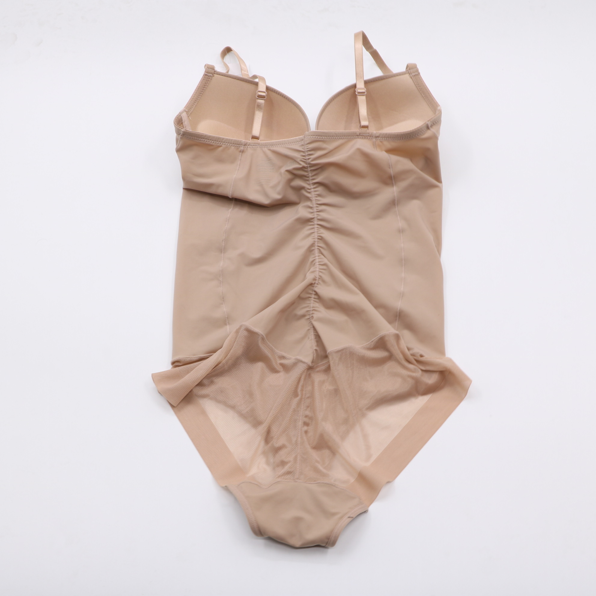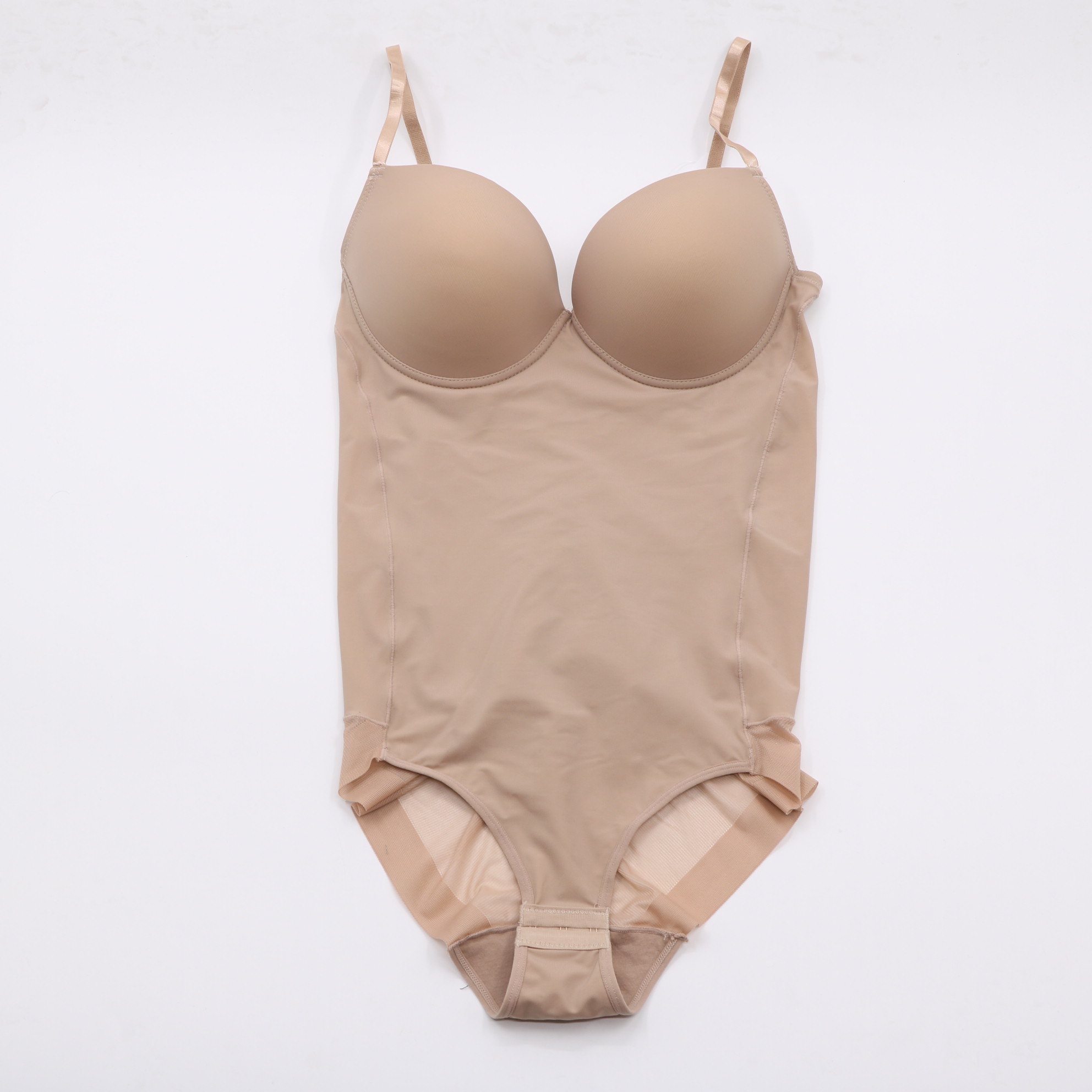 This seamless shaping bodysuit features molded cups for gentle support, adjustable straps, and a hook-and-eye closure at the bottom for a secure fit. The stretchy, breathable fabric contours your body for a smooth, flattering silhouette, ideal for everyday wear.
