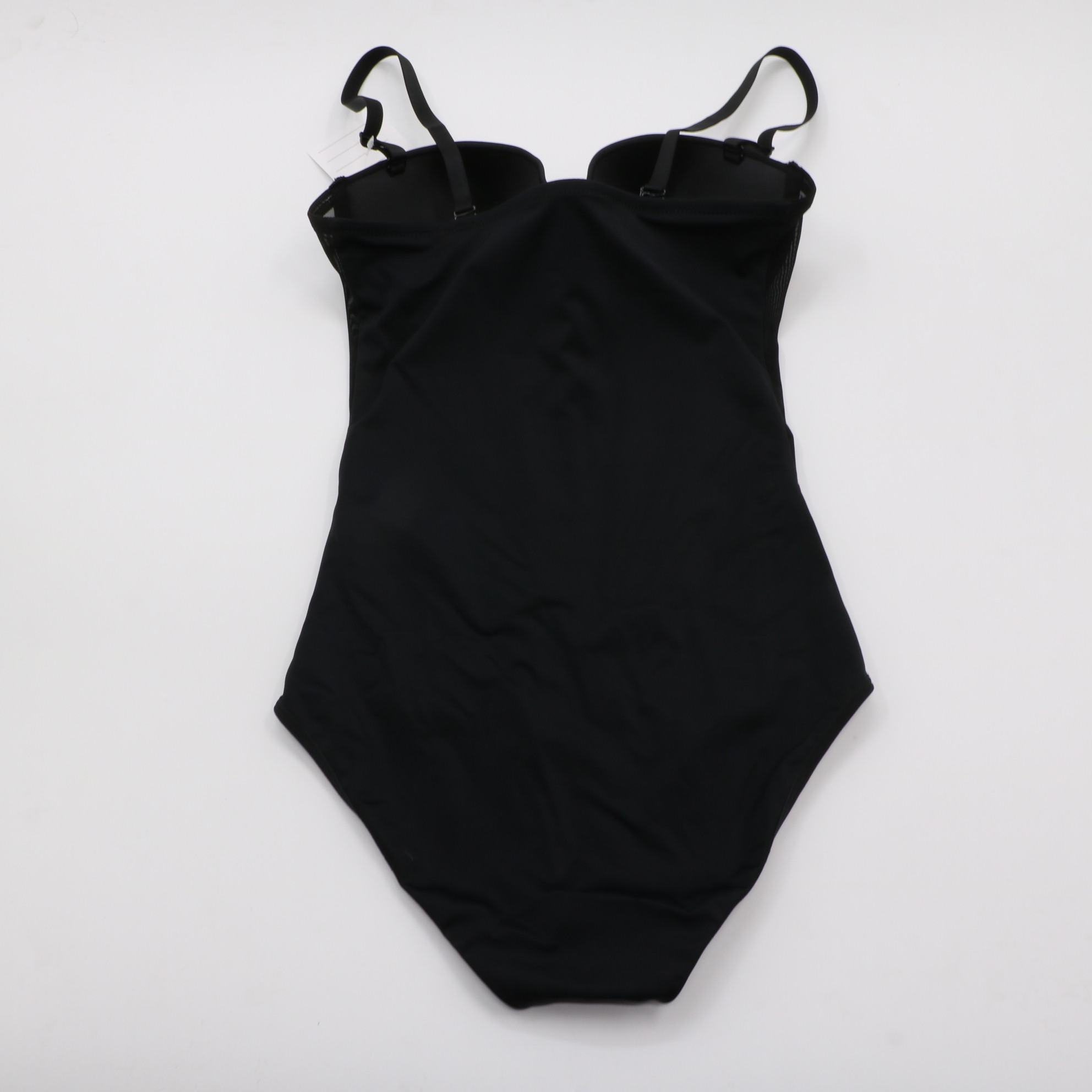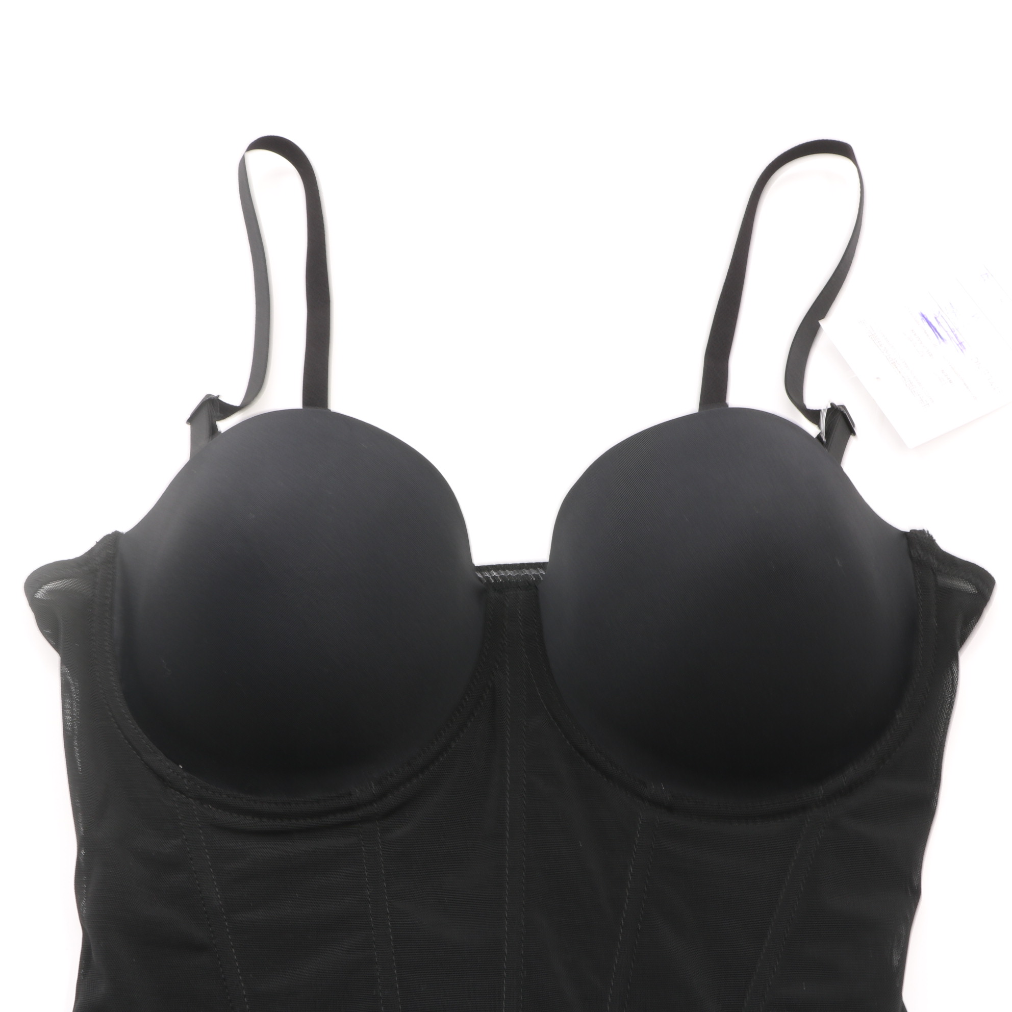 Tummy control bodysuit with built-in bra, adjustable straps and snap closure. Smooths waist, invisible under clothes.
