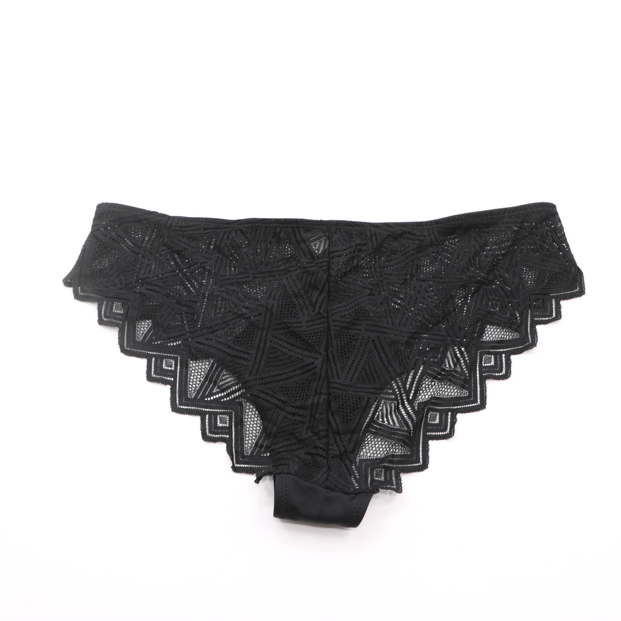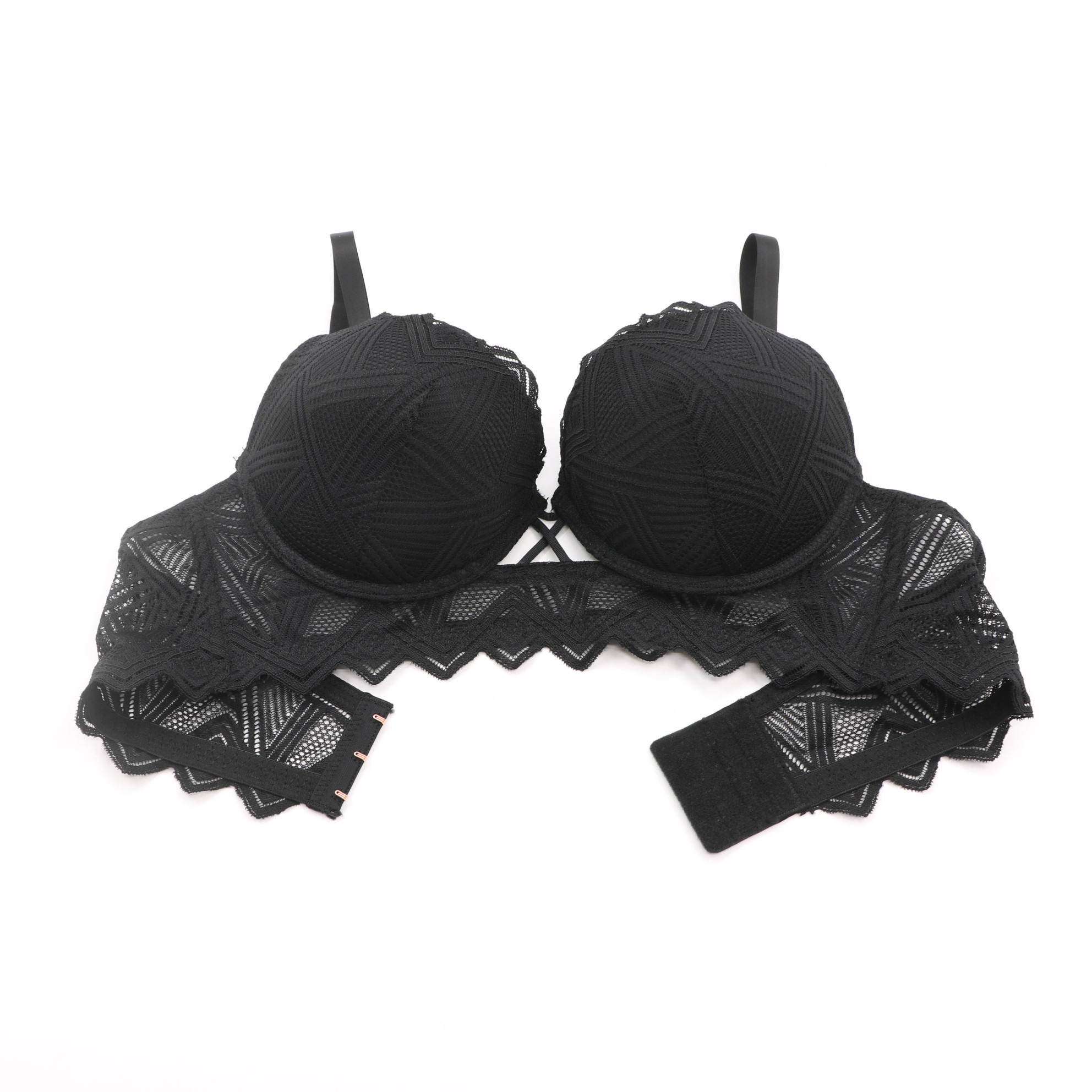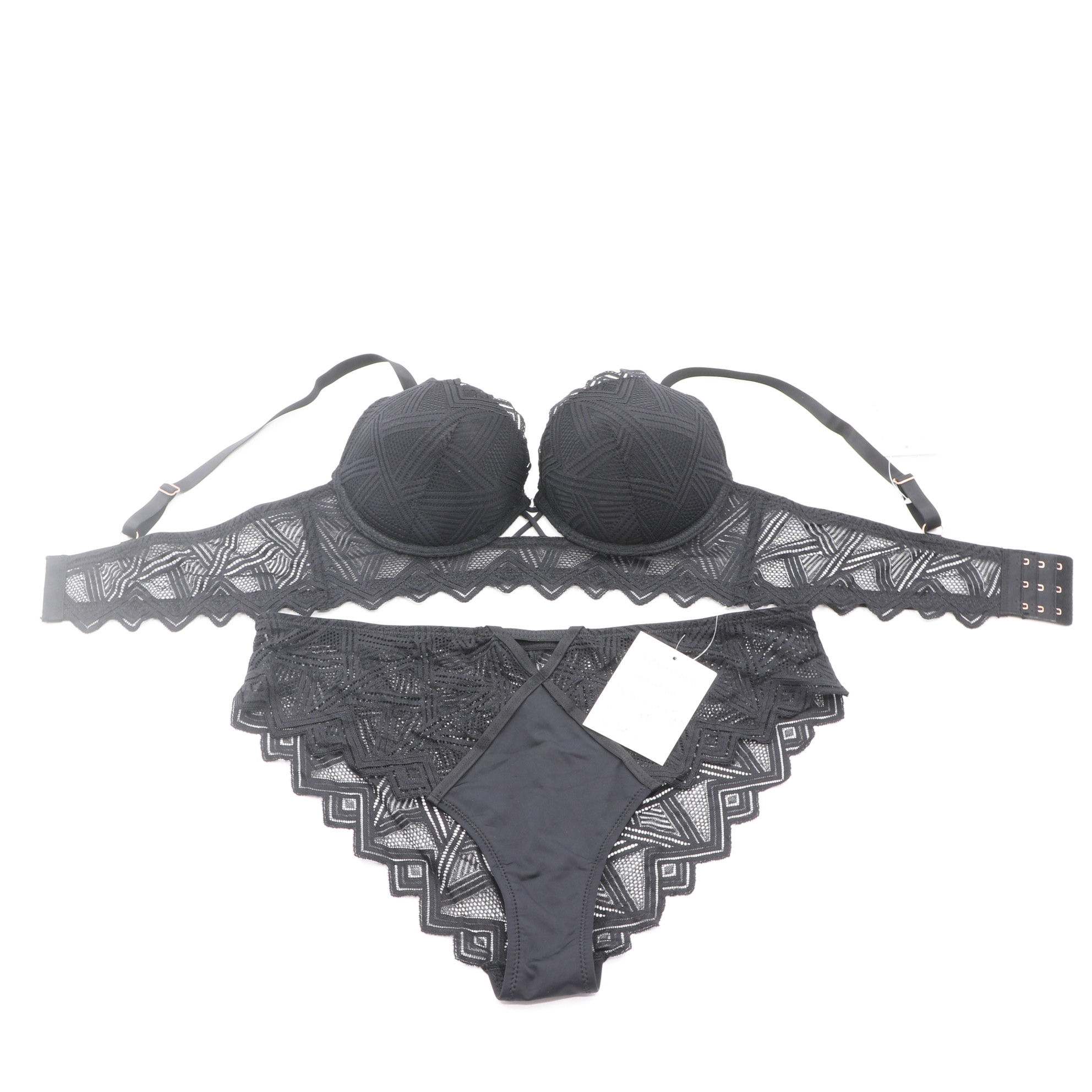 This black lingerie set features intricate geometric lace on both the bra and panty, with a crisscross strap detail at the center of the bra for a modern, edgy look. The molded cups provide a flattering lift, while the adjustable straps with rose gold hardware and 3-row back closure ensure a secure, personalized fit. The matching panty mirrors the geometric lace design with a scalloped hem, creating a cohesive and alluring set perfect for special occasions.