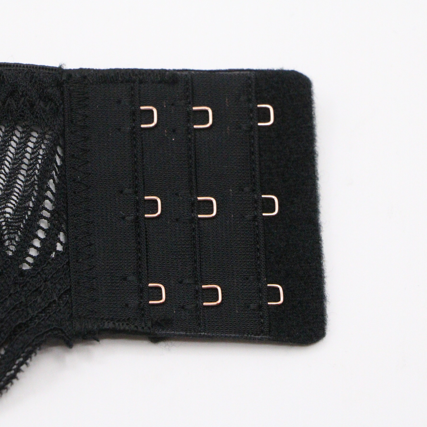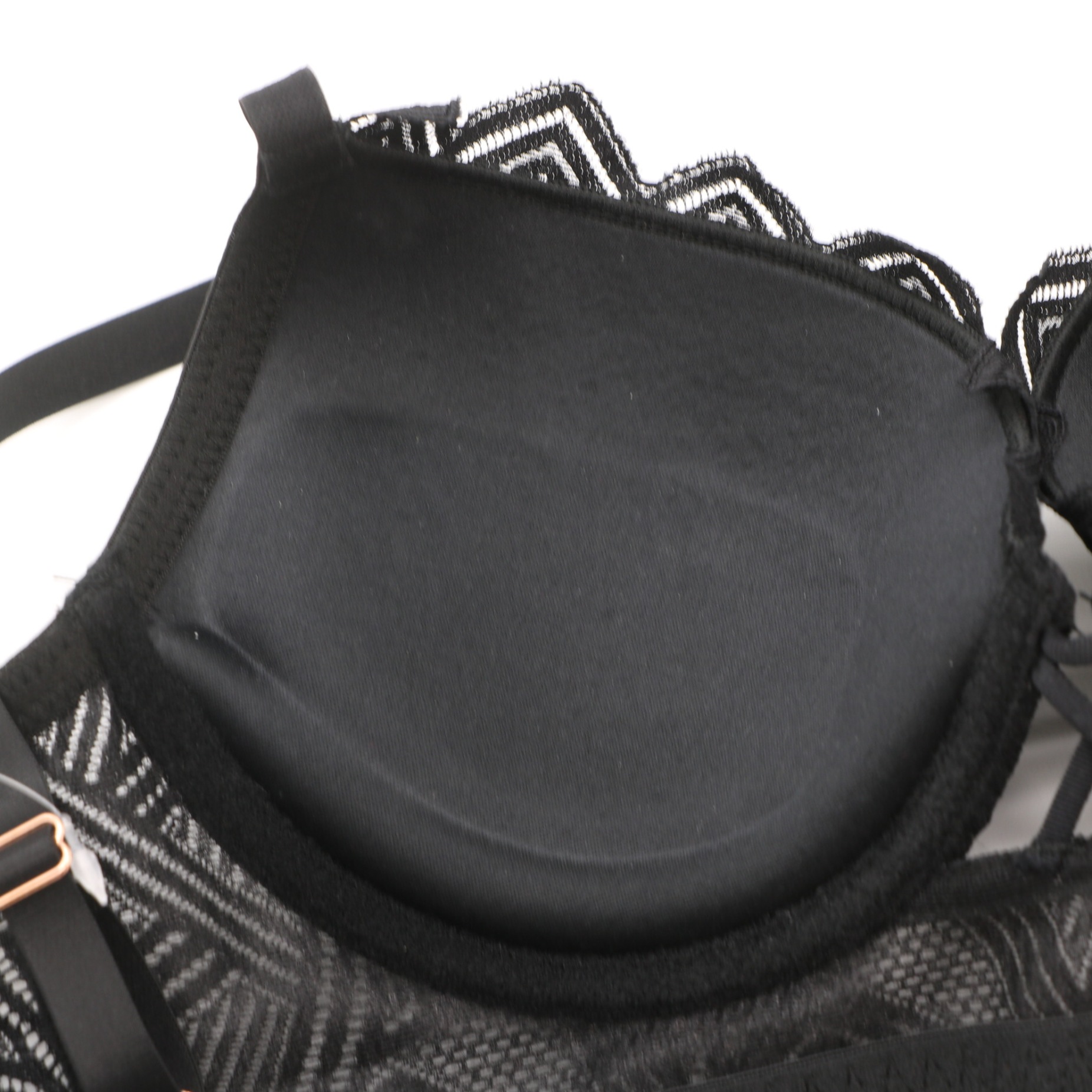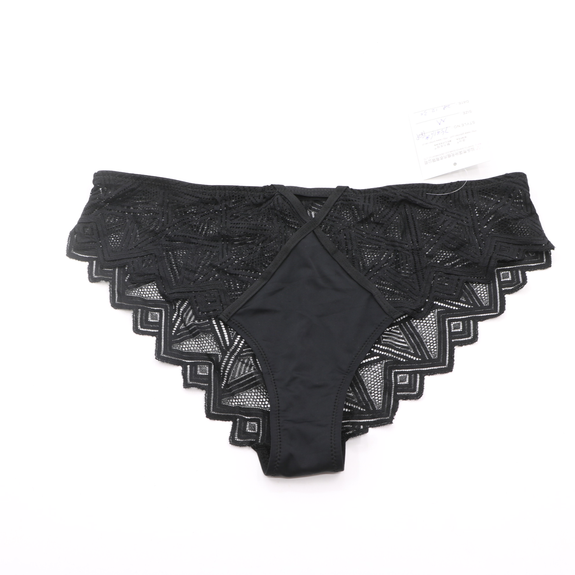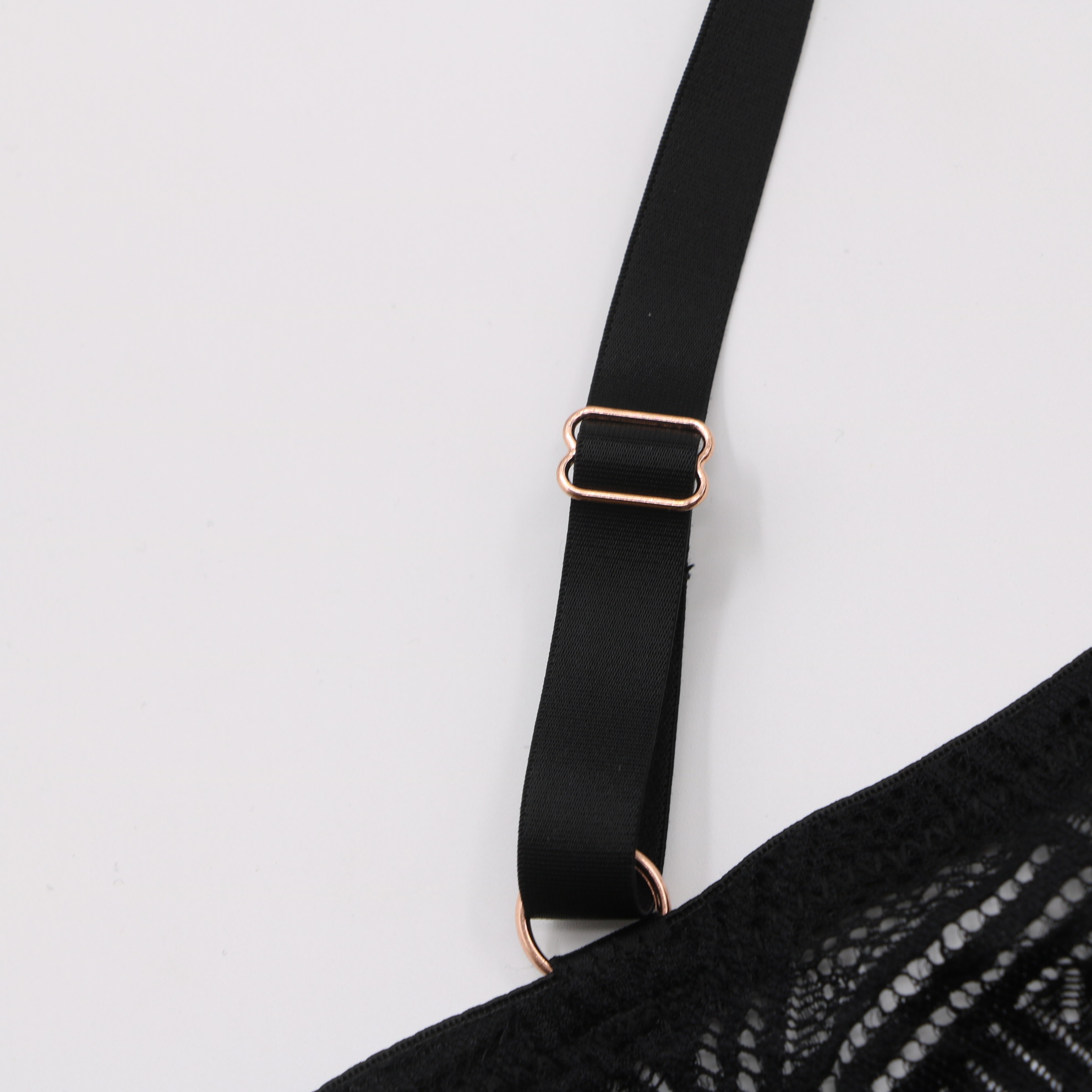 This black lingerie set features intricate geometric lace on both the bra and panty, with a crisscross strap detail at the center of the bra for a modern, edgy look. The molded cups provide a flattering lift, while the adjustable straps with rose gold hardware and 3-row back closure ensure a secure, personalized fit. The matching panty mirrors the geometric lace design with a scalloped hem, creating a cohesive and alluring set perfect for special occasions.