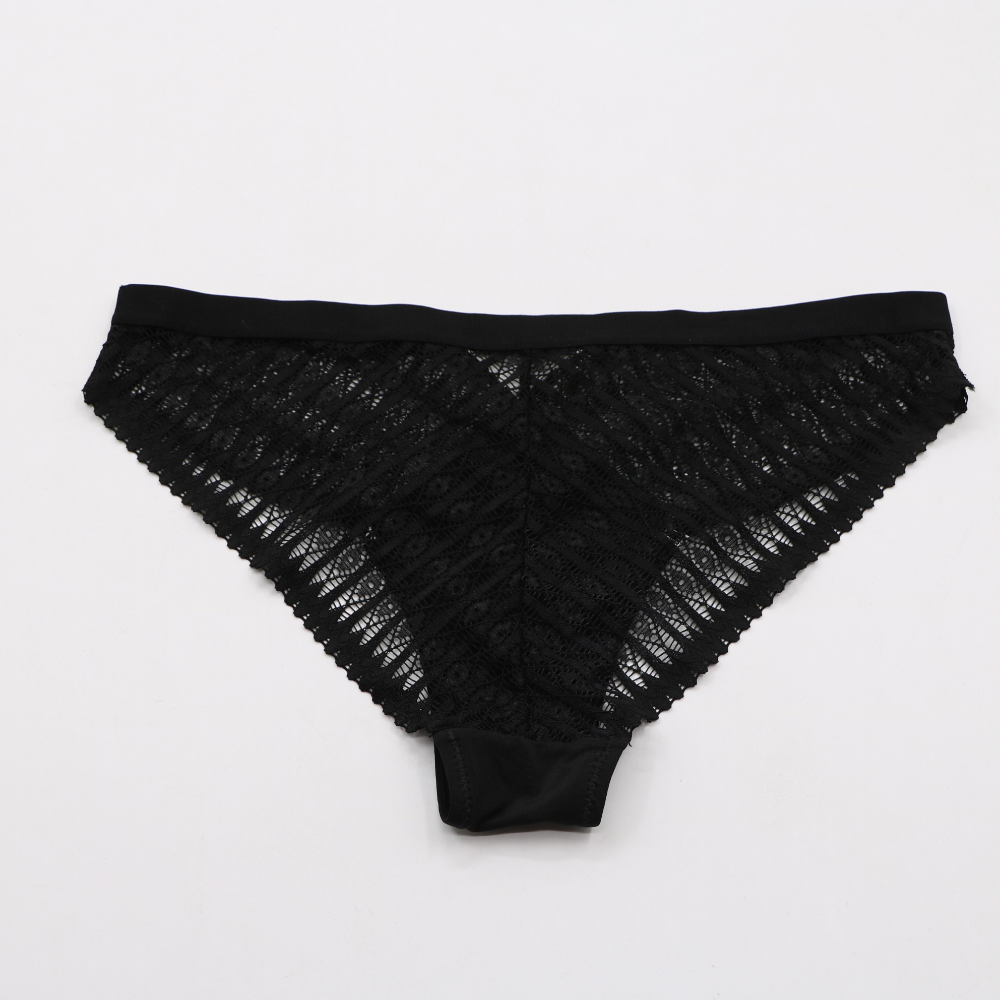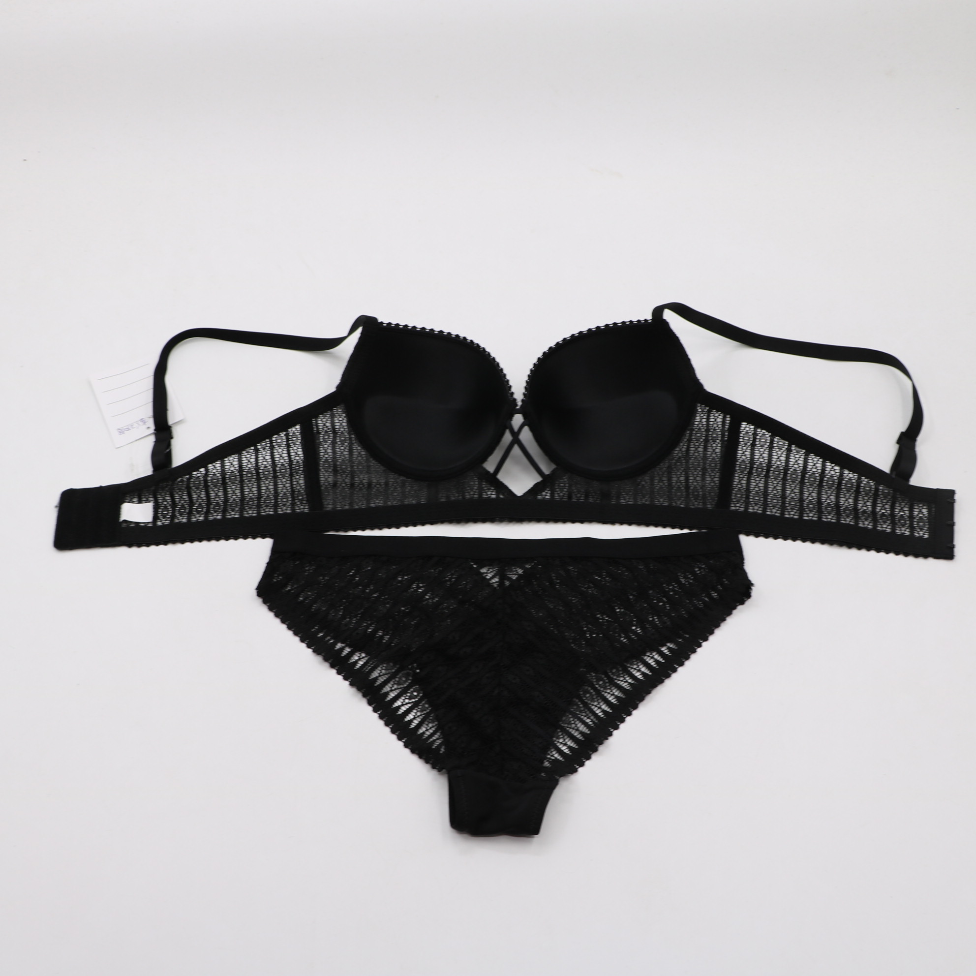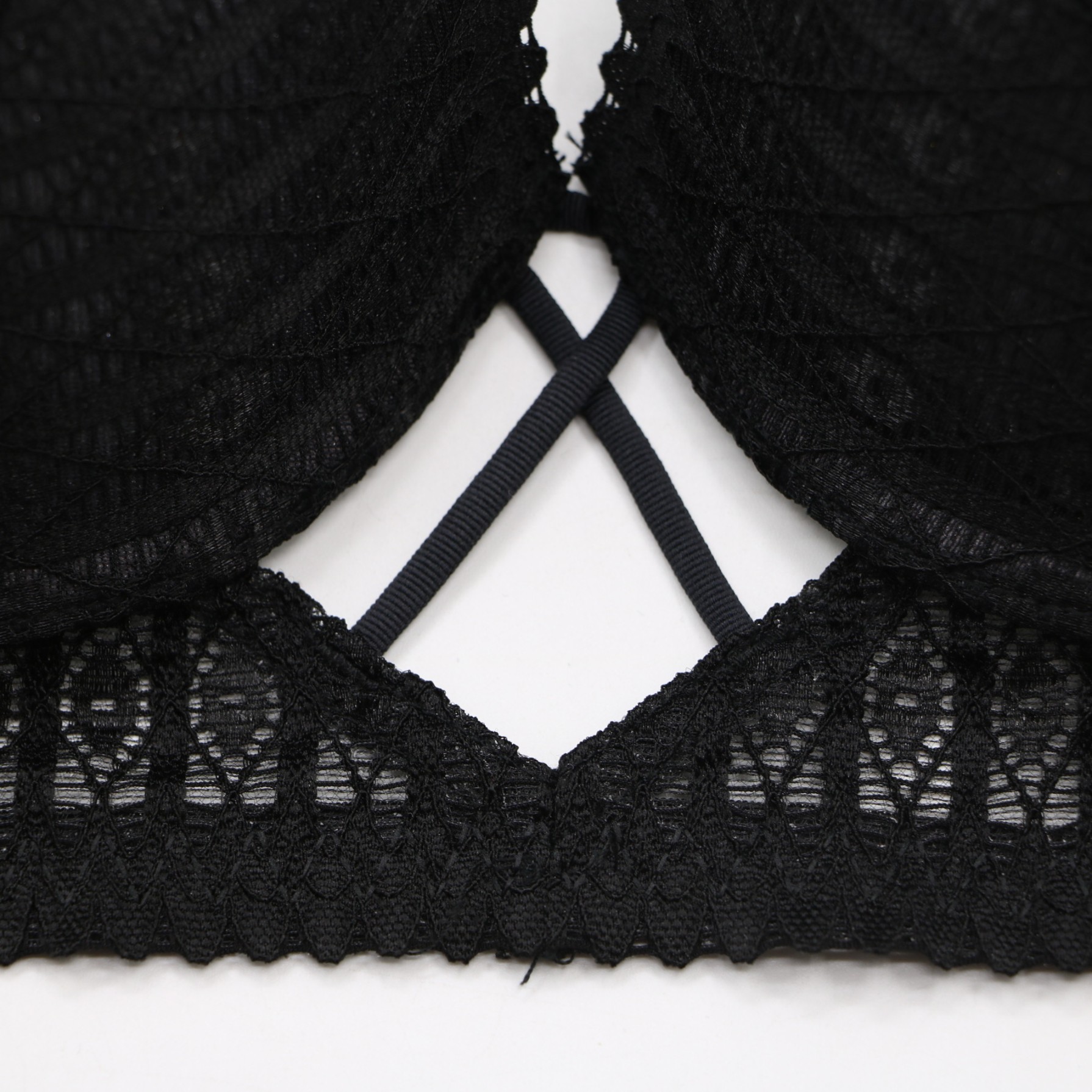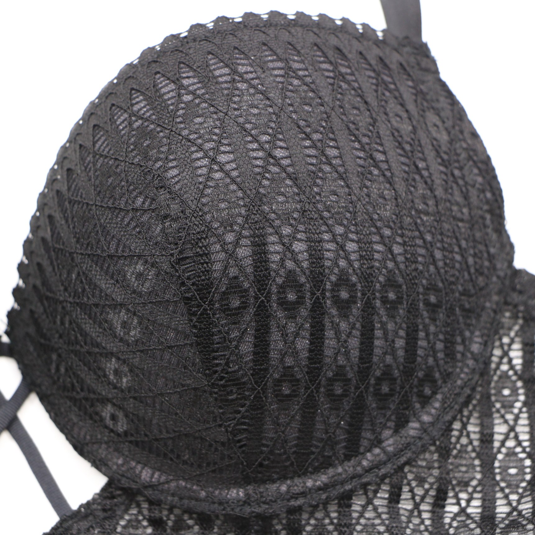 Elevate your intimate wear with this glamorous black lace set. The bra combines smooth molded cups with intricate geometric lace overlays and a V-cut cross strap detail, adding a touch of edgy elegance. The coordinating panty features sheer mesh sides and a solid front panel, perfect for date nights or special occasions.