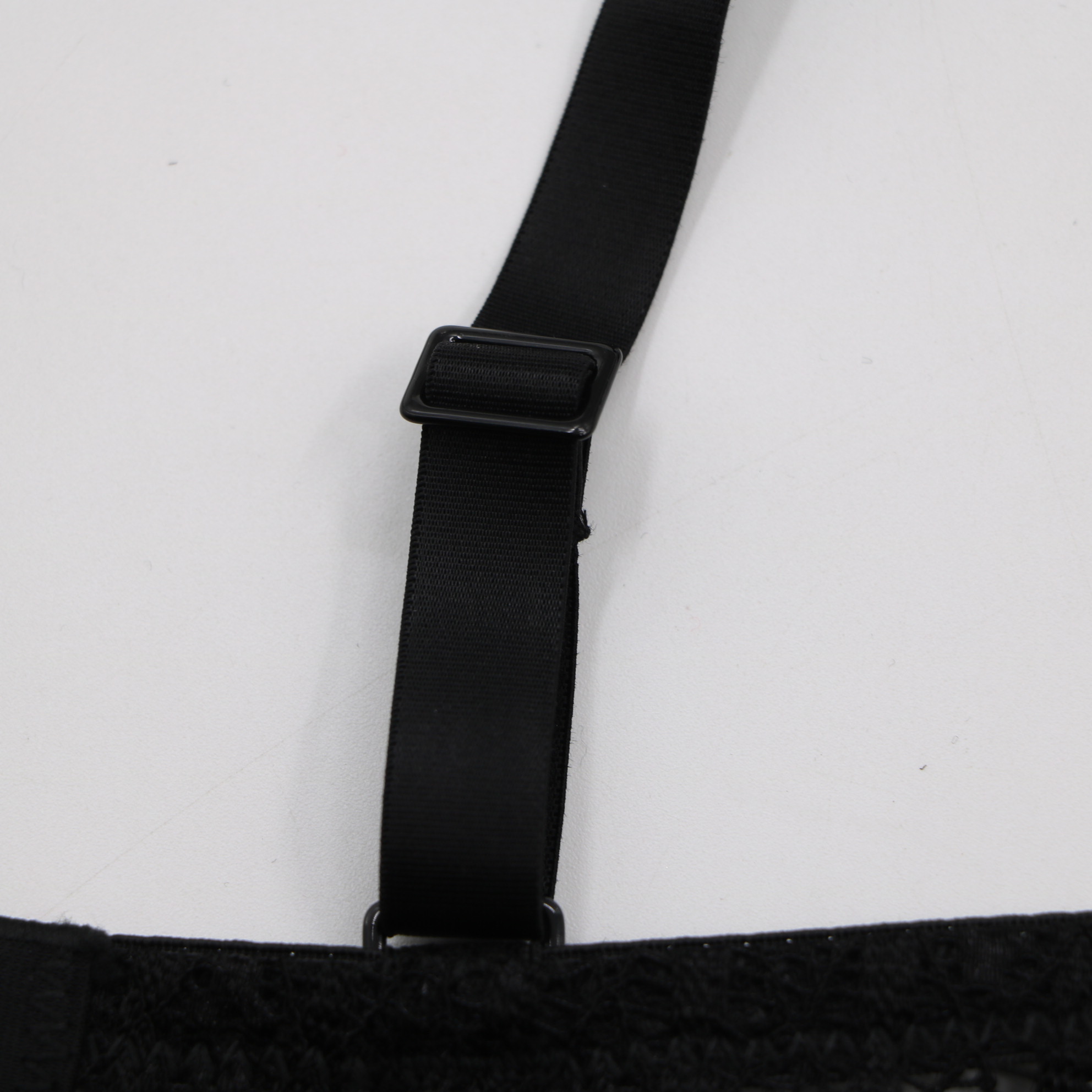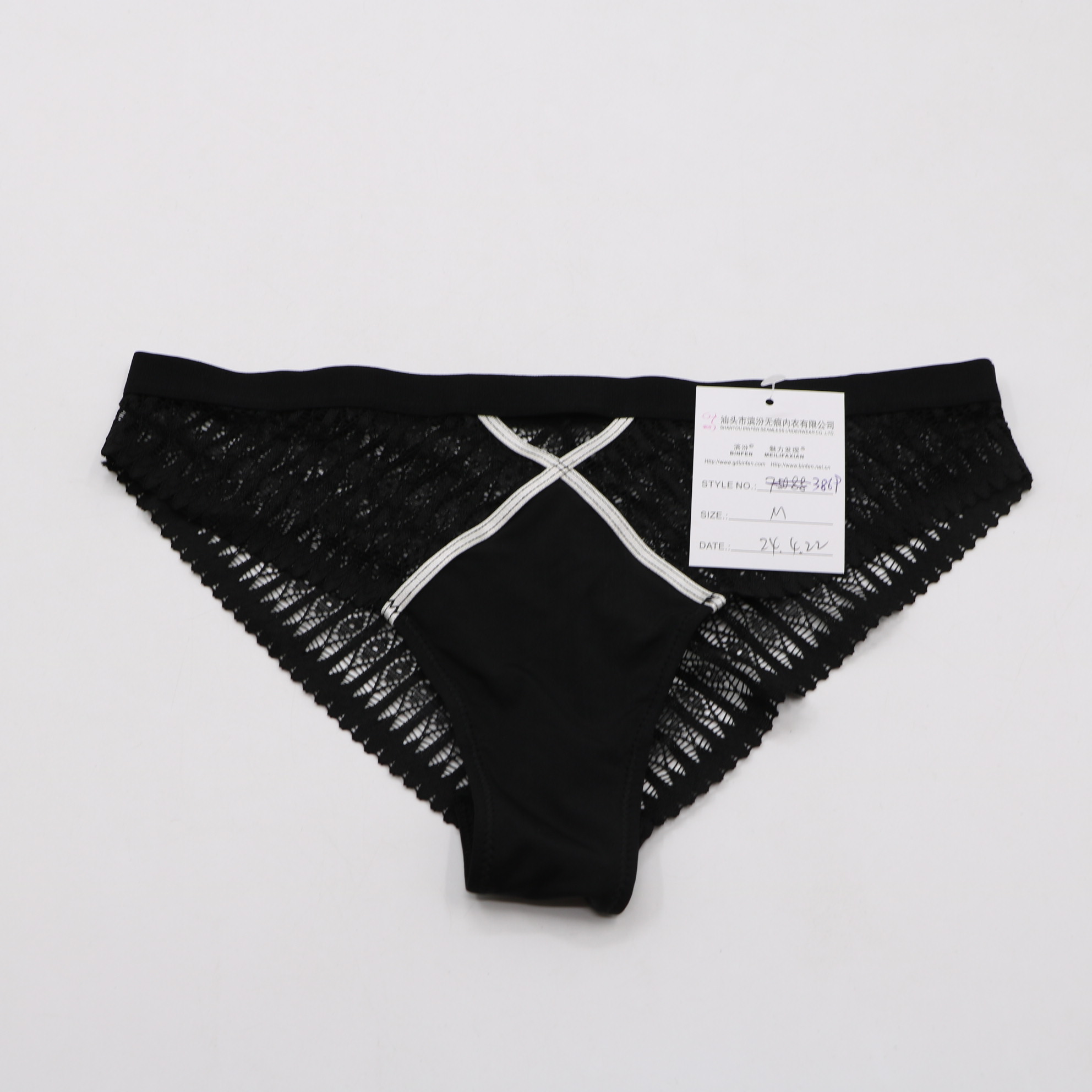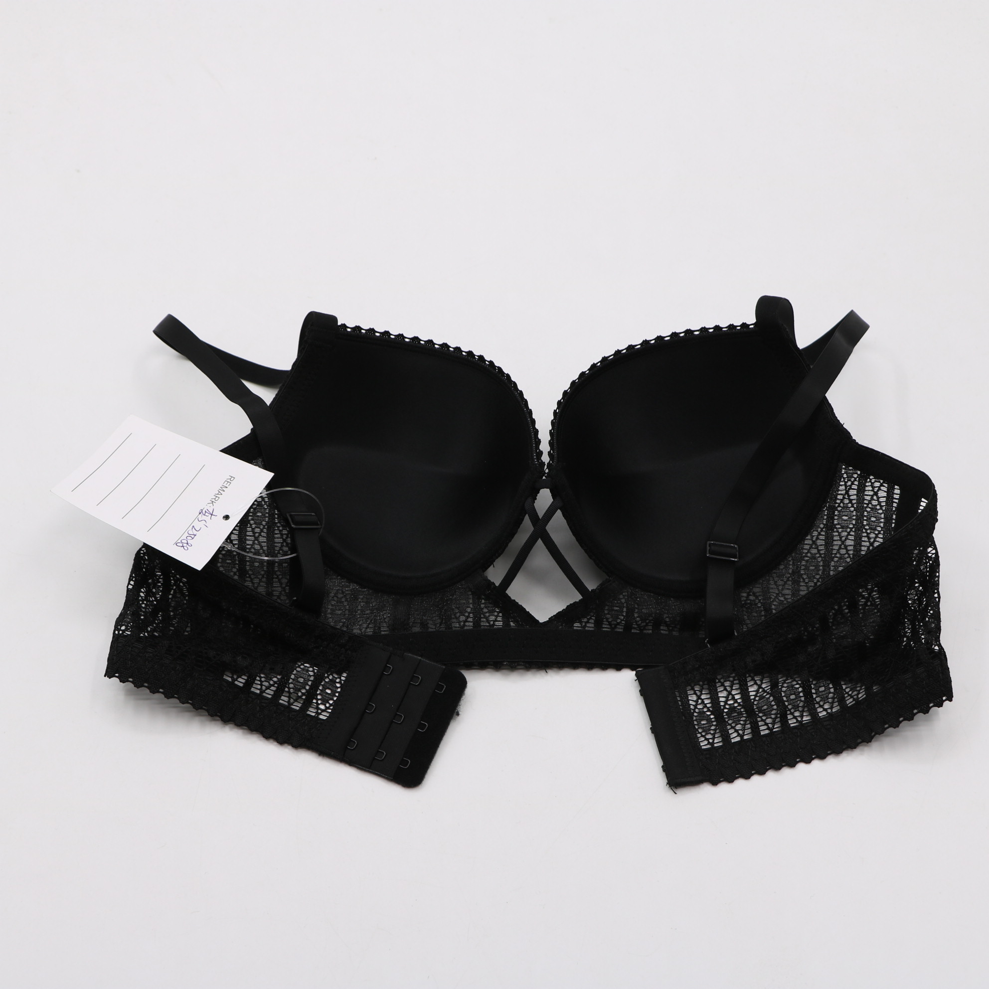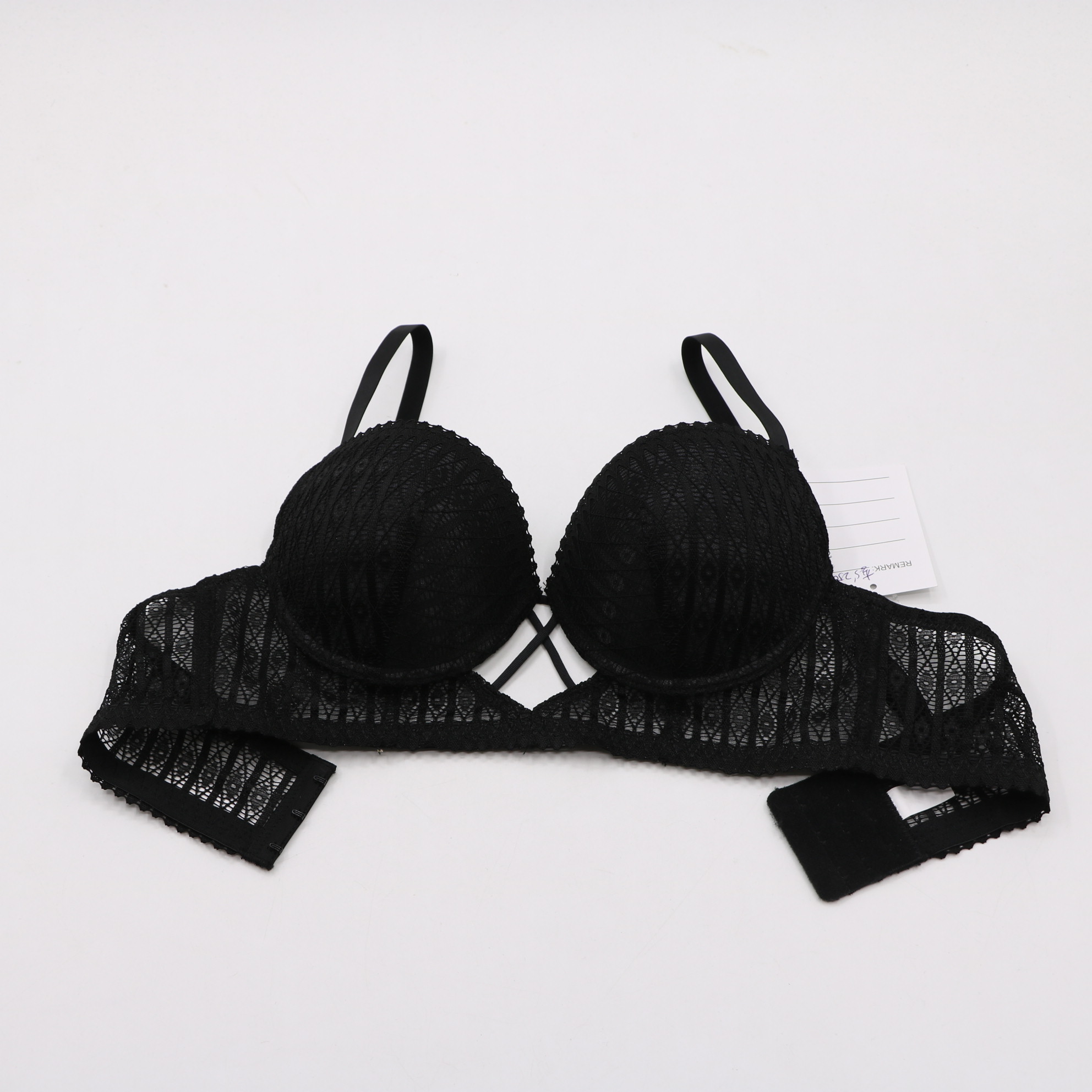 Elevate your intimate wear with this glamorous black lace set. The bra combines smooth molded cups with intricate geometric lace overlays and a V-cut cross strap detail, adding a touch of edgy elegance. The coordinating panty features sheer mesh sides and a solid front panel, perfect for date nights or special occasions.