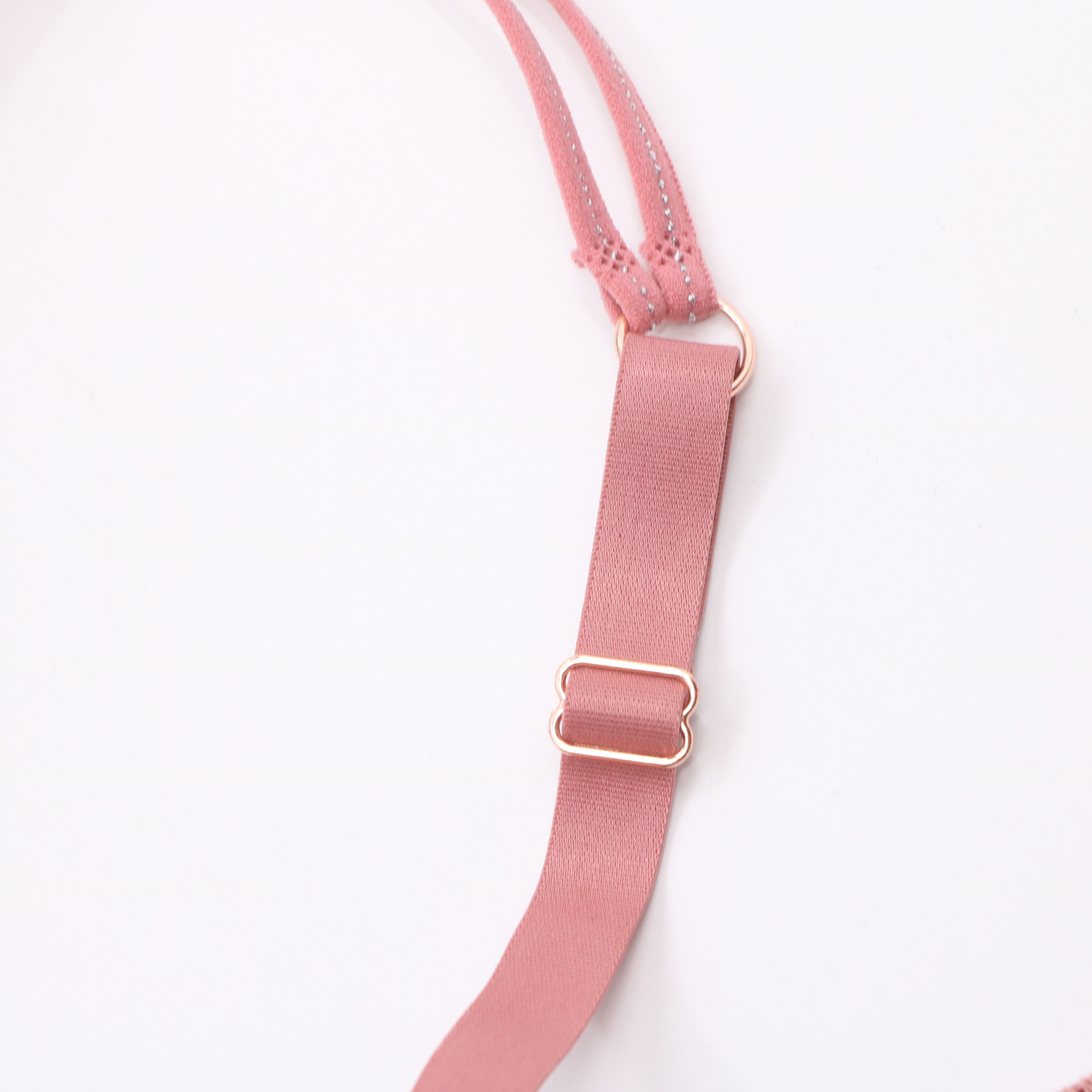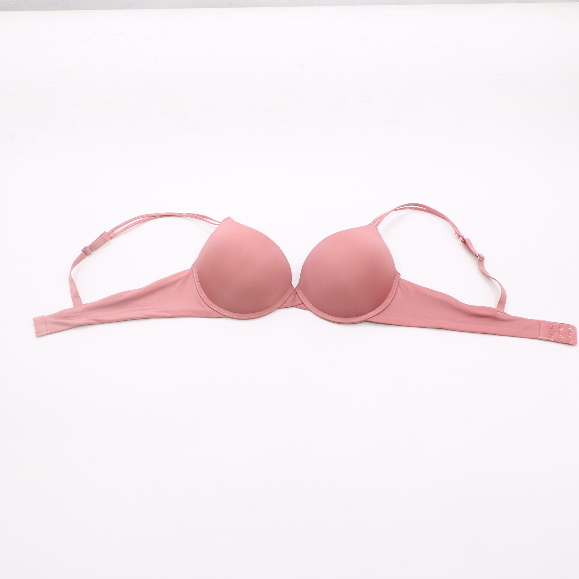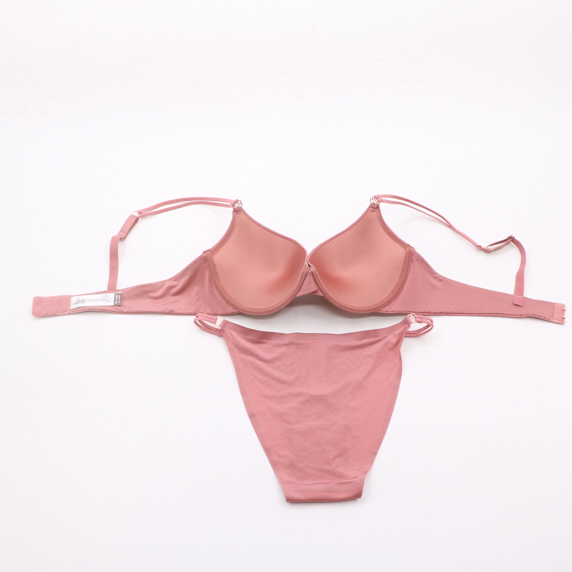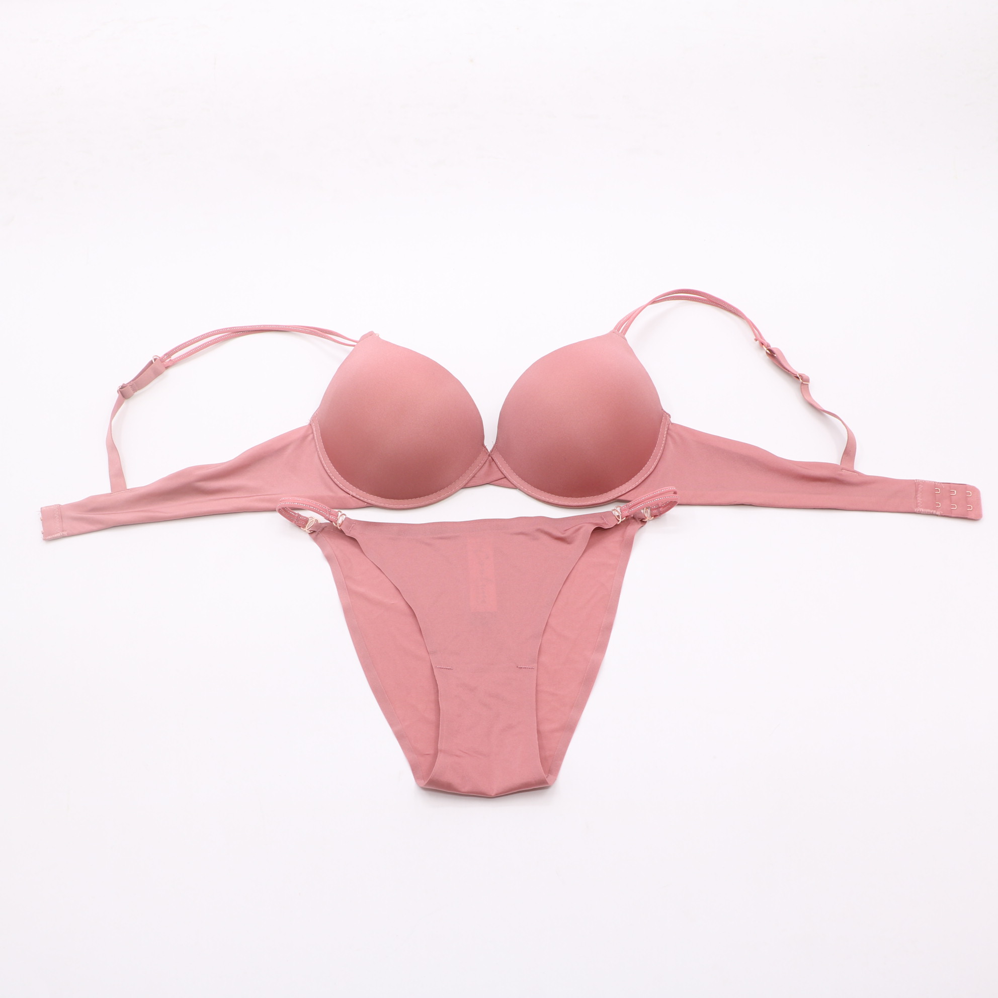 This push-up lingerie set features a smooth, seamless design with molded cups for natural shaping and support. The adjustable, convertible straps with rose gold accents allow for customized wear, while the matching thong panty completes the set with a comfortable, barely-there feel. Perfect for everyday confidence and style