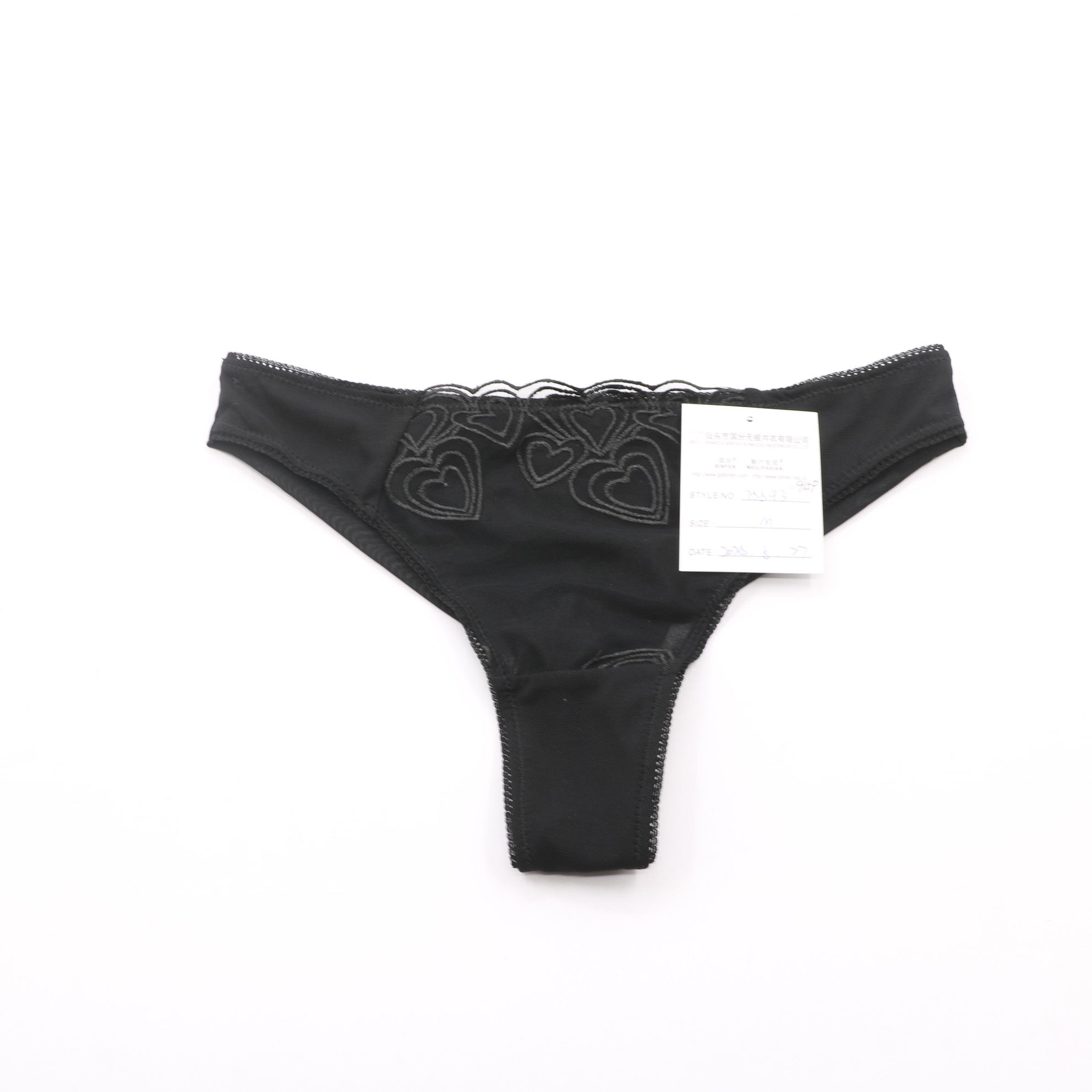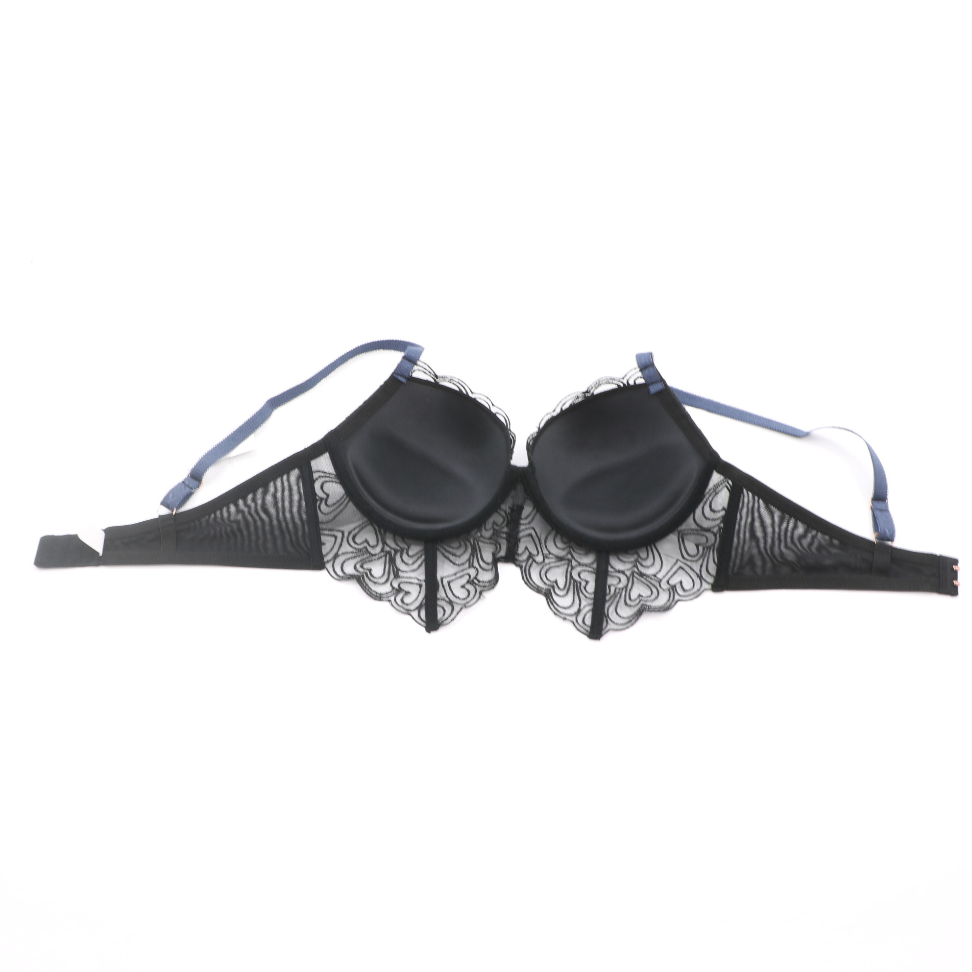 Elegant black set with heart lace detailing and contrast blue straps. Molded cups for lift, adjustable fit, and matching thong included.